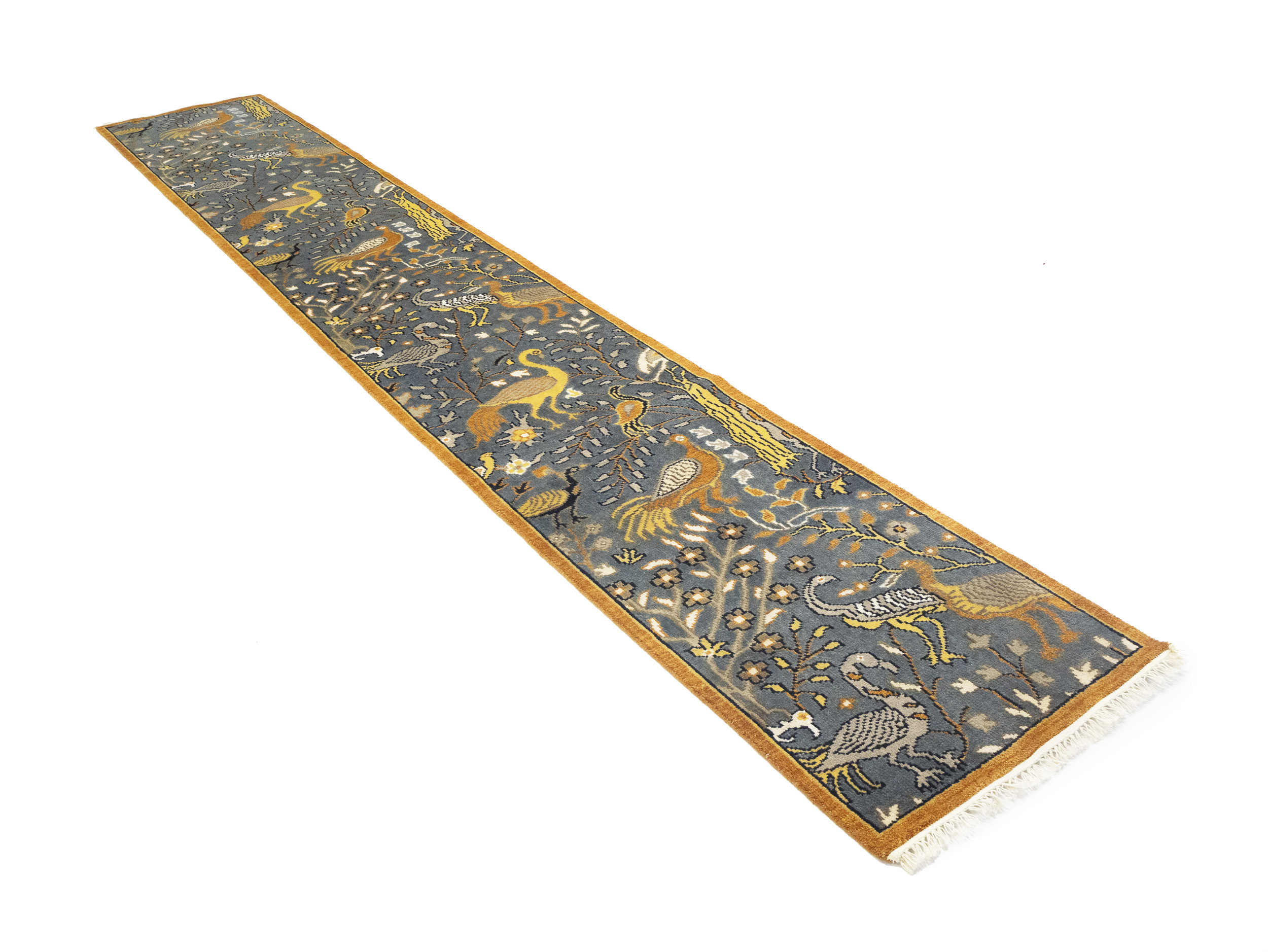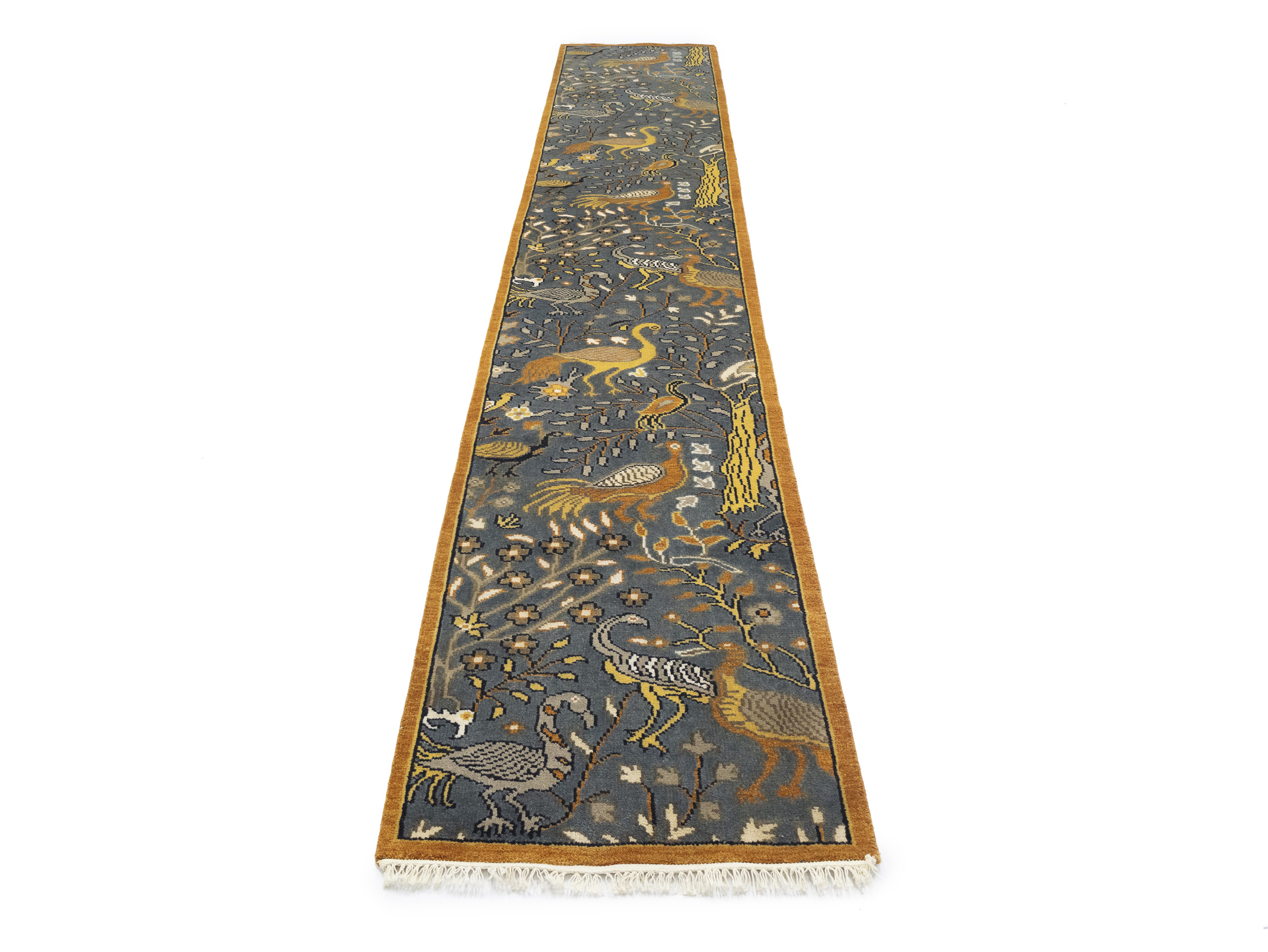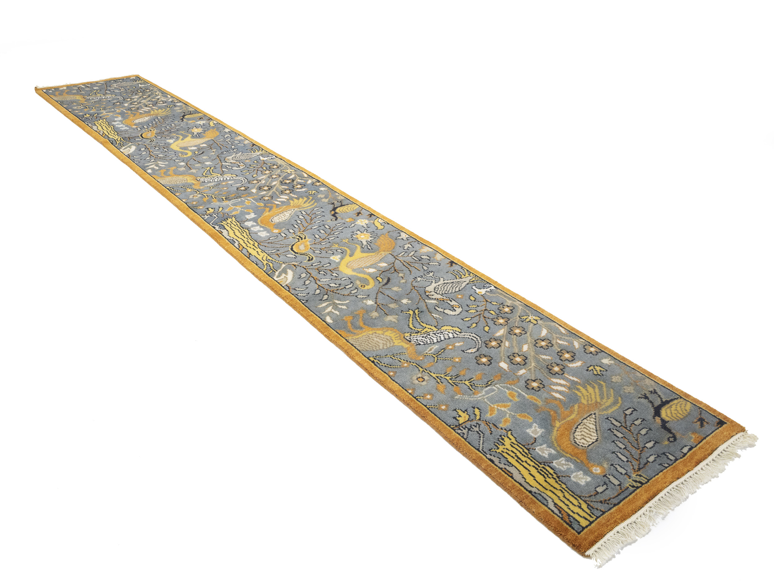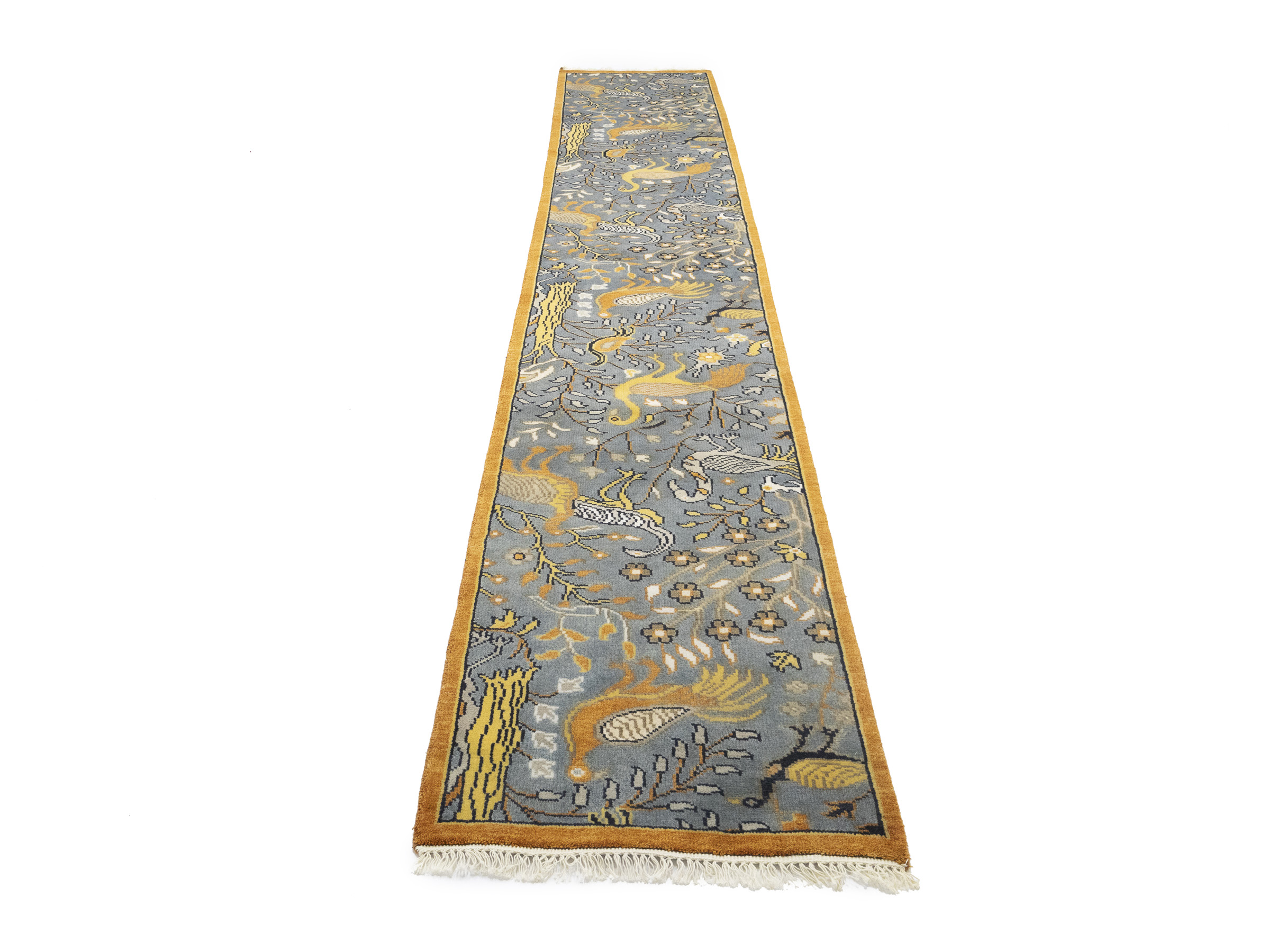 Handmade 2'6X16 gray oriental runner made with vegetable dyes (fine wool pile and cotton foundation), exceptional knot count, and appealing ancient designs. This Oriental runner never will go out of style and would be among your most valuable treasures.