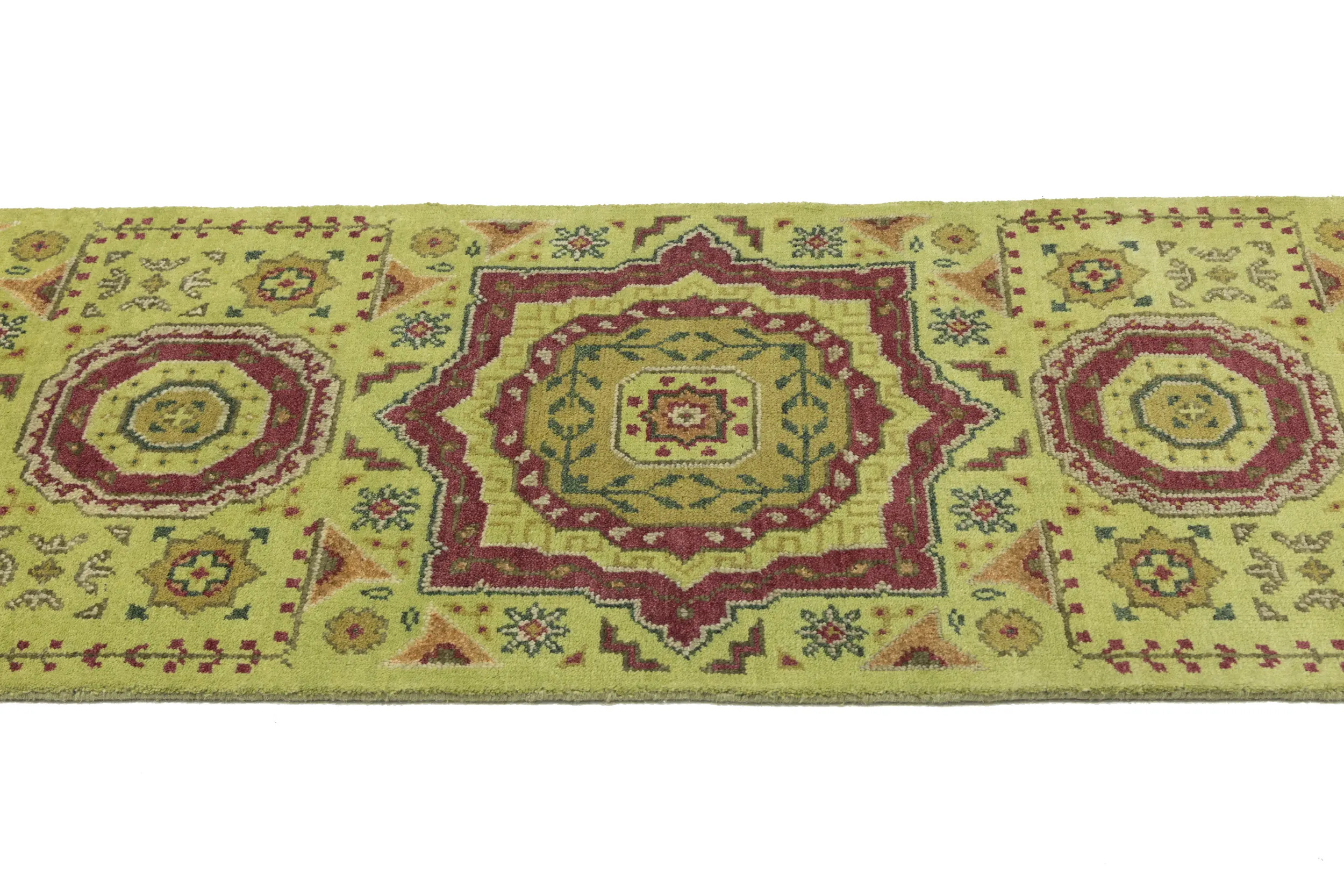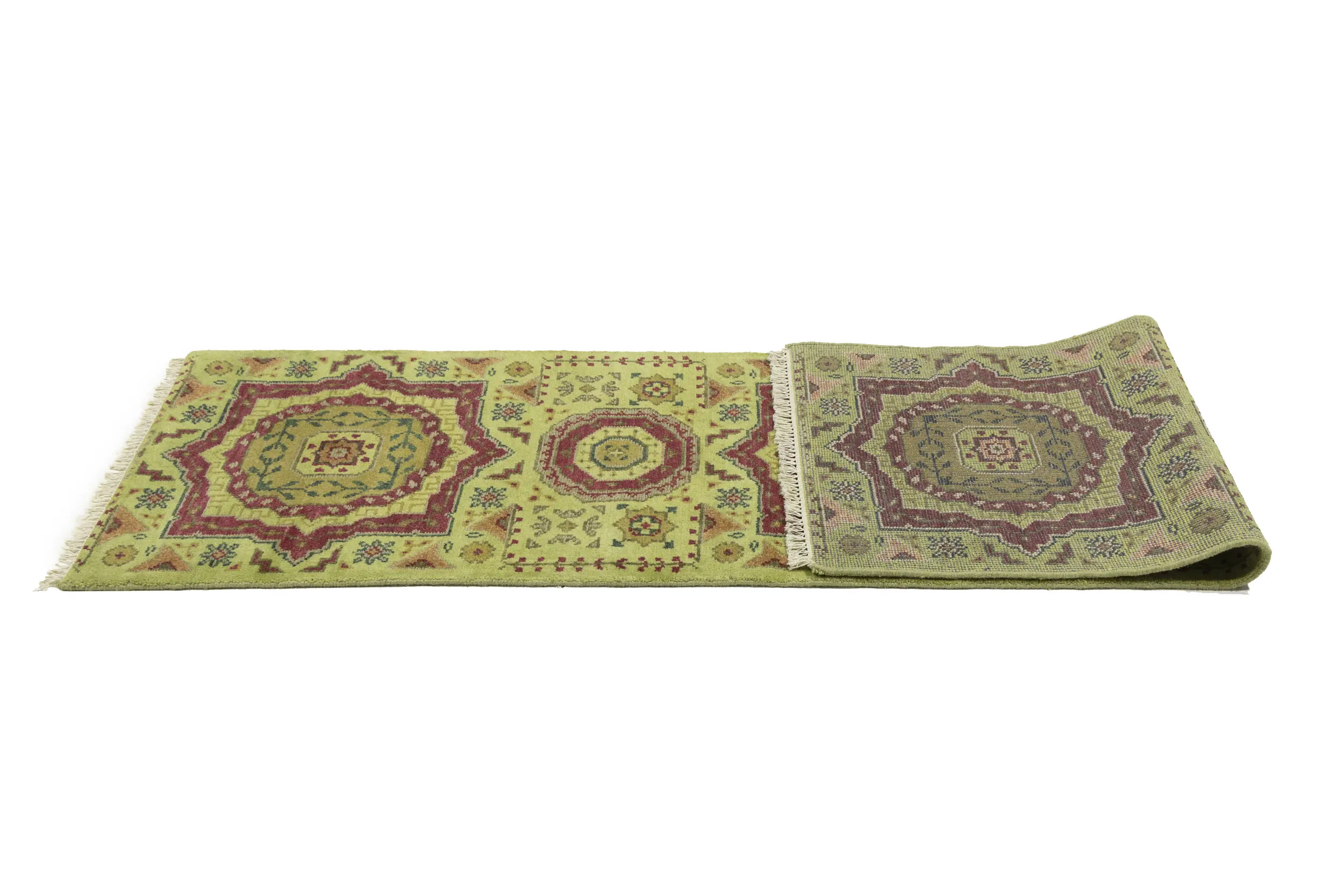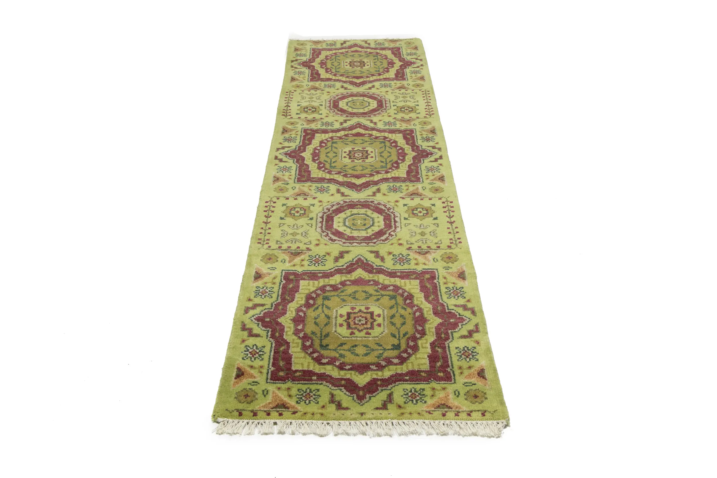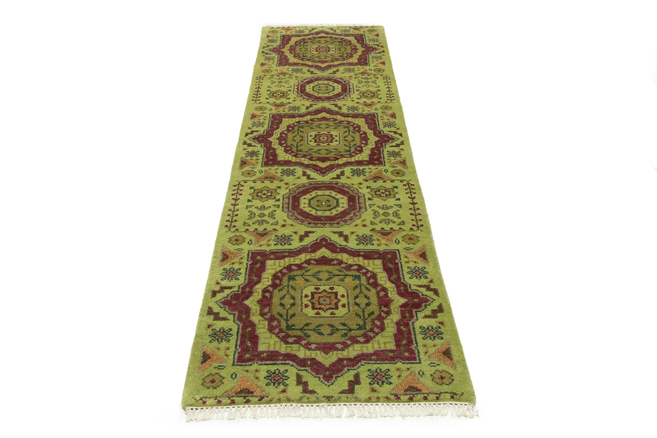 This original 2'7X9'8 green new Oriental runner was finely knotted by the hands of weavers influenced by a variety of amazing artistic designs, to recreate the aged look of the exceptional piece with a richness of color and embellished background field. What set this vintage style Oriental area runner from the others are the material and dye used (wool pile and cotton foundation), knot count, antique designs, fantastic grades, and its regional historical connection: it has deep roots, from the story of the people who produced it to the meaning of the symbols and colors displayed across its canvas that have been praised for centuries. This Indian home décor carpet will be completely cozy and inviting that never will go out of style!