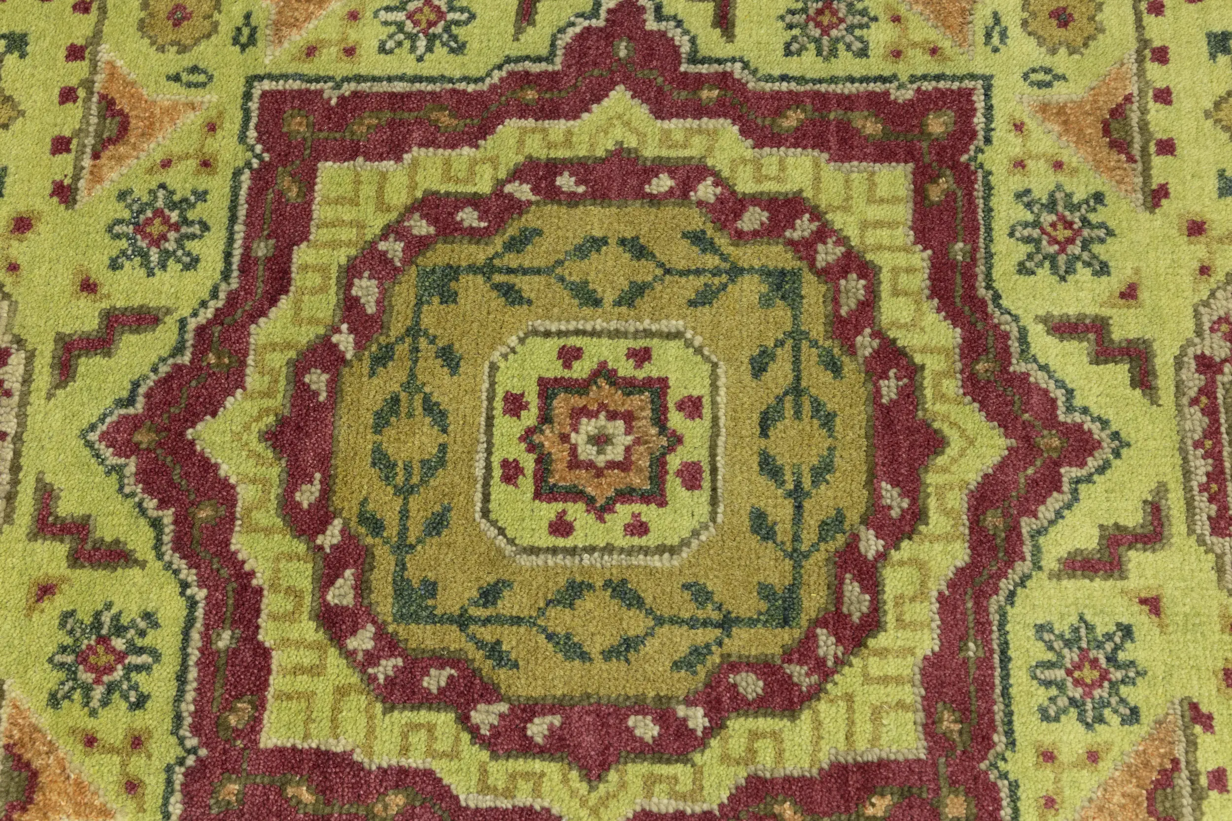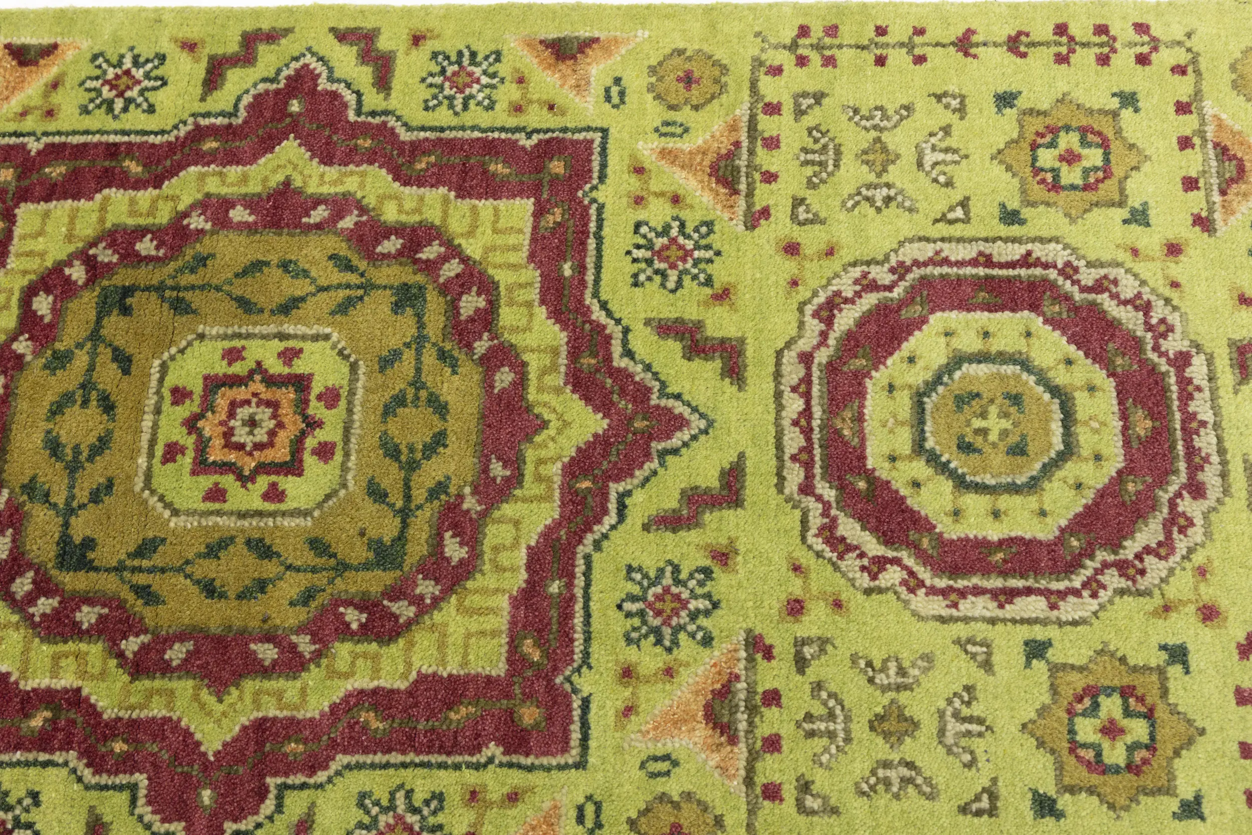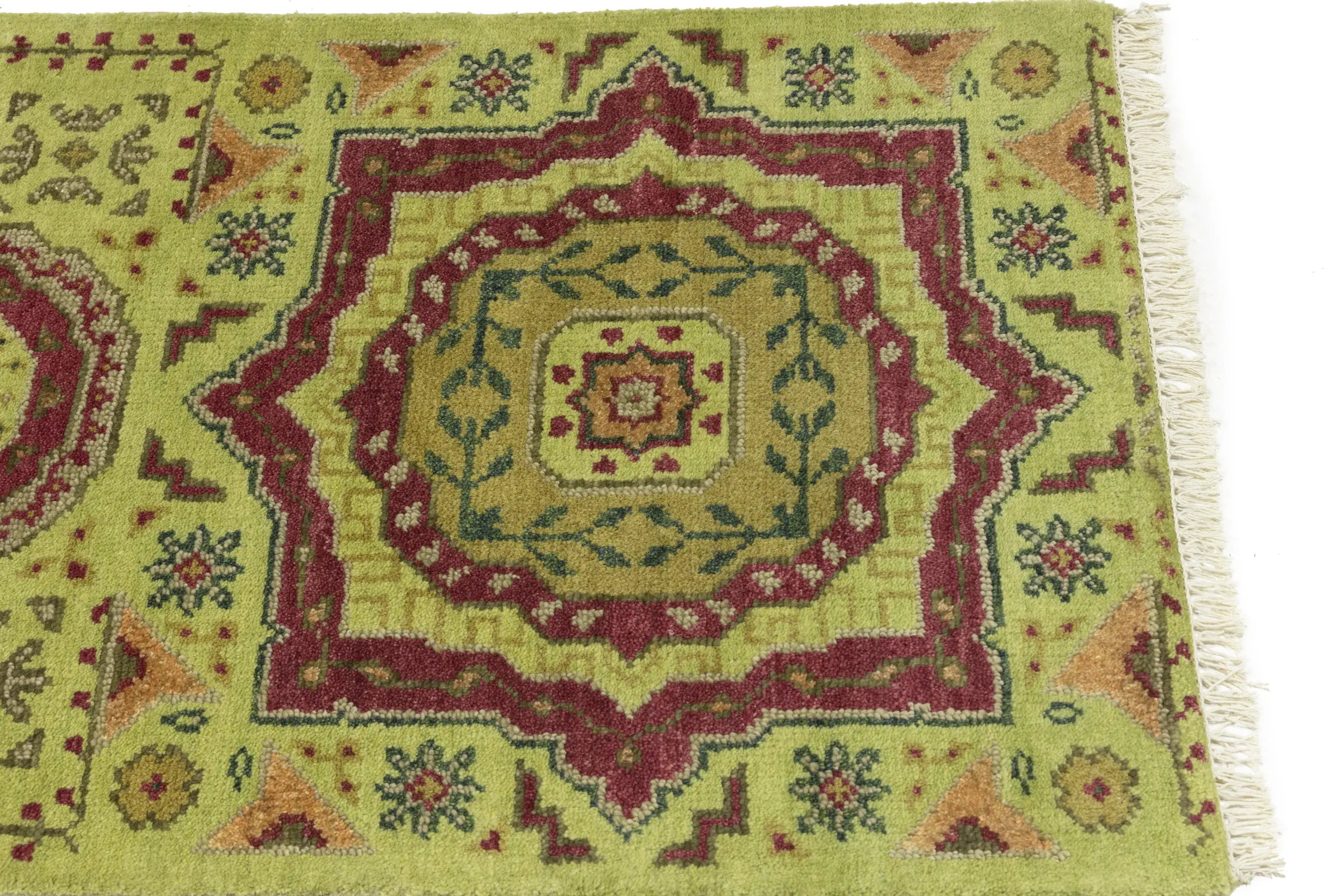 This original 2'7X9'8 green new Oriental runner was finely knotted by the hands of weavers influenced by a variety of amazing artistic designs, to recreate the aged look of the exceptional piece with a richness of color and embellished background field. What set this vintage style Oriental area runner from the others are the material and dye used (wool pile and cotton foundation), knot count, antique designs, fantastic grades, and its regional historical connection: it has deep roots, from the story of the people who produced it to the meaning of the symbols and colors displayed across its canvas that have been praised for centuries. This Indian home décor carpet will be completely cozy and inviting that never will go out of style!