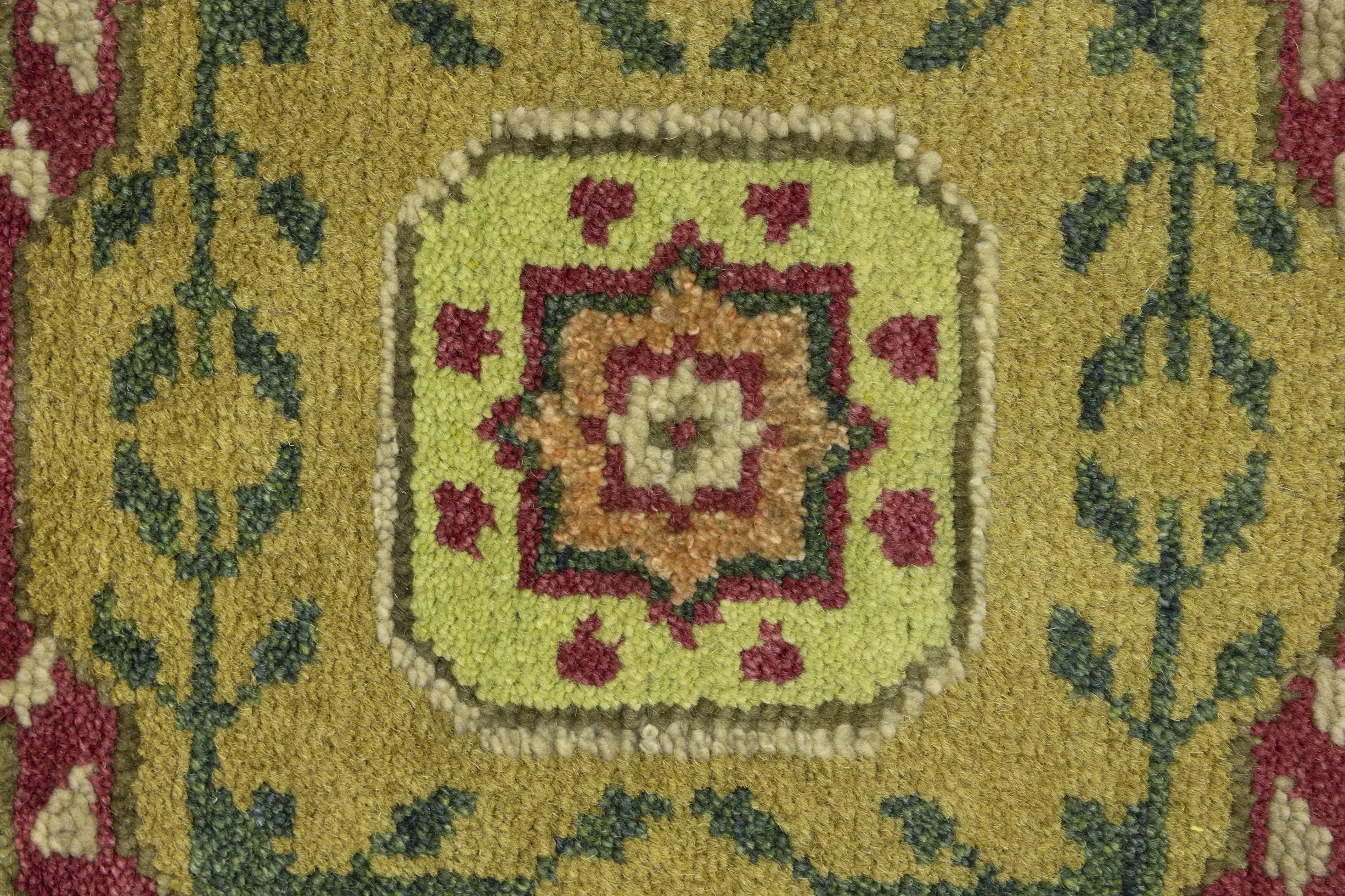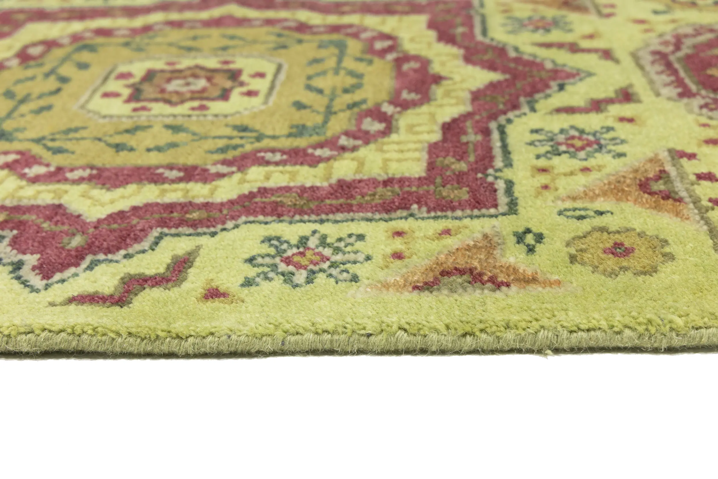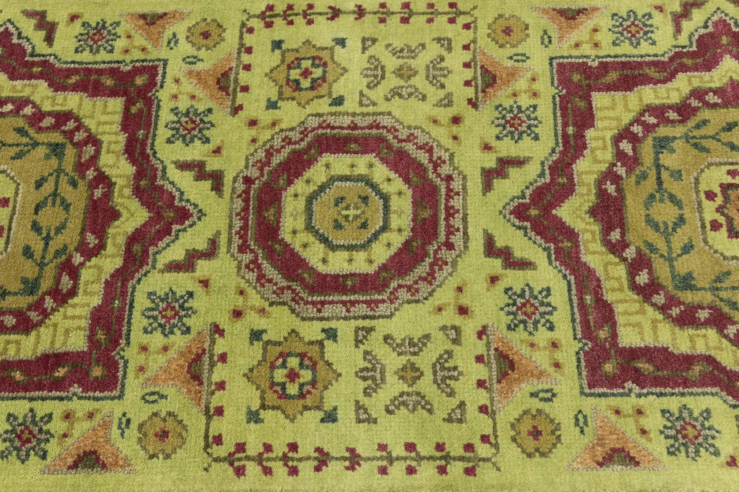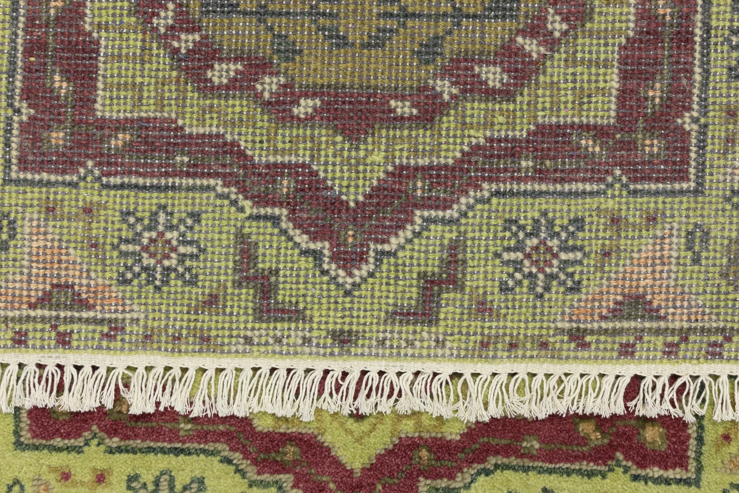 This original 2'7X9'8 green new Oriental runner was finely knotted by the hands of weavers influenced by a variety of amazing artistic designs, to recreate the aged look of the exceptional piece with a richness of color and embellished background field. What set this vintage style Oriental area runner from the others are the material and dye used (wool pile and cotton foundation), knot count, antique designs, fantastic grades, and its regional historical connection: it has deep roots, from the story of the people who produced it to the meaning of the symbols and colors displayed across its canvas that have been praised for centuries. This Indian home décor carpet will be completely cozy and inviting that never will go out of style!