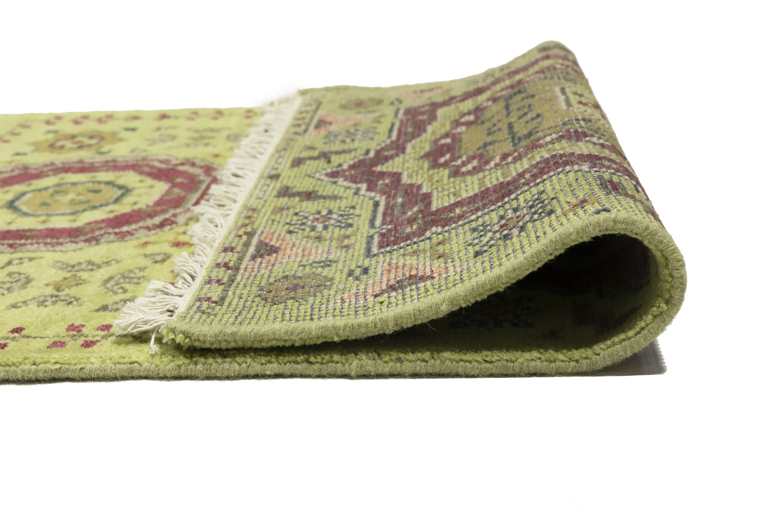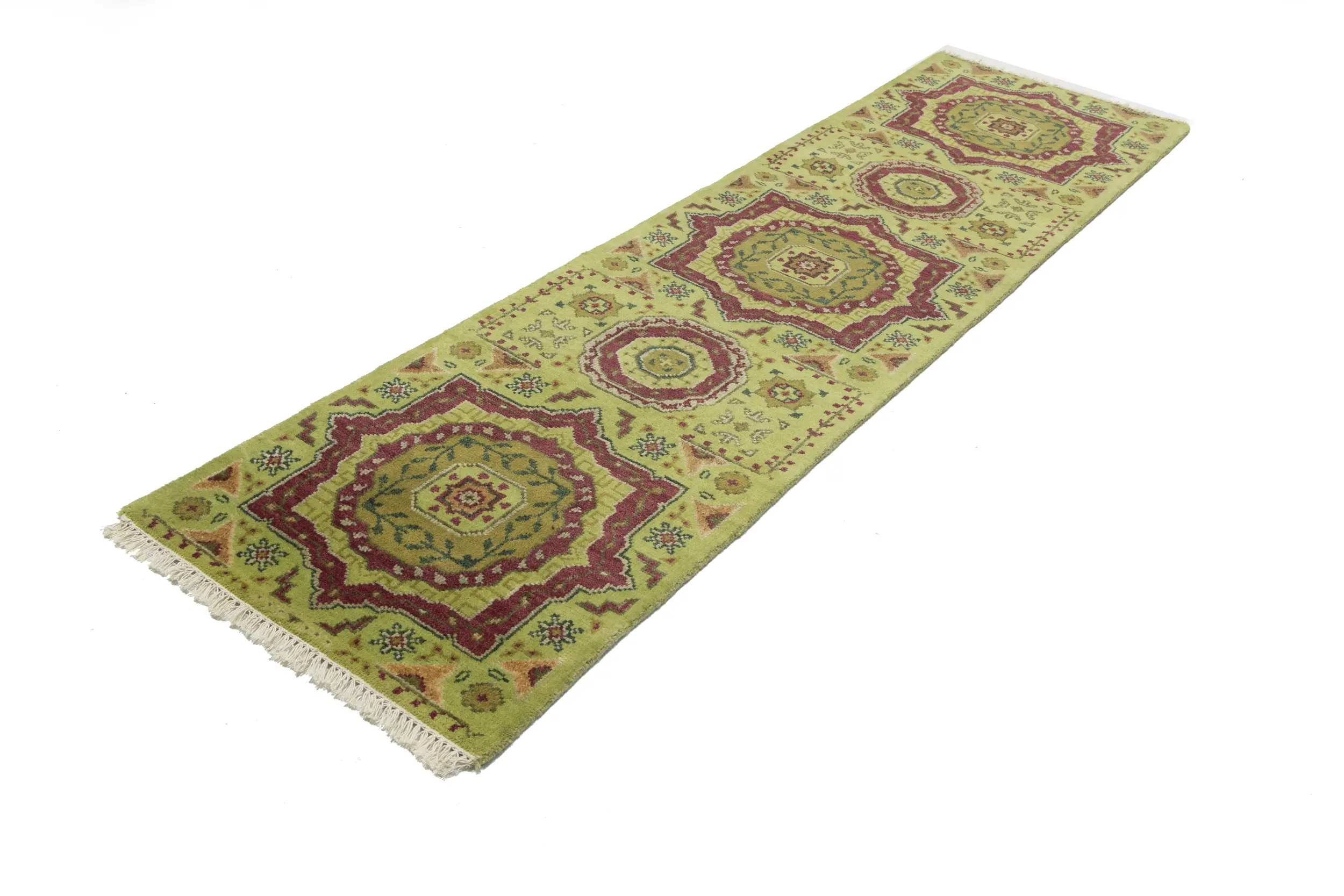 Handmade 2'7X9'8 green Oriental runner made with vegetable dyes (fine wool pile and cotton foundation), superior knot count, and appealing ancient designs. This Oriental runner never will go out of style and would be among your most valuable treasures.