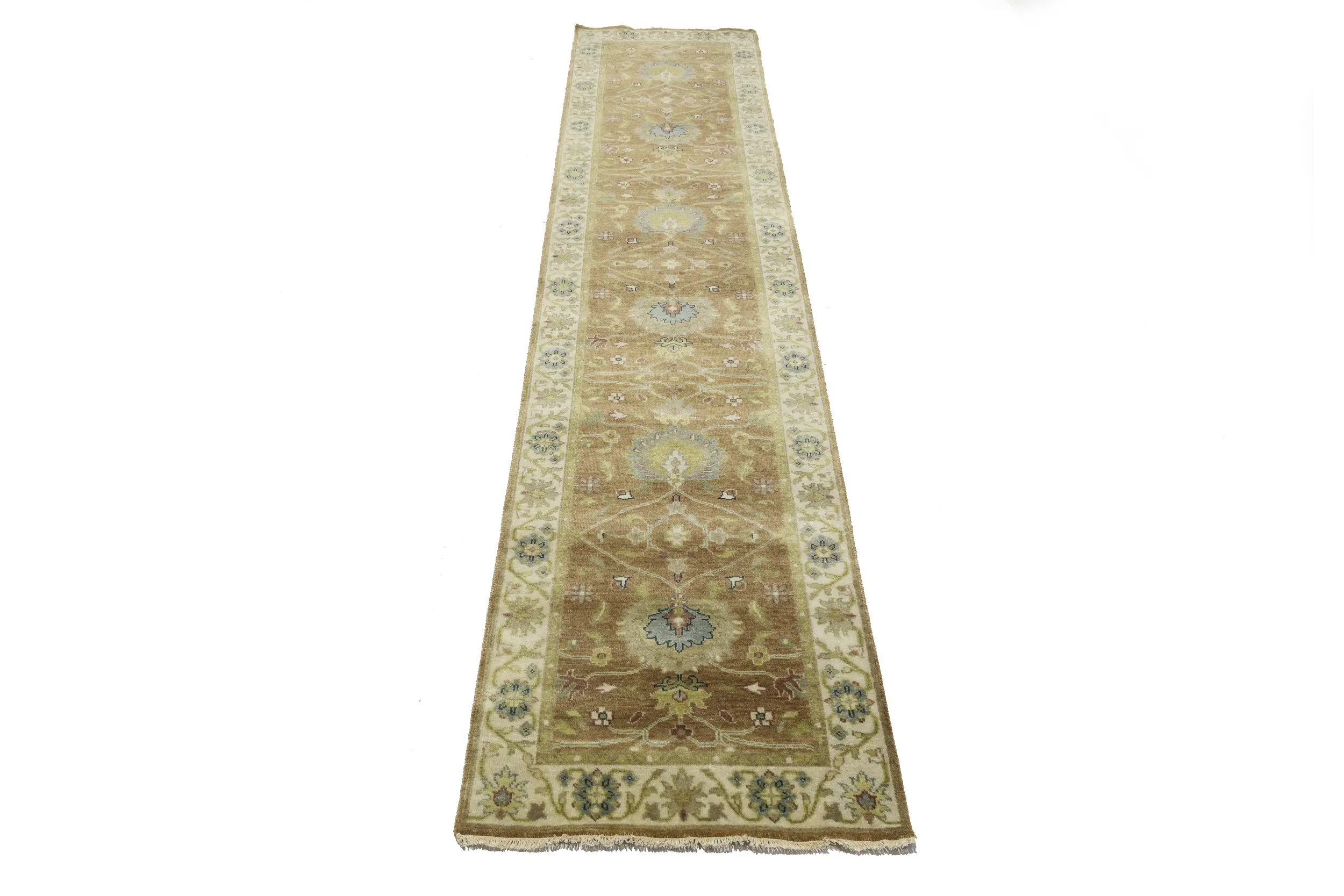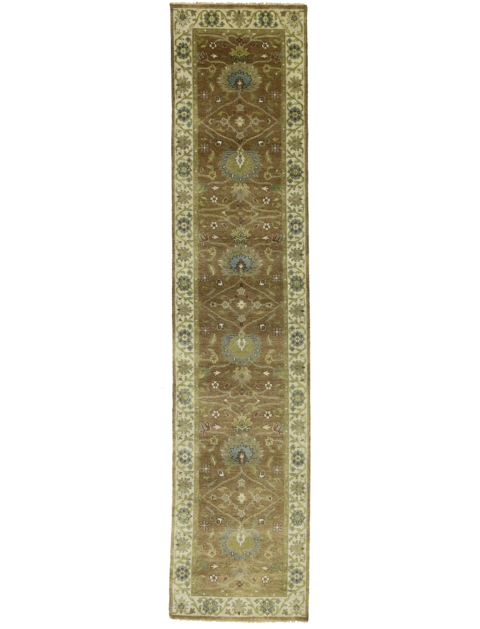This genuine 3x12 Light Rust new Oriental Runner rug was made by the hands of gifted weavers inspired by a variety of spectacular artistic designs, to recreate the aged look of the original piece with a richness of color and ornately patterned background field. What set this vintage style Oriental area rug from the others are the material and dye used (wool pile and cotton foundation), knot count, ancient designs, fantastic grades, and its regional historical connection: it has deep roots, from the story of the people who produced it to the meaning of the symbols and colors displayed across its canvas that have been praised for centuries. This Indian home décor carpet will be completely cozy and inviting that never will go out of style! Also, this Oriental rug would be among your most valuable treasures, it is a great investment that accrues value over time, and it will last for generations because was woven with high-quality, all-natural wool. Environmentally friendly, opulent yet affordable; this rug will give you a thorough amount of character to help define your living space with elegance and warmth that will capture the eyes and attention of your audience (homeowners, designers, decorators, family and friends). OT-11330