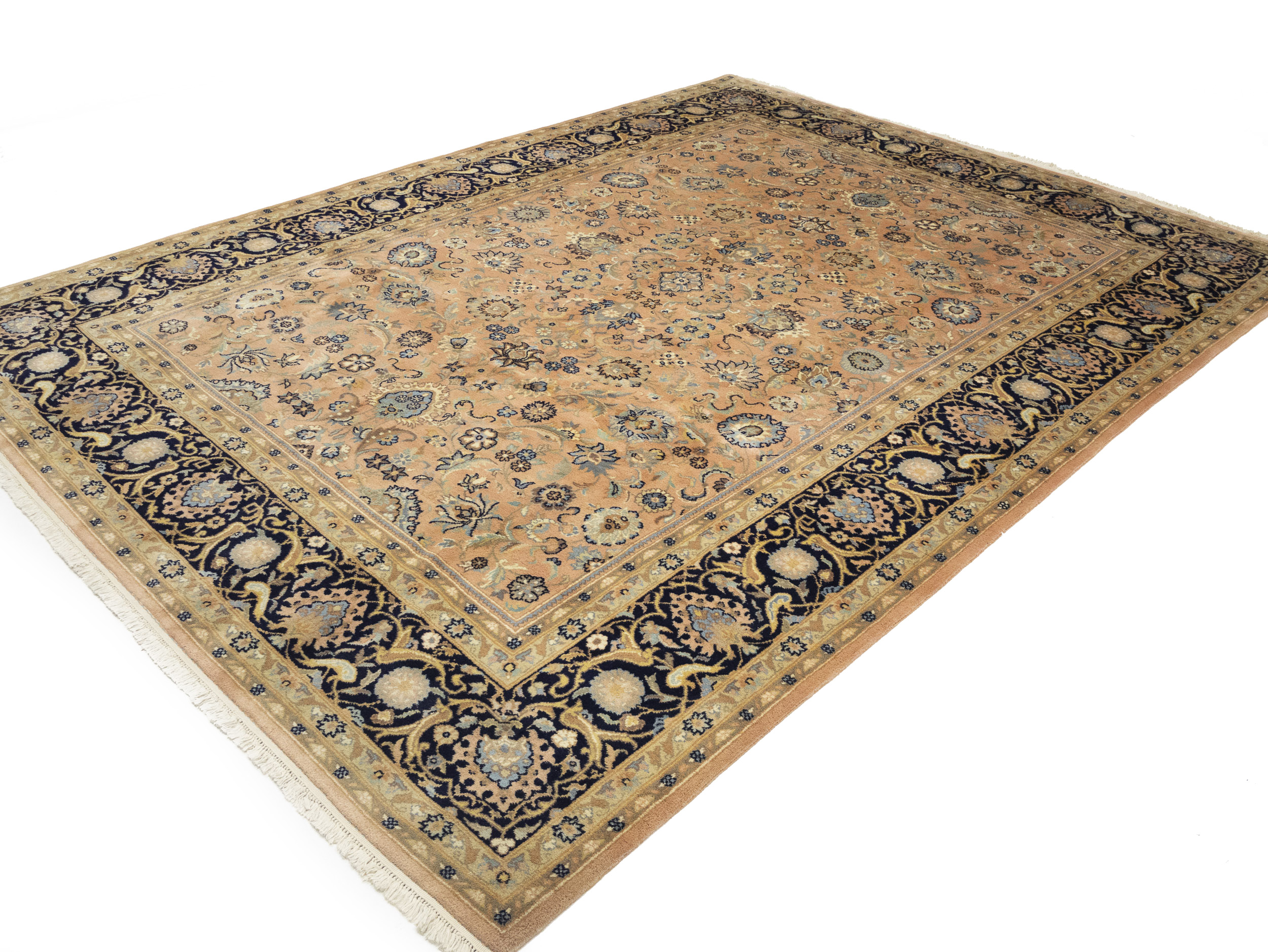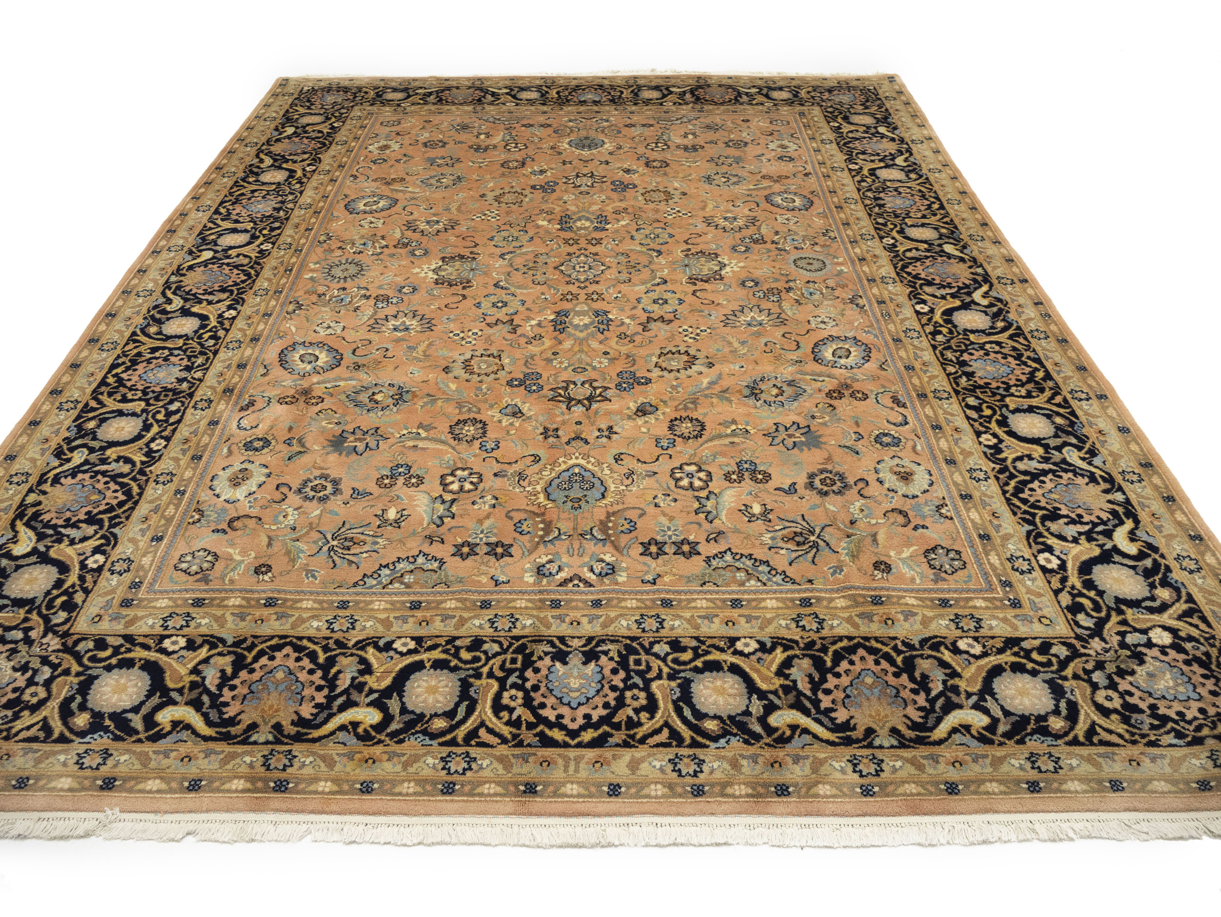 This original 9X12 light salmon new Oriental rug was finely knotted by the hands of weavers influenced by a variety of amazing artistic designs, to recreate the aged look of the exceptional piece with a richness of color and embellished background field. What set this vintage style Oriental area rug from the others are the material and dye used (wool pile and cotton foundation), knot count, antique designs, fantastic grades, and its regional historical connection: it has deep roots, from the story of the people who produced it to the meaning of the symbols and colors displayed across its canvas that have been praised for centuries. This Indian home décor carpet will be completely cozy and inviting that never will go out of style! Also, this Oriental rug would be among your most valuable treasures, it is a great investment that increase in value over time, and it will last a lifetime because was woven with high-quality, all-natural wool. Eco-friendly, opulent yet affordable; this rug will give you an extra pop of character to help define your home environment with luxury and warmth that will capture the eyes and attention of your audience (homeowners, designers, decorators, family and friends).