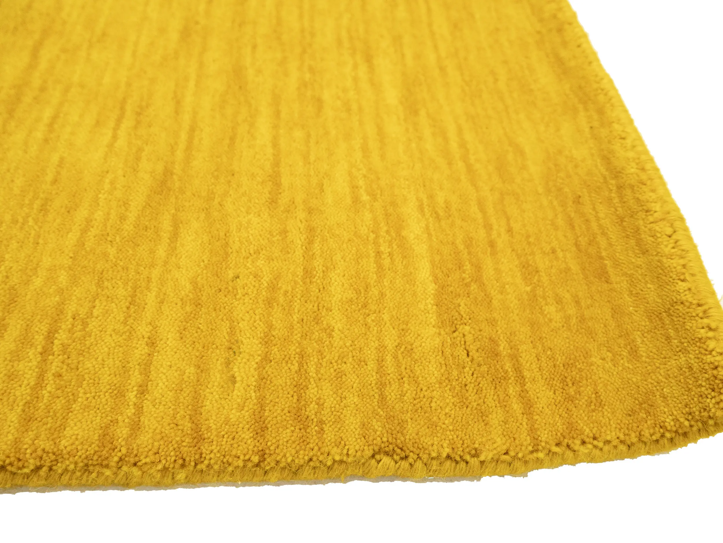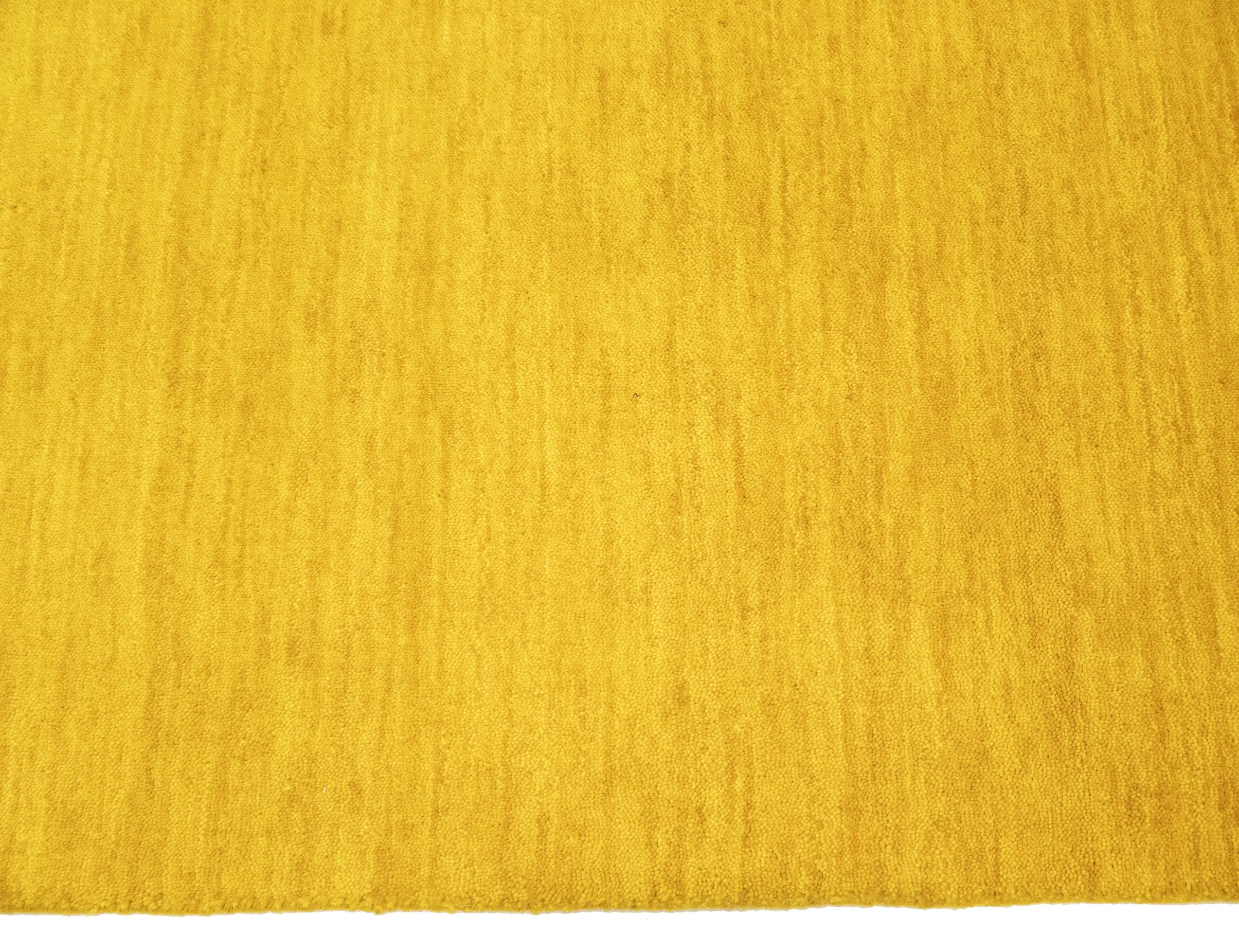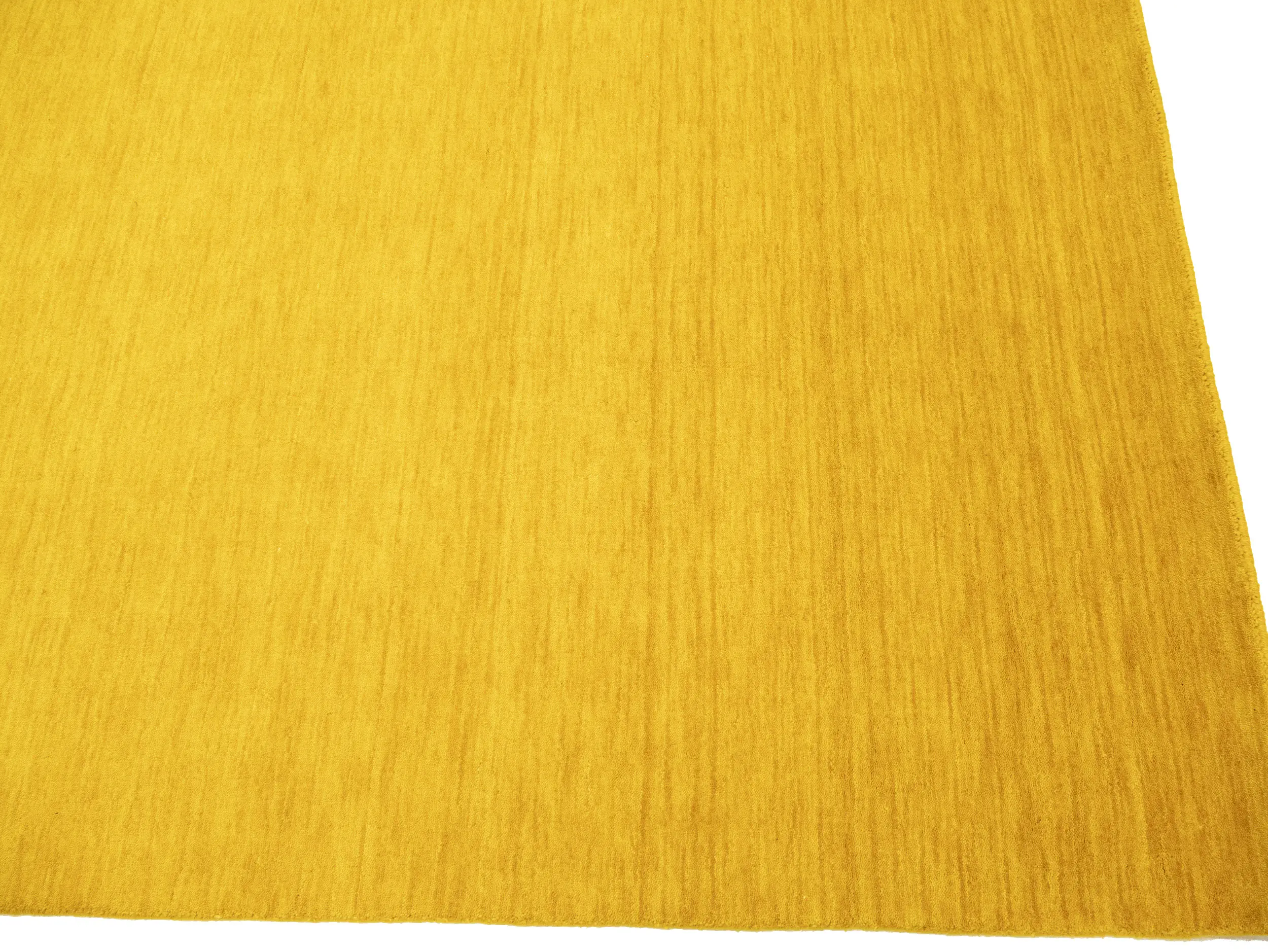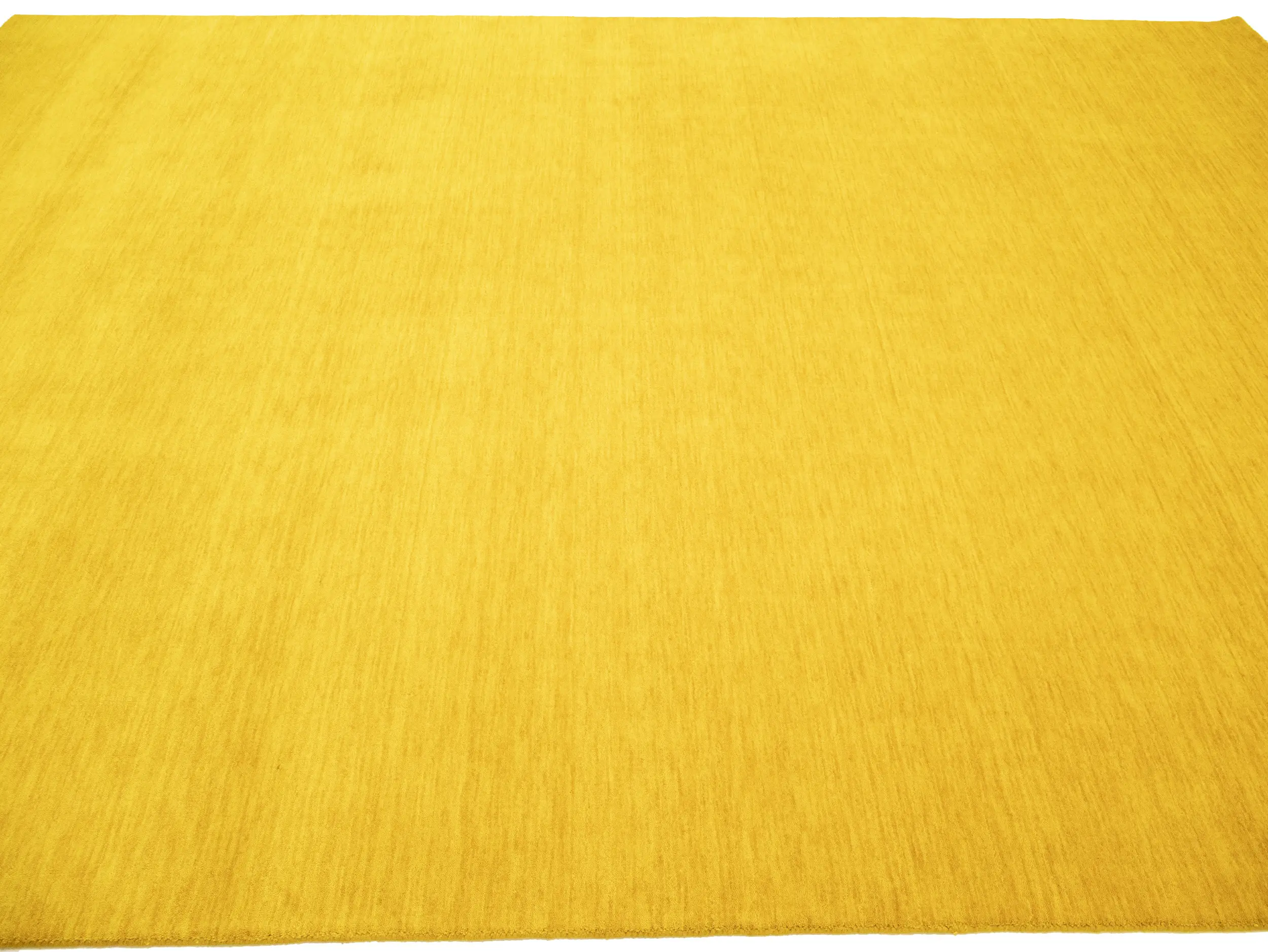 This hand-loomed 9X12 Marigold Oriental rug from India features a modern, Solid design that seamlessly integrates traditional craftsmanship with contemporary style, showcasing a striking Marigold primary color. It provides a luxuriant softness and durability underfoot, as it is constructed from premium wool with a cotton foundation. The rug is optimized for high-traffic areas due to its medium pile height and knot density of 100 knots per square inch, which ensures durability and comfort. This rug, which is in exceptional condition and was recently manufactured, is an ideal complement to any contemporary setting, providing both versatility and timeless elegance.