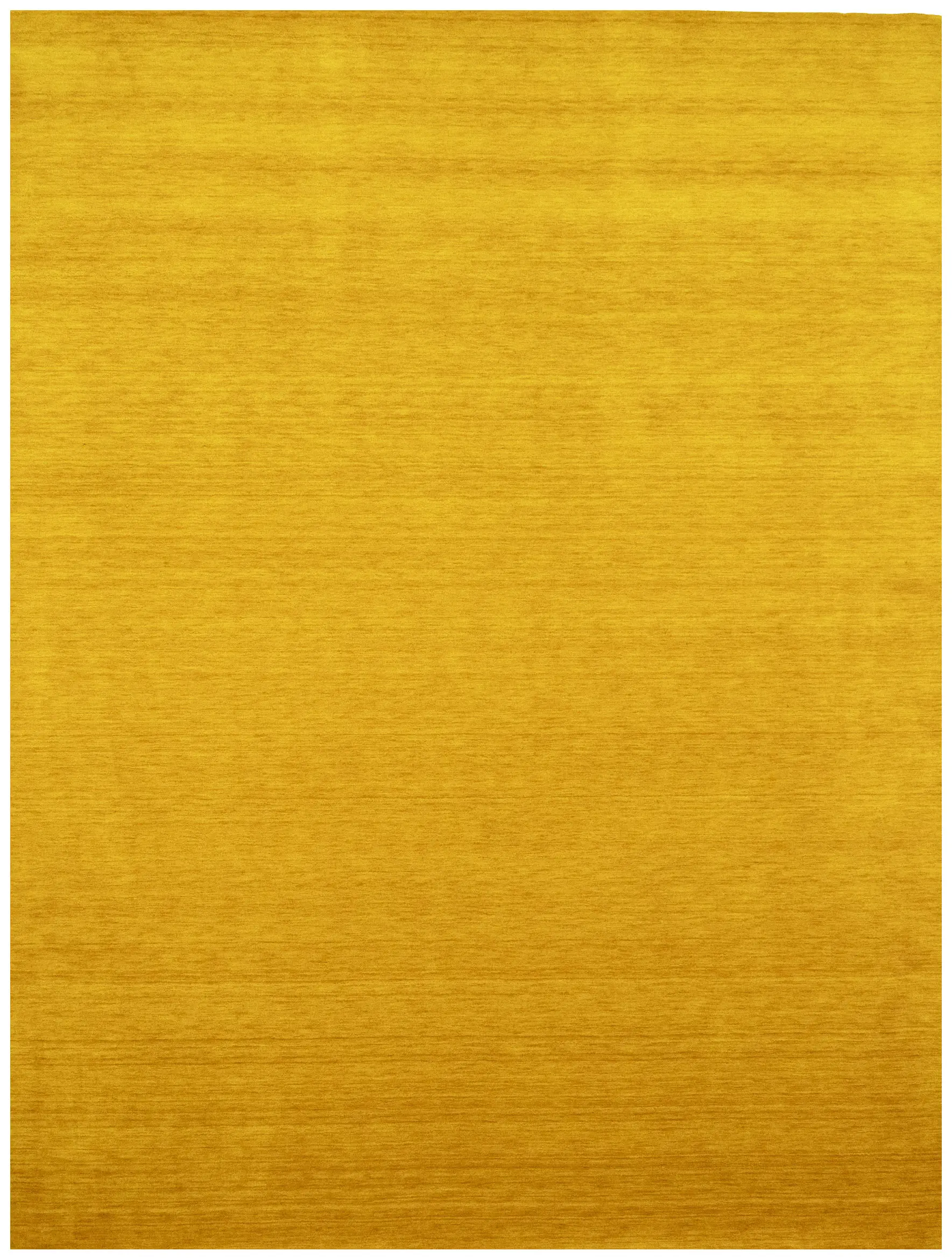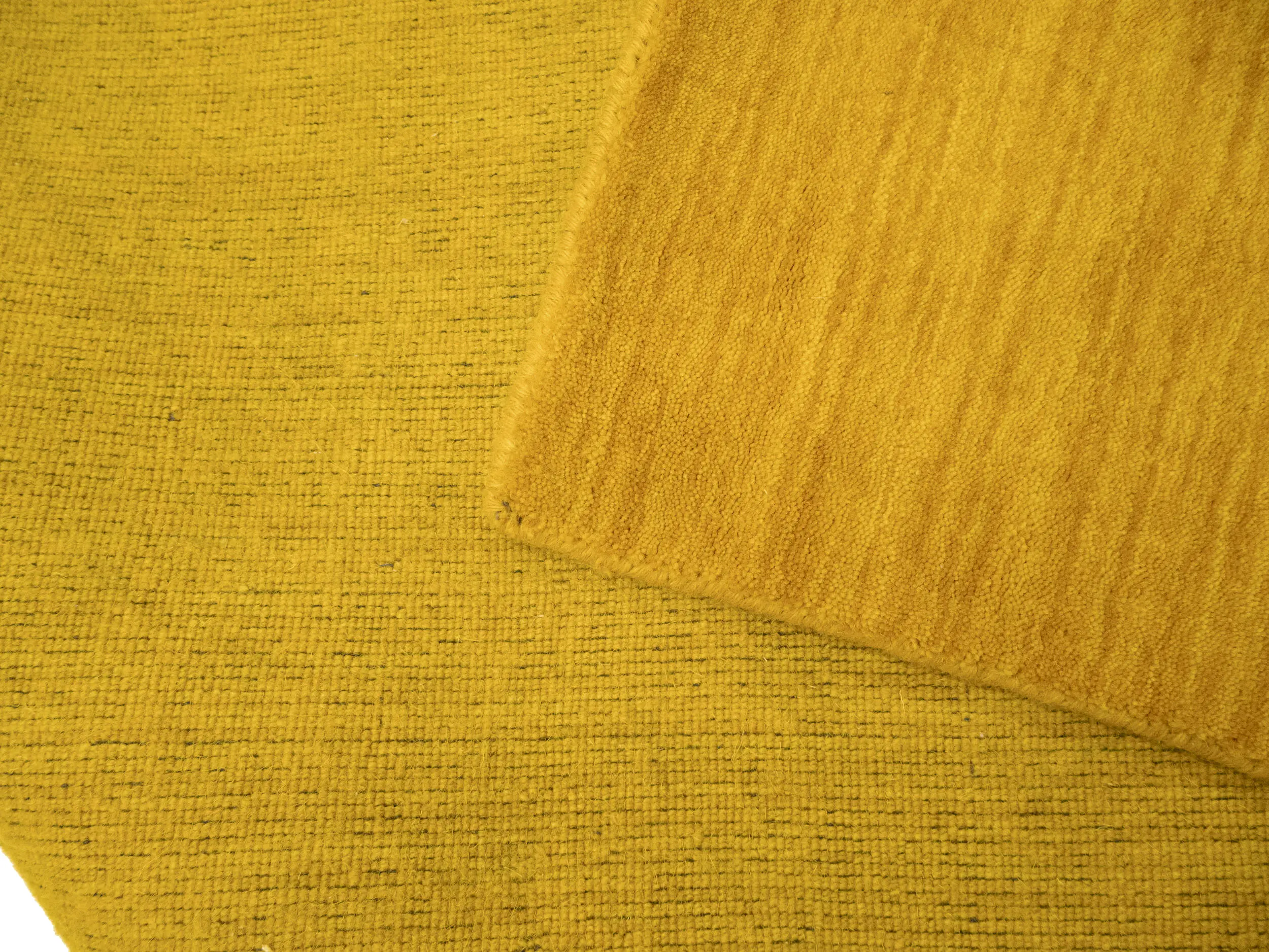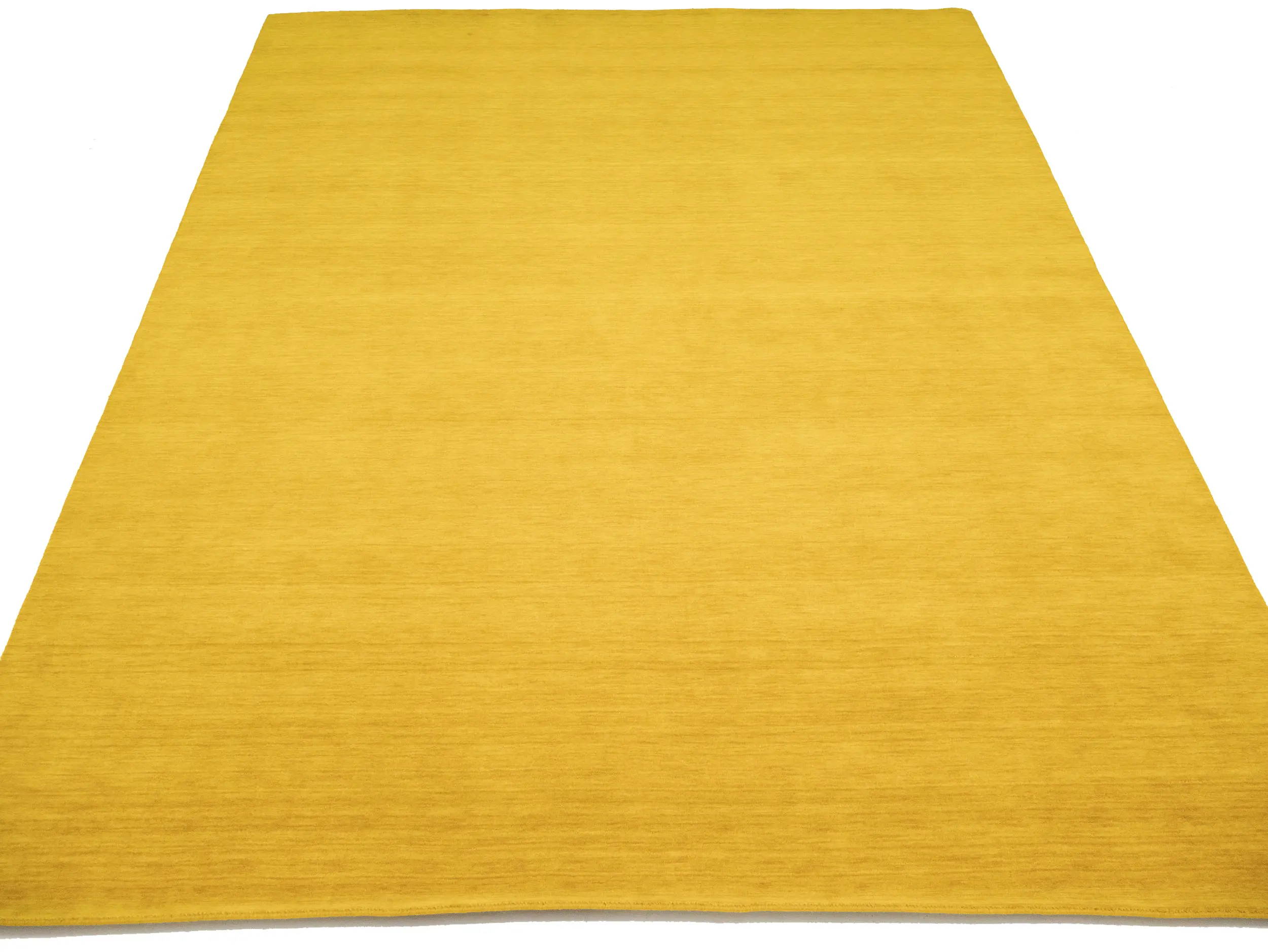 This hand-loomed 9X12 Marigold Oriental rug from India features a modern, Solid design that seamlessly integrates traditional craftsmanship with contemporary style, showcasing a striking Marigold primary color. It provides a luxuriant softness and durability underfoot, as it is constructed from premium wool with a cotton foundation. The rug is optimized for high-traffic areas due to its medium pile height and knot density of 100 knots per square inch, which ensures durability and comfort. This rug, which is in exceptional condition and was recently manufactured, is an ideal complement to any contemporary setting, providing both versatility and timeless elegance.
