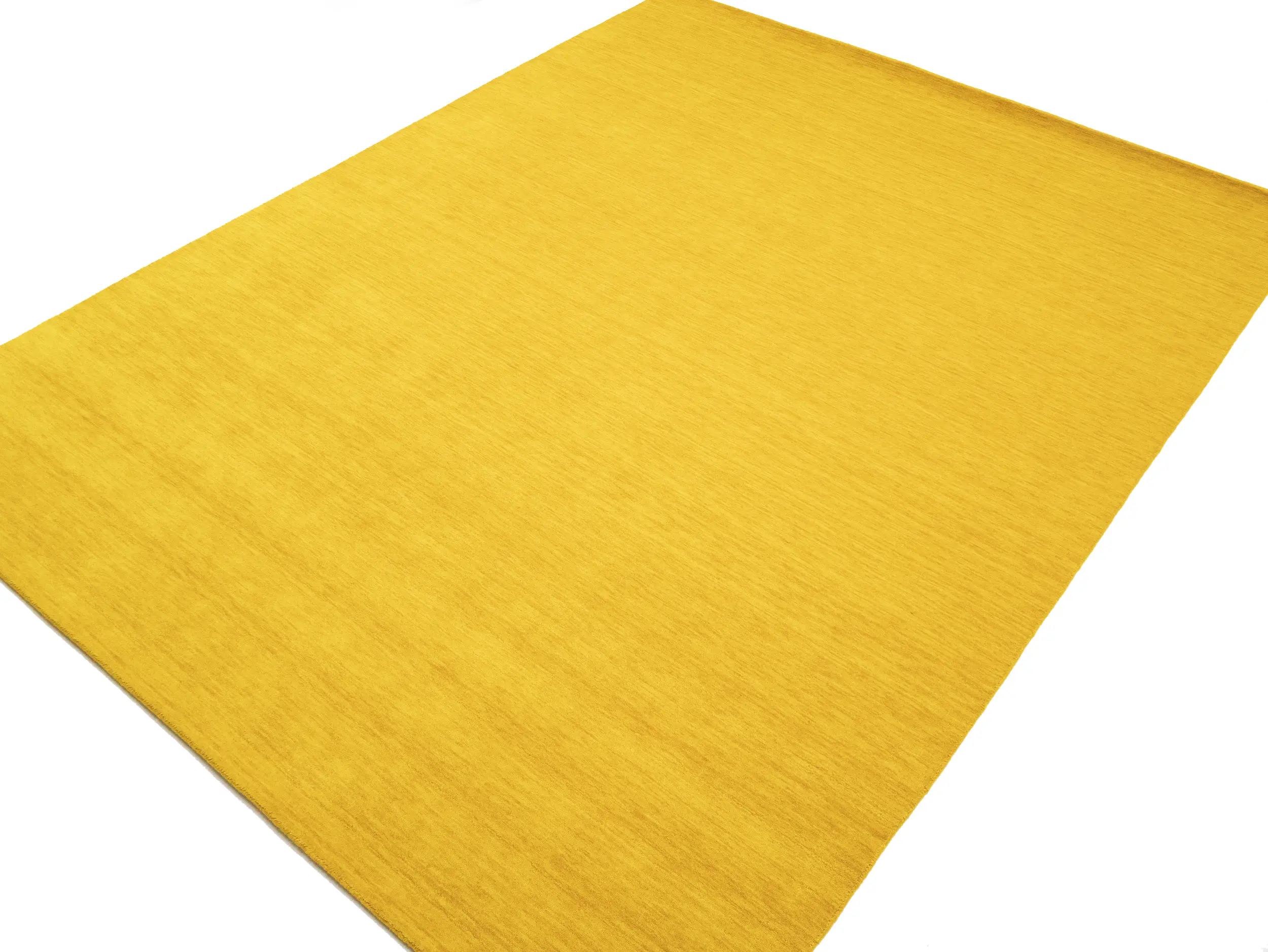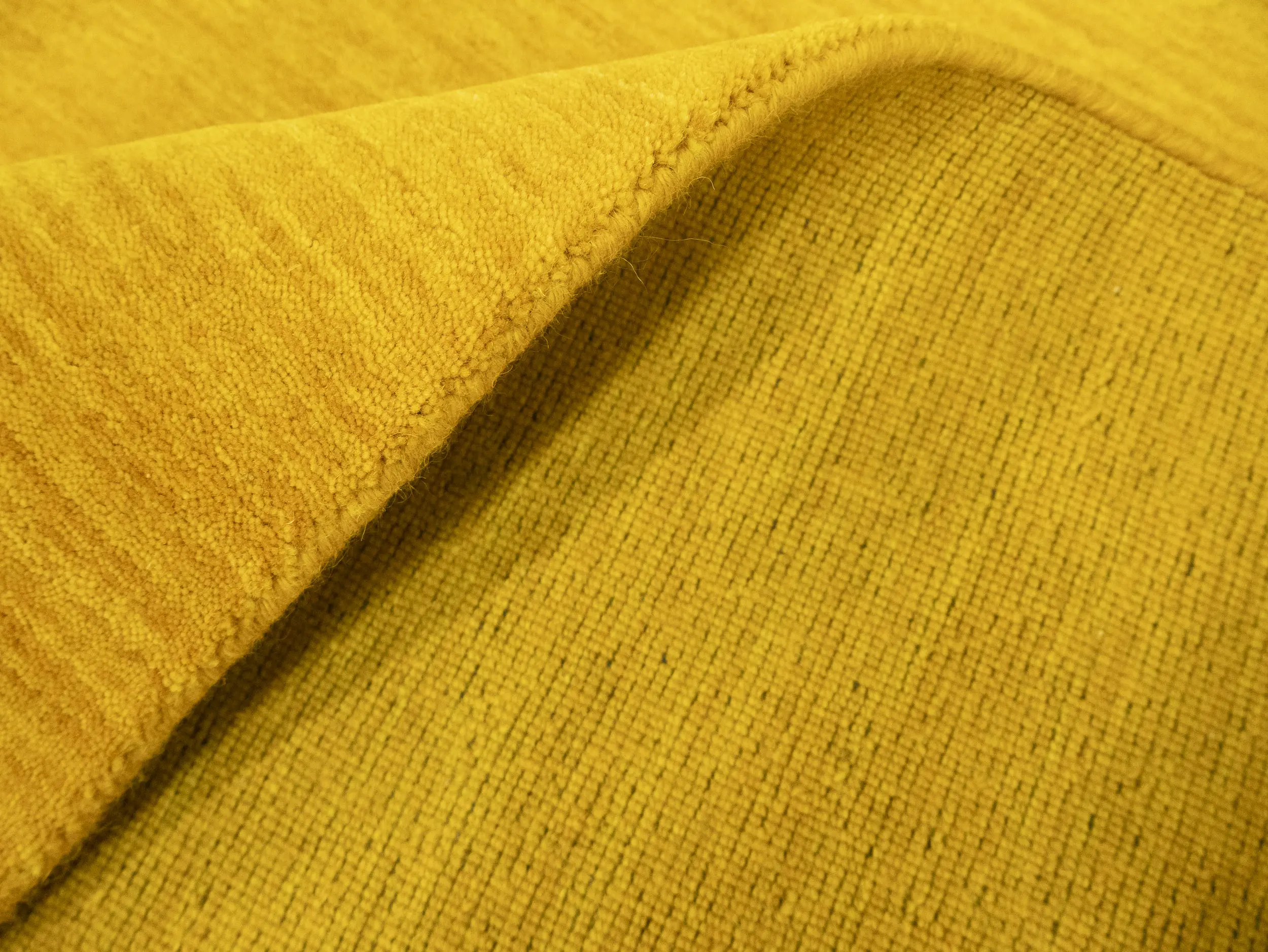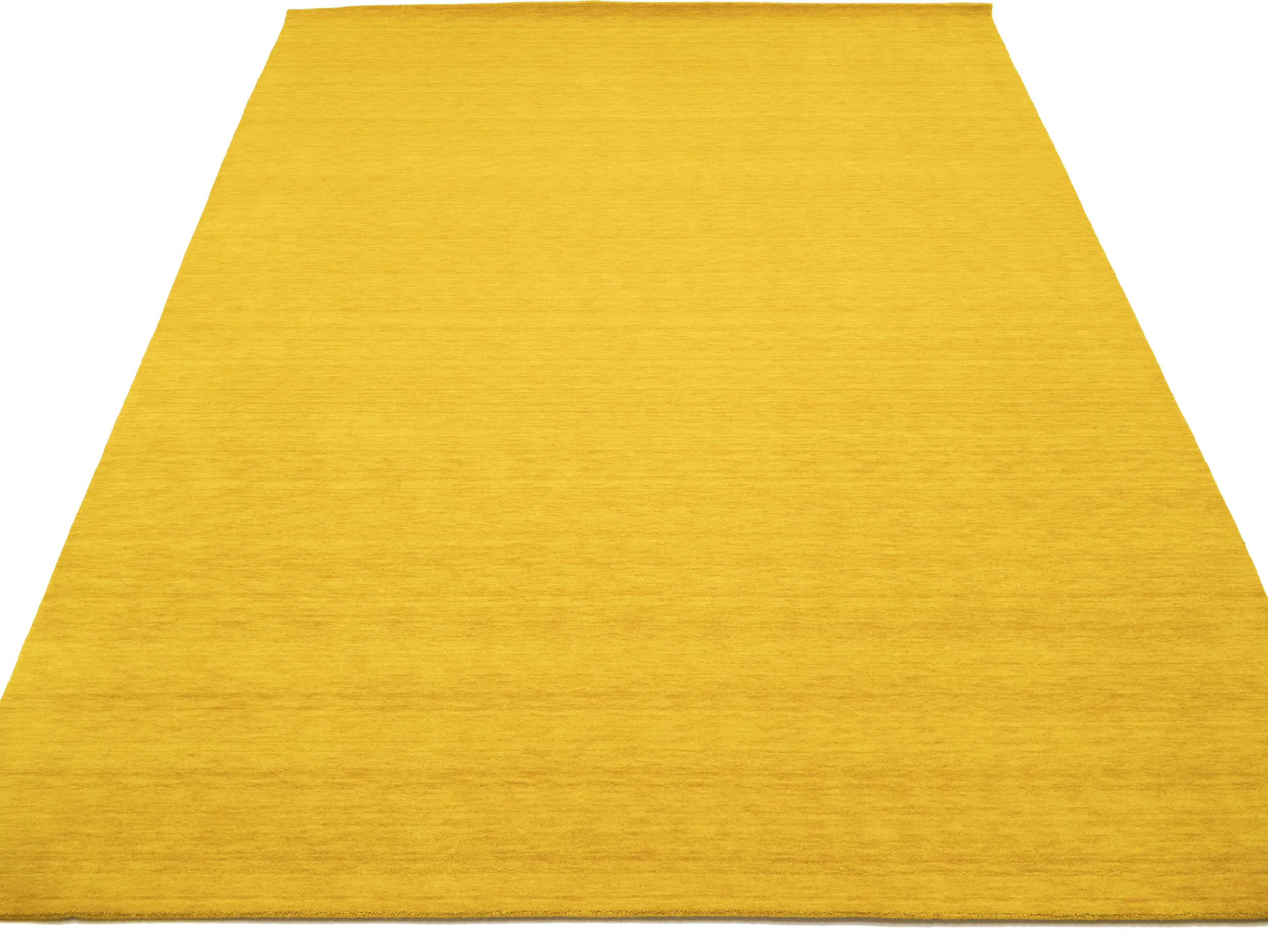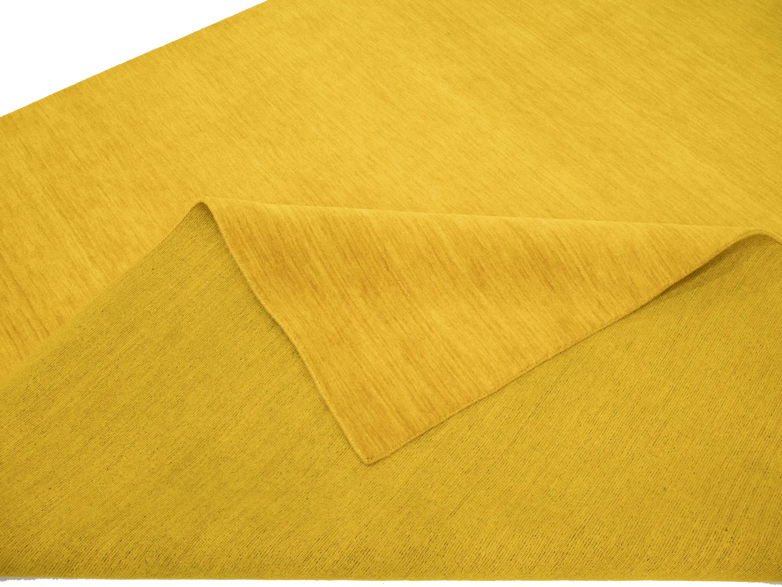 This hand-loomed 9X12 Marigold Oriental rug from India features a modern, Solid design that seamlessly integrates traditional craftsmanship with contemporary style, showcasing a striking Marigold primary color. It provides a luxuriant softness and durability underfoot, as it is constructed from premium wool with a cotton foundation. The rug is optimized for high-traffic areas due to its medium pile height and knot density of 100 knots per square inch, which ensures durability and comfort. This rug, which is in exceptional condition and was recently manufactured, is an ideal complement to any contemporary setting, providing both versatility and timeless elegance.