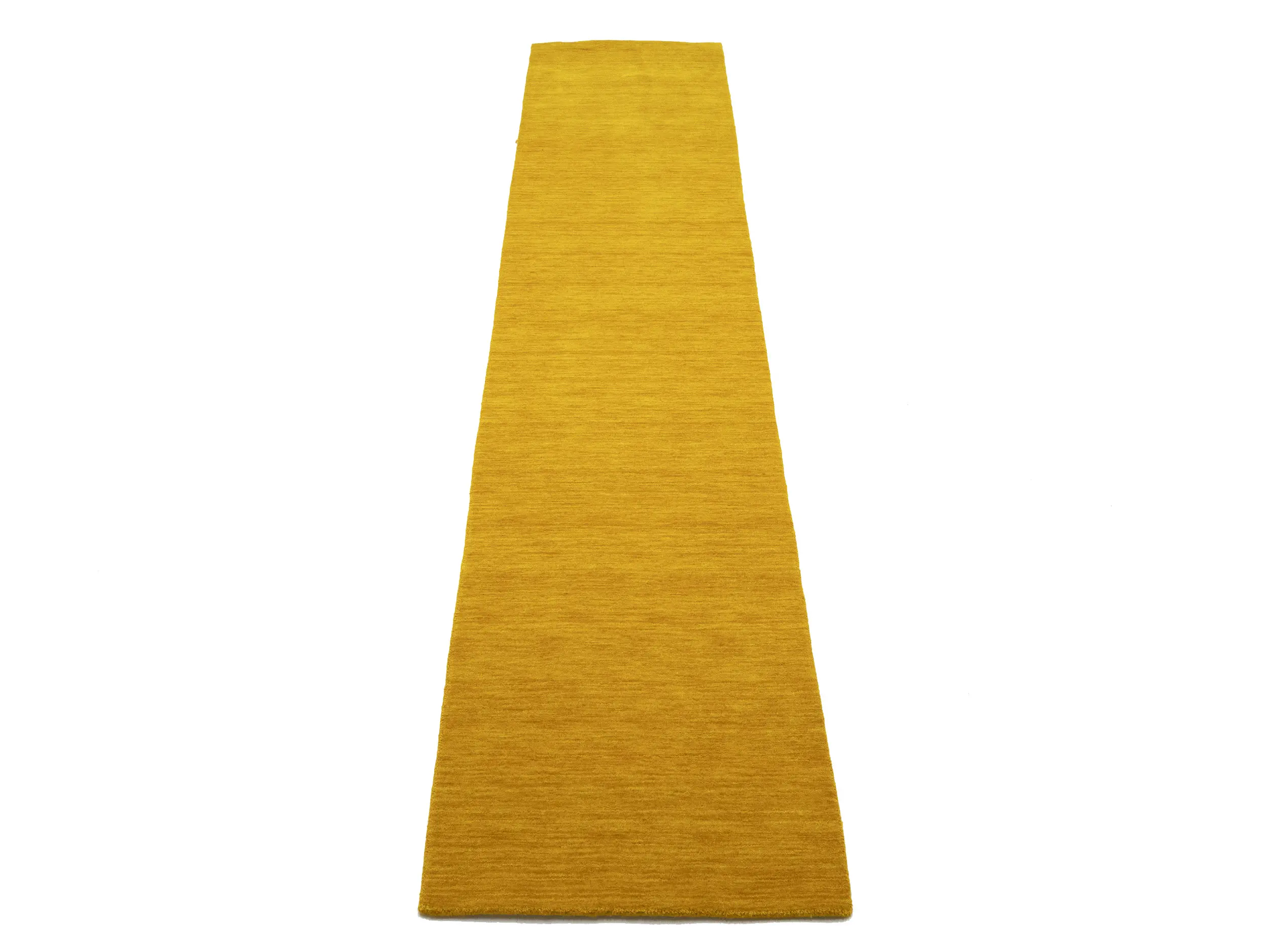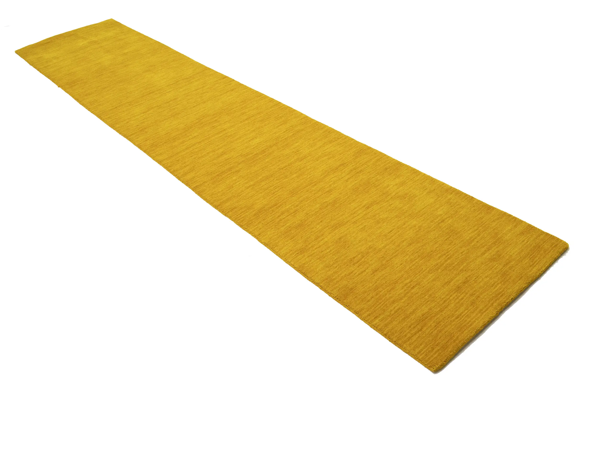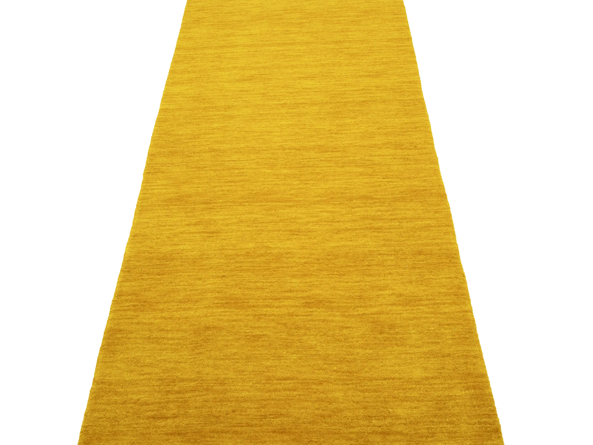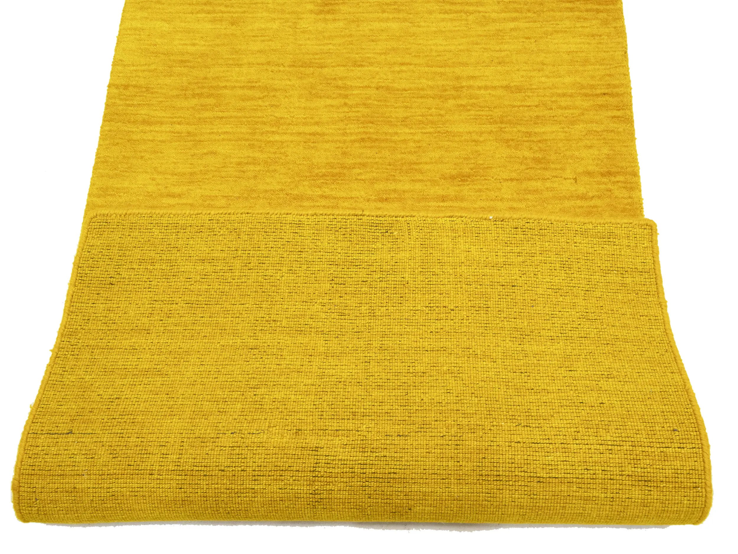 This hand-loomed 3X12 Marigold Oriental Runner rug from India features a modern, Solid design that seamlessly integrates traditional craftsmanship with contemporary style, showcasing a striking Marigold primary color. It provides a luxuriant softness and durability underfoot, as it is constructed from premium wool with a cotton foundation. The rug is optimized for high-traffic areas due to its medium pile height and knot density of 100 knots per square inch, which ensures durability and comfort. This rug, which is in exceptional condition and was recently manufactured, is an ideal complement to any contemporary setting, providing both versatility and timeless elegance.