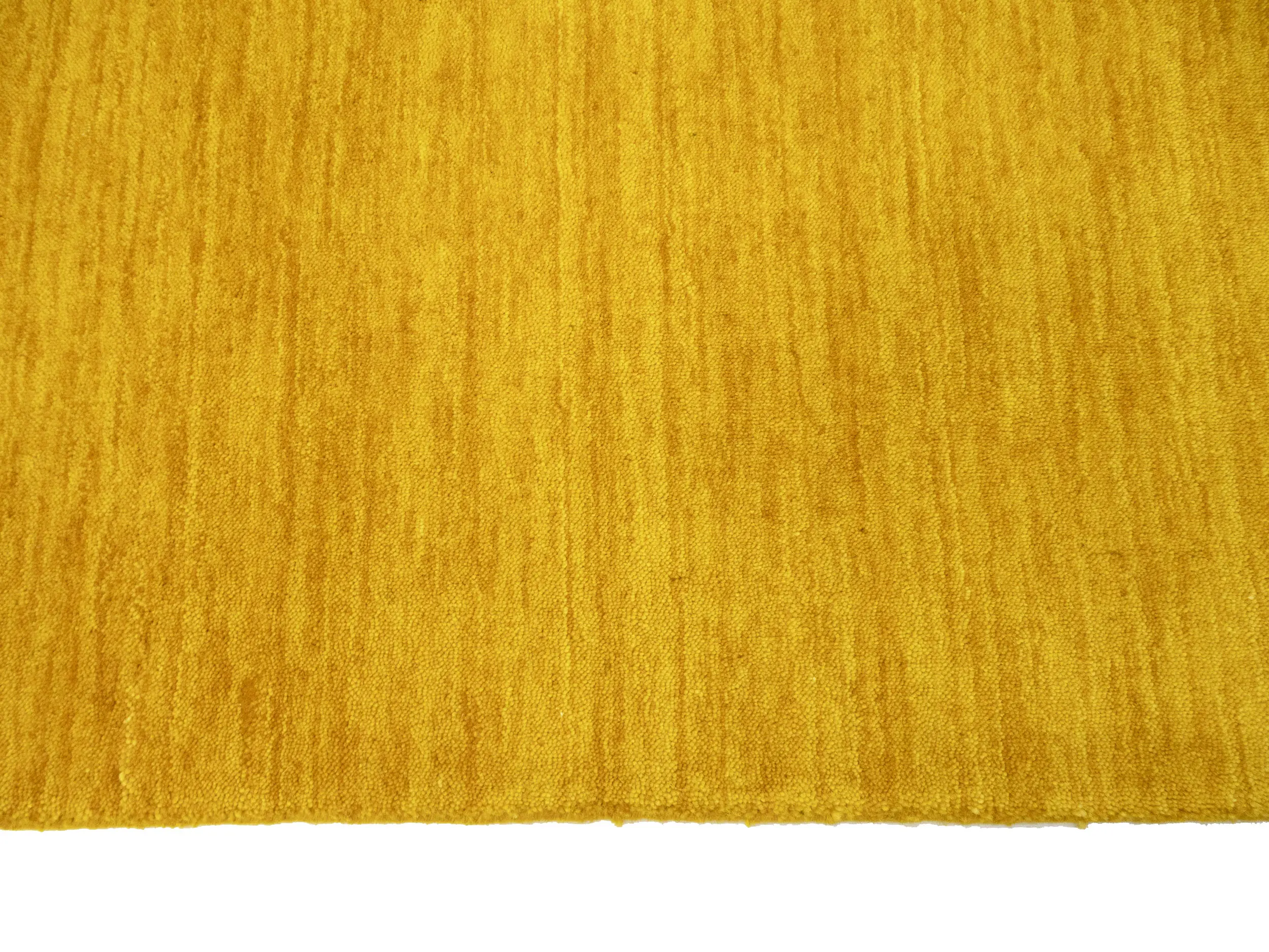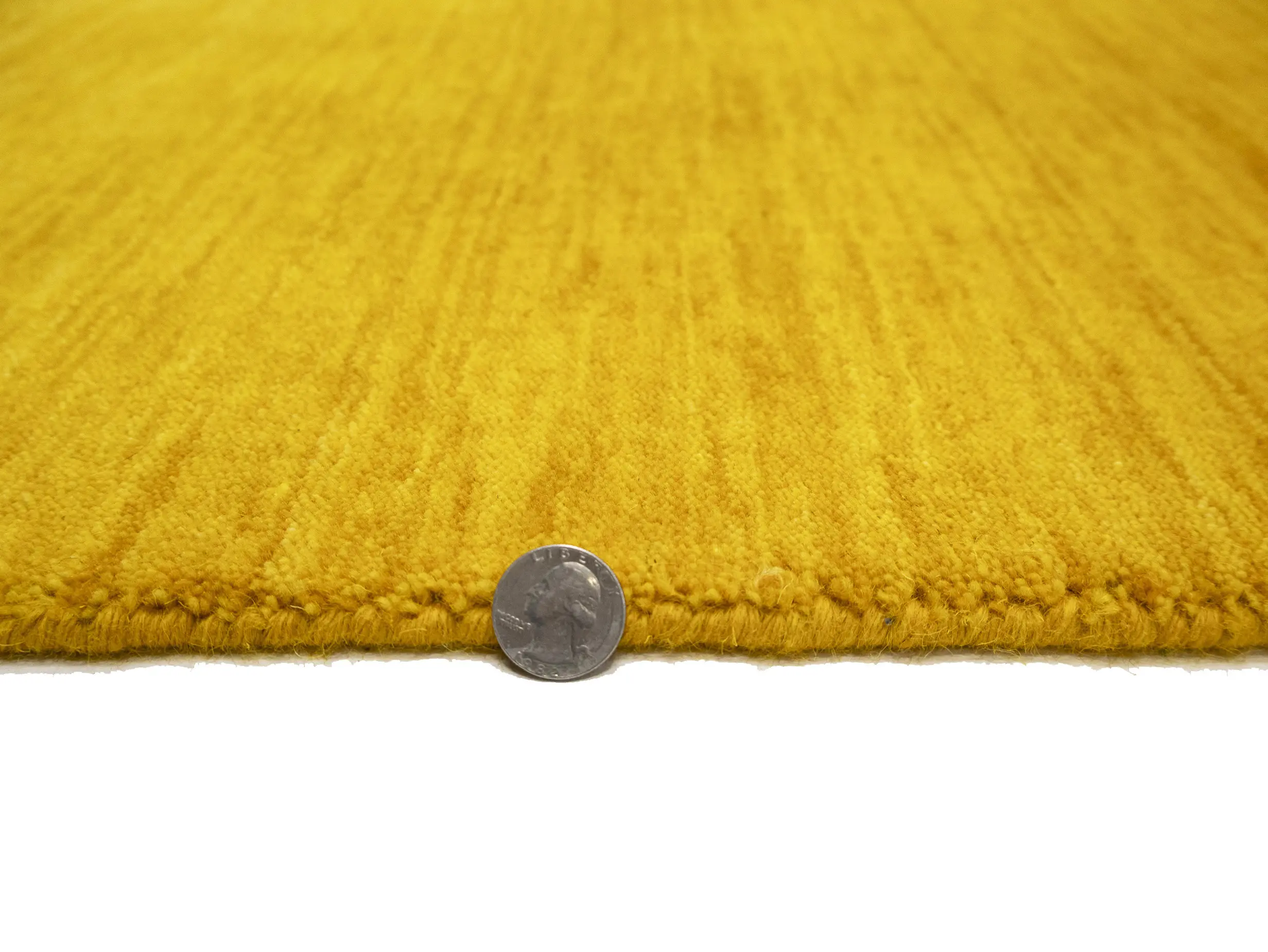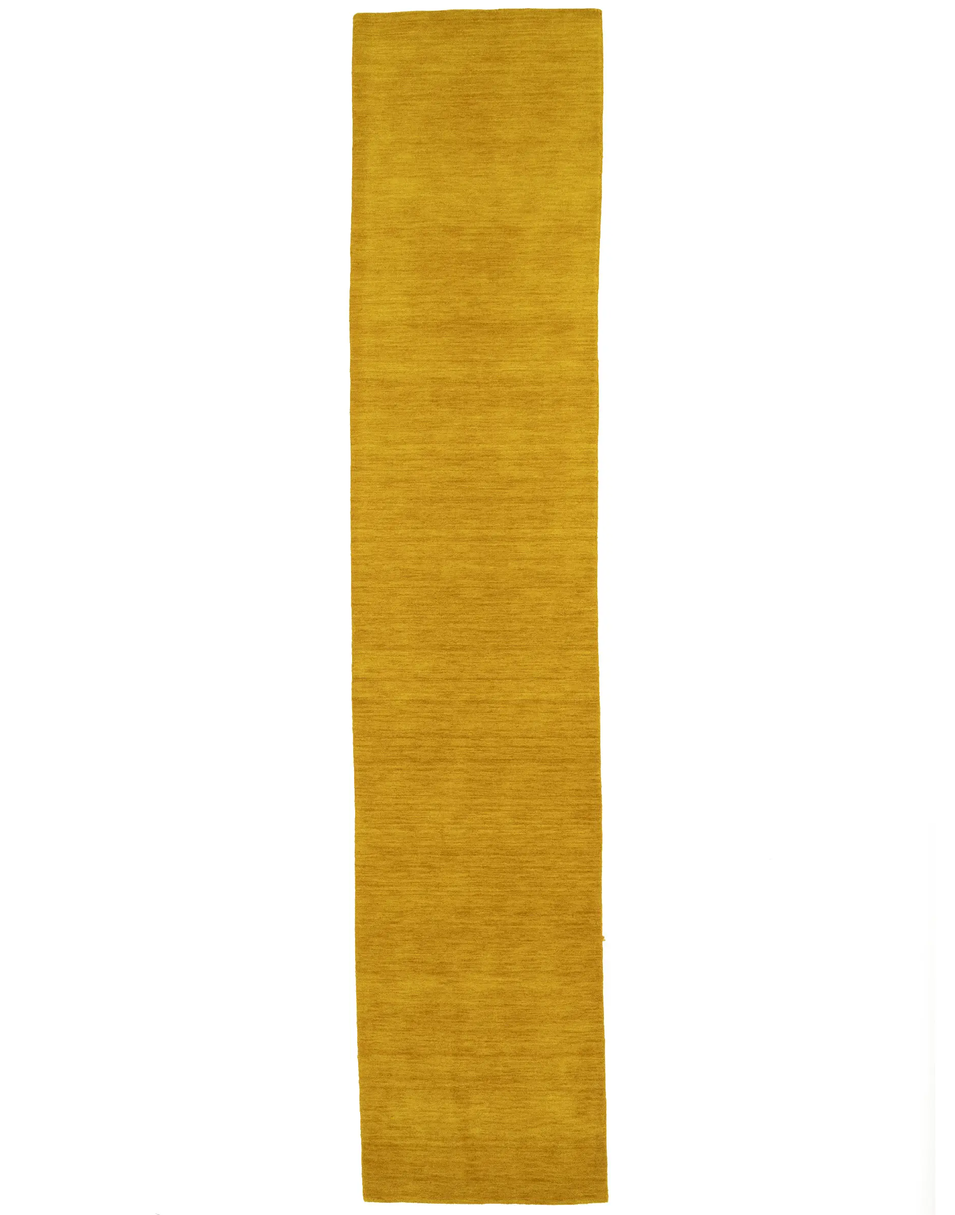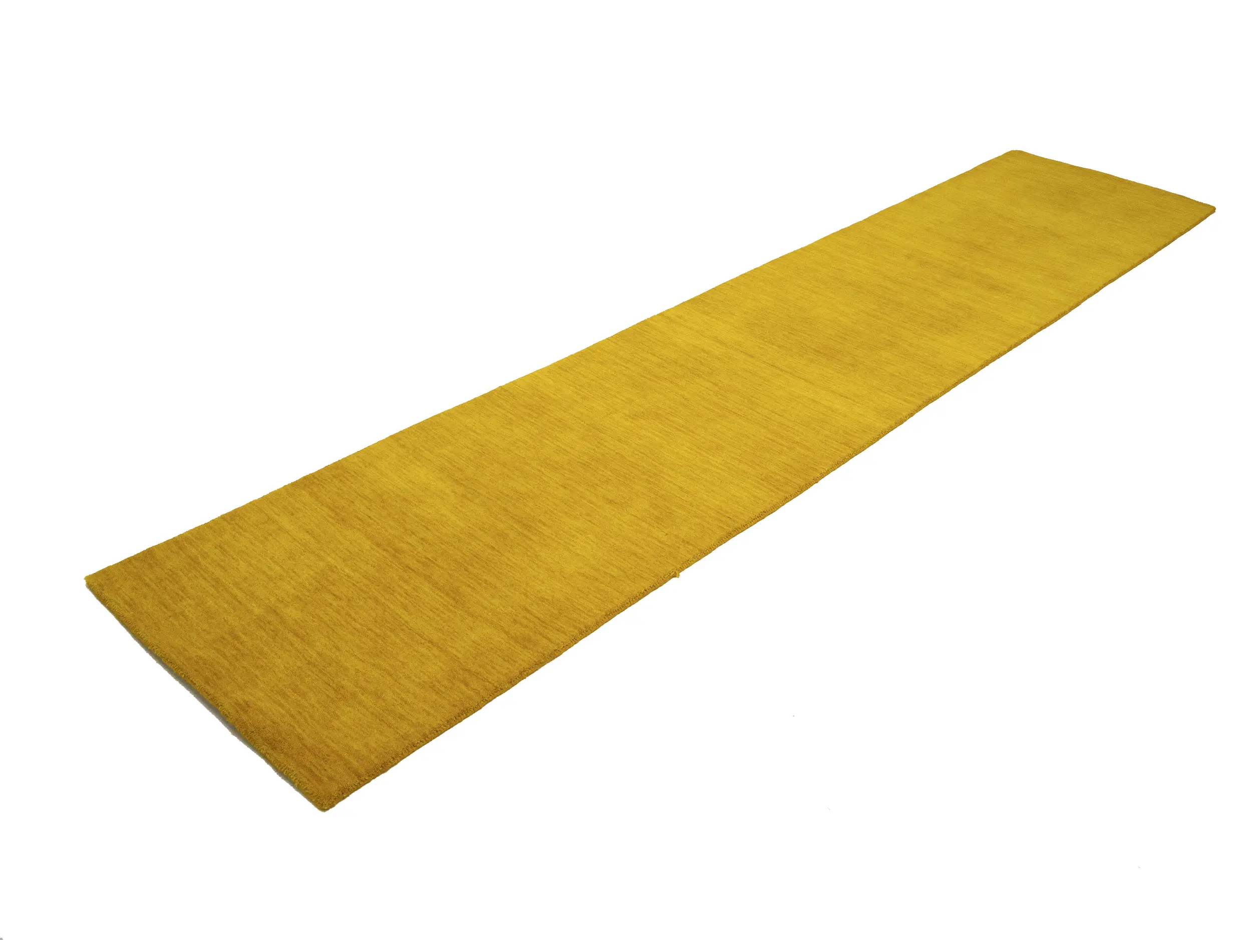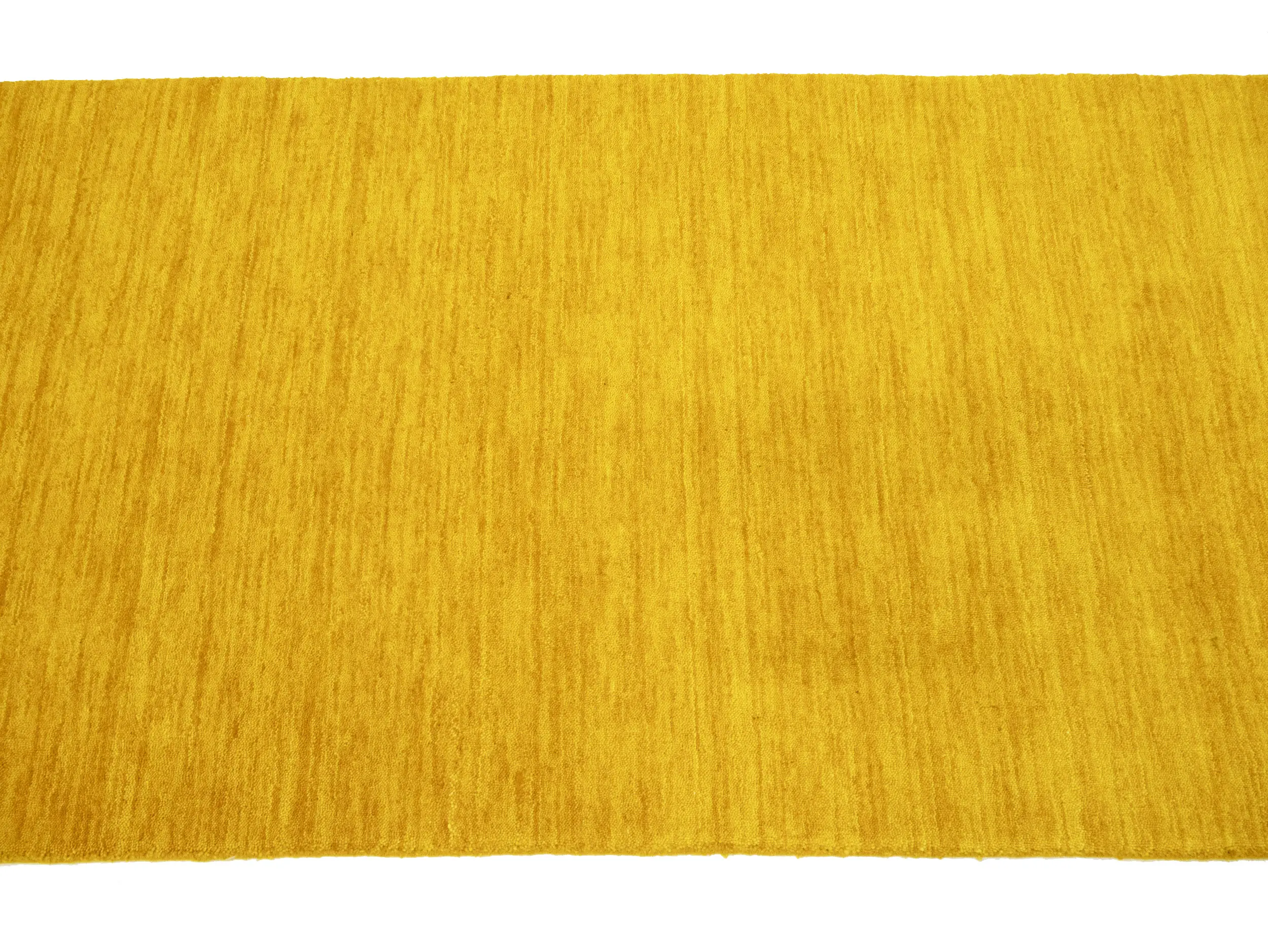 This hand-loomed 3X12 Marigold Oriental Runner rug from India features a modern, Solid design that seamlessly integrates traditional craftsmanship with contemporary style, showcasing a striking Marigold primary color. It provides a luxuriant softness and durability underfoot, as it is constructed from premium wool with a cotton foundation. The rug is optimized for high-traffic areas due to its medium pile height and knot density of 100 knots per square inch, which ensures durability and comfort. This rug, which is in exceptional condition and was recently manufactured, is an ideal complement to any contemporary setting, providing both versatility and timeless elegance.