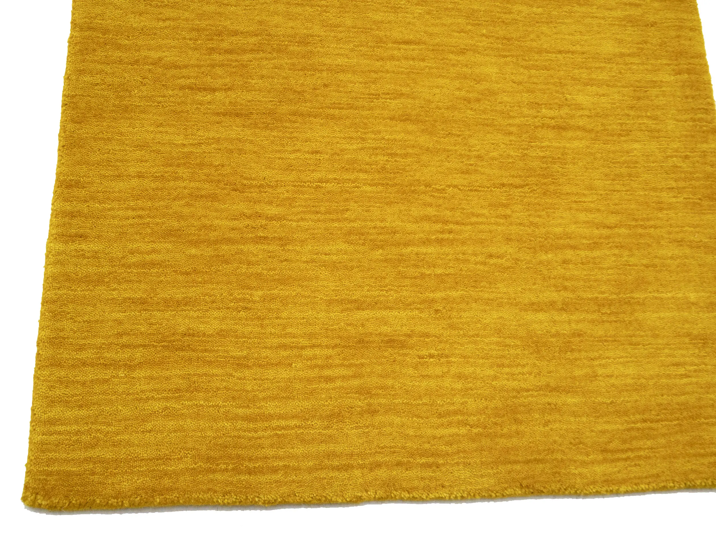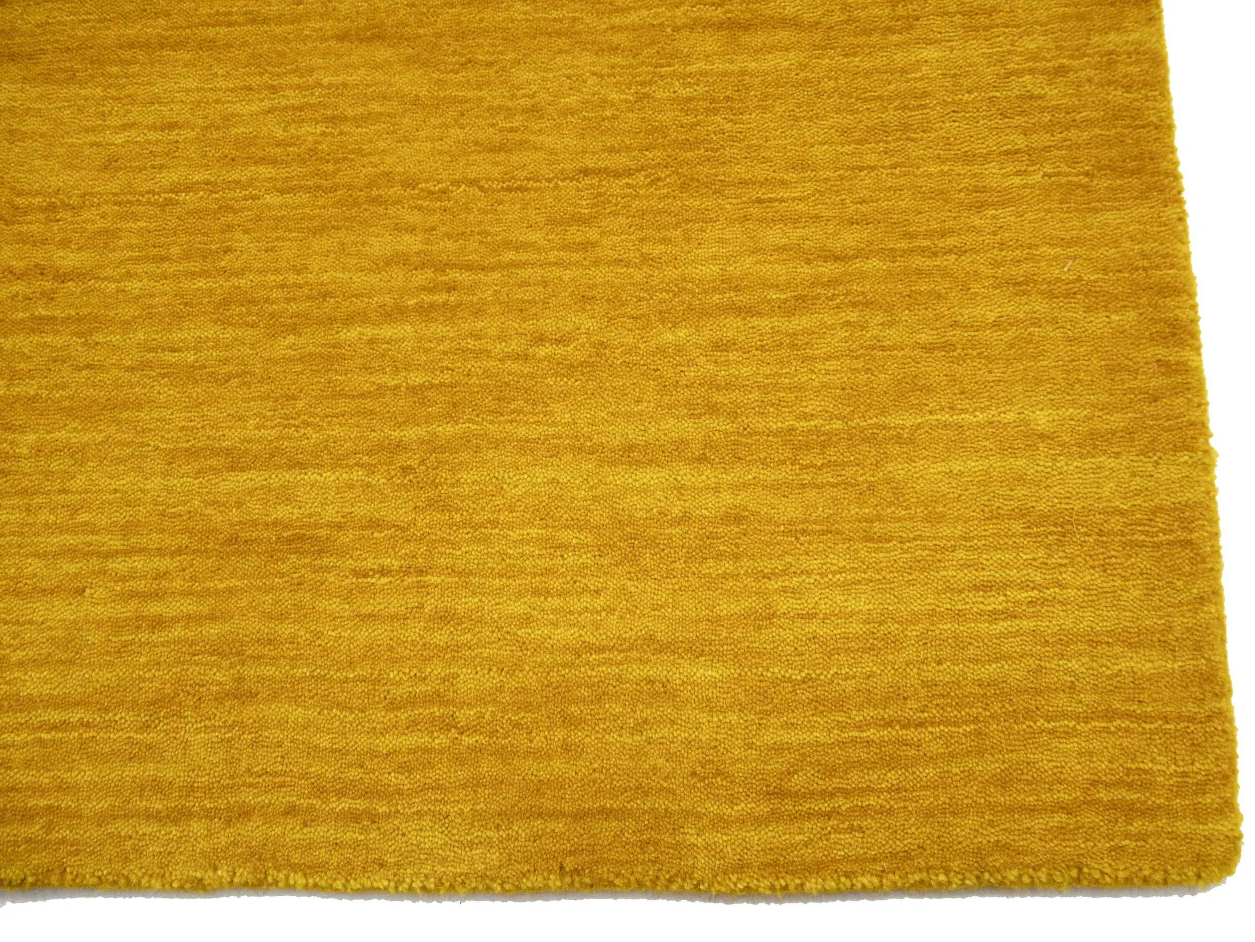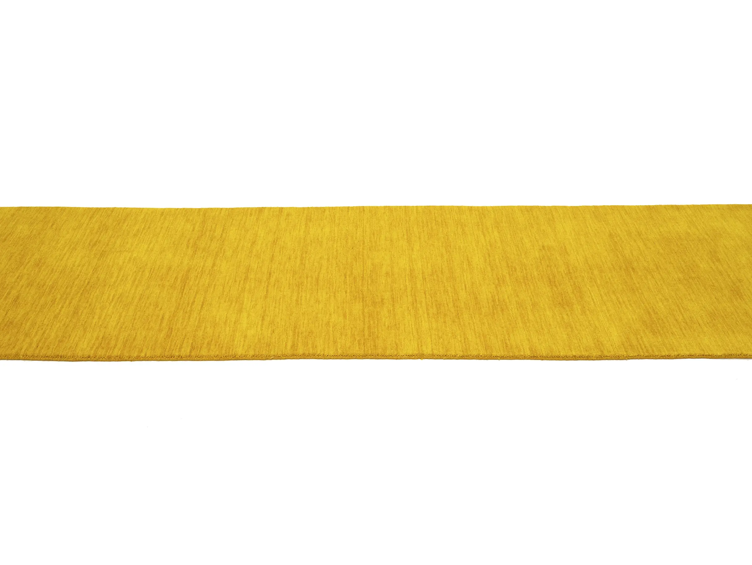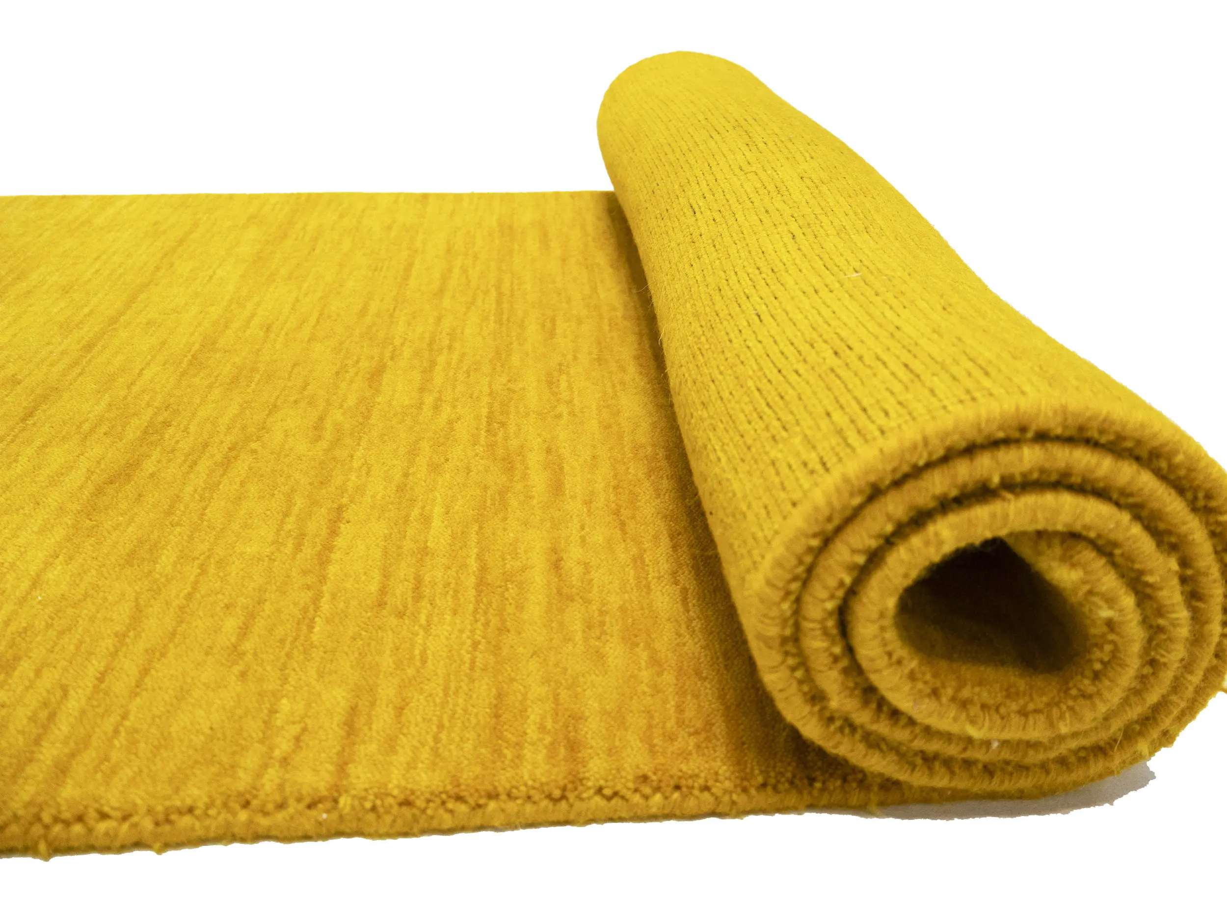 This hand-loomed 3X12 Marigold Oriental Runner rug from India features a modern, Solid design that seamlessly integrates traditional craftsmanship with contemporary style, showcasing a striking Marigold primary color. It provides a luxuriant softness and durability underfoot, as it is constructed from premium wool with a cotton foundation. The rug is optimized for high-traffic areas due to its medium pile height and knot density of 100 knots per square inch, which ensures durability and comfort. This rug, which is in exceptional condition and was recently manufactured, is an ideal complement to any contemporary setting, providing both versatility and timeless elegance.