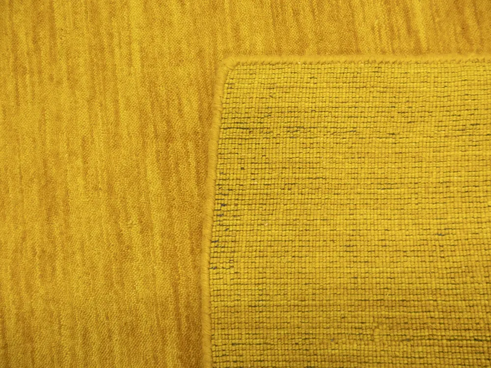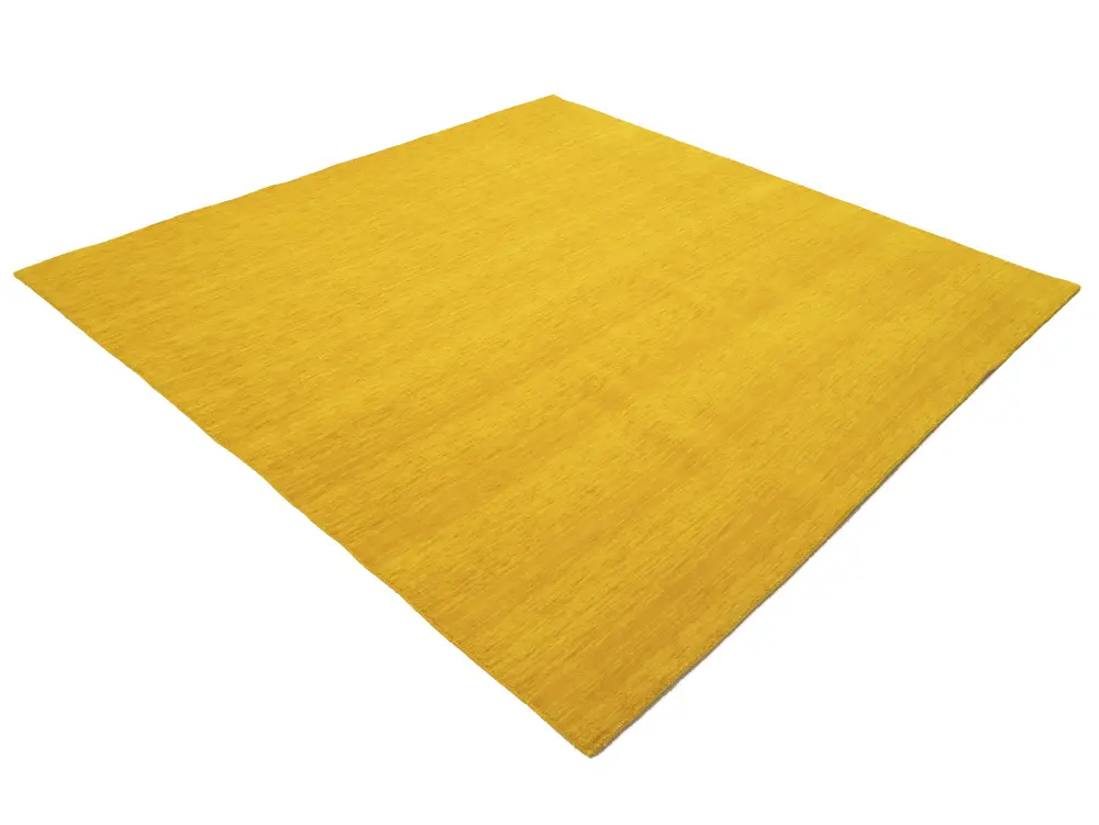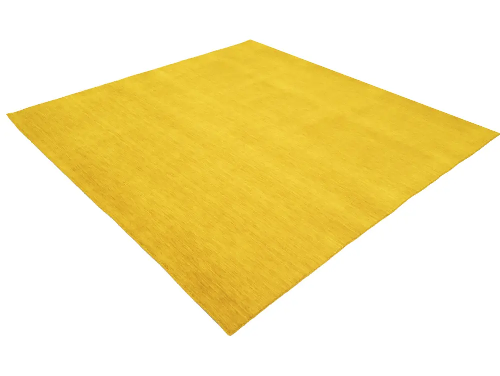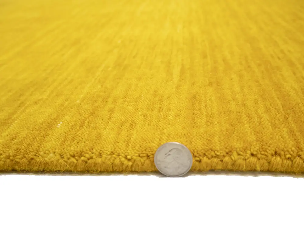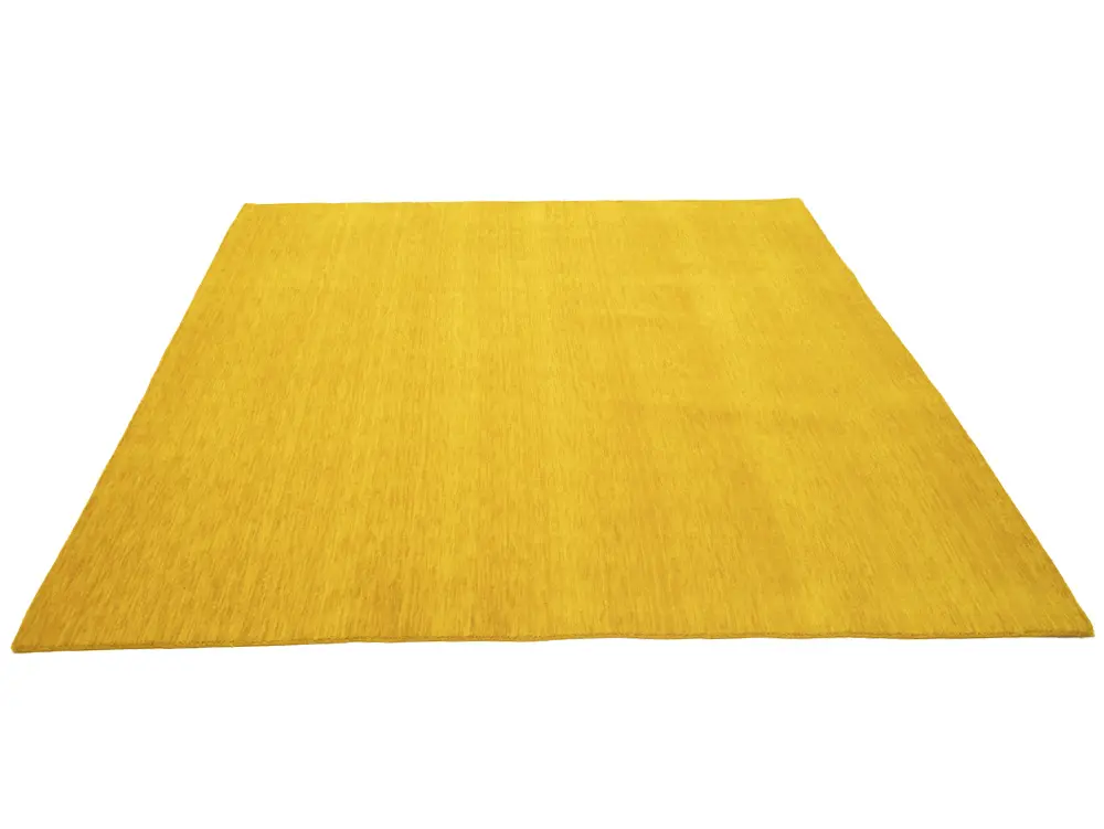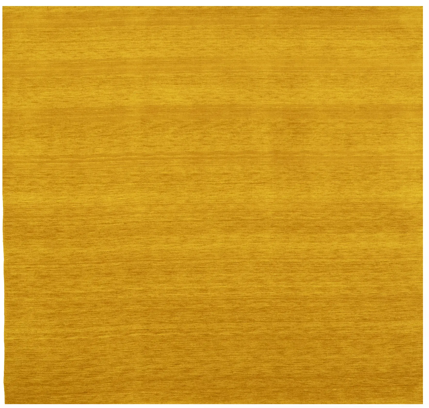 This hand-loomed 8X8 Marigold Oriental Square rug from India features a modern, Solid design that seamlessly integrates traditional craftsmanship with contemporary style, showcasing a striking Marigold primary color. It provides a luxuriant softness and durability underfoot, as it is constructed from premium wool with a cotton foundation. The rug is optimized for high-traffic areas due to its medium pile height and knot density of 100 knots per square inch, which ensures durability and comfort. This rug, which is in exceptional condition and was recently manufactured, is an ideal complement to any contemporary setting, providing both versatility and timeless elegance.