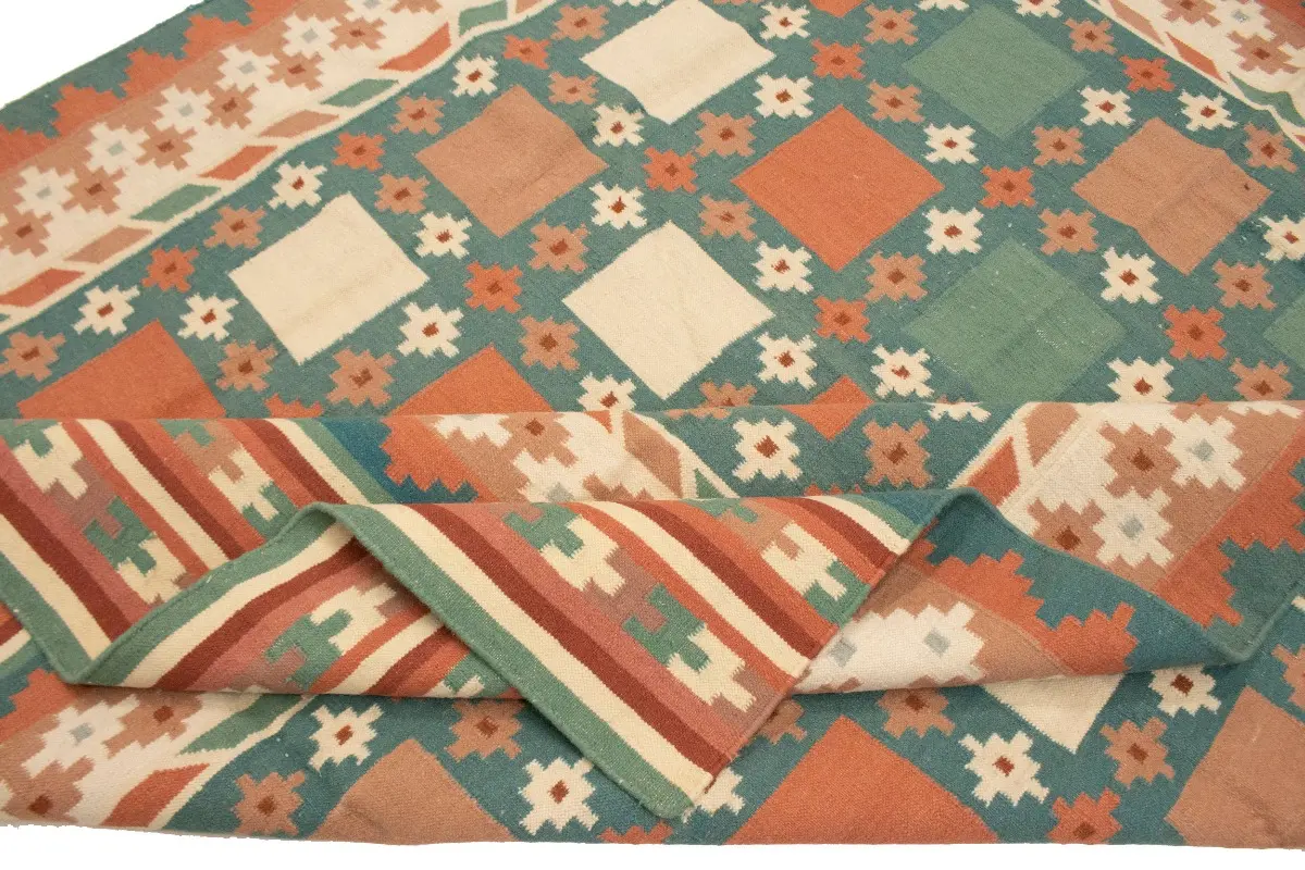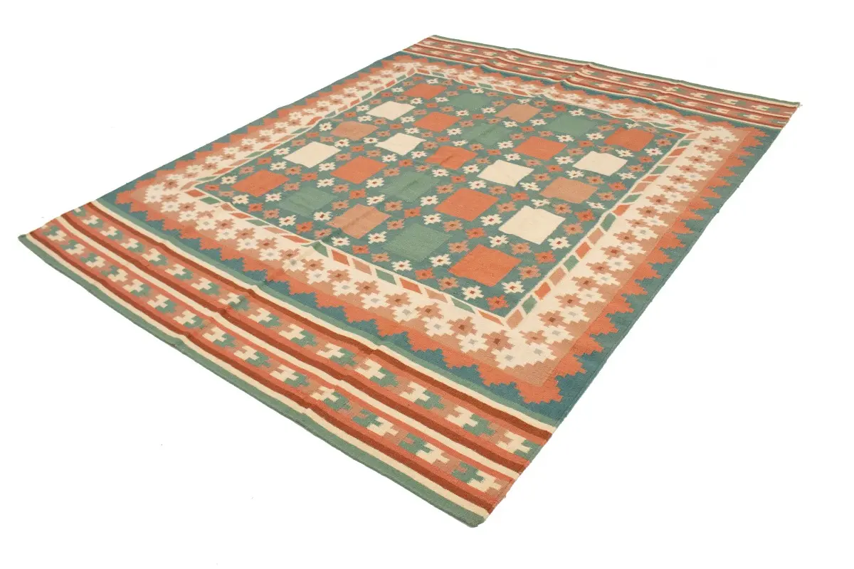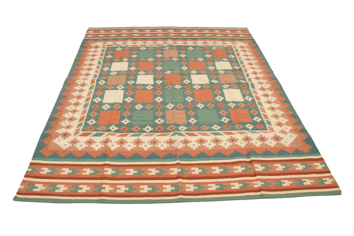 This original 7'5X9'4 teal new Oriental rug was made by the hands of talented weavers influenced by a variety of gorgeous symmetrical artistic designs, to recreate the aged look of the unique piece with a richness of color and very balanced background field. What set this vintage style Oriental area rug from the others are the material and dye used (wool pile and cotton foundation), knot count, antique designs, fantastic grades, and its regional historical connection: it has deep roots, from the story of the people who produced it to the meaning of the symbols and colors displayed across its canvas that have been praised for centuries. This Indian home décor carpet will be completely cozy and inviting that never will go out of style! Also, this Oriental rug would be among your most valuable treasures, it is a great investment that accrues value over time, and it will last a lifetime because was woven with high-quality, all-natural wool. Eco-friendly, opulent yet affordable; this rug will give you an extra pop of character to help define your home environment with sophistication and warmth that will capture the eyes and attention of your audience (homeowners, designers, decorators, family and friends). RT-1977