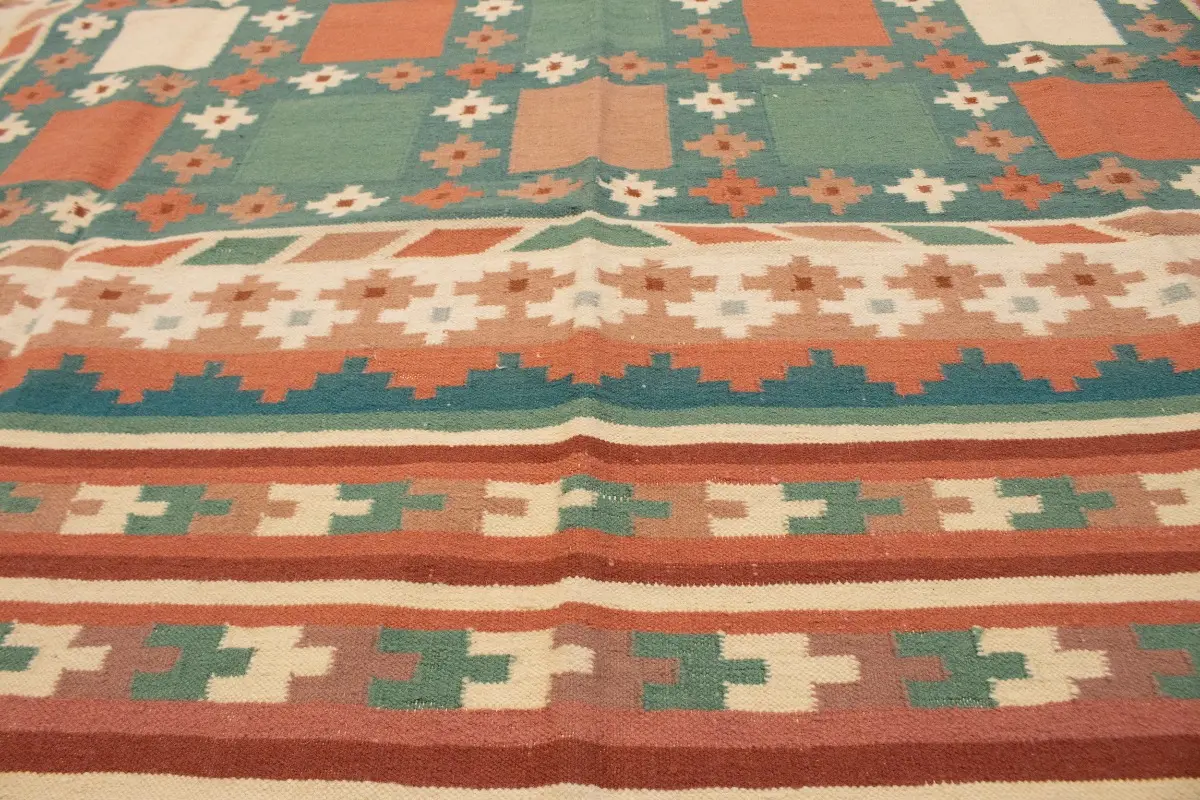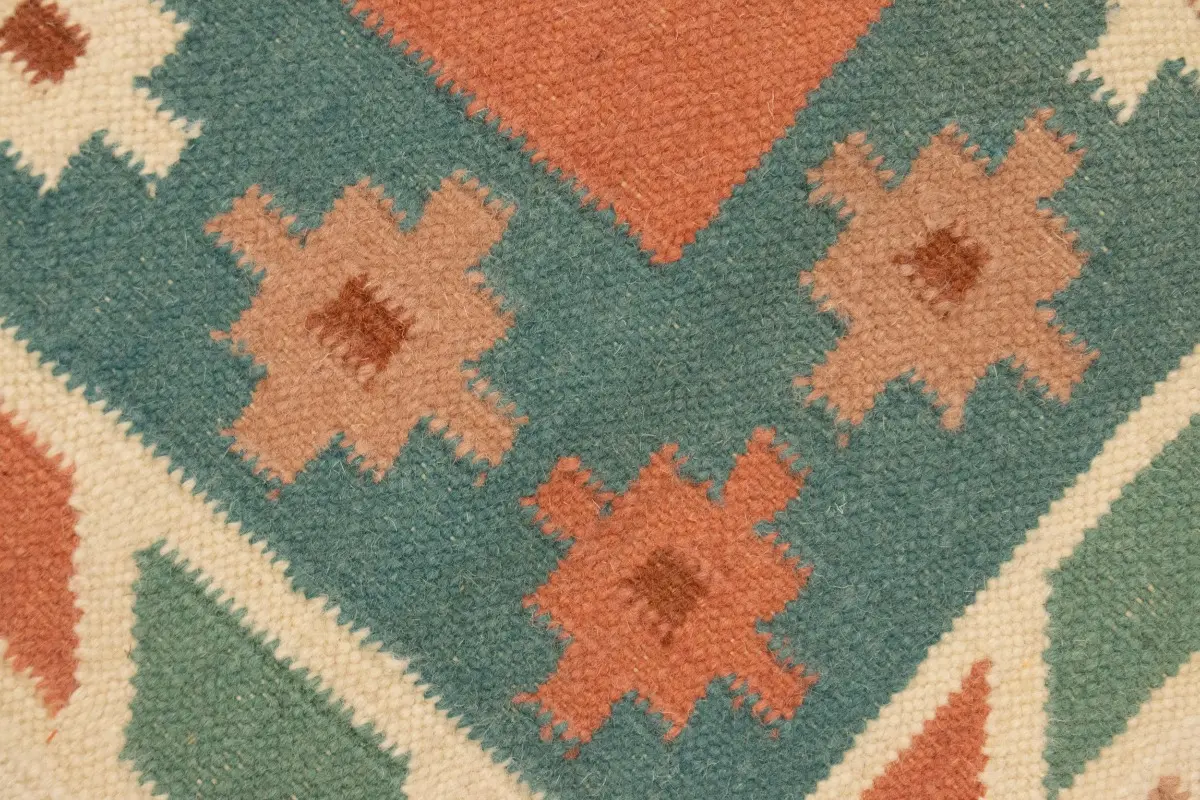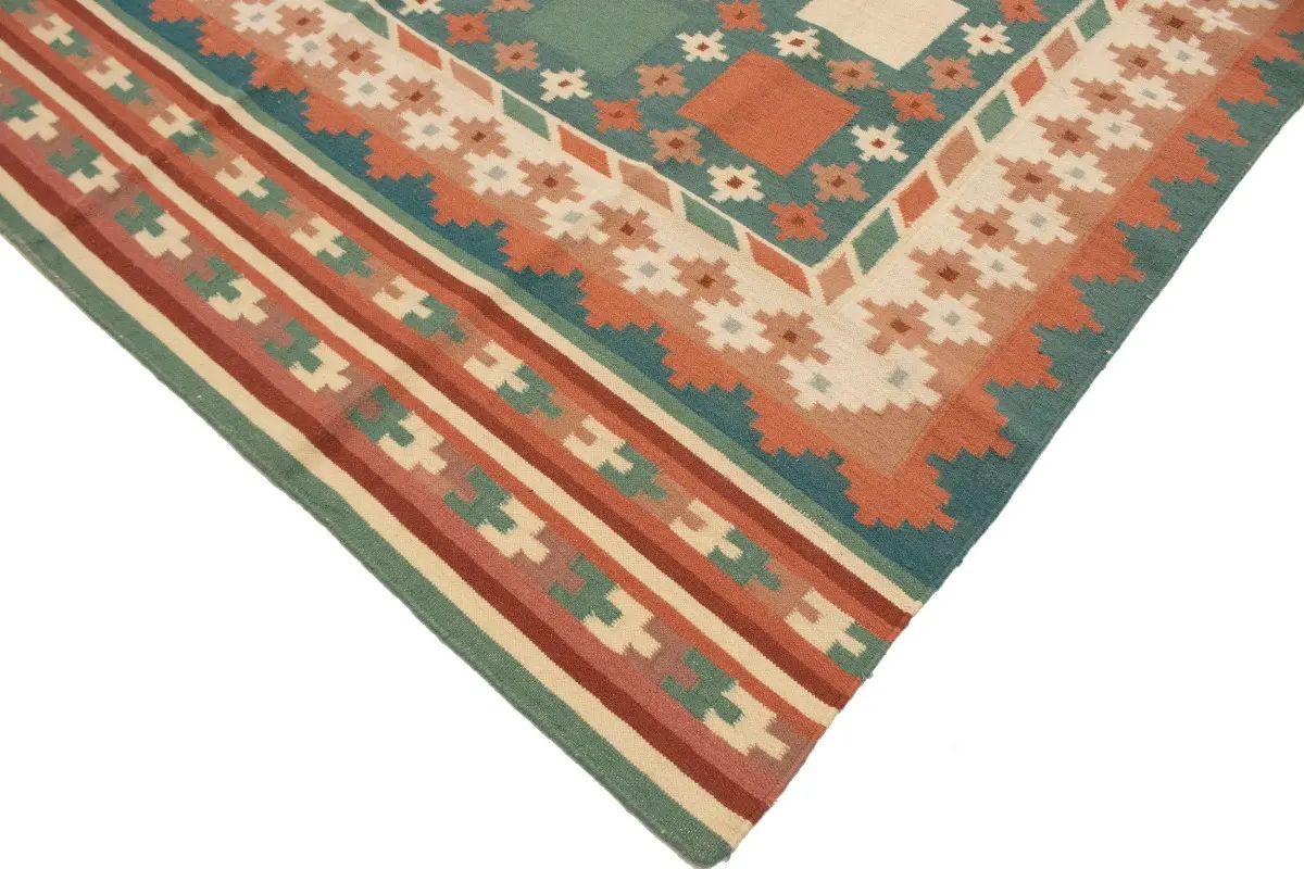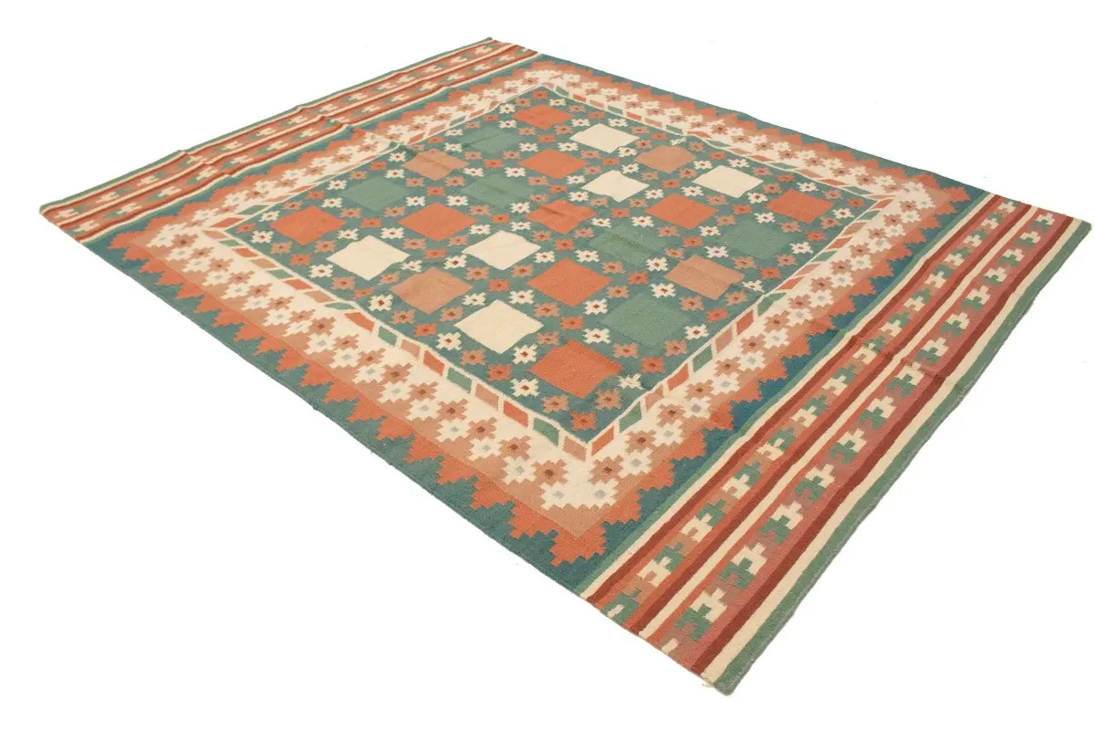 This original 7'5X9'4 teal new Oriental rug was made by the hands of talented weavers influenced by a variety of gorgeous symmetrical artistic designs, to recreate the aged look of the unique piece with a richness of color and very balanced background field. What set this vintage style Oriental area rug from the others are the material and dye used (wool pile and cotton foundation), knot count, antique designs, fantastic grades, and its regional historical connection: it has deep roots, from the story of the people who produced it to the meaning of the symbols and colors displayed across its canvas that have been praised for centuries. This Indian home décor carpet will be completely cozy and inviting that never will go out of style! Also, this Oriental rug would be among your most valuable treasures, it is a great investment that accrues value over time, and it will last a lifetime because was woven with high-quality, all-natural wool. Eco-friendly, opulent yet affordable; this rug will give you an extra pop of character to help define your home environment with sophistication and warmth that will capture the eyes and attention of your audience (homeowners, designers, decorators, family and friends). RT-1977