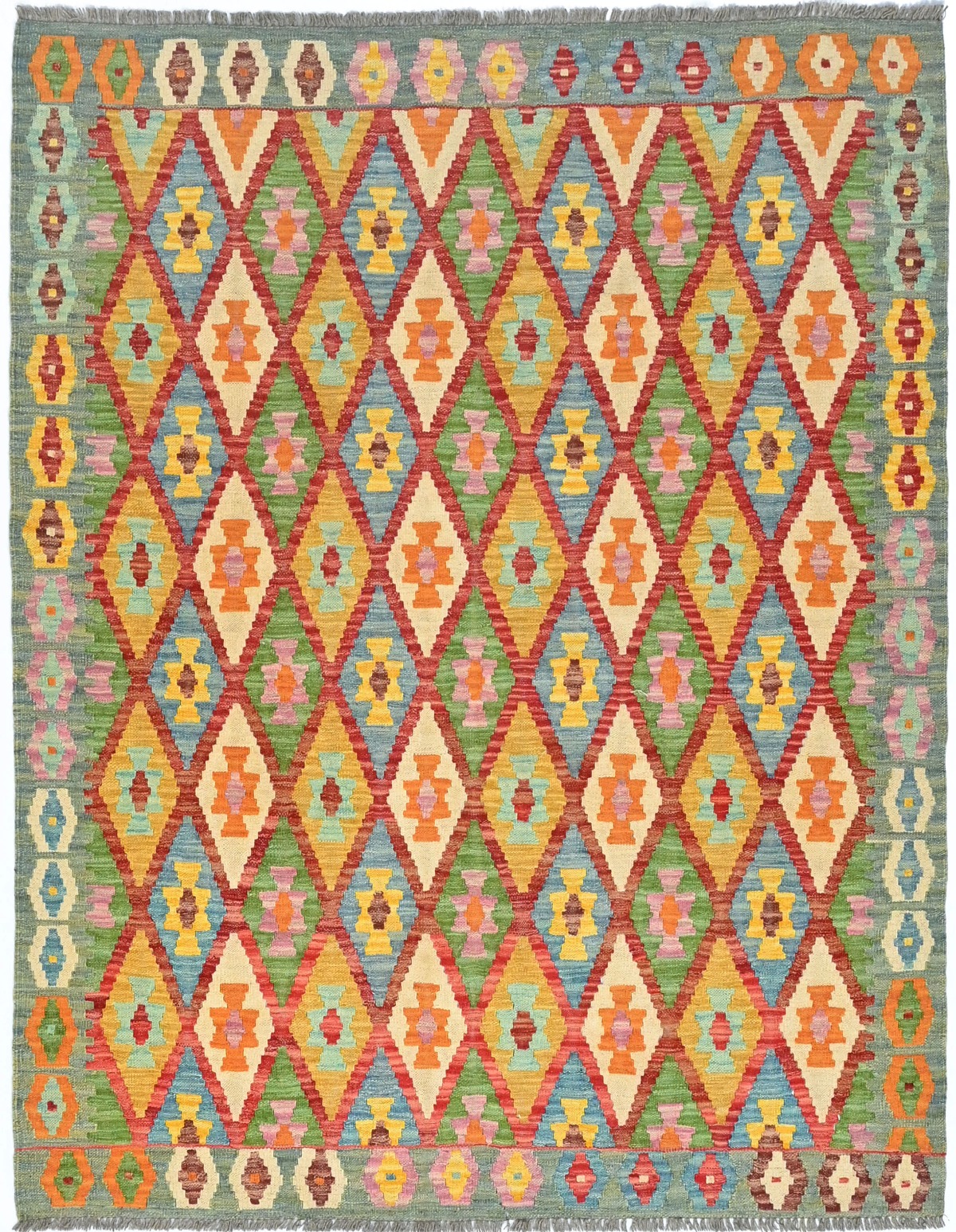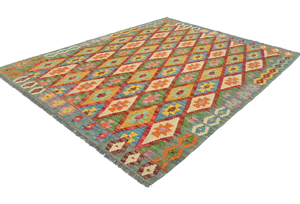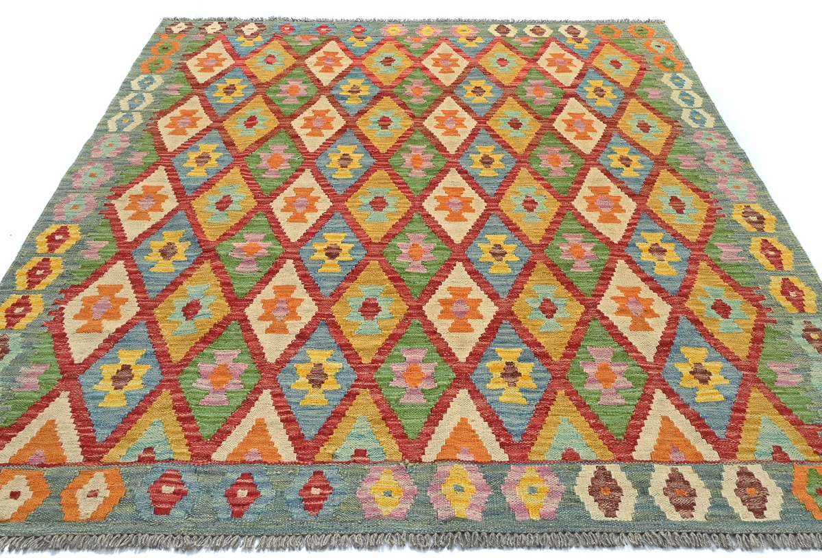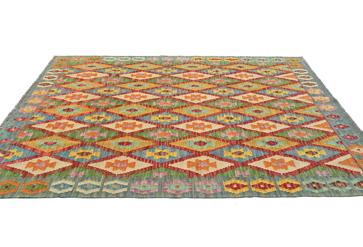 Handmade 5'6 X 6'9 multicolor Kilim rug made with vegetable dyes (fine wool pile and cotton foundation), superior knot count, and alluring ancient designs. This Oriental rug never will go out of style and would be among your most valuable treasures.