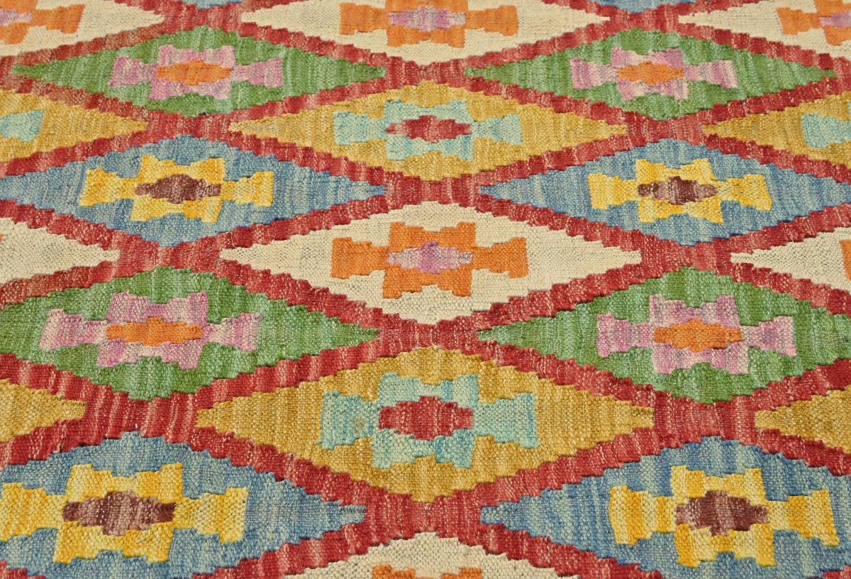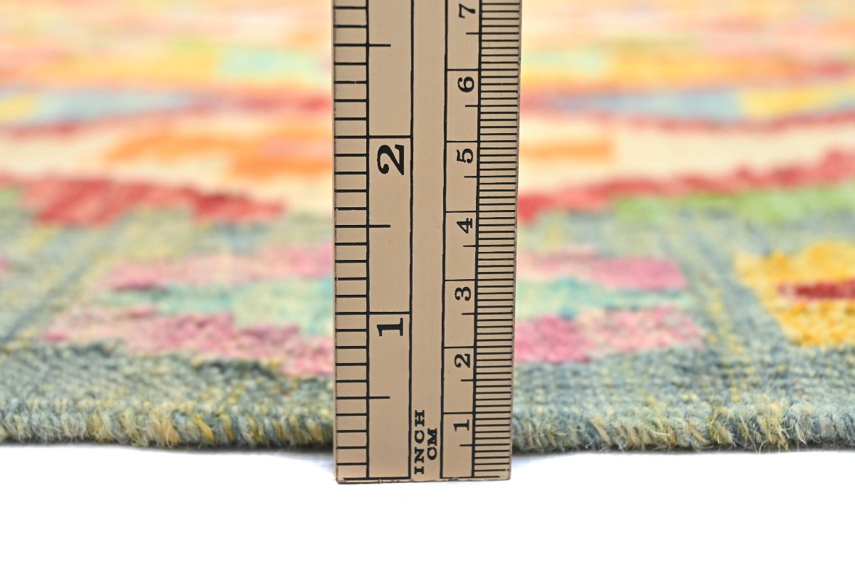 This original 5'6 X 6'9 multicolor Kilim rug was well-constructed by the hands of master weavers motivated by a variety of stunning artistic designs, to recreate the aged look of the exceptional piece with a richness of color and developed decorative background field. What set this tribal Oriental area rug from the others are the material and dye used (wool pile and cotton foundation), knot count, ancient designs, fantastic grades, and its regional historical connection: it has deep roots, from the story of the people who produced it to the meaning of the symbols and colors displayed across its canvas that have been praised for centuries. This home décor carpet will be completely cozy and inviting that never will go out of style! Also, this Oriental rug would be among your most valuable treasures, it is a great investment that increase in value over time, and it will last a lifetime because was woven with high-quality, all-natural wool; it won’t rip, tear, or shed. Eco-friendly, opulent yet affordable; this Persian rug will give you an extra pop of character to help define your home environment with elegance and warmth that will capture the eyes and attention of your audience (homeowners, designers, decorators, family and friends). RT-6681