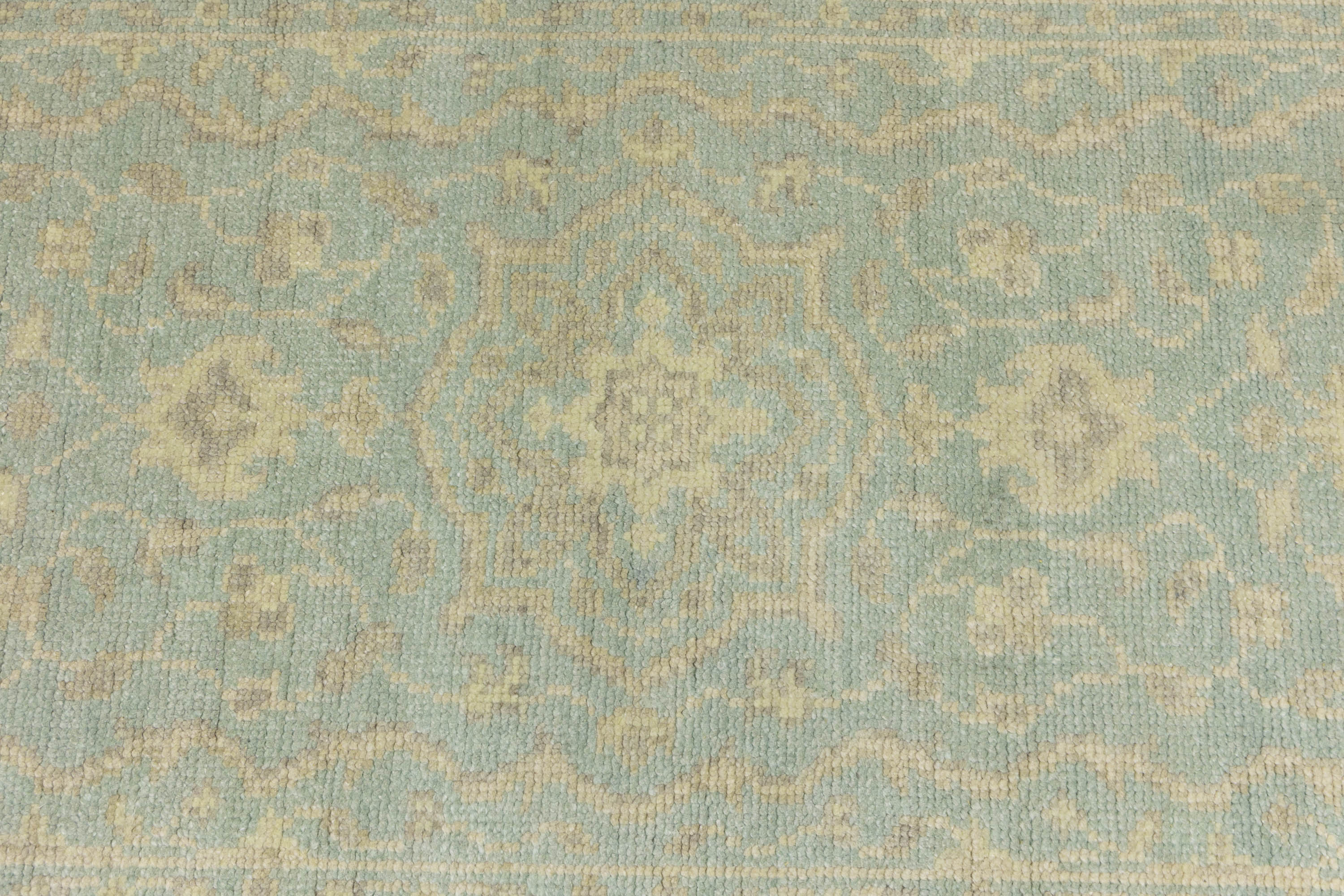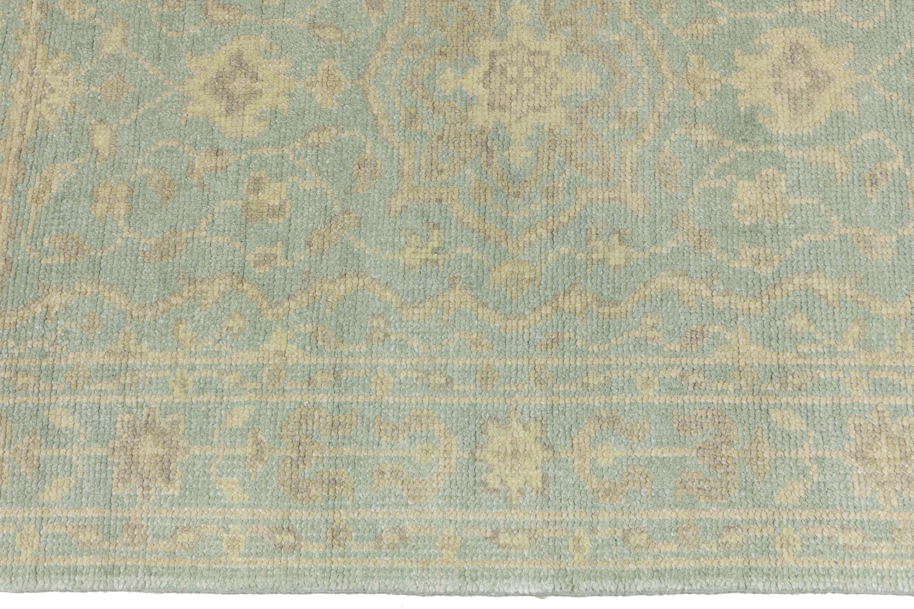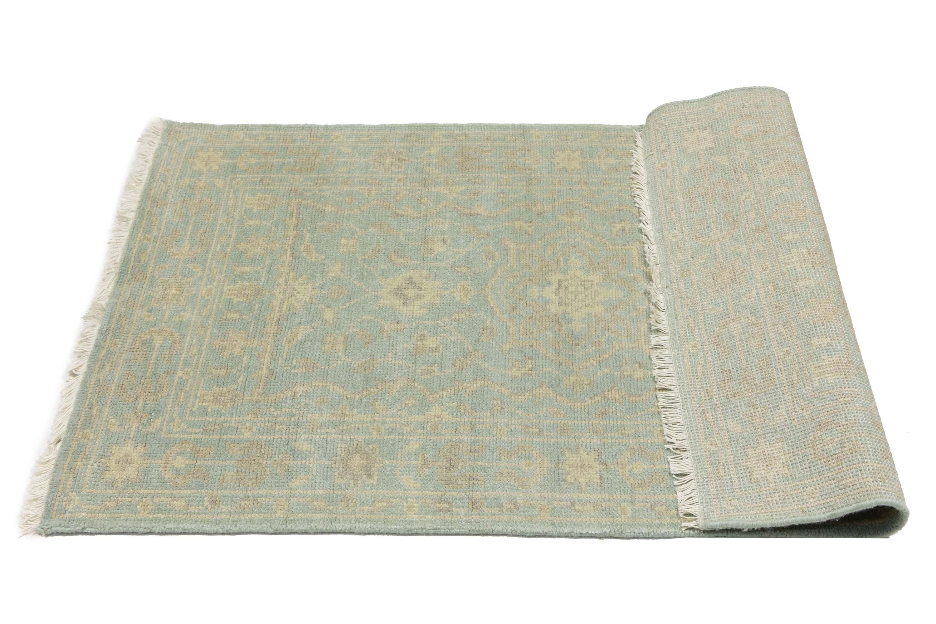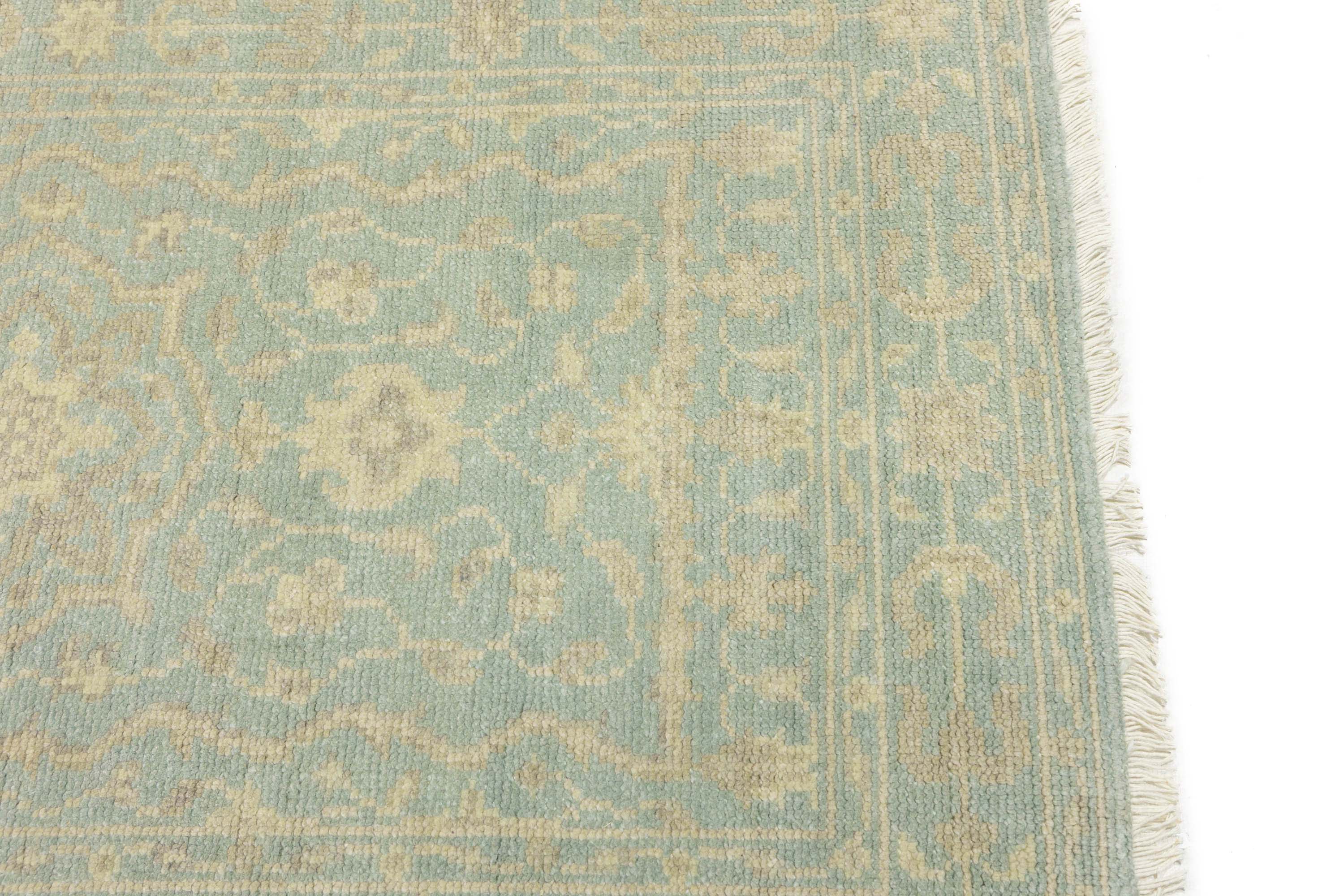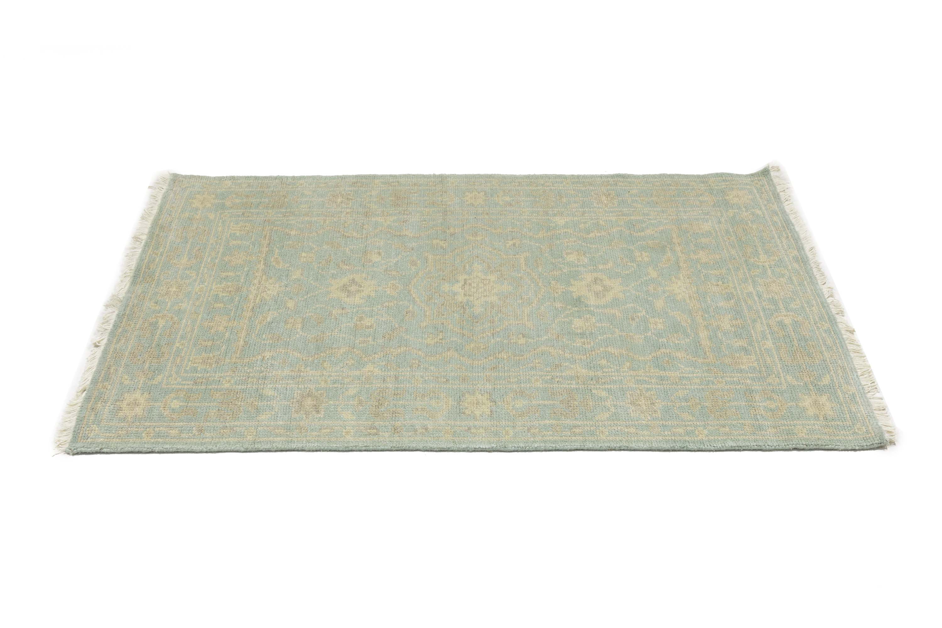 This genuine 3X5 aqua blue new Oriental rug was made by the hands of gifted weavers inspired by a variety of spectacular artistic designs, to recreate the aged look of the original piece with a richness of color and ornately patterned background field. What set this vintage style Oriental area rug from the others are the material and dye used (wool pile and cotton foundation), knot count, ancient designs, fantastic grades, and its regional historical connection: it has deep roots, from the story of the people who produced it to the meaning of the symbols and colors displayed across its canvas that have been praised for centuries. This Indian home décor carpet will be completely cozy and inviting that never will go out of style! Also, this Oriental rug would be among your most valuable treasures, it is a great investment that accrues value over time, and it will last for generations because was woven with high-quality, all-natural wool. Environmentally friendly, opulent yet affordable; this rug will give you a thorough amount of character to help define your living space with elegance and warmth that will capture the eyes and attention of your audience (homeowners, designers, decorators, family and friends). OT-11851
