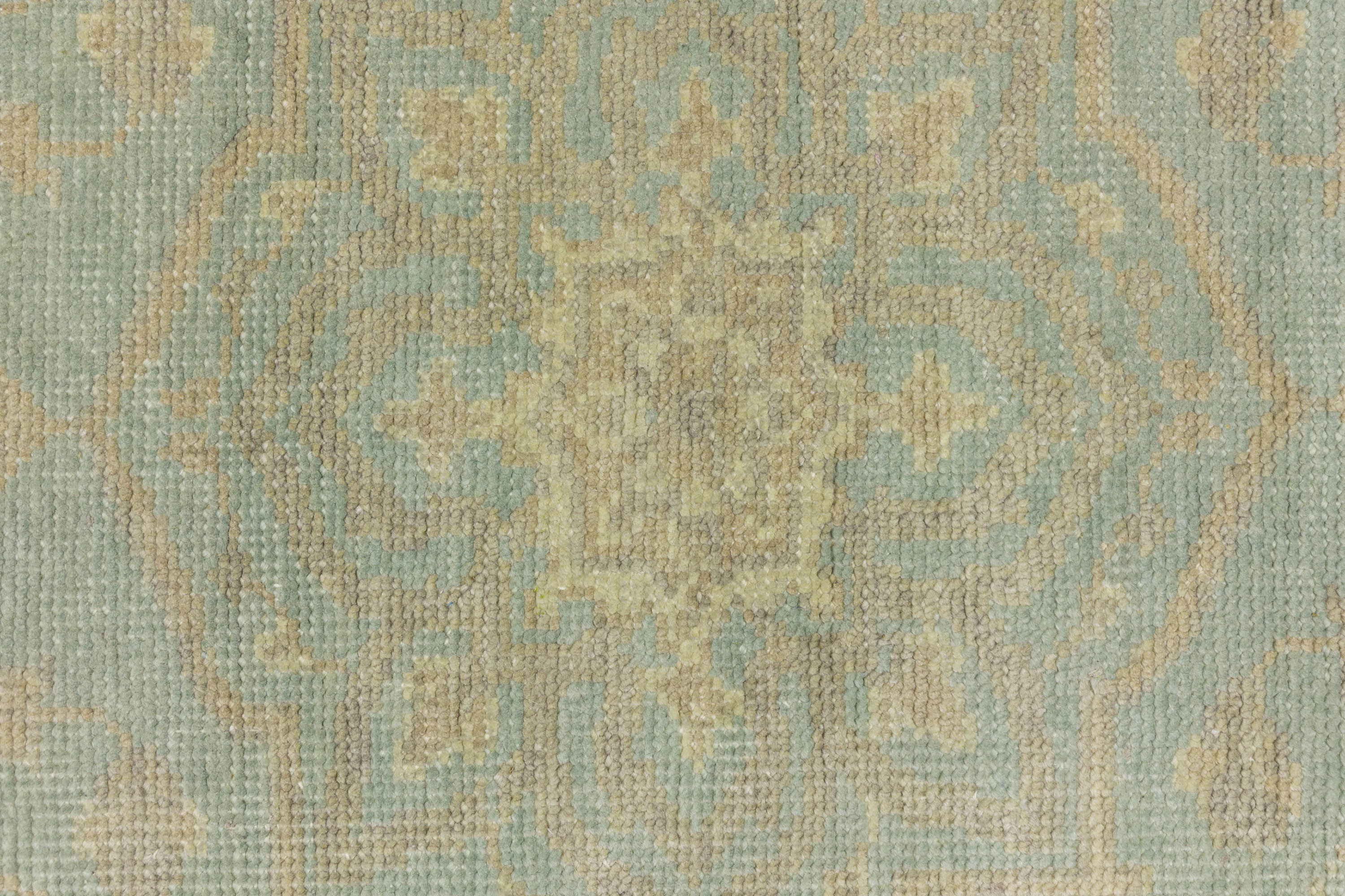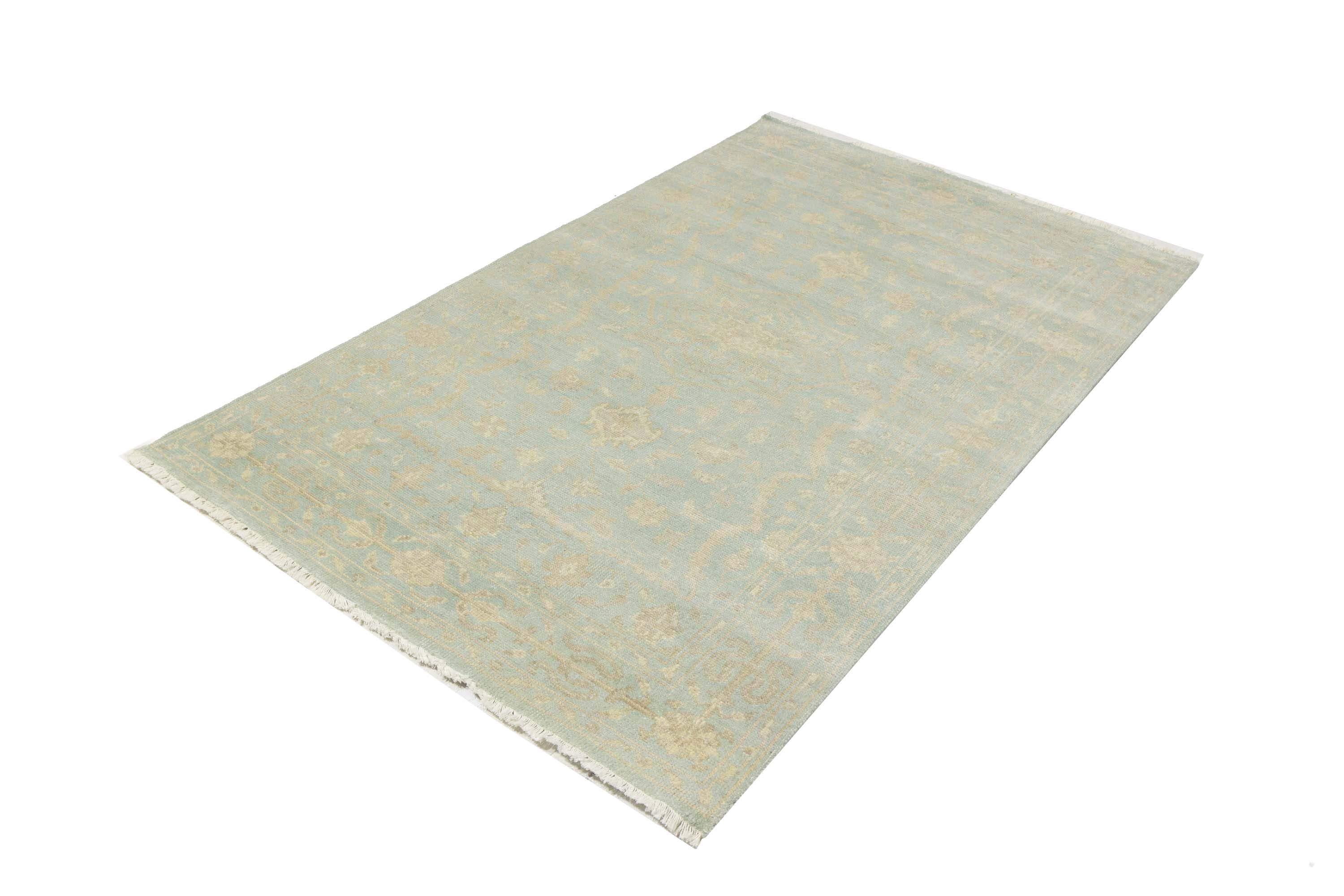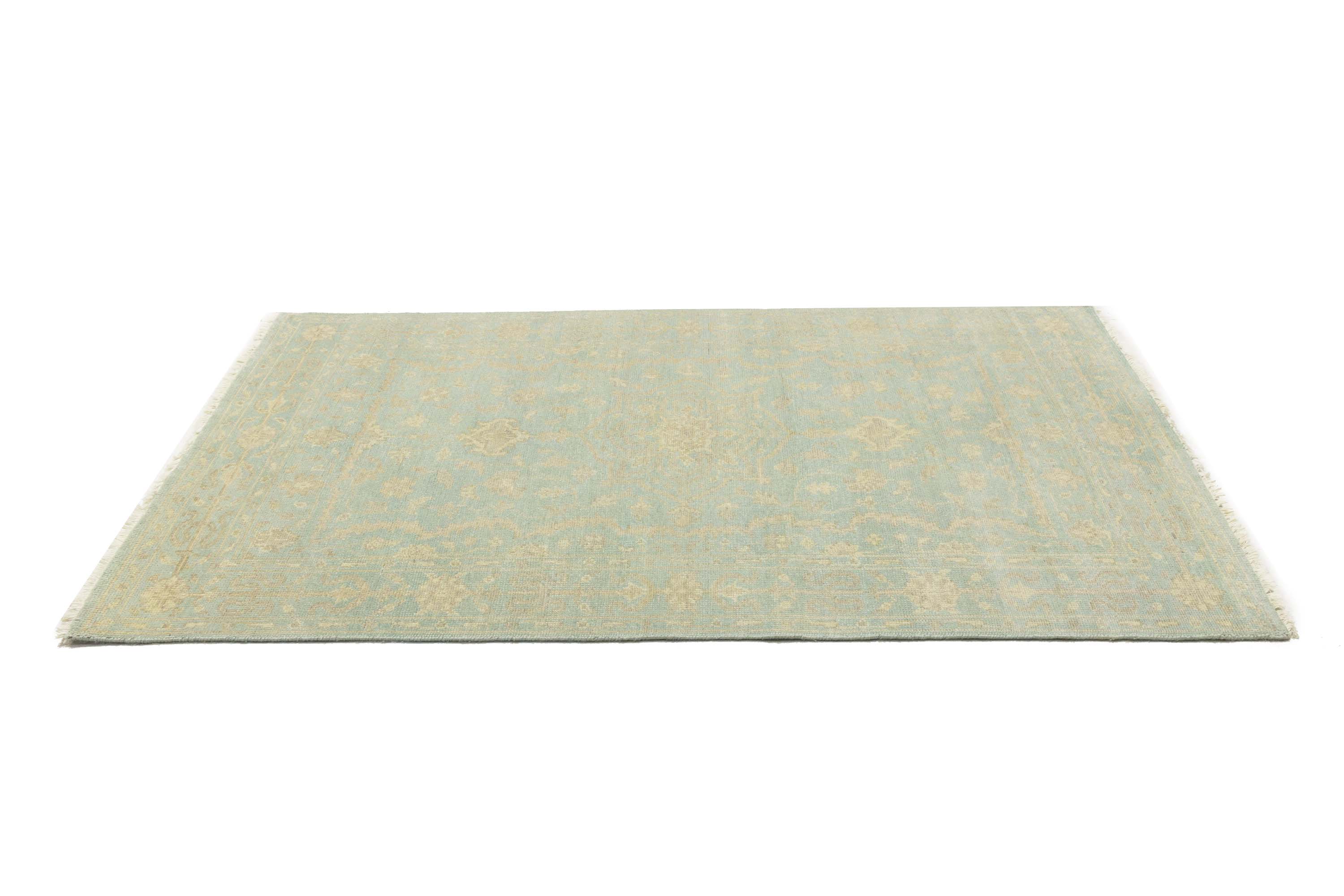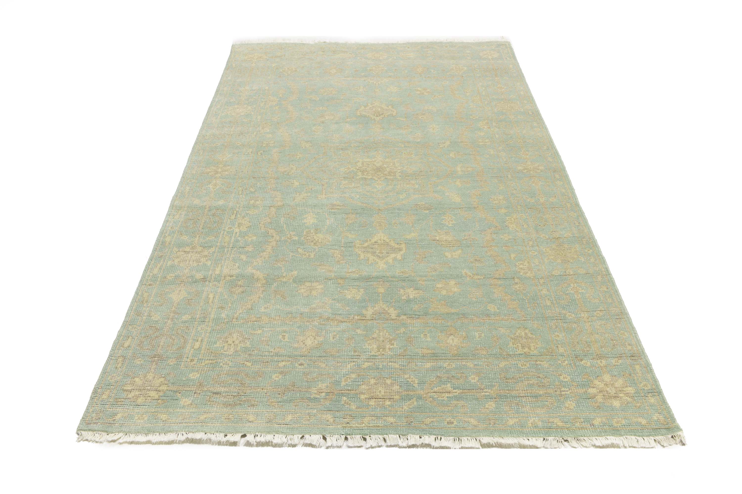 This genuine 5X8 aqua blue new Oriental rug was made by the hands of gifted weavers inspired by a variety of spectacular artistic designs, to recreate the aged look of the original piece with a richness of color and ornately patterned background field. What set this vintage style Oriental area rug from the others are the material and dye used (wool pile and cotton foundation), knot count, ancient designs, fantastic grades, and its regional historical connection: it has deep roots, from the story of the people who produced it to the meaning of the symbols and colors displayed across its canvas that have been praised for centuries. This Indian home décor carpet will be completely cozy and inviting that never will go out of style! Also, this Oriental rug would be among your most valuable treasures, it is a great investment that accrues value over time, and it will last for generations because was woven with high-quality, all-natural wool. Environmentally friendly, opulent yet affordable; this rug will give you a thorough amount of character to help define your living space with elegance and warmth that will capture the eyes and attention of your audience (homeowners, designers, decorators, family and friends).