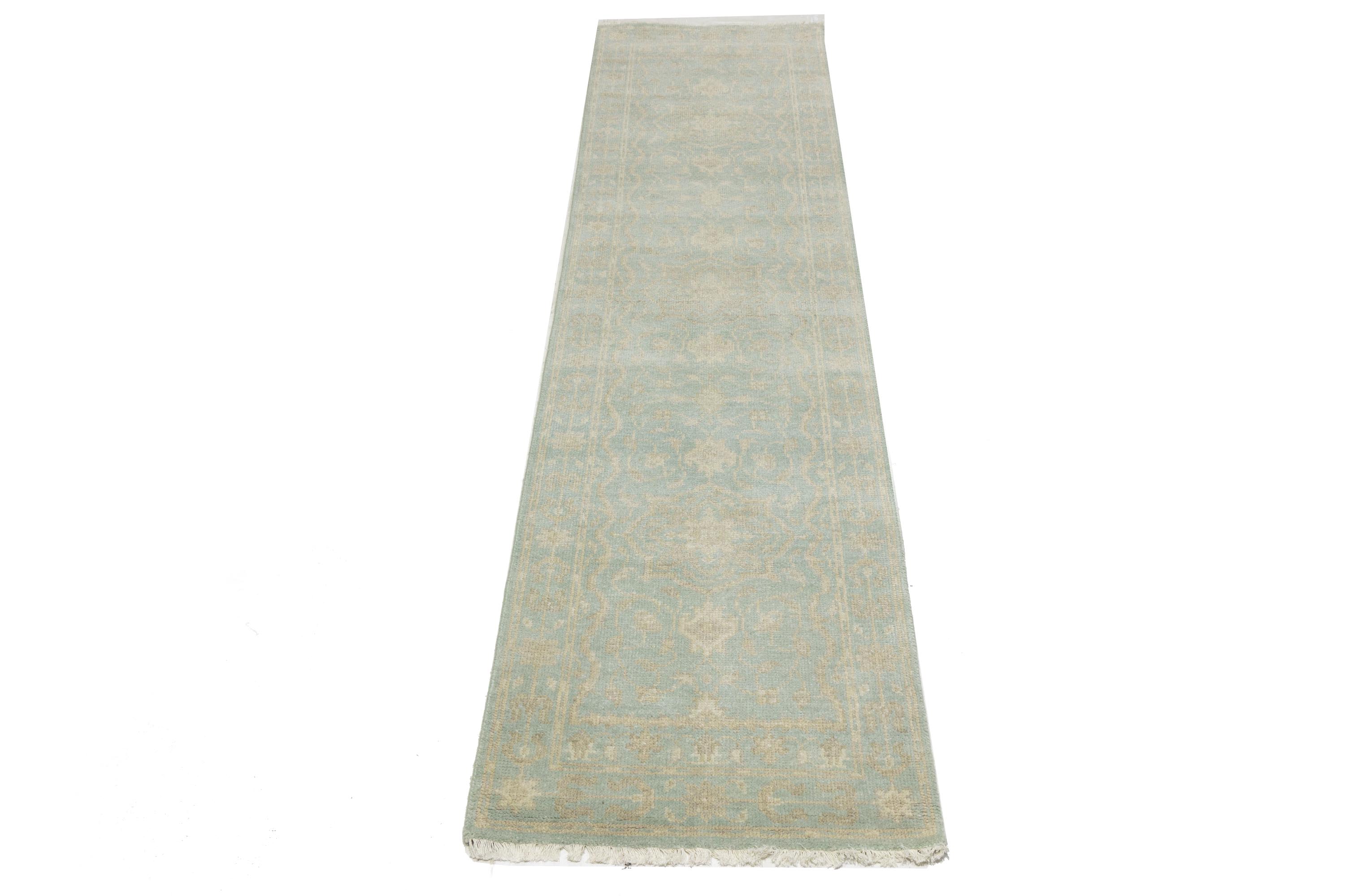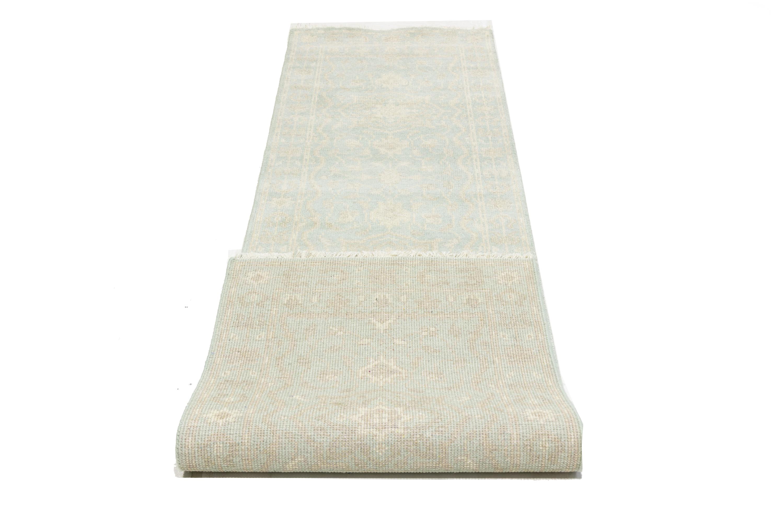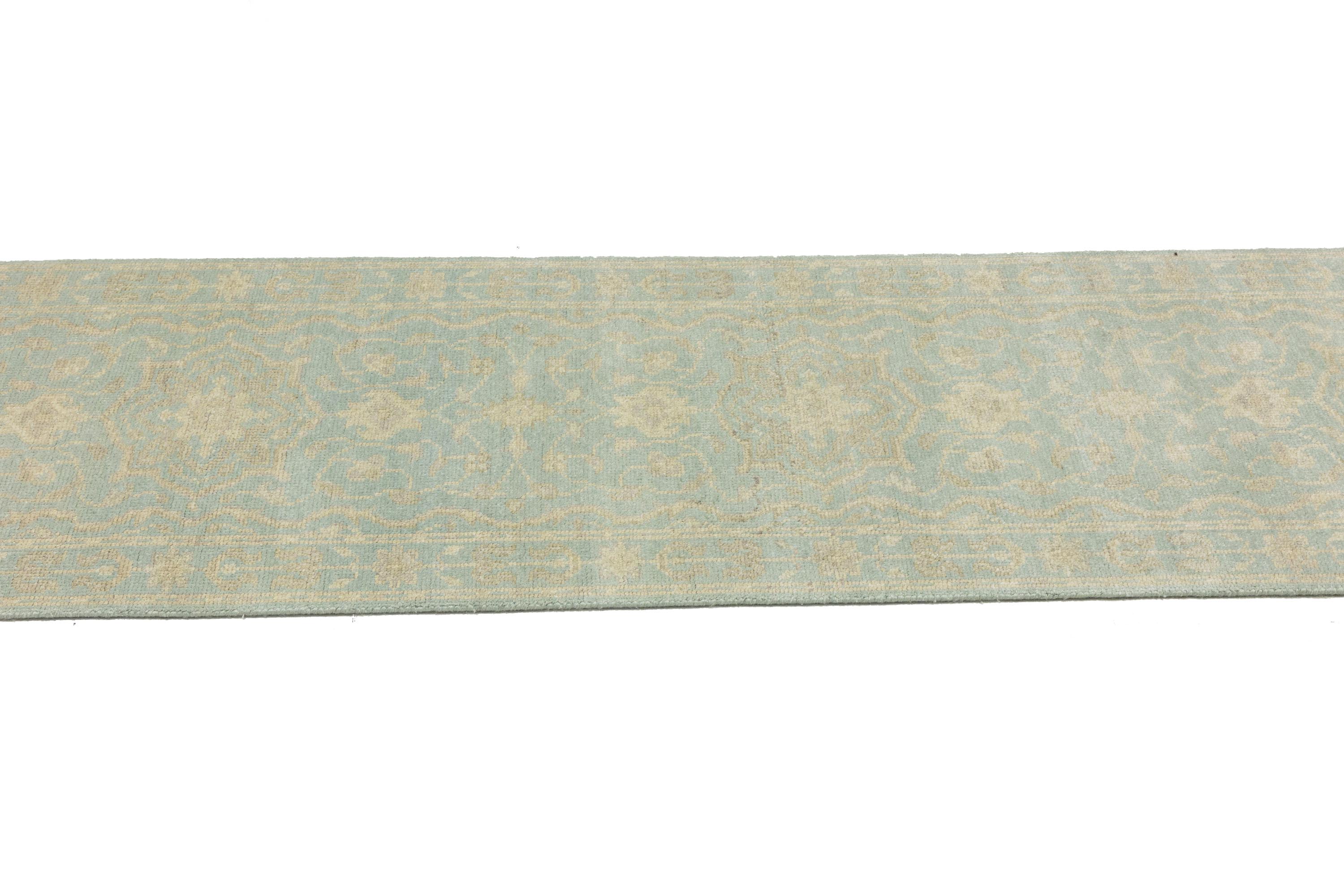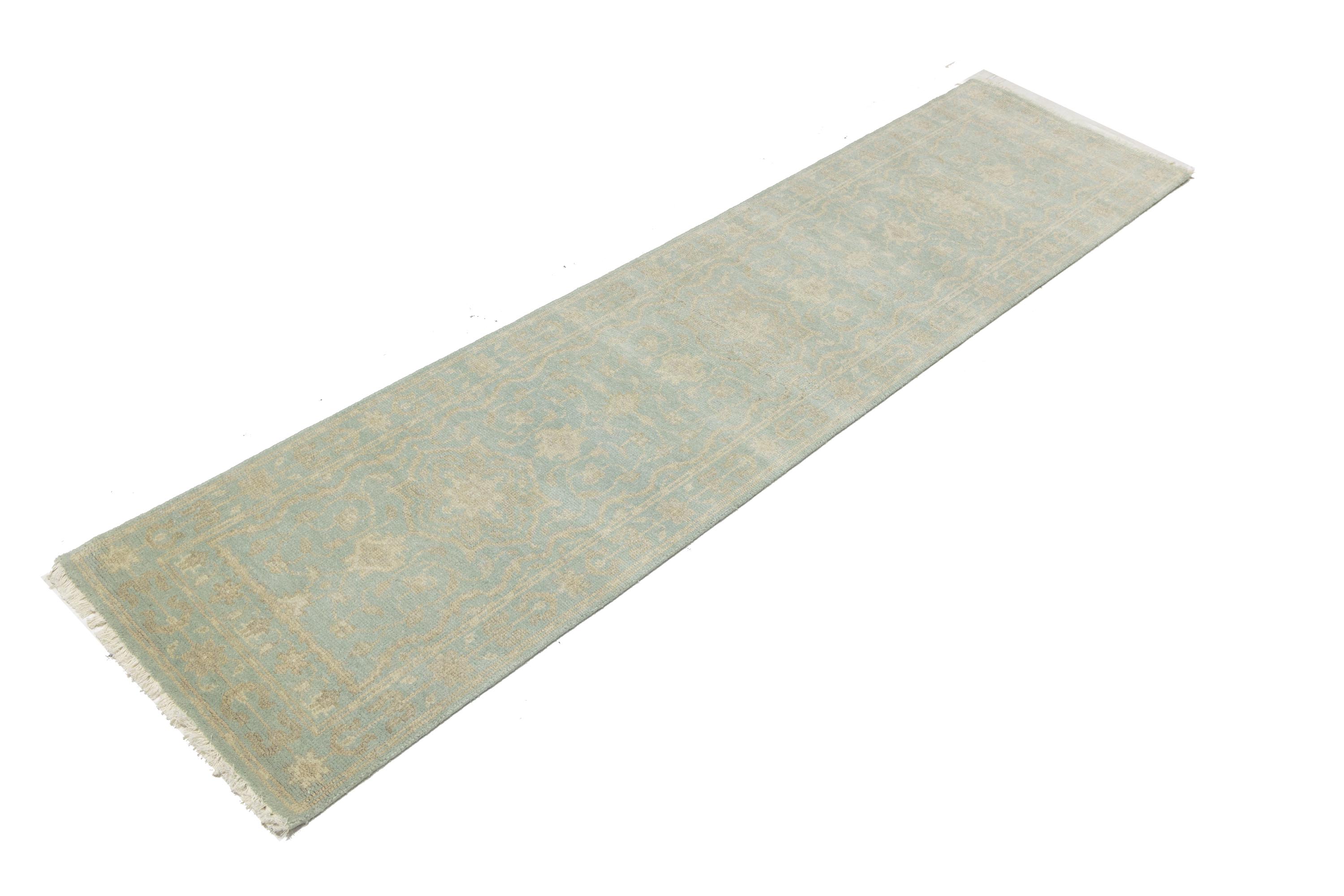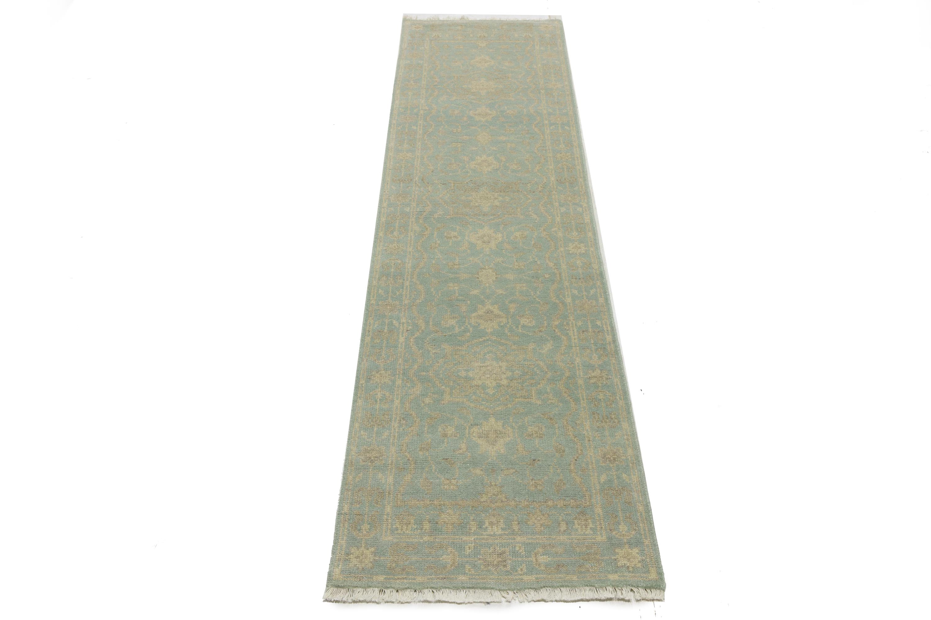 This original 3X10 aqua blue new Oriental runner was made by the hands of talented weavers influenced by a variety of gorgeous symmetrical artistic designs, to recreate the aged look of the unique piece with a richness of color and very balanced background field. What set this vintage style Oriental area runner from the others are the material and dye used (wool pile and cotton foundation), knot count, antique designs, fantastic grades, and its regional historical connection: it has deep roots, from the story of the people who produced it to the meaning of the symbols and colors displayed across its canvas that have been praised for centuries. This Indian home décor carpet will be completely cozy and inviting that never will go out of style! Also, this Oriental rug would be among your most valuable treasures, it is a great investment that accrues value over time, and it will last a lifetime because was woven with high-quality, all-natural wool. Eco-friendly, opulent yet affordable; this runner will give you an extra pop of character to help define your home environment with sophistication and warmth that will capture the eyes and attention of your audience (homeowners, designers, decorators, family and friends). OT-11838