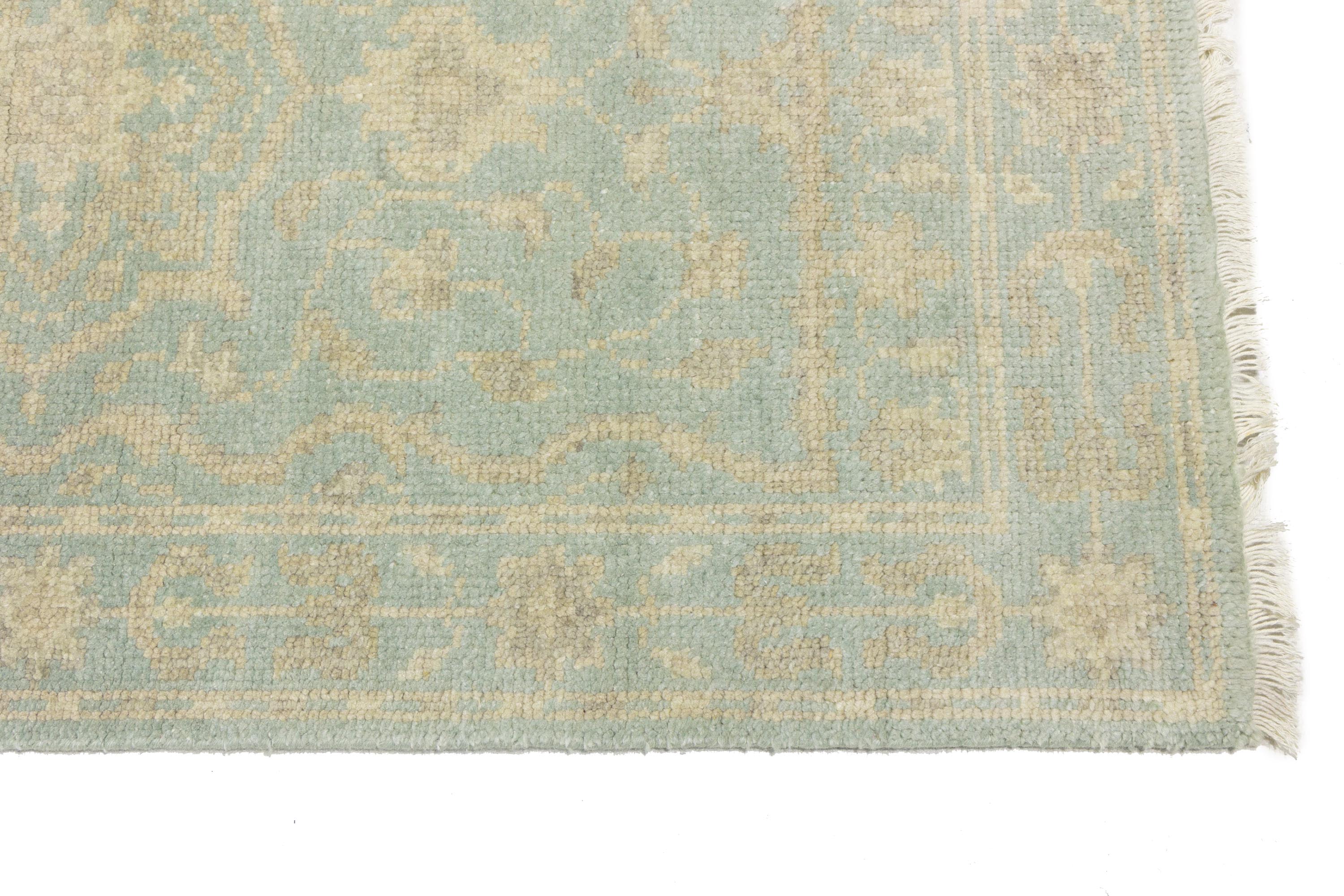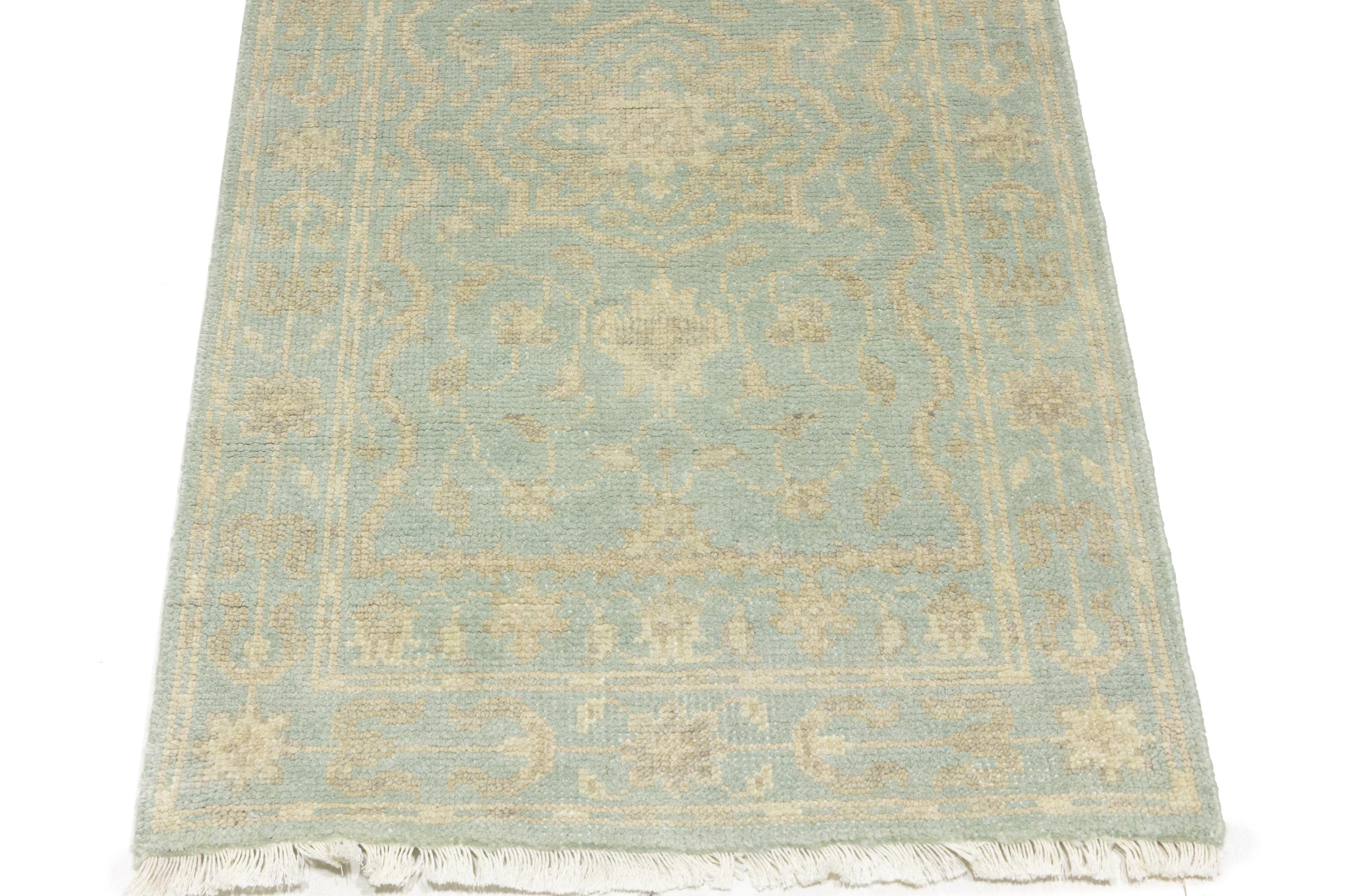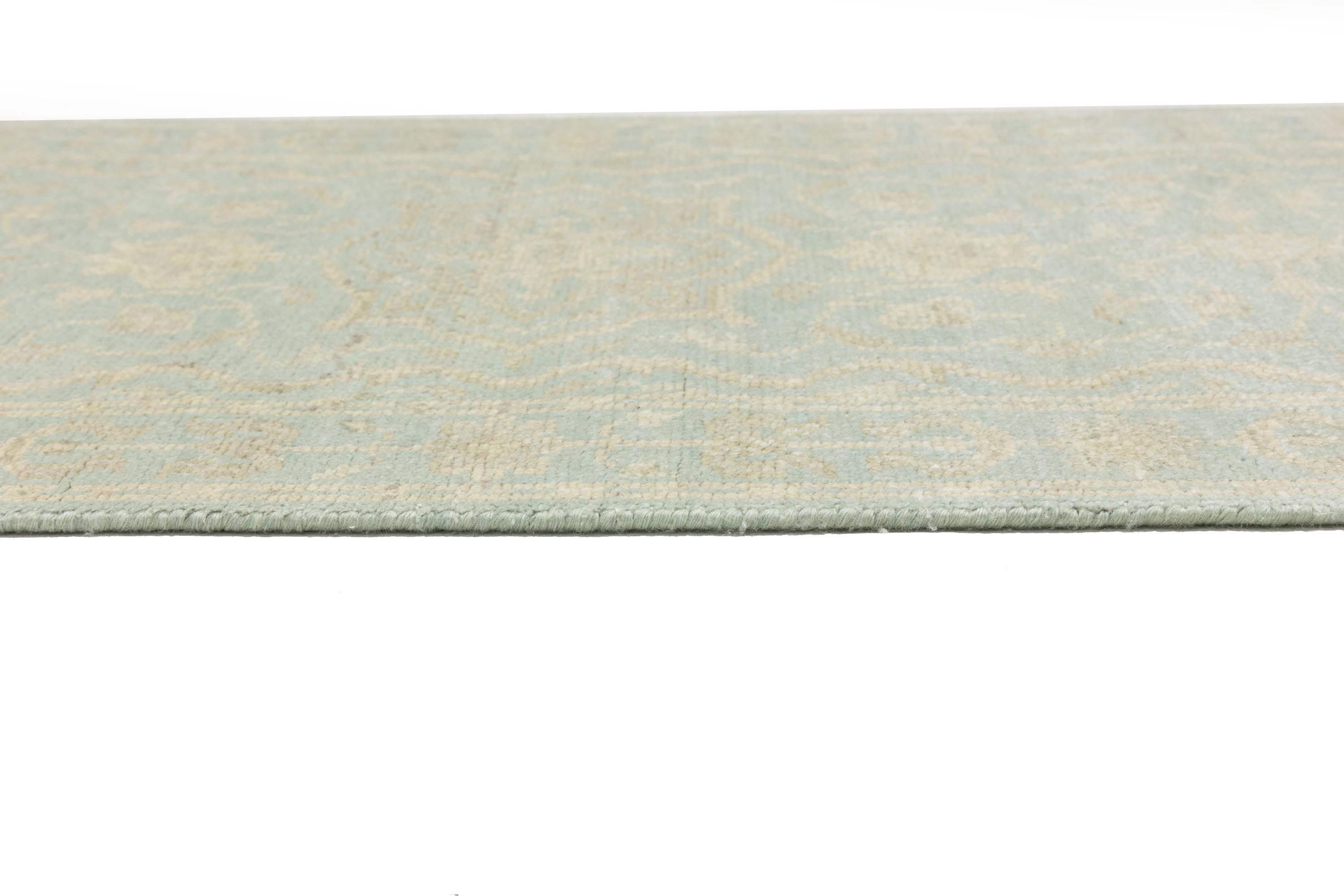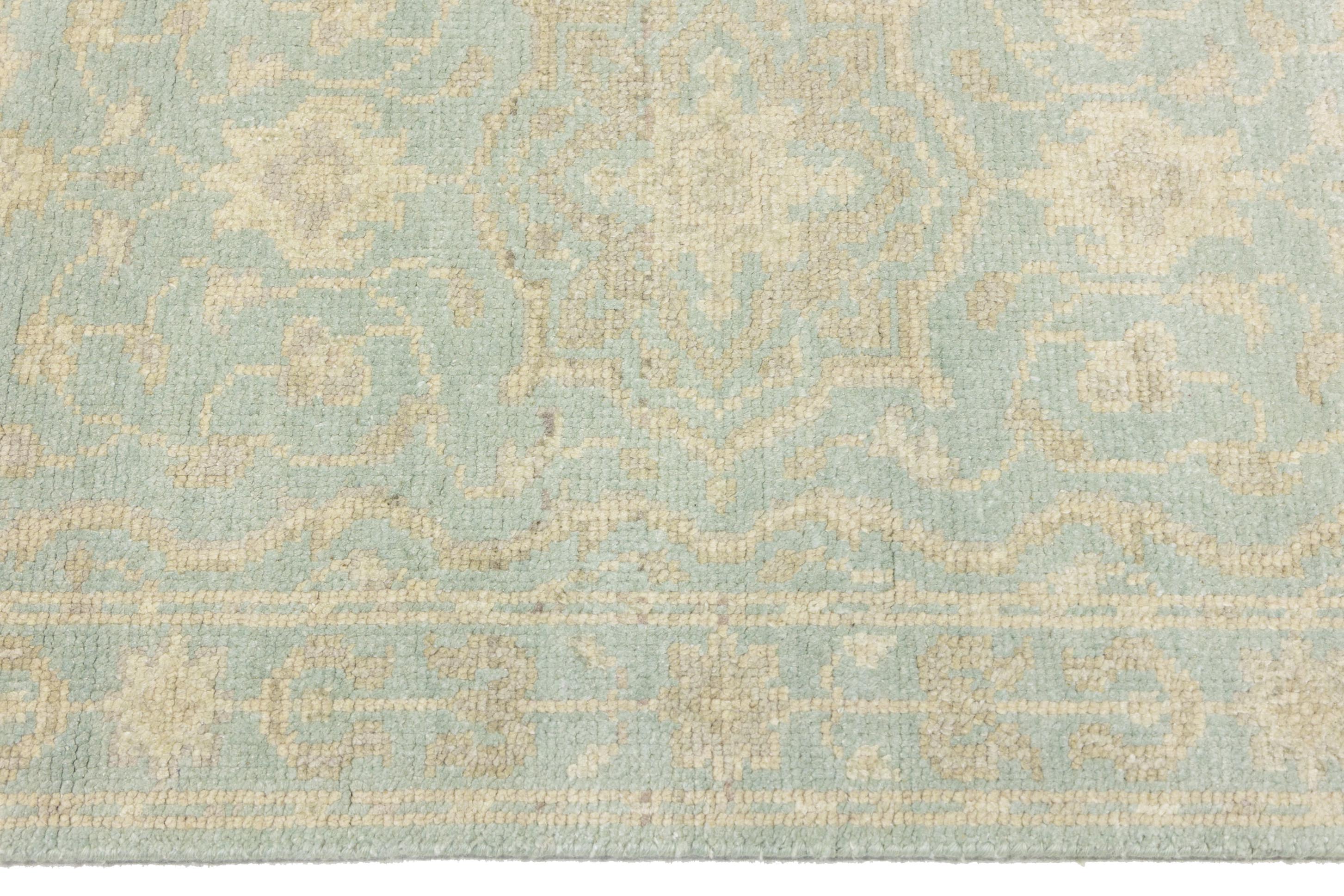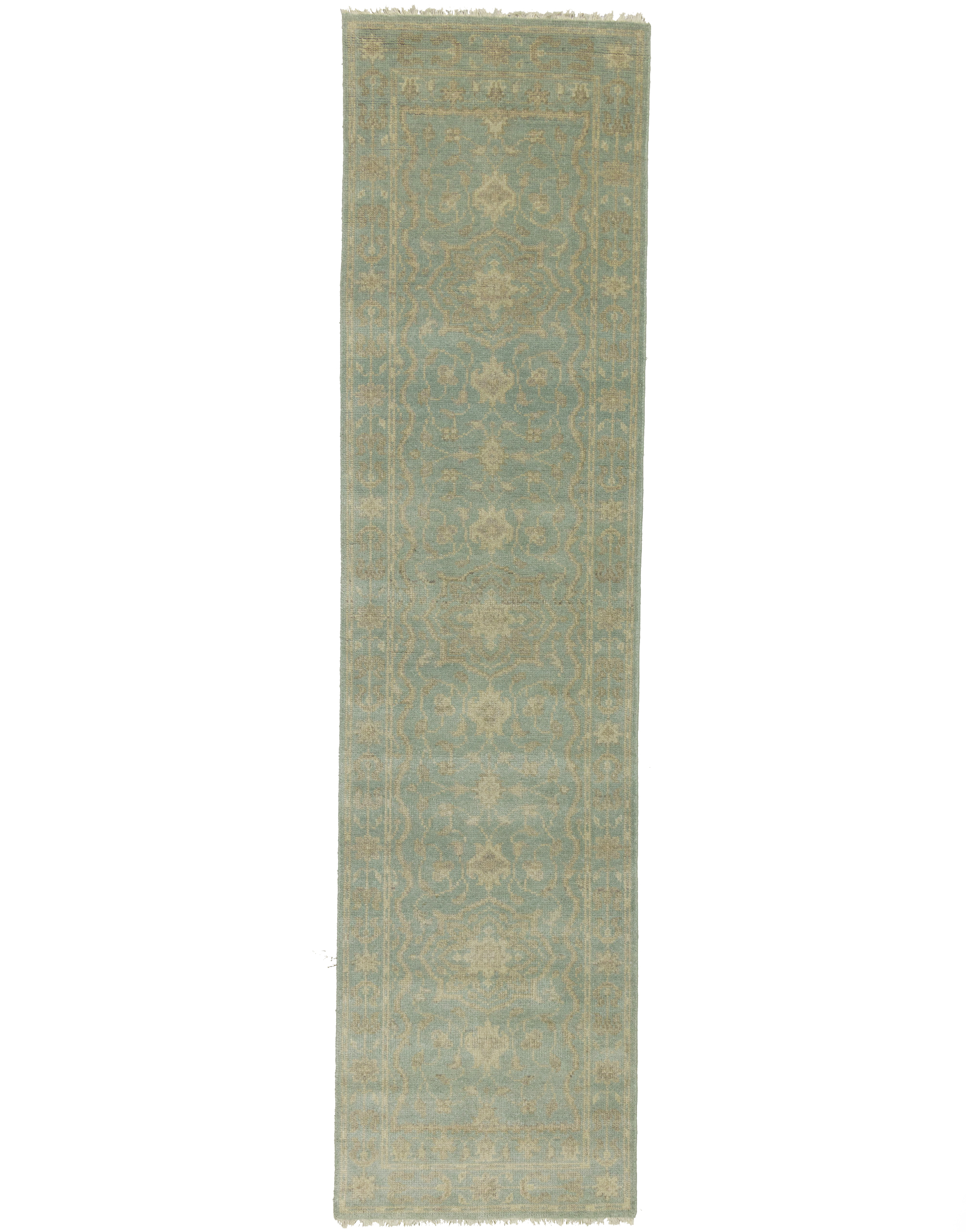 This original 3X10 aqua blue new Oriental runner was made by the hands of talented weavers influenced by a variety of gorgeous symmetrical artistic designs, to recreate the aged look of the unique piece with a richness of color and very balanced background field. What set this vintage style Oriental area runner from the others are the material and dye used (wool pile and cotton foundation), knot count, antique designs, fantastic grades, and its regional historical connection: it has deep roots, from the story of the people who produced it to the meaning of the symbols and colors displayed across its canvas that have been praised for centuries. This Indian home décor carpet will be completely cozy and inviting that never will go out of style! Also, this Oriental rug would be among your most valuable treasures, it is a great investment that accrues value over time, and it will last a lifetime because was woven with high-quality, all-natural wool. Eco-friendly, opulent yet affordable; this runner will give you an extra pop of character to help define your home environment with sophistication and warmth that will capture the eyes and attention of your audience (homeowners, designers, decorators, family and friends). OT-11838
