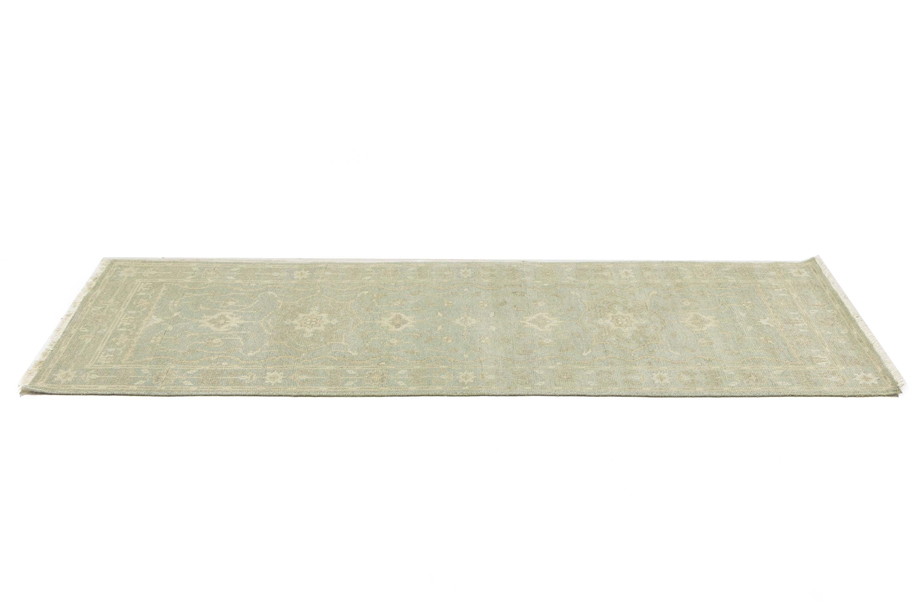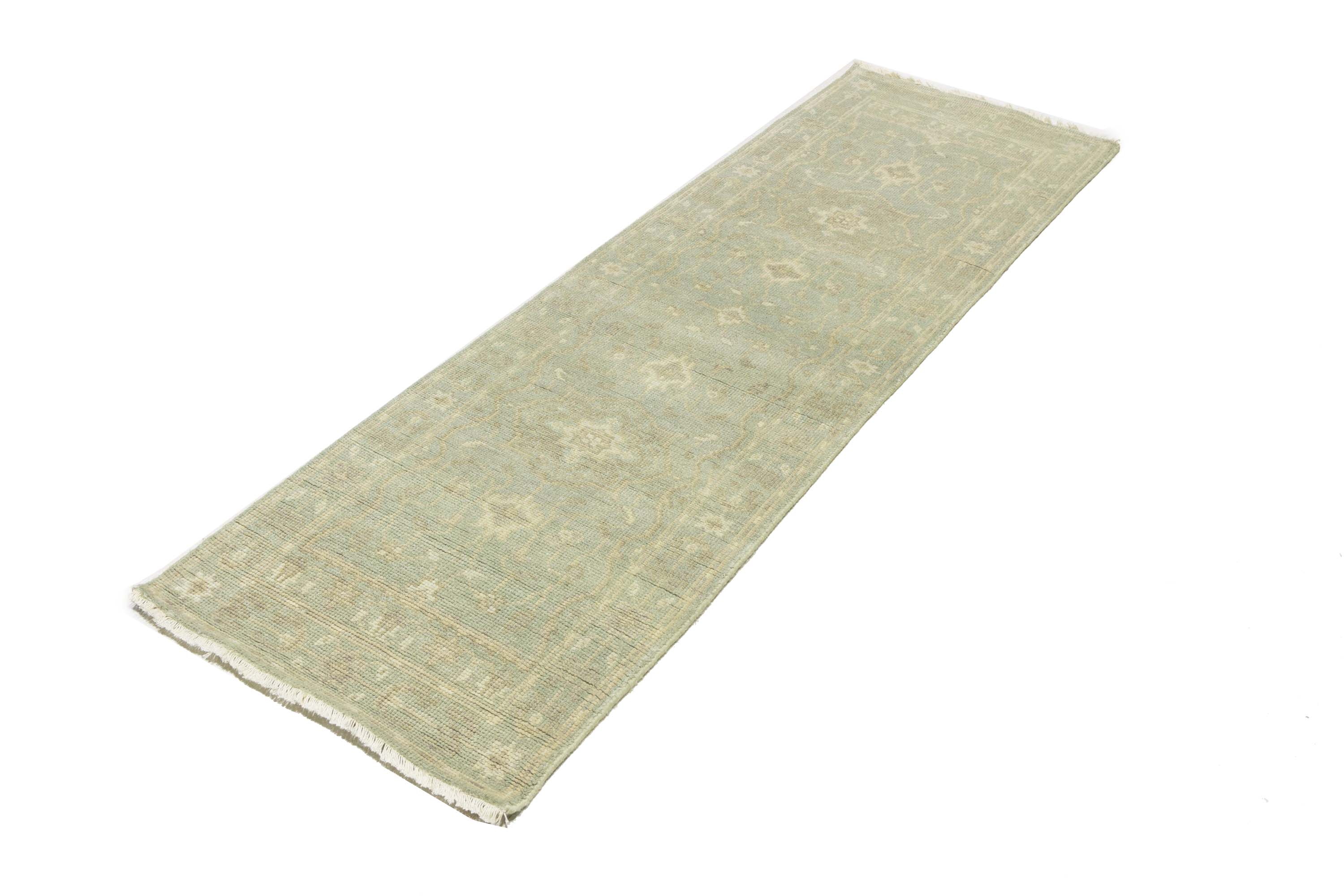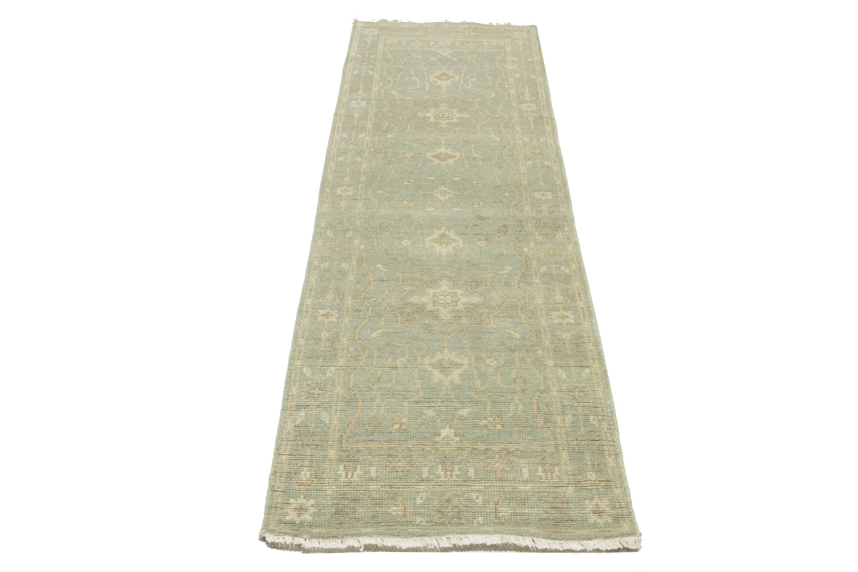 This original 3X8 aqua blue new Oriental runner was made by the hands of talented weavers influenced by a variety of gorgeous symmetrical artistic designs, to recreate the aged look of the unique piece with a richness of color and very balanced background field. What set this vintage style Oriental area runner from the others are the material and dye used (wool pile and cotton foundation), knot count, antique designs, fantastic grades, and its regional historical connection: it has deep roots, from the story of the people who produced it to the meaning of the symbols and colors displayed across its canvas that have been praised for centuries. This Indian home décor carpet will be completely cozy and inviting that never will go out of style! Also, this Oriental rug would be among your most valuable treasures, it is a great investment that accrues value over time, and it will last a lifetime because was woven with high-quality, all-natural wool. Eco-friendly, opulent yet affordable; this runner will give you an extra pop of character to help define your home environment with sophistication and warmth that will capture the eyes and attention of your audience (homeowners, designers, decorators, family and friends). OT-11880