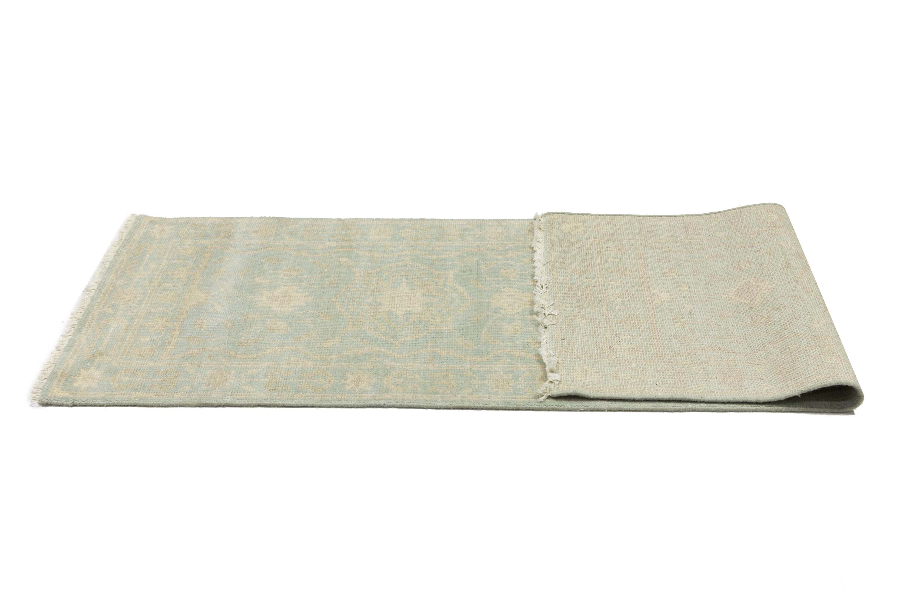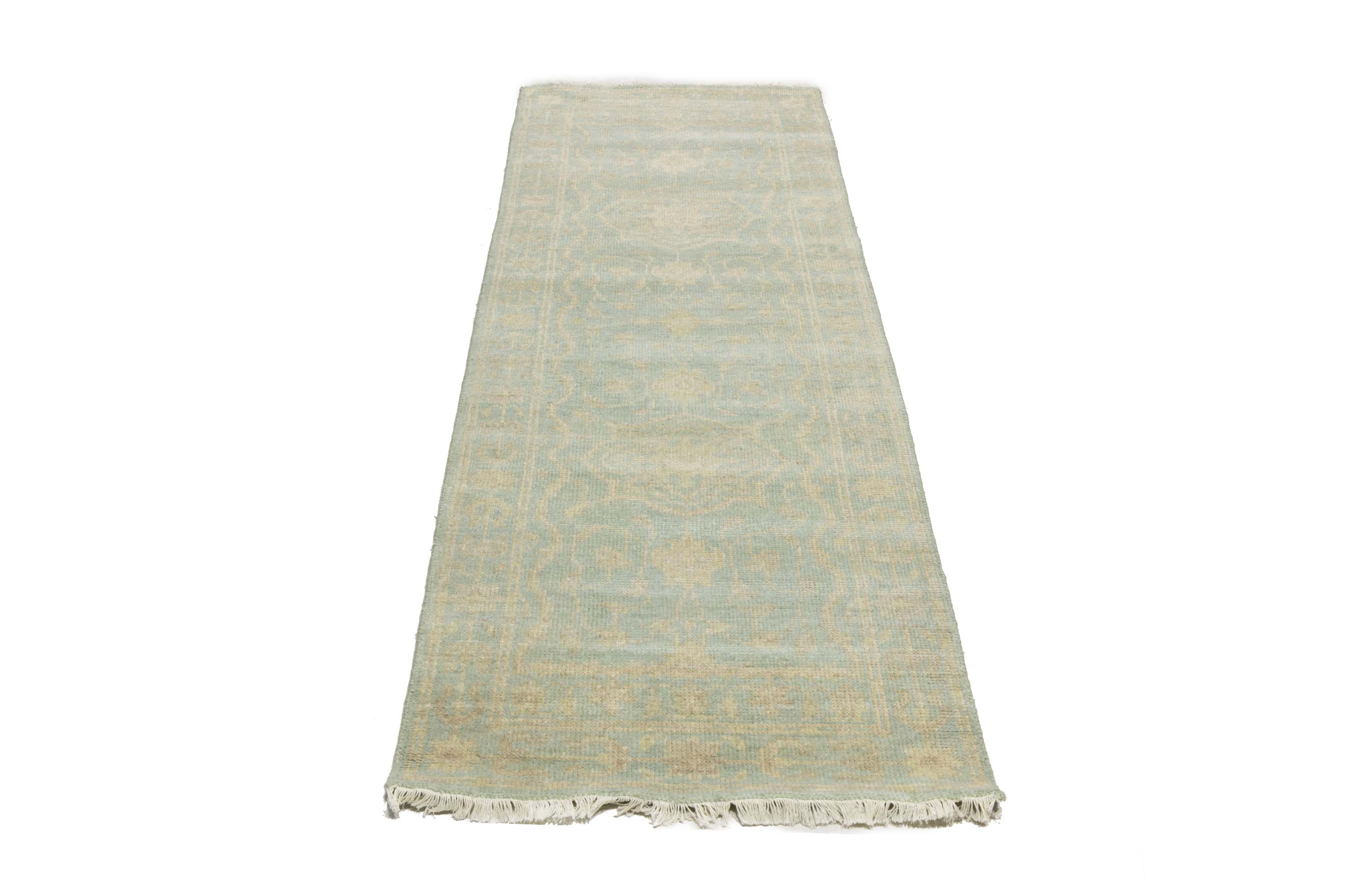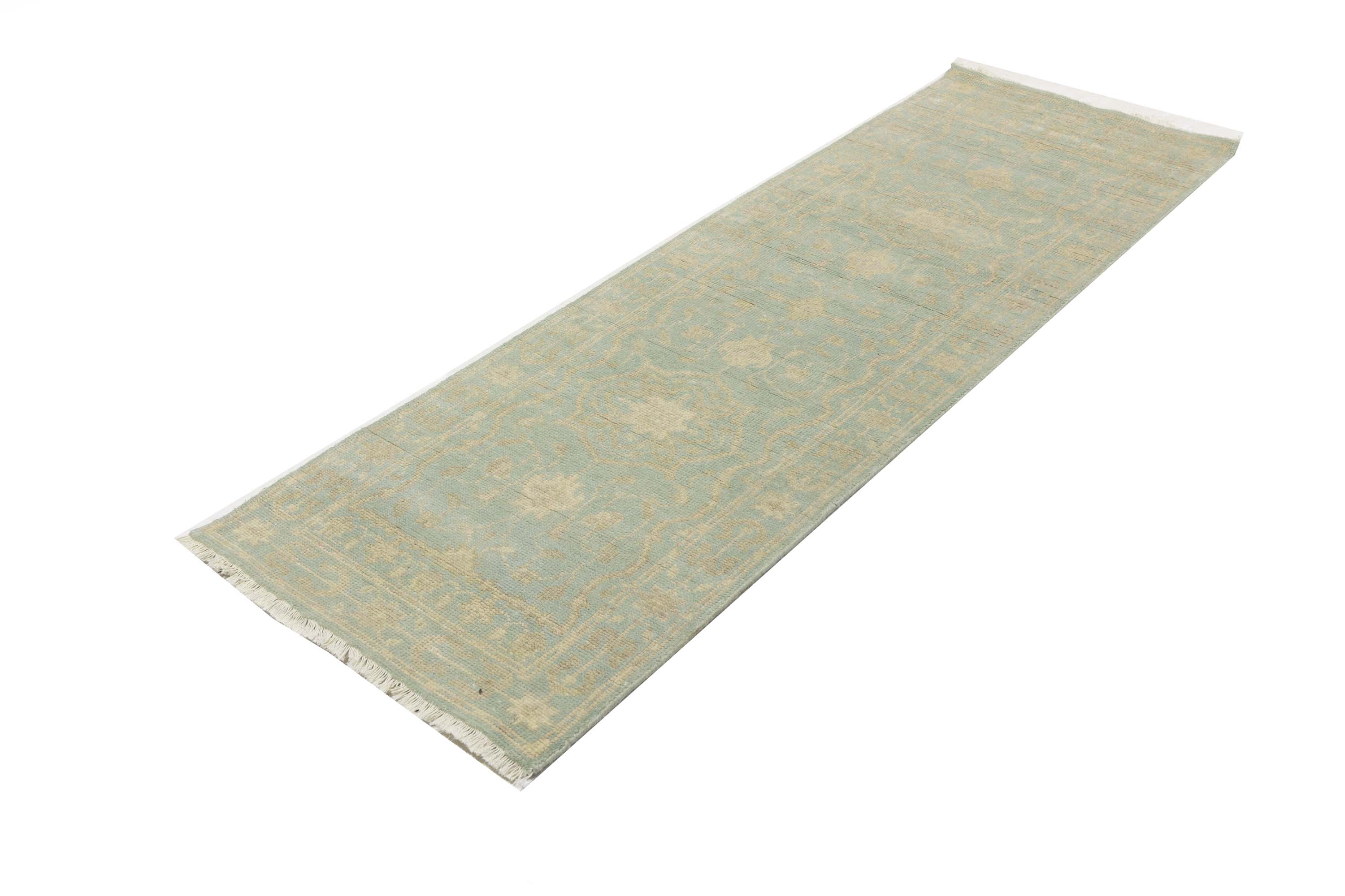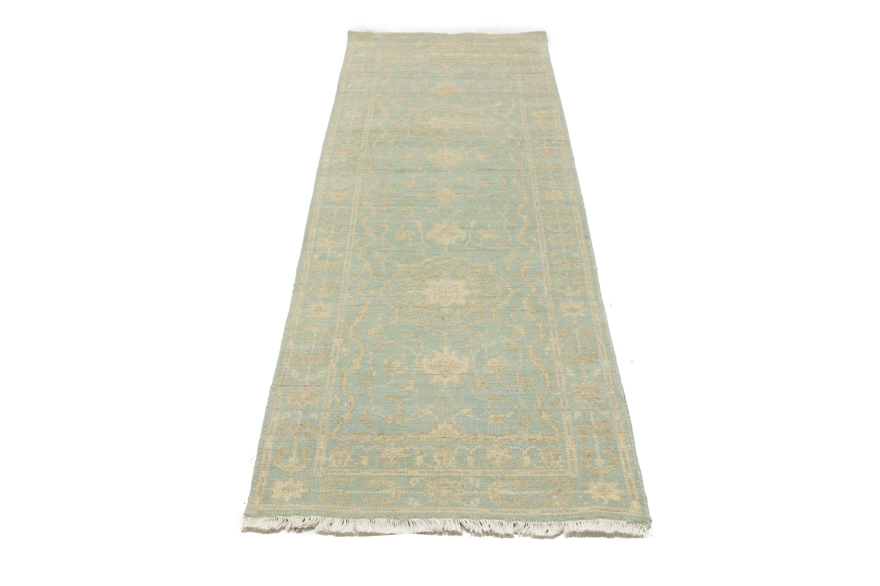 This original 3X8 aqua blue new Oriental runner was made by the hands of talented weavers influenced by a variety of gorgeous symmetrical artistic designs, to recreate the aged look of the unique piece with a richness of color and very balanced background field. What set this vintage style Oriental area runner from the others are the material and dye used (wool pile and cotton foundation), knot count, antique designs, fantastic grades, and its regional historical connection: it has deep roots, from the story of the people who produced it to the meaning of the symbols and colors displayed across its canvas that have been praised for centuries. This Indian home décor carpet will be completely cozy and inviting that never will go out of style! Also, this Oriental rug would be among your most valuable treasures, it is a great investment that accrues value over time, and it will last a lifetime because was woven with high-quality, all-natural wool. Eco-friendly, opulent yet affordable; this runner will give you an extra pop of character to help define your home environment with sophistication and warmth that will capture the eyes and attention of your audience (homeowners, designers, decorators, family and friends). OT-12014