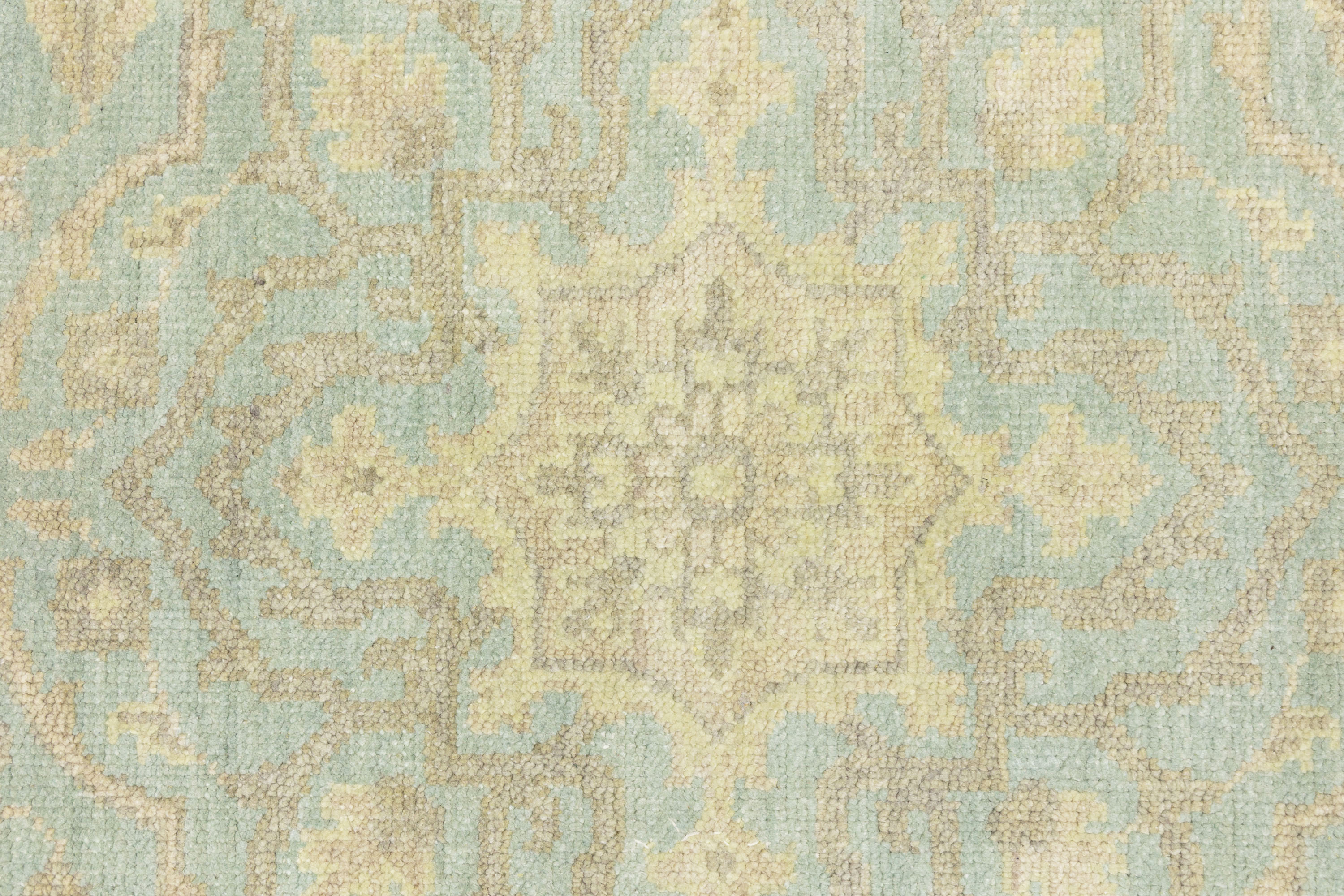 This original 8X10 Aqua Blue new Oriental Rug was made by the hands of talented weavers influenced by a variety of gorgeous symmetrical artistic designs, to recreate the aged look of the unique piece with a richness of color and very balanced background field. What set this vintage style Oriental area runner from the others are the material and dye used (wool pile and cotton foundation), knot count, antique designs, fantastic grades, and its regional historical connection: it has deep roots, from the story of the people who produced it to the meaning of the symbols and colors displayed across its canvas that have been praised for centuries. This Indian home décor carpet will be completely cozy and inviting that never will go out of style! Also, this Oriental rug would be among your most valuable treasures, it is a great investment that accrues value over time, and it will last a lifetime because was woven with high-quality, all-natural wool. Eco-friendly, opulent yet affordable; this runner will give you an extra pop of character to help define your home environment with sophistication and warmth that will capture the eyes and attention of your audience (homeowners, designers, decorators, family and friends). OT-12024