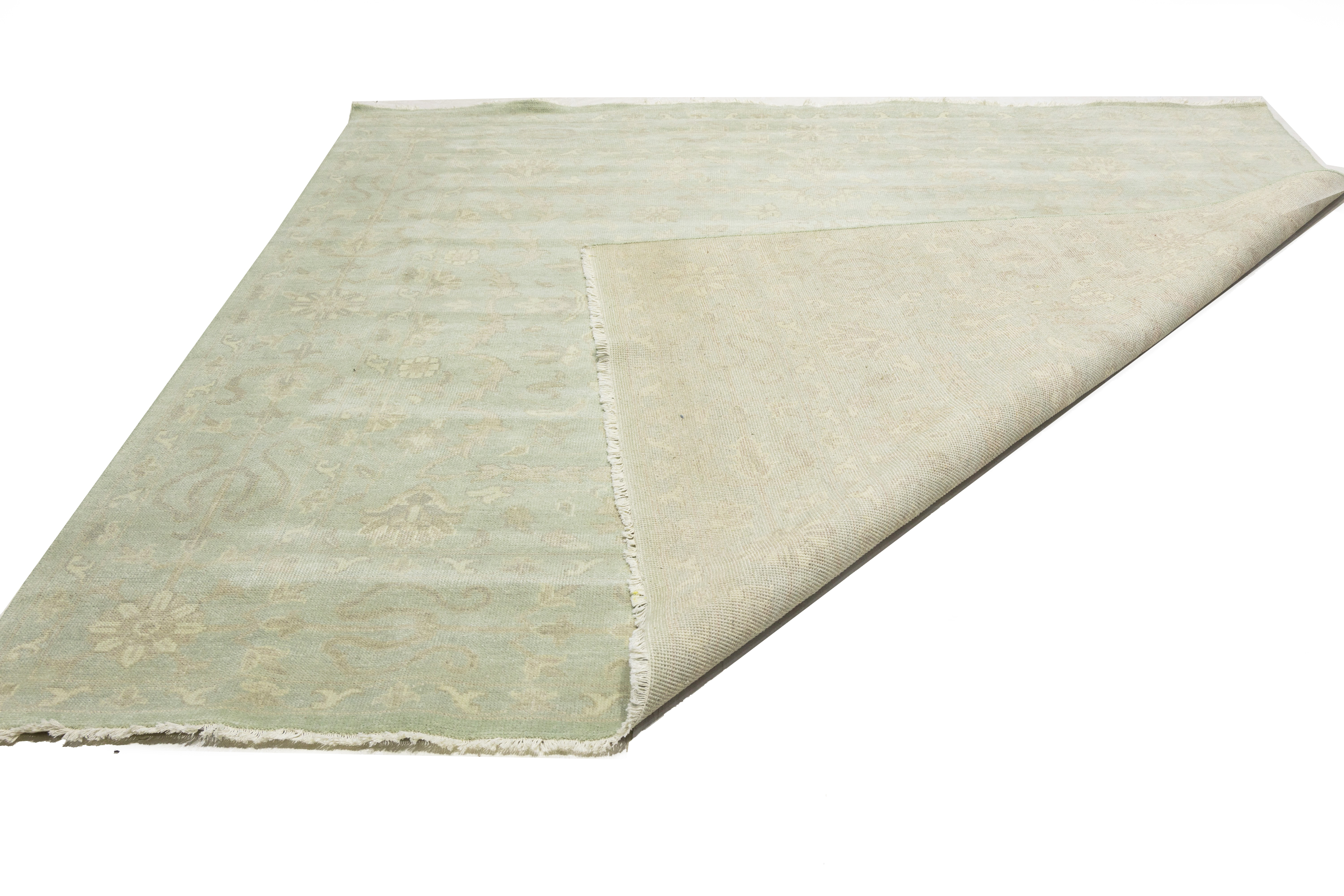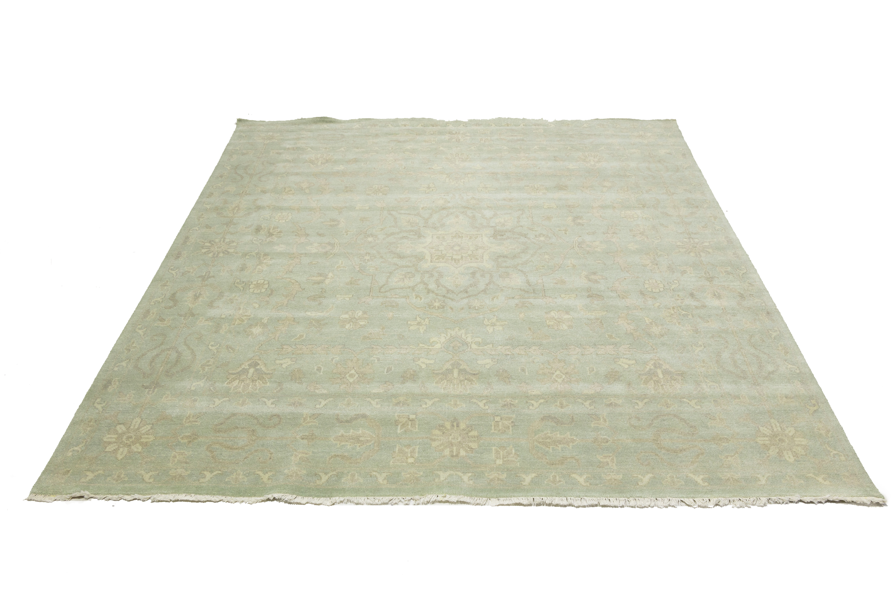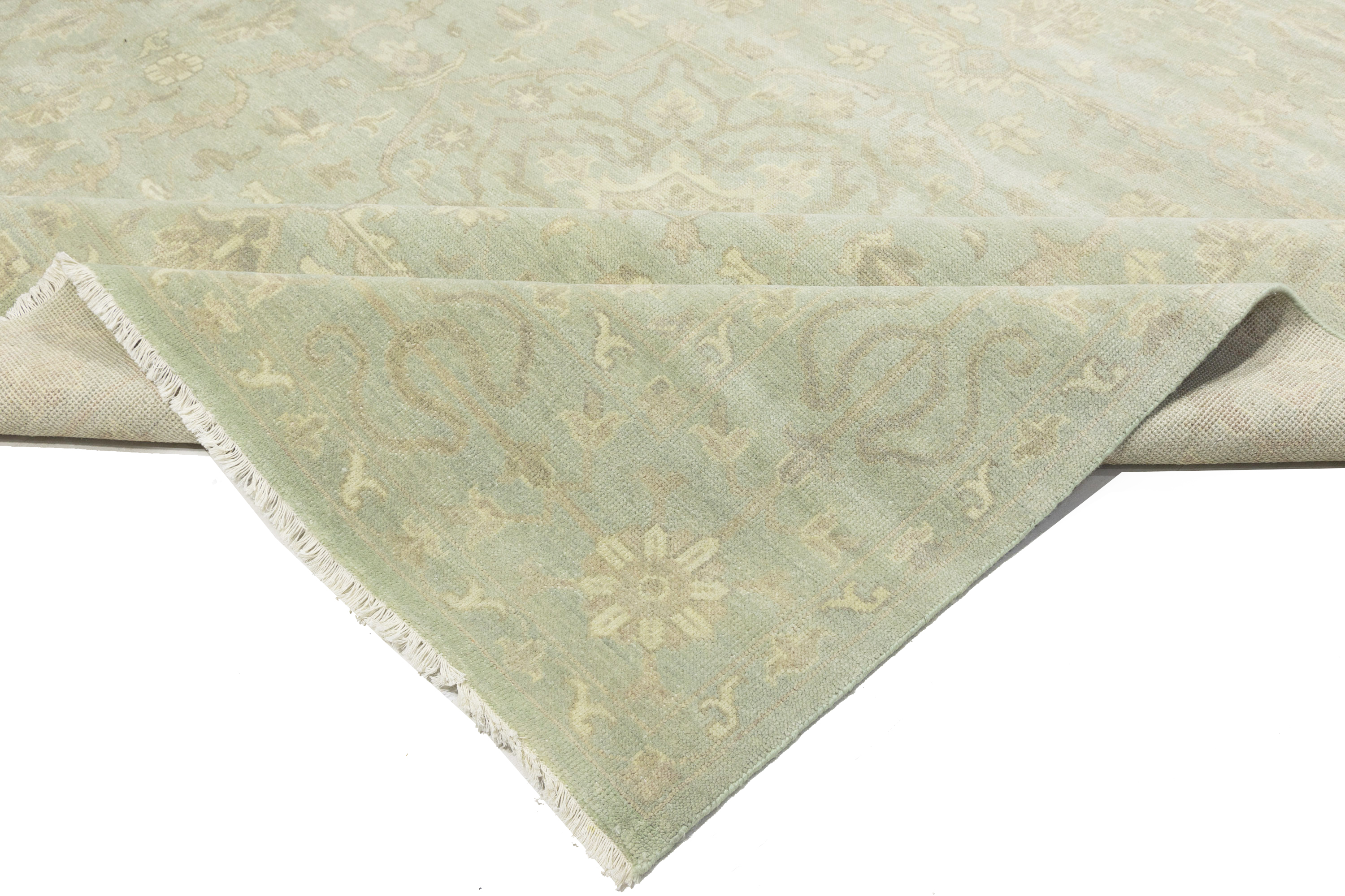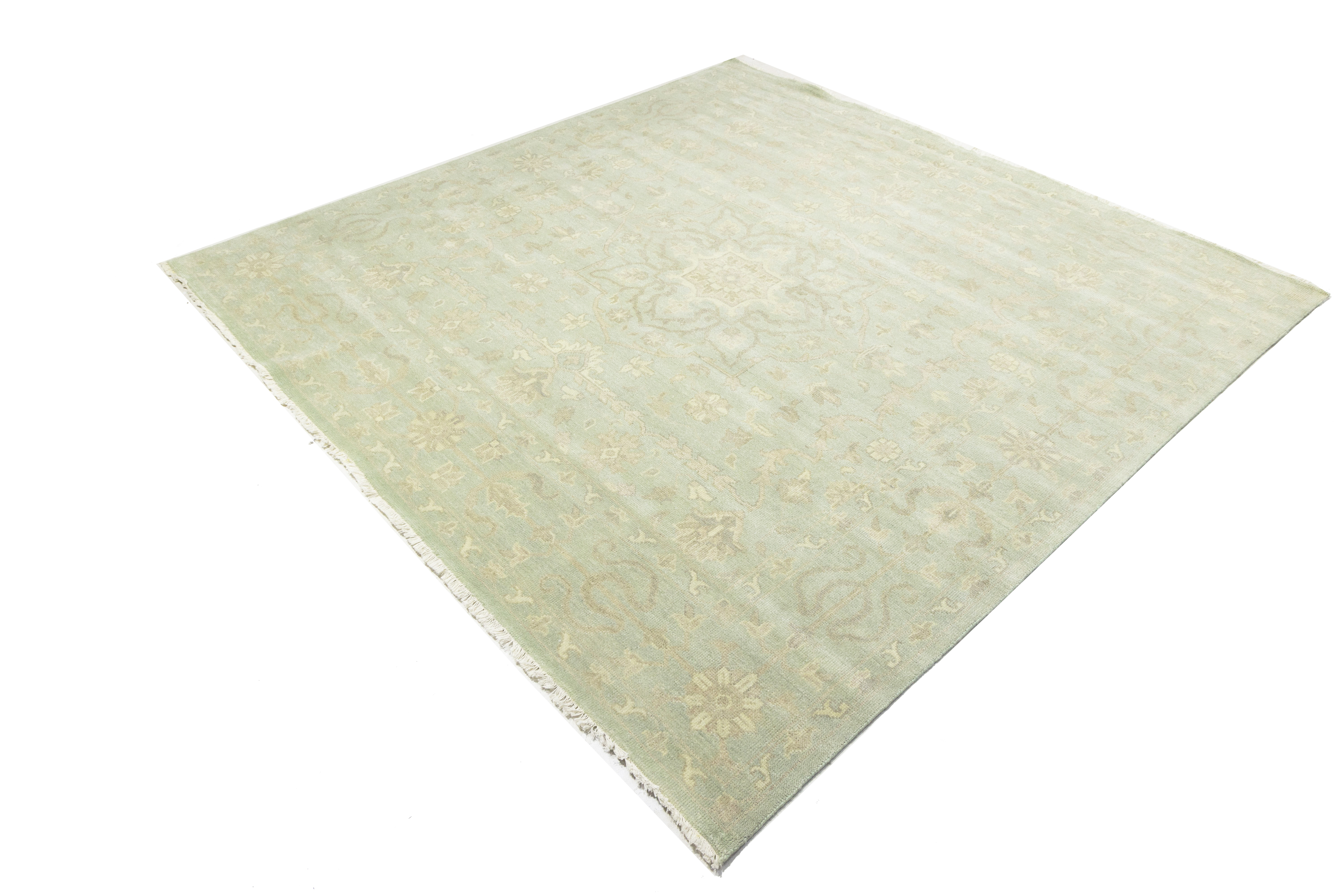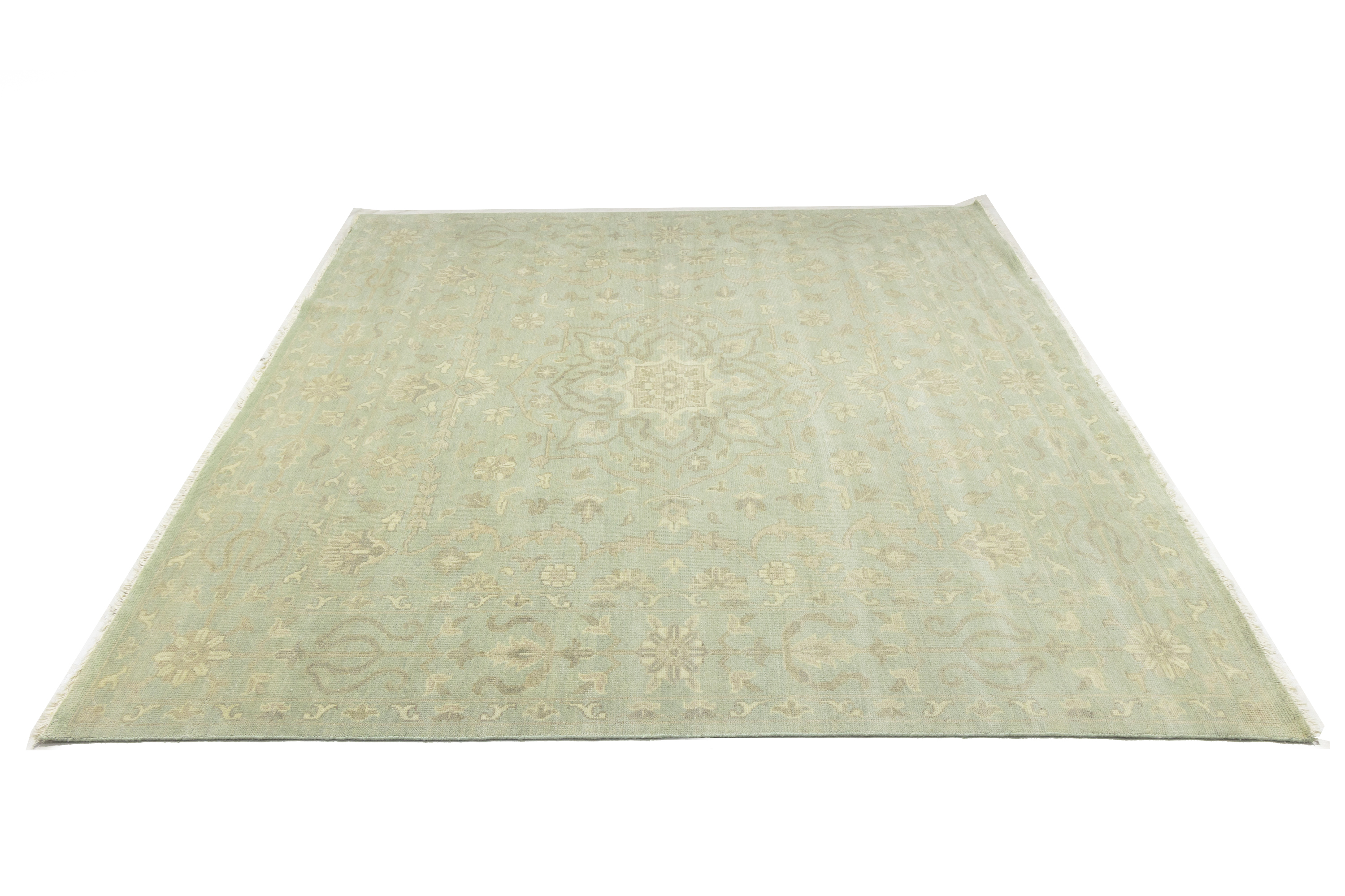 This genuine 10X10 aqua green new Oriental rug was made by the hands of gifted weavers inspired by a variety of spectacular artistic designs, to recreate the aged look of the original piece with a richness of color and ornately patterned background field. What set this vintage style Oriental area rug from the others are the material and dye used (wool pile and cotton foundation), knot count, ancient designs, fantastic grades, and its regional historical connection: it has deep roots, from the story of the people who produced it to the meaning of the symbols and colors displayed across its canvas that have been praised for centuries. This Indian home décor carpet will be completely cozy and inviting that never will go out of style! Also, this Oriental rug would be among your most valuable treasures, it is a great investment that accrues value over time, and it will last for generations because was woven with high-quality, all-natural wool. Environmentally friendly, opulent yet affordable; this rug will give you a thorough amount of character to help define your living space with elegance and warmth that will capture the eyes and attention of your audience (homeowners, designers, decorators, family and friends). OT-11860