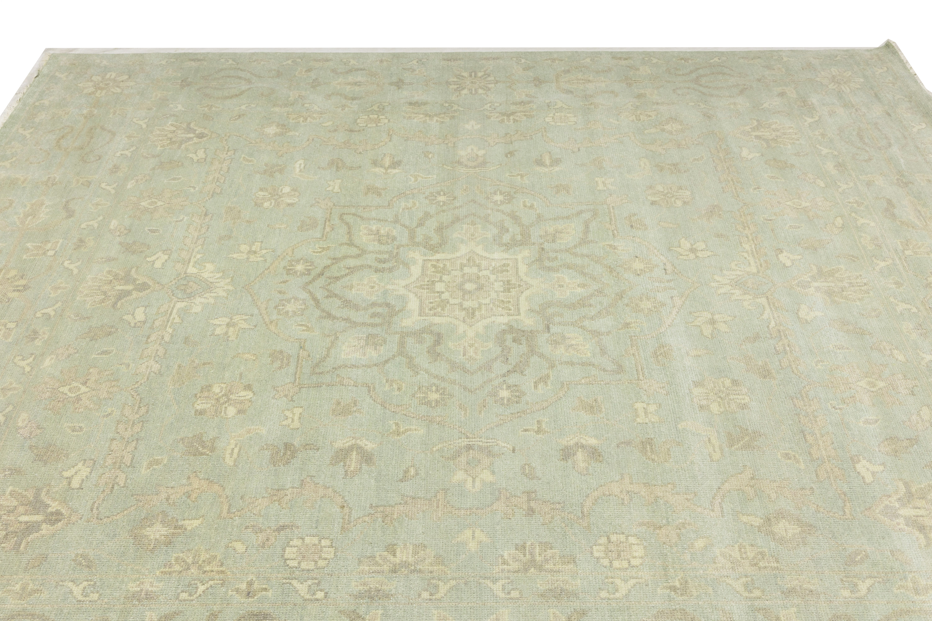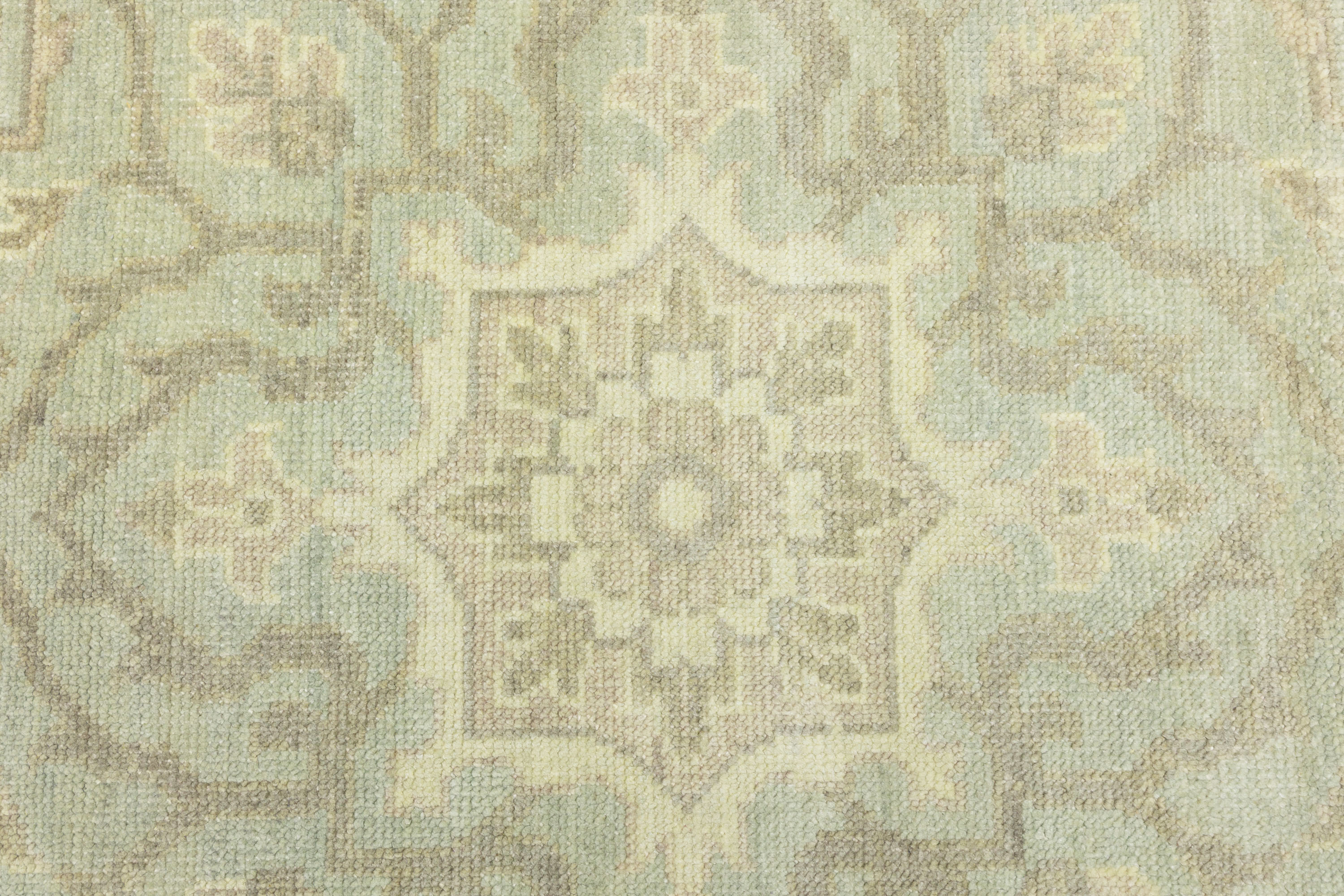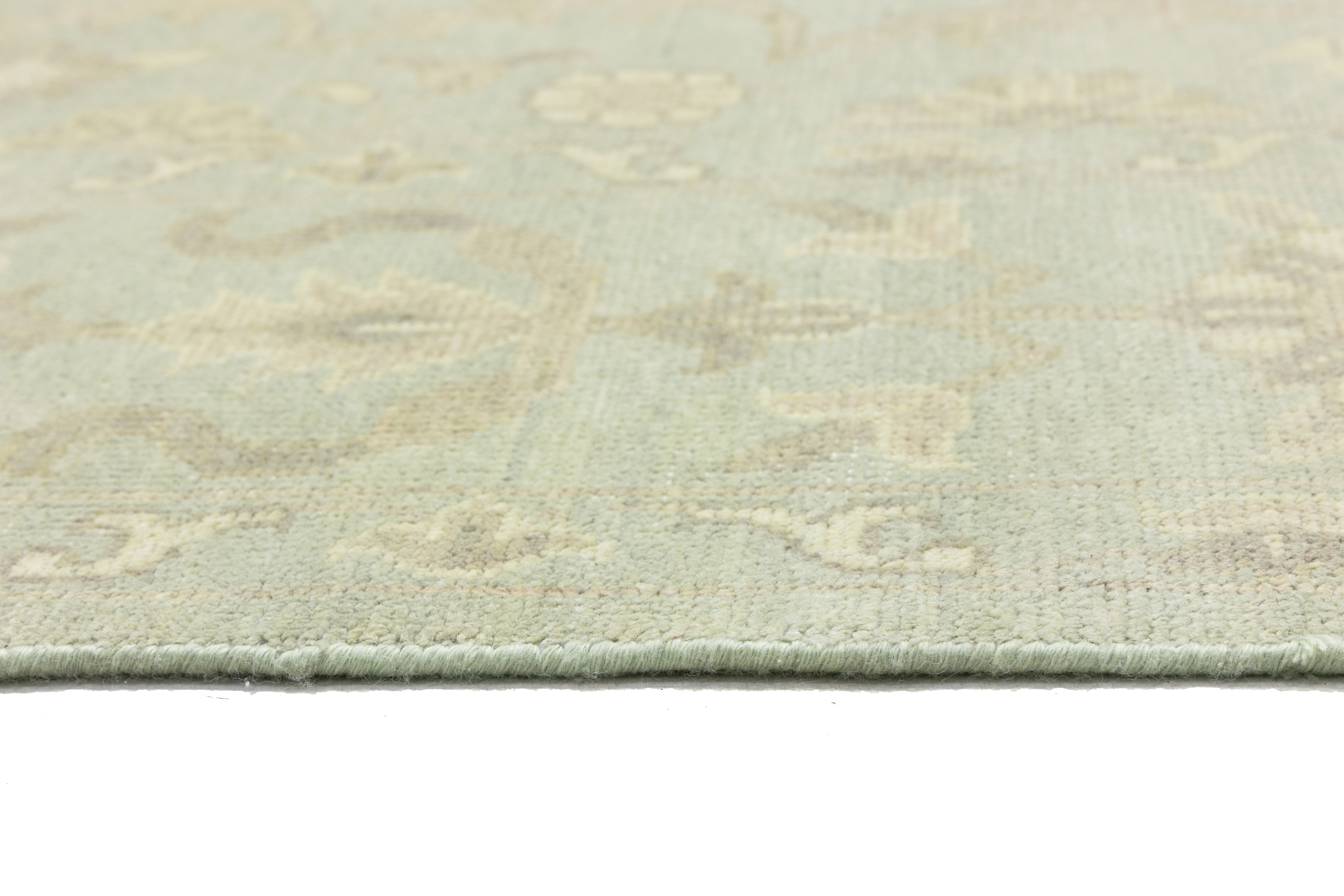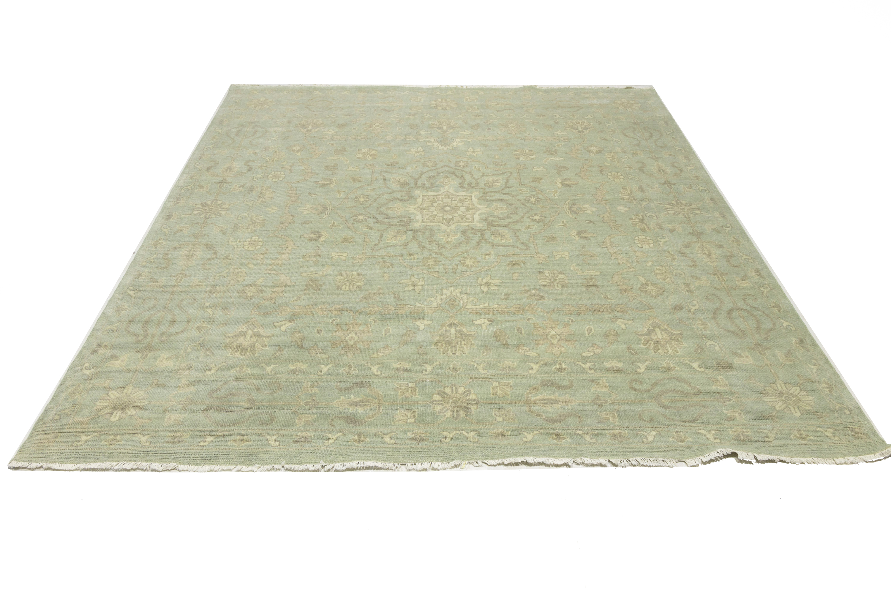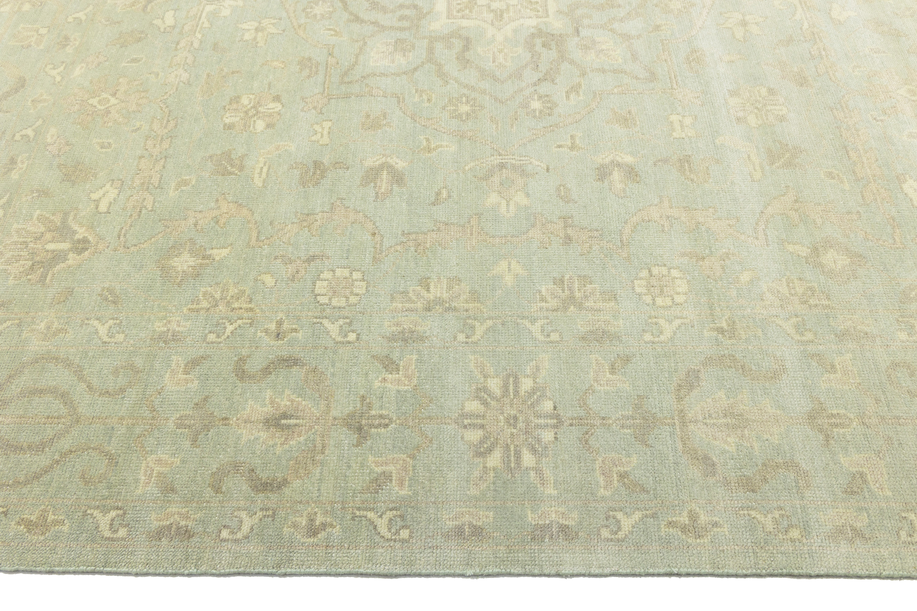 This genuine 10X10 aqua green new Oriental rug was made by the hands of gifted weavers inspired by a variety of spectacular artistic designs, to recreate the aged look of the original piece with a richness of color and ornately patterned background field. What set this vintage style Oriental area rug from the others are the material and dye used (wool pile and cotton foundation), knot count, ancient designs, fantastic grades, and its regional historical connection: it has deep roots, from the story of the people who produced it to the meaning of the symbols and colors displayed across its canvas that have been praised for centuries. This Indian home décor carpet will be completely cozy and inviting that never will go out of style! Also, this Oriental rug would be among your most valuable treasures, it is a great investment that accrues value over time, and it will last for generations because was woven with high-quality, all-natural wool. Environmentally friendly, opulent yet affordable; this rug will give you a thorough amount of character to help define your living space with elegance and warmth that will capture the eyes and attention of your audience (homeowners, designers, decorators, family and friends). OT-11860