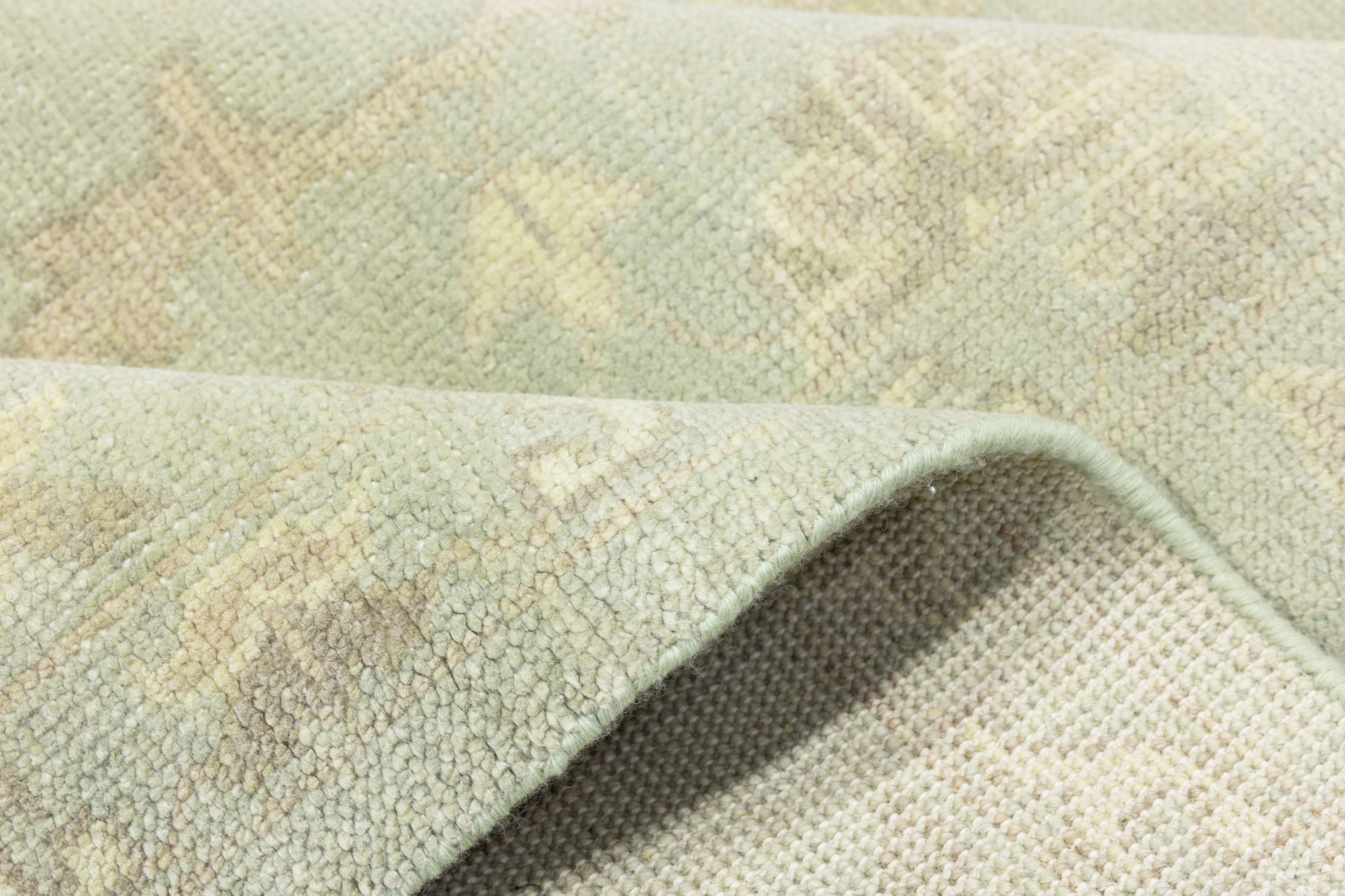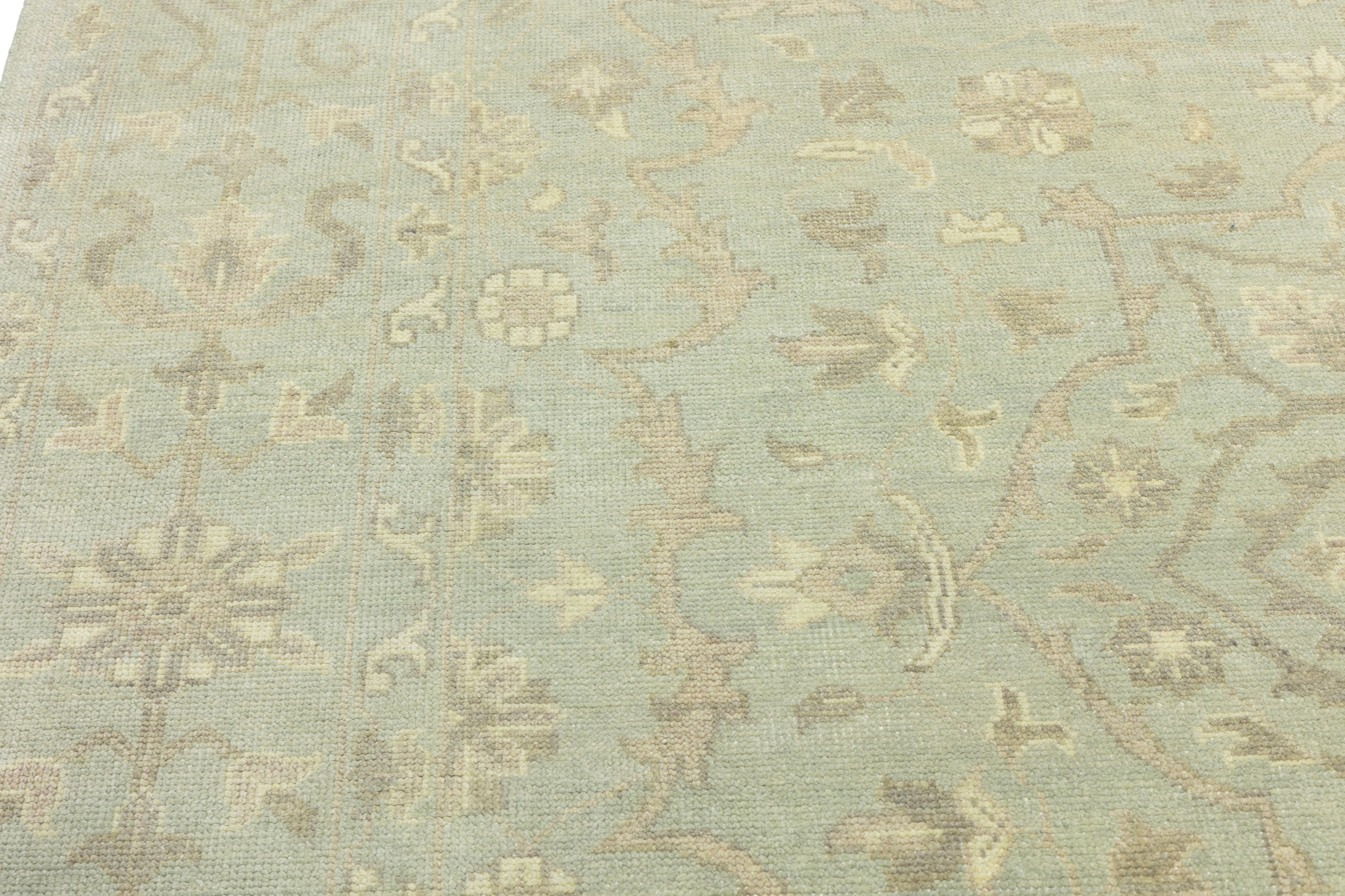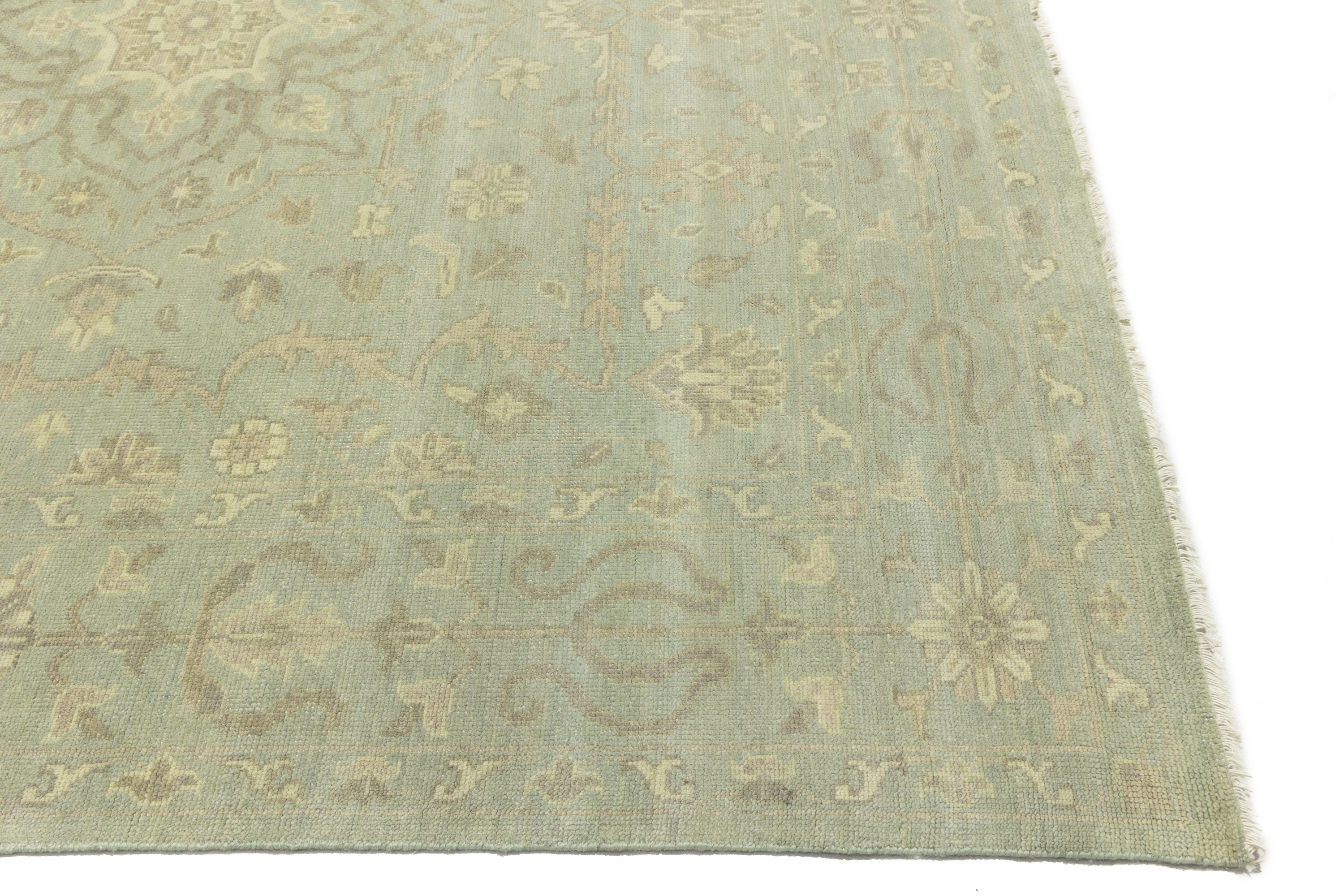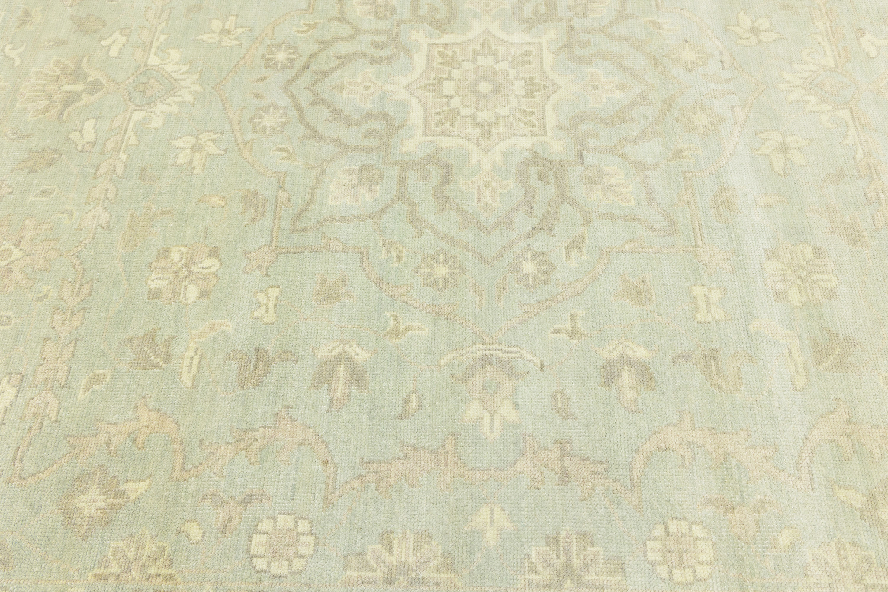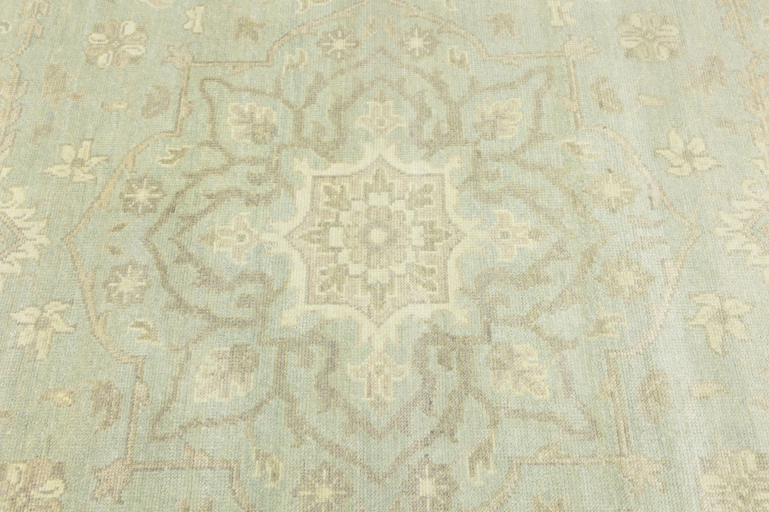 This genuine 10X10 aqua green new Oriental rug was made by the hands of gifted weavers inspired by a variety of spectacular artistic designs, to recreate the aged look of the original piece with a richness of color and ornately patterned background field. What set this vintage style Oriental area rug from the others are the material and dye used (wool pile and cotton foundation), knot count, ancient designs, fantastic grades, and its regional historical connection: it has deep roots, from the story of the people who produced it to the meaning of the symbols and colors displayed across its canvas that have been praised for centuries. This Indian home décor carpet will be completely cozy and inviting that never will go out of style! Also, this Oriental rug would be among your most valuable treasures, it is a great investment that accrues value over time, and it will last for generations because was woven with high-quality, all-natural wool. Environmentally friendly, opulent yet affordable; this rug will give you a thorough amount of character to help define your living space with elegance and warmth that will capture the eyes and attention of your audience (homeowners, designers, decorators, family and friends). OT-11860