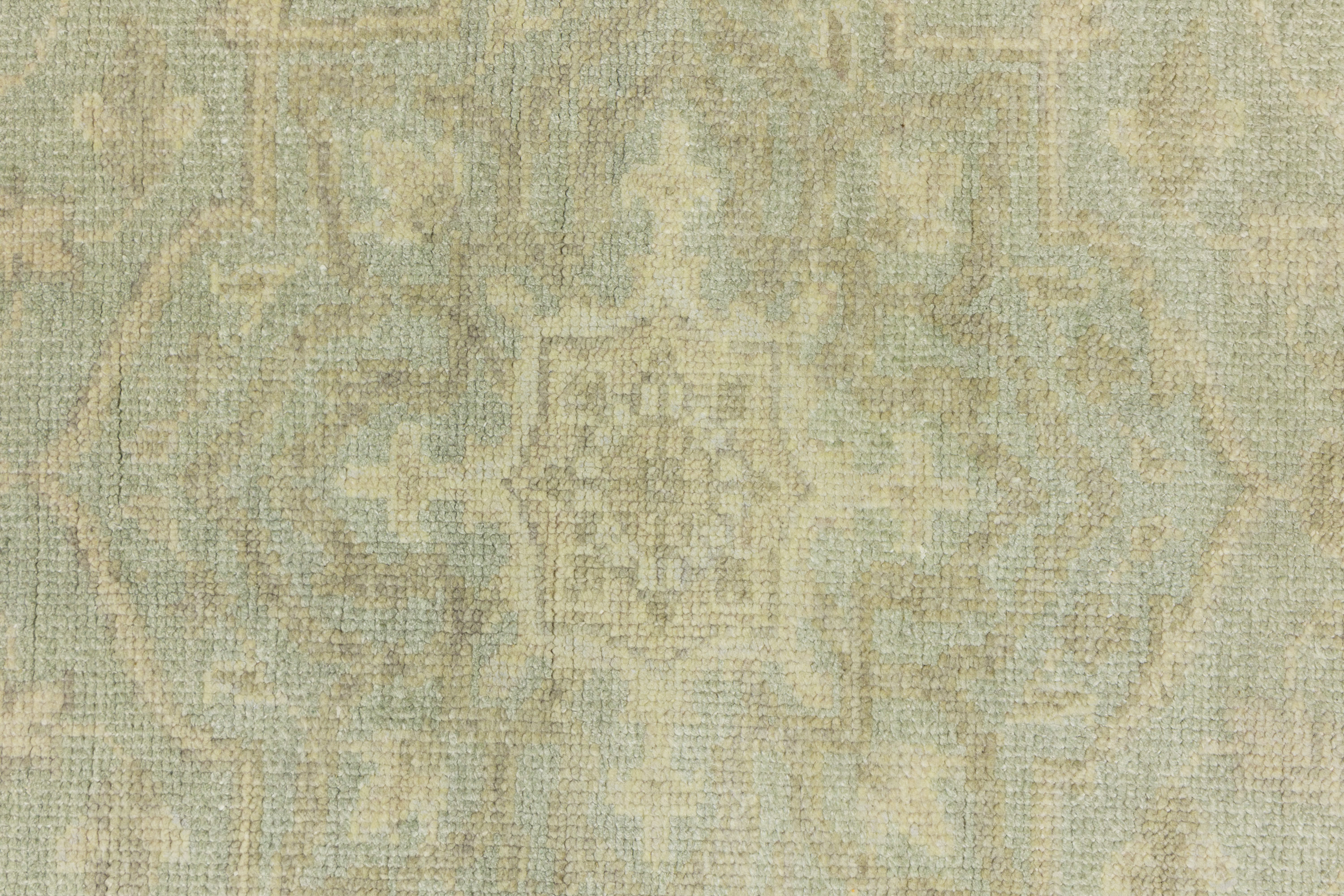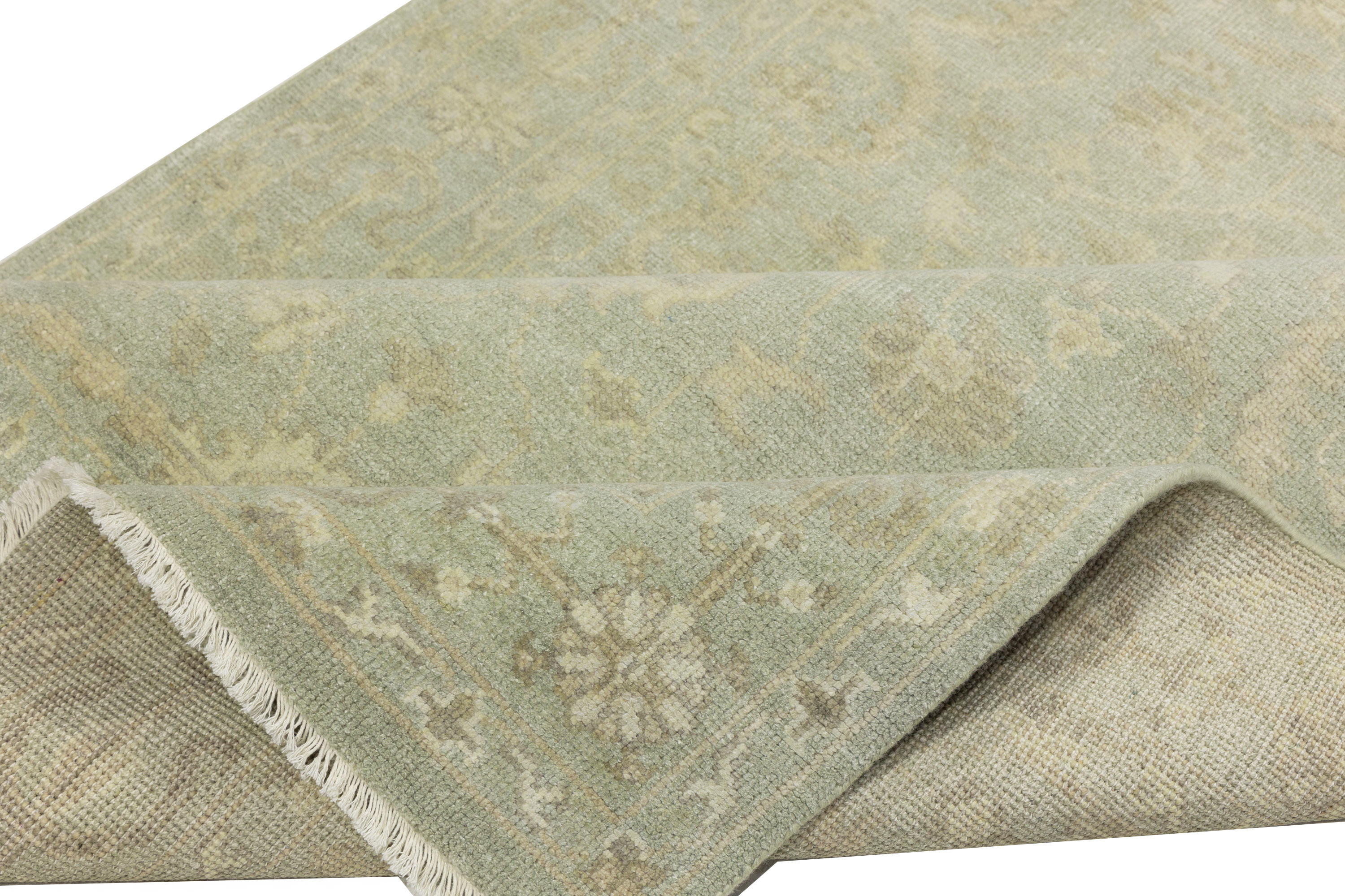 This genuine 6X9 aqua green new Oriental rug was made by the hands of gifted weavers inspired by a variety of spectacular artistic designs, to recreate the aged look of the original piece with a richness of color and ornately patterned background field. What set this vintage style Oriental area rug from the others are the material and dye used (wool pile and cotton foundation), knot count, ancient designs, fantastic grades, and its regional historical connection: it has deep roots, from the story of the people who produced it to the meaning of the symbols and colors displayed across its canvas that have been praised for centuries. This Indian home décor carpet will be completely cozy and inviting that never will go out of style! Also, this Oriental rug would be among your most valuable treasures, it is a great investment that accrues value over time, and it will last for generations because was woven with high-quality, all-natural wool. Environmentally friendly, opulent yet affordable; this rug will give you a thorough amount of character to help define your living space with elegance and warmth that will capture the eyes and attention of your audience (homeowners, designers, decorators, family and friends). OT-11852