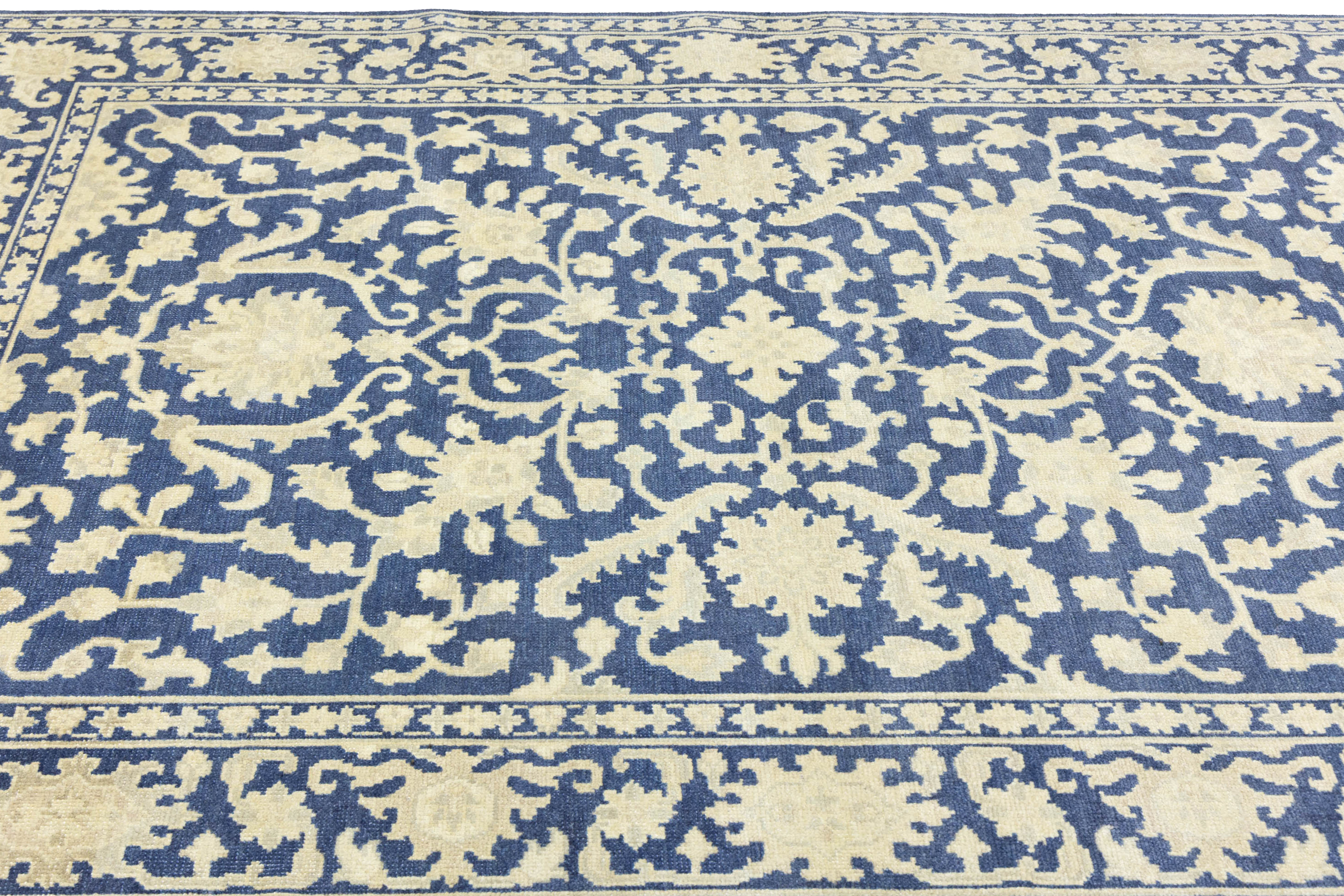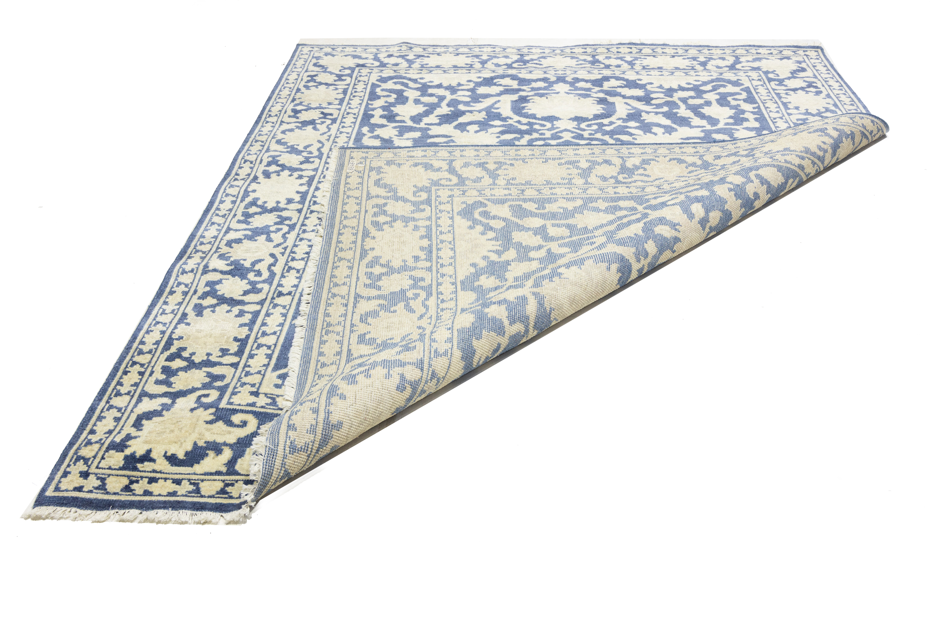 - Muted palette of blue, cream, and beige with natural abrash variation