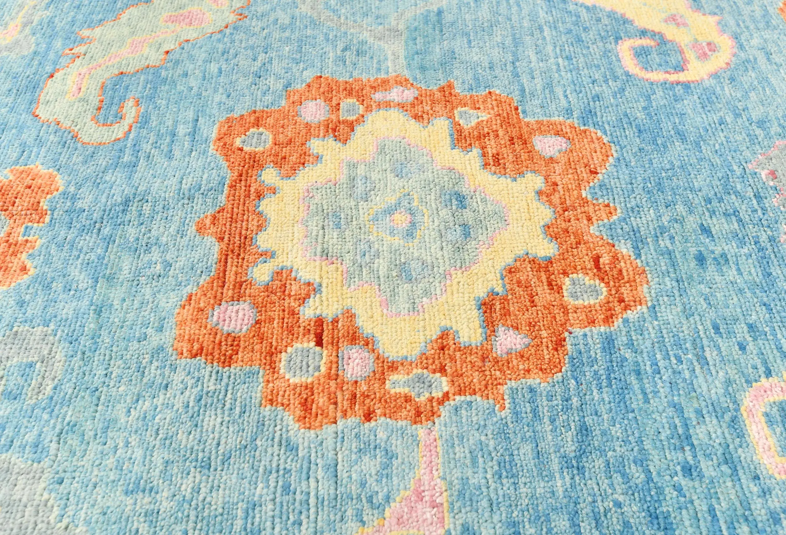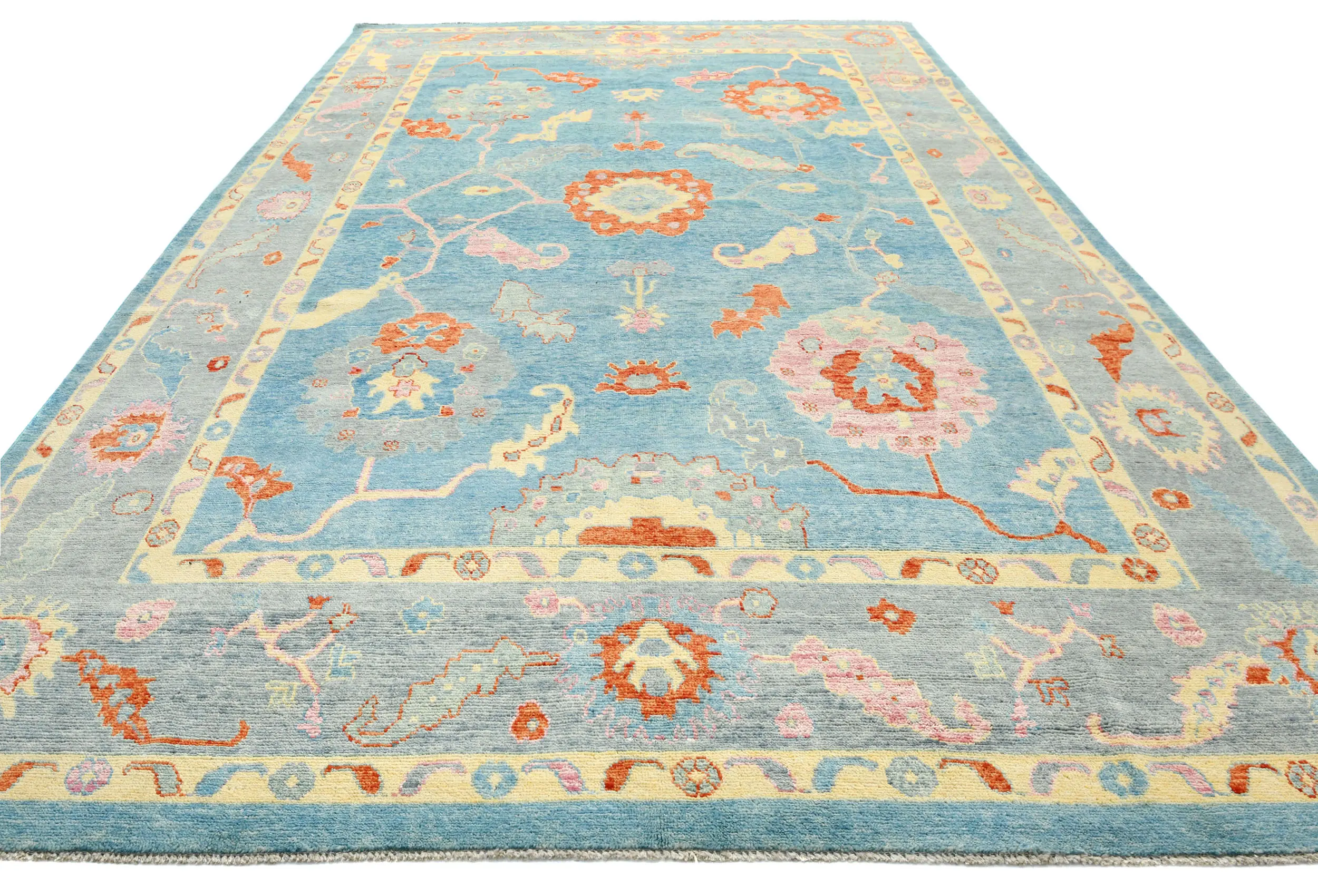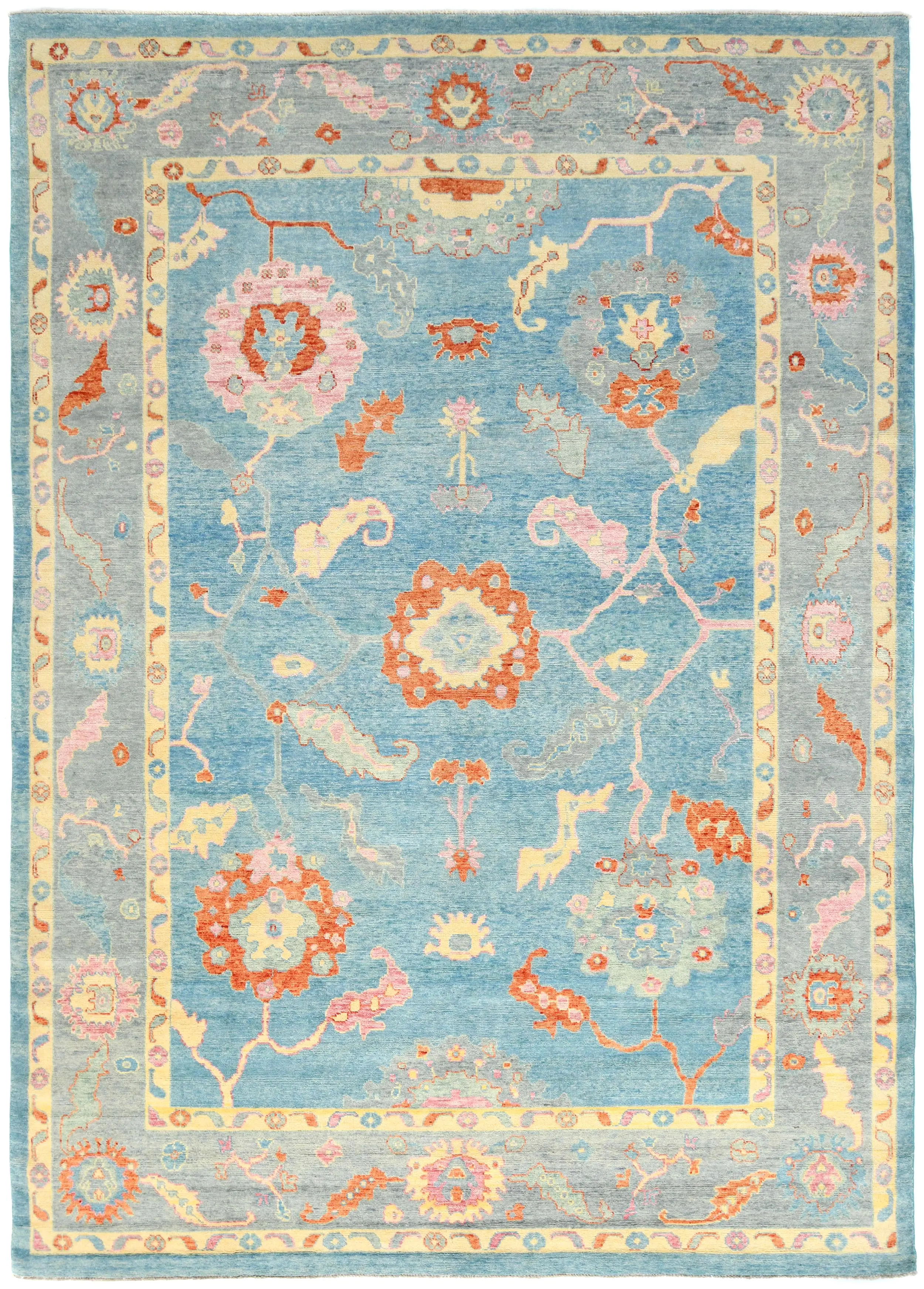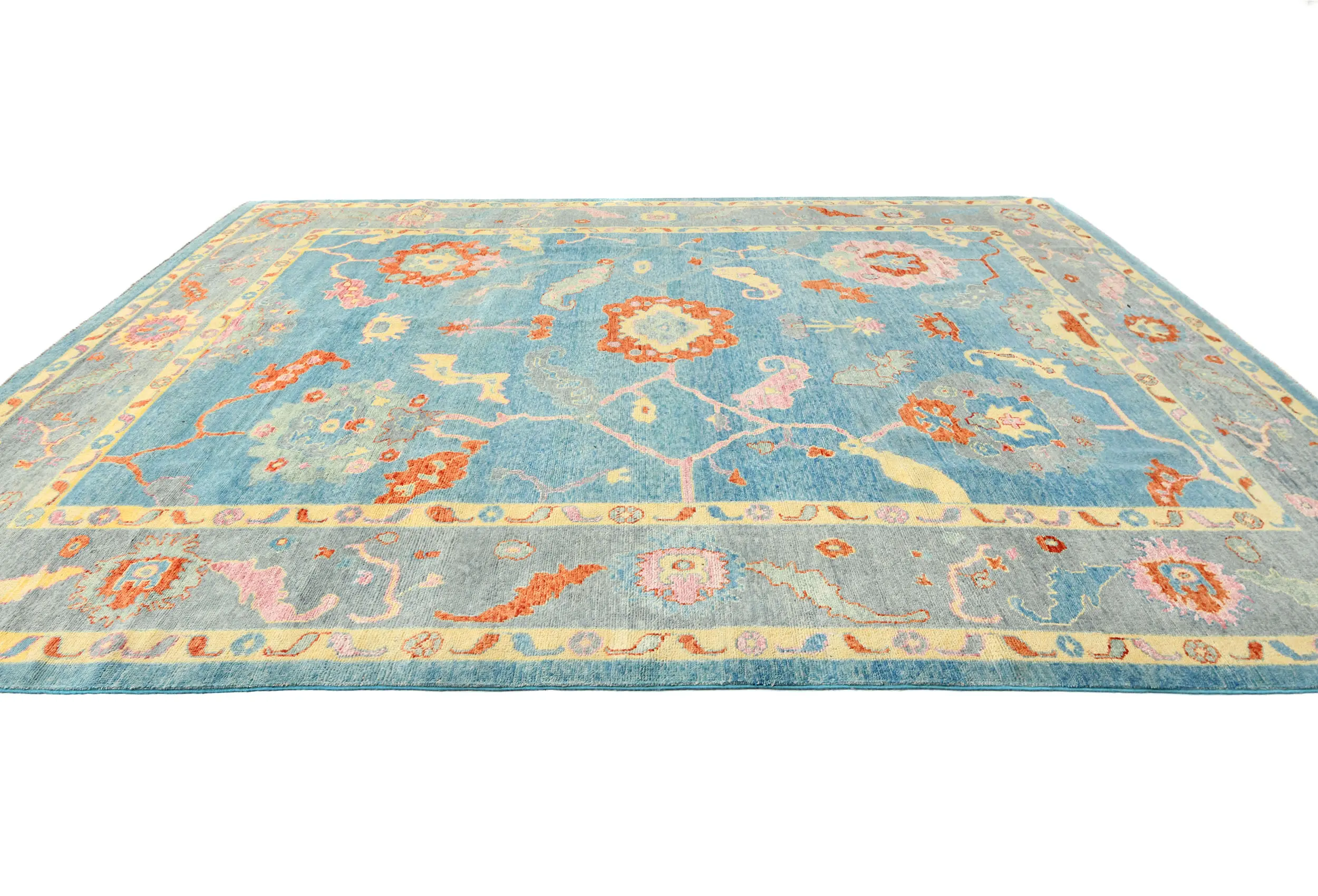 Handmade 10X14 blue Oushak oriental rug made with vegetable dyes (fine wool pile and cotton foundation), superior knot count, and alluring ancient designs. This Oriental rug never will go out of style and would be among your most valuable treasures.