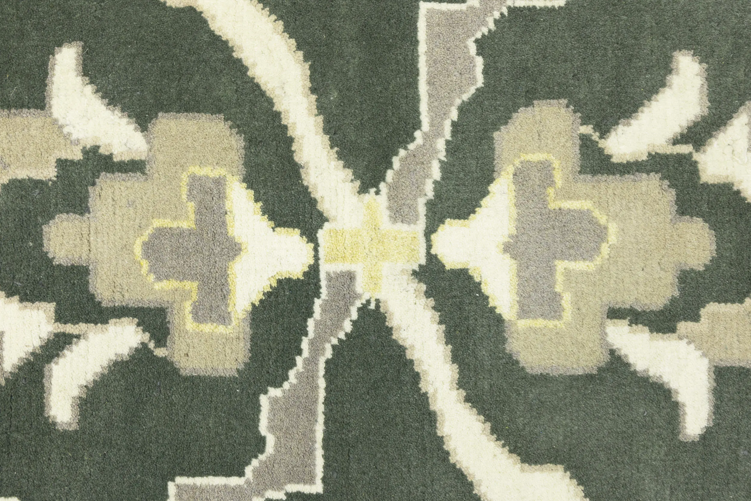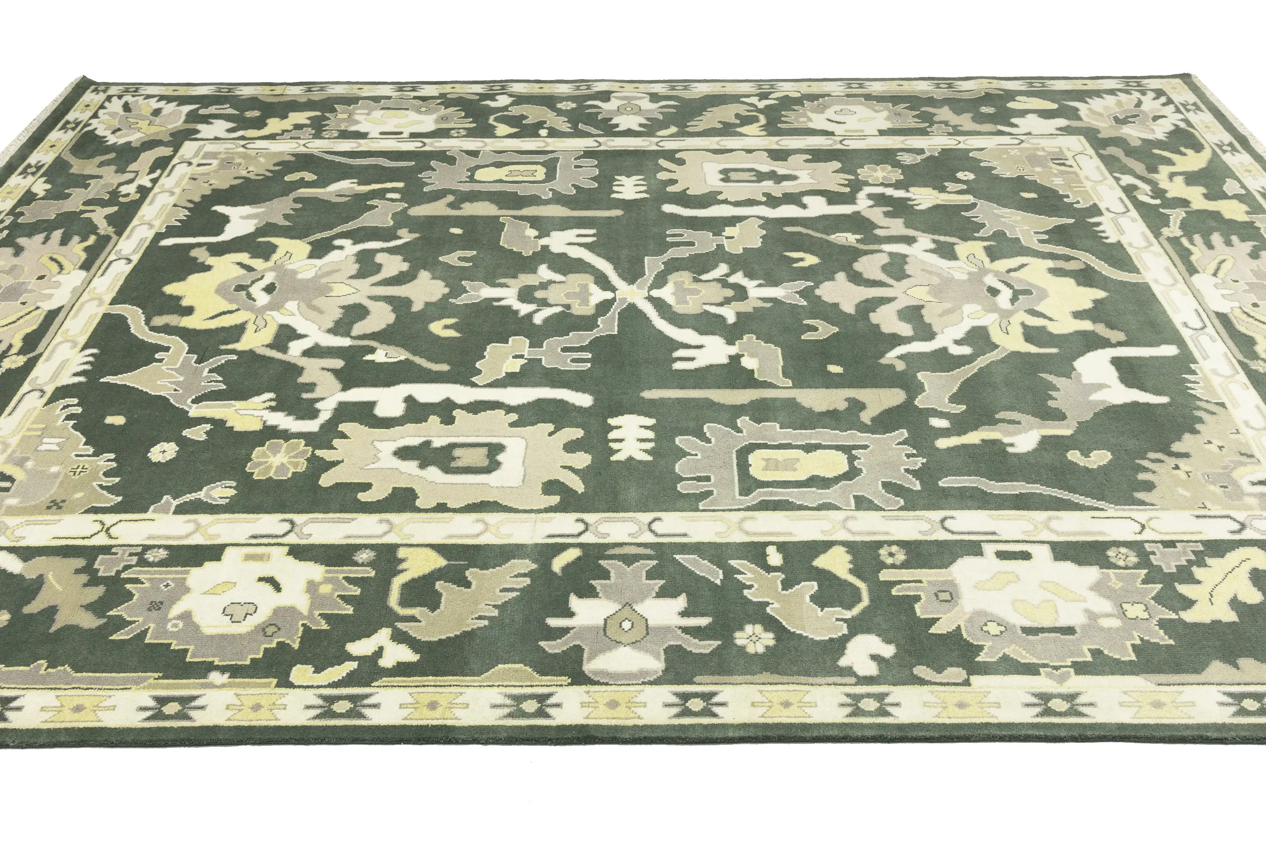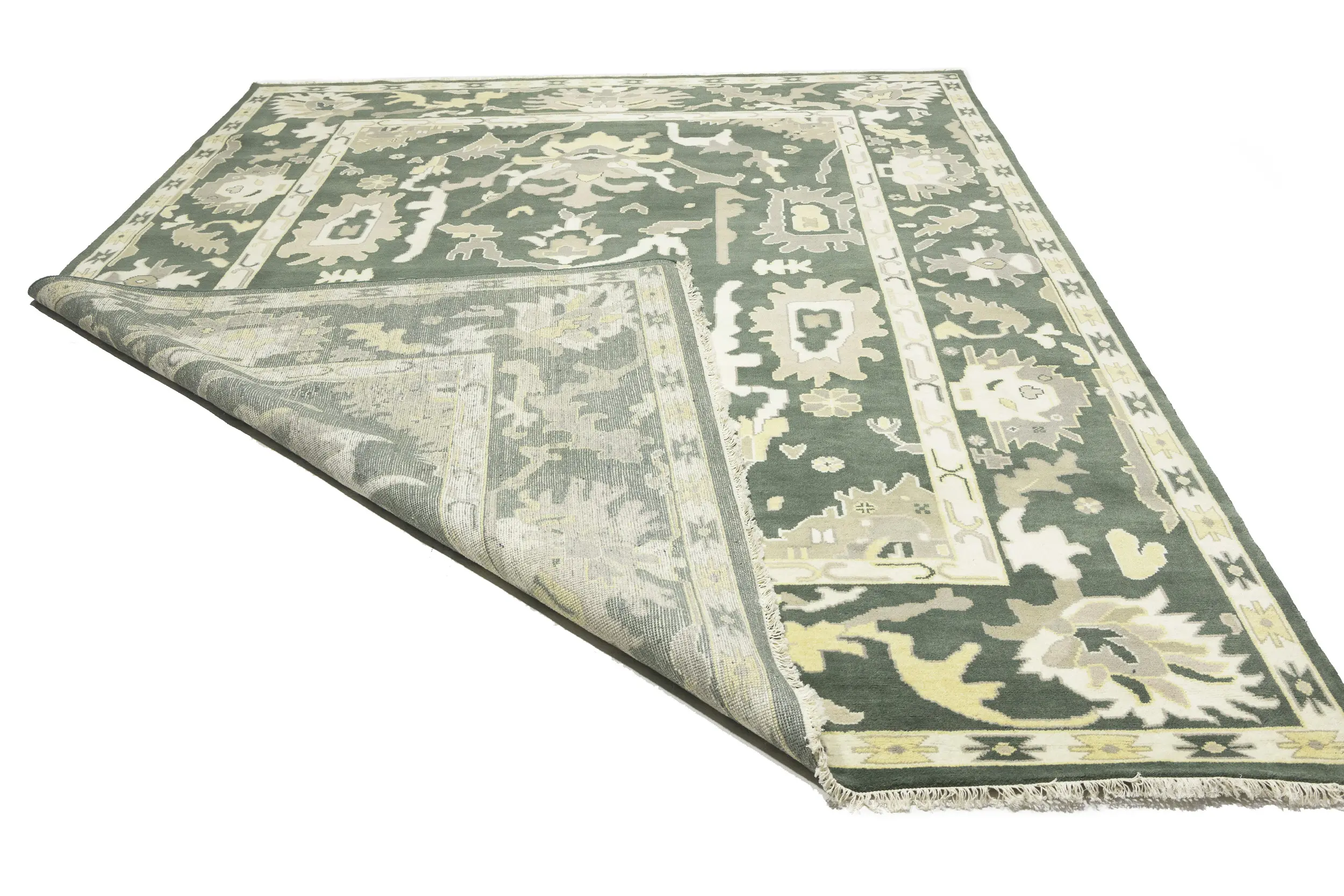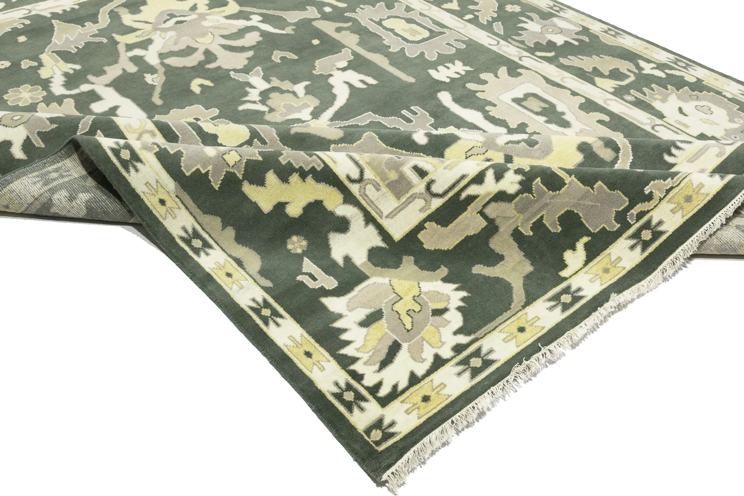 This original 10X14 Green Slate new Oriental rug was finely knotted by the hands of weavers influenced by a variety of amazing artistic designs, to recreate the aged look of the exceptional piece with a richness of color and embellished background field. What set this vintage style Oriental area rug from the others are the material and dye used (wool pile and cotton foundation), knot count, antique designs, fantastic grades, and its regional historical connection: it has deep roots, from the story of the people who produced it to the meaning of the symbols and colors displayed across its canvas that have been praised for centuries. This Indian home décor carpet will be completely cozy and inviting that never will go out of style! Also, this Oriental rug would be among your most valuable treasures, it is a great investment that increase in value over time, and it will last a lifetime because was woven with high-quality, all-natural wool. Eco-friendly, opulent yet affordable; this rug will give you an extra pop of character to help define your home environment with luxury and warmth that will capture the eyes and attention of your audience (homeowners, designers, decorators, family and friends).