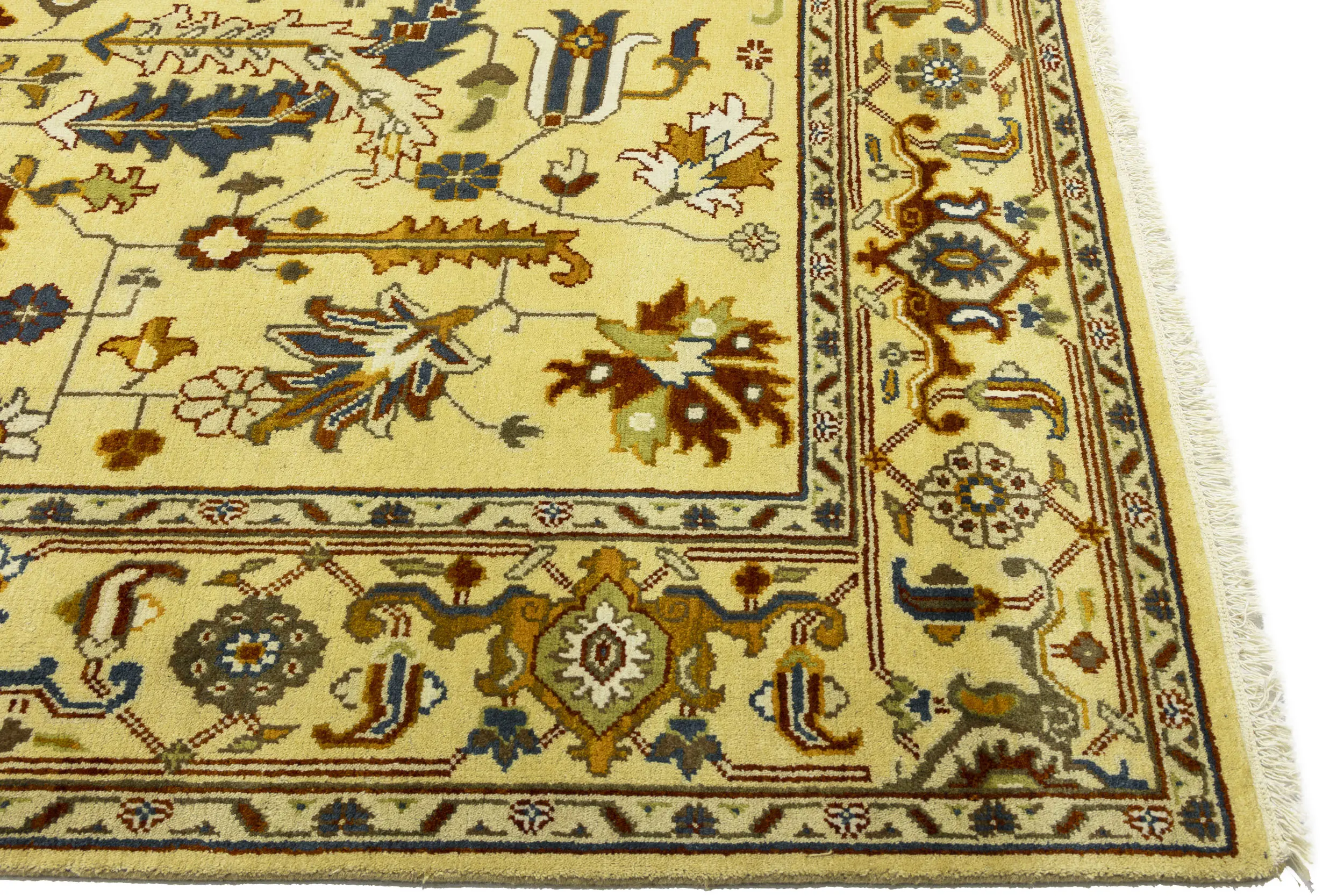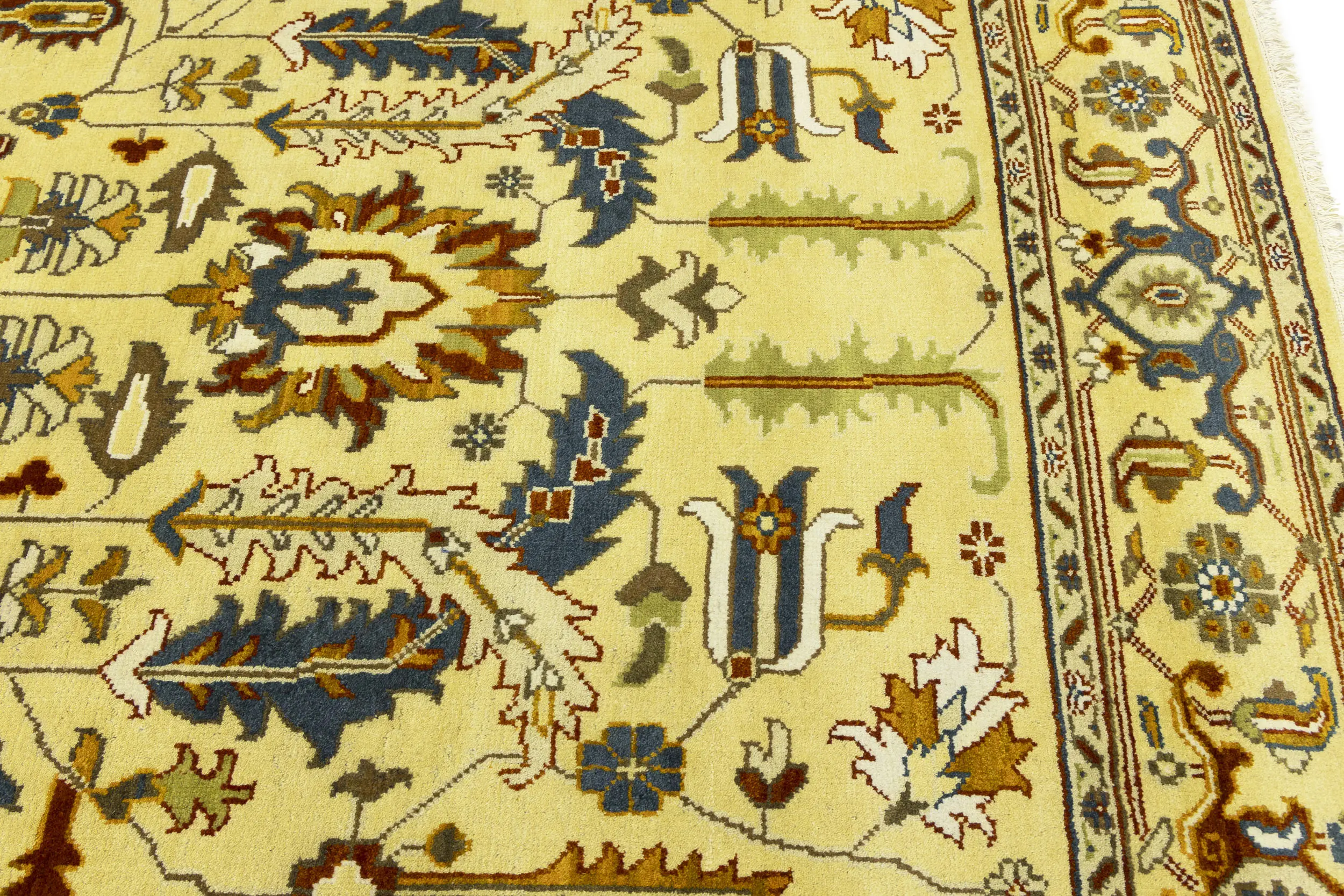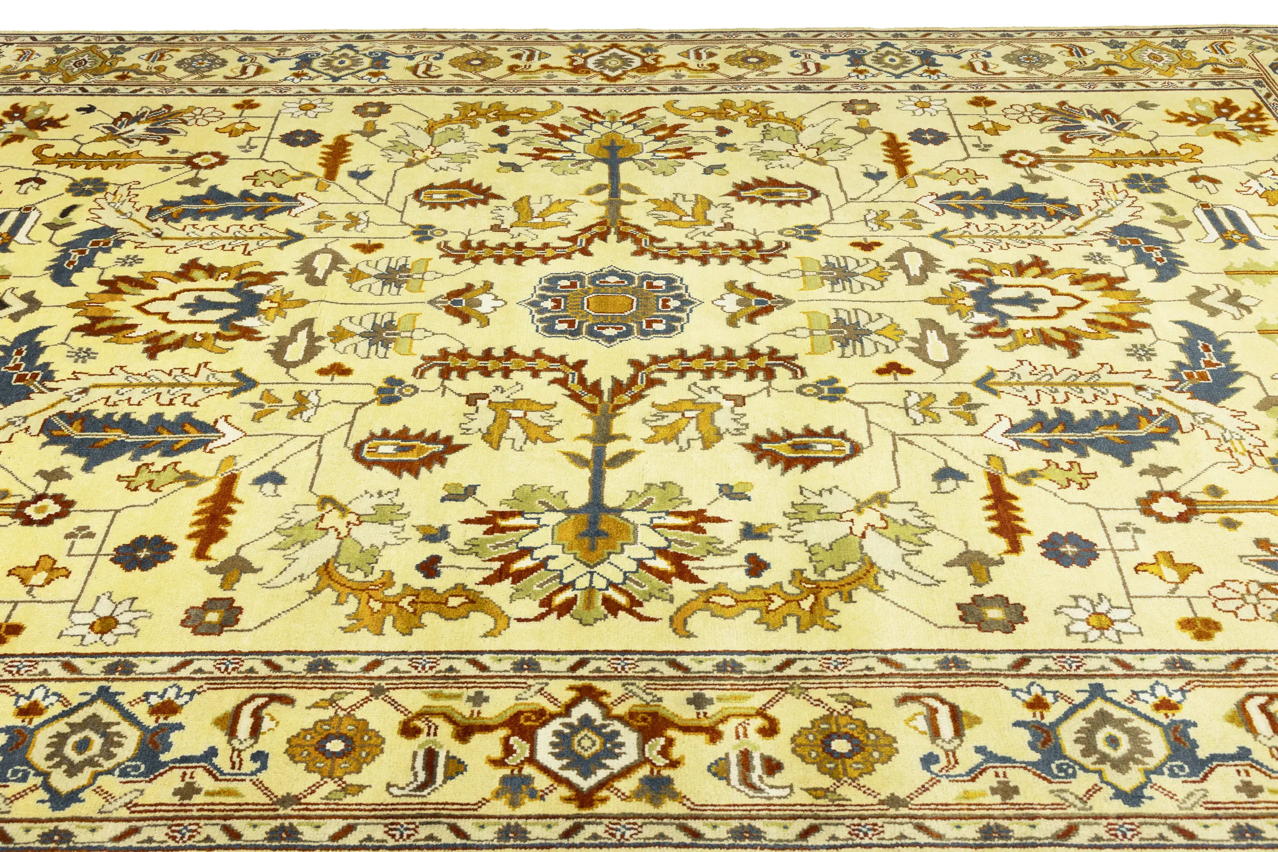 This genuine 10X14 Yellowish Cream new Oriental rug was made by the hands of gifted weavers inspired by a variety of spectacular artistic designs, to recreate the aged look of the original piece with a richness of color and ornately patterned background field. What set this vintage style Oriental area rug from the others are the material and dye used (wool pile and cotton foundation), knot count, ancient designs, fantastic grades, and its regional historical connection: it has deep roots, from the story of the people who produced it to the meaning of the symbols and colors displayed across its canvas that have been praised for centuries. This Indian home décor carpet will be completely cozy and inviting that never will go out of style! Also, this Oriental rug would be among your most valuable treasures, it is a great investment that accrues value over time, and it will last for generations because was woven with high-quality, all-natural wool. Environmentally friendly, opulent yet affordable; this rug will give you a thorough amount of character to help define your living space with elegance and warmth that will capture the eyes and attention of your audience (homeowners, designers, decorators, family and friends).