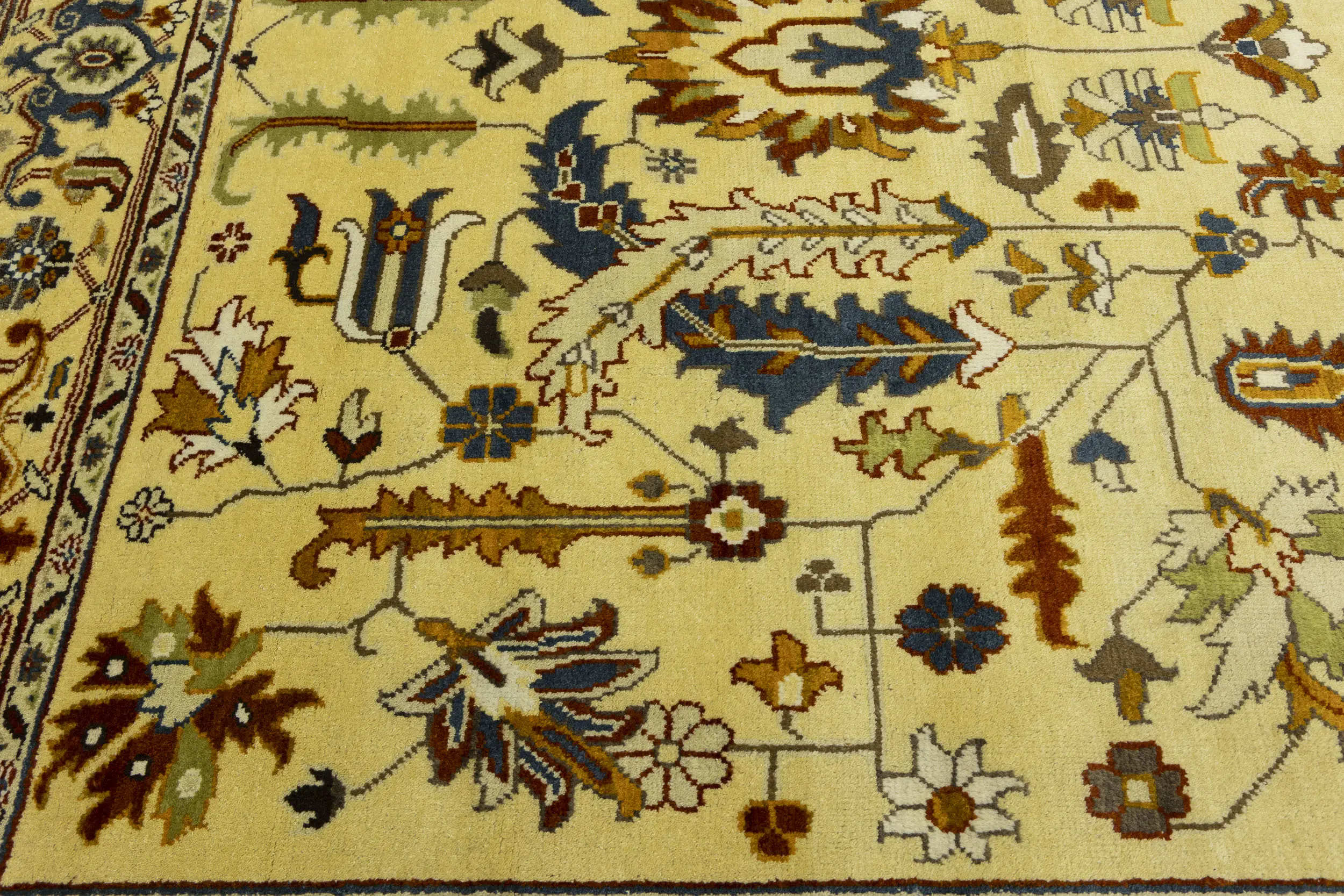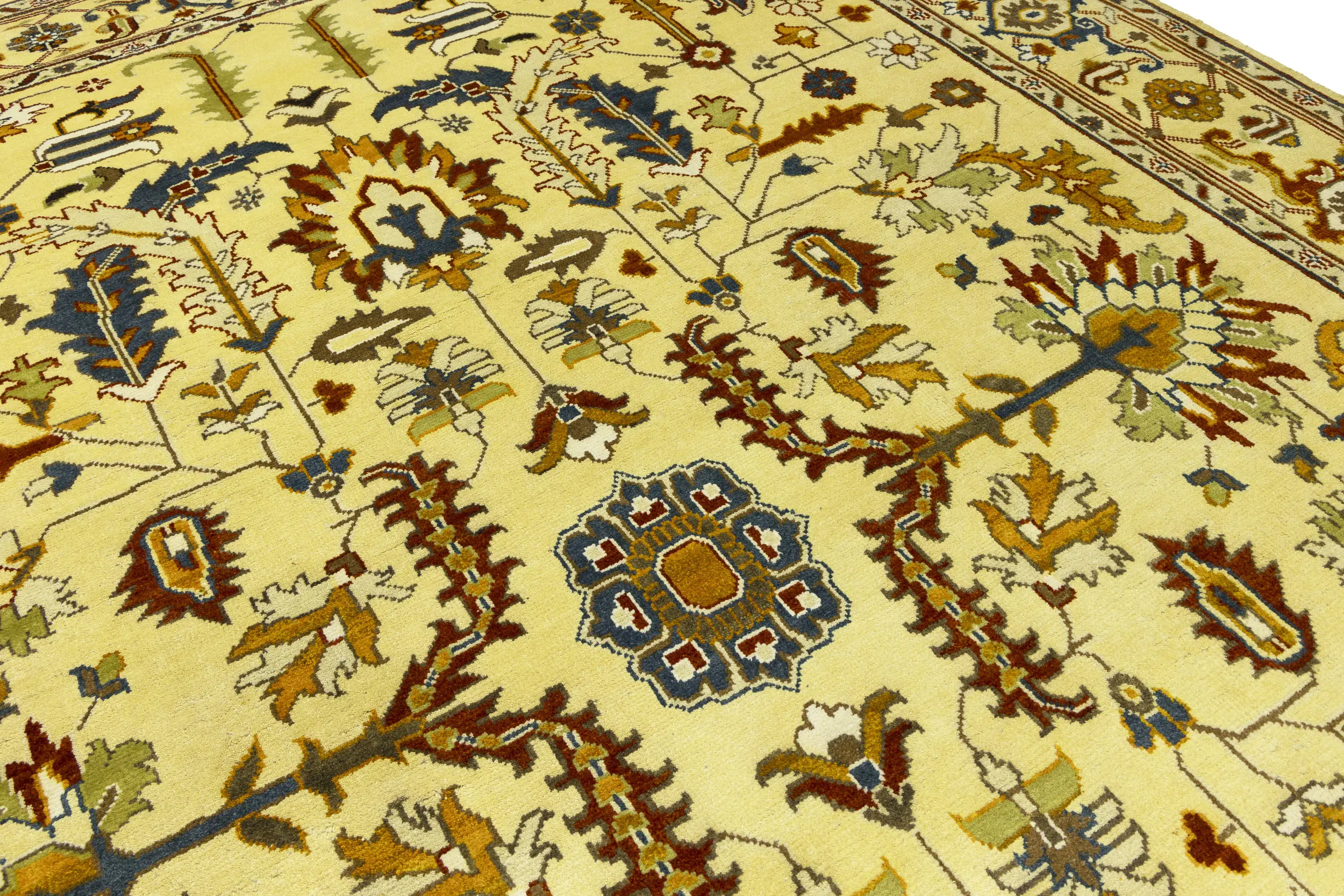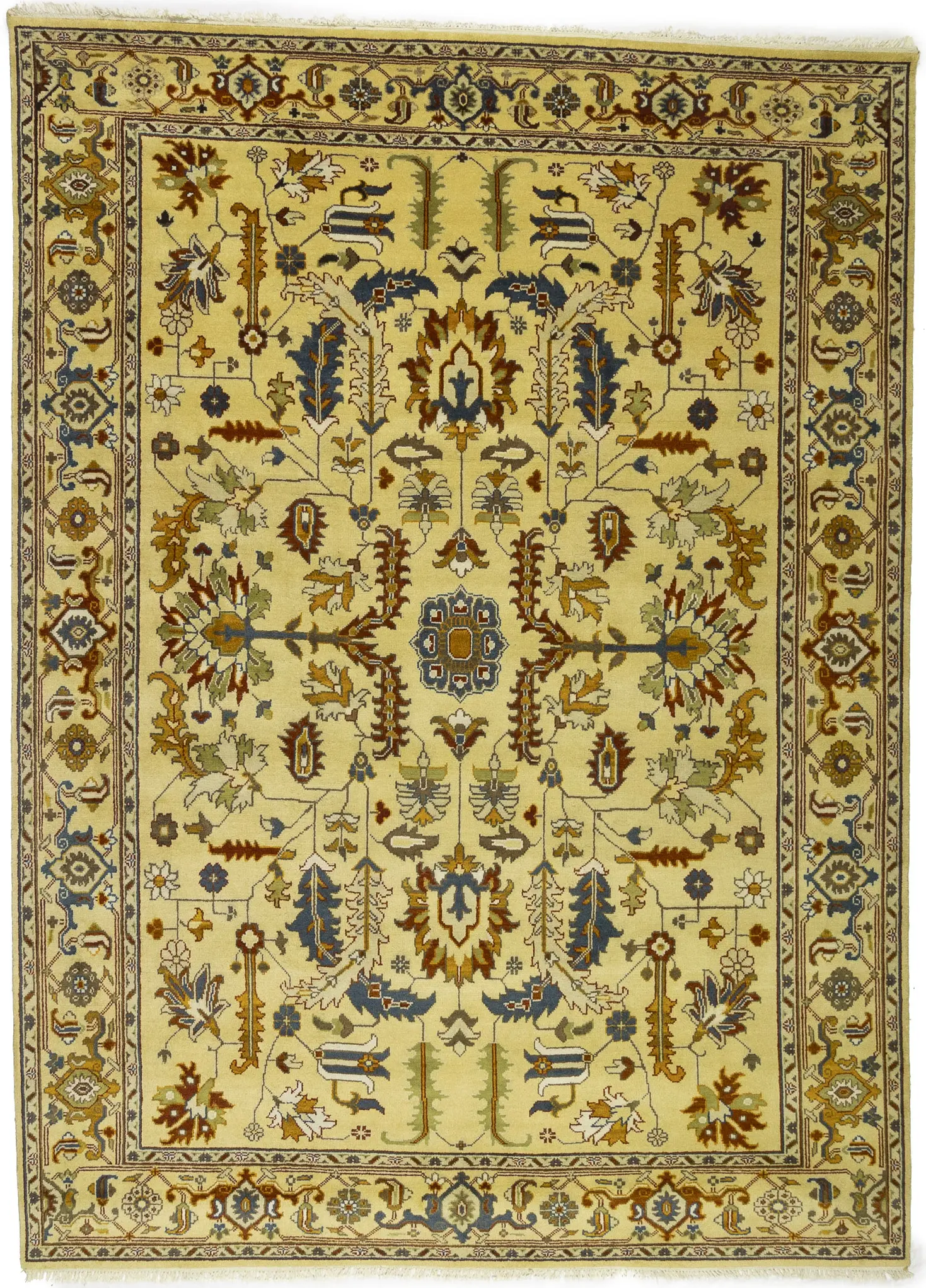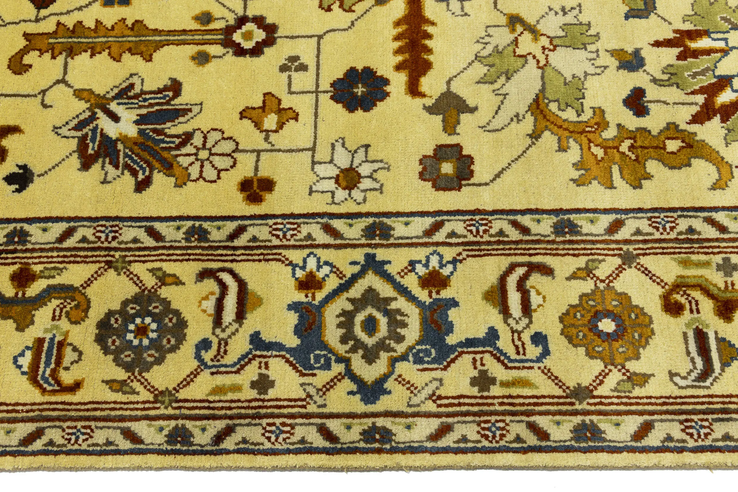 This genuine 10X14 Yellowish Cream new Oriental rug was made by the hands of gifted weavers inspired by a variety of spectacular artistic designs, to recreate the aged look of the original piece with a richness of color and ornately patterned background field. What set this vintage style Oriental area rug from the others are the material and dye used (wool pile and cotton foundation), knot count, ancient designs, fantastic grades, and its regional historical connection: it has deep roots, from the story of the people who produced it to the meaning of the symbols and colors displayed across its canvas that have been praised for centuries. This Indian home décor carpet will be completely cozy and inviting that never will go out of style! Also, this Oriental rug would be among your most valuable treasures, it is a great investment that accrues value over time, and it will last for generations because was woven with high-quality, all-natural wool. Environmentally friendly, opulent yet affordable; this rug will give you a thorough amount of character to help define your living space with elegance and warmth that will capture the eyes and attention of your audience (homeowners, designers, decorators, family and friends).