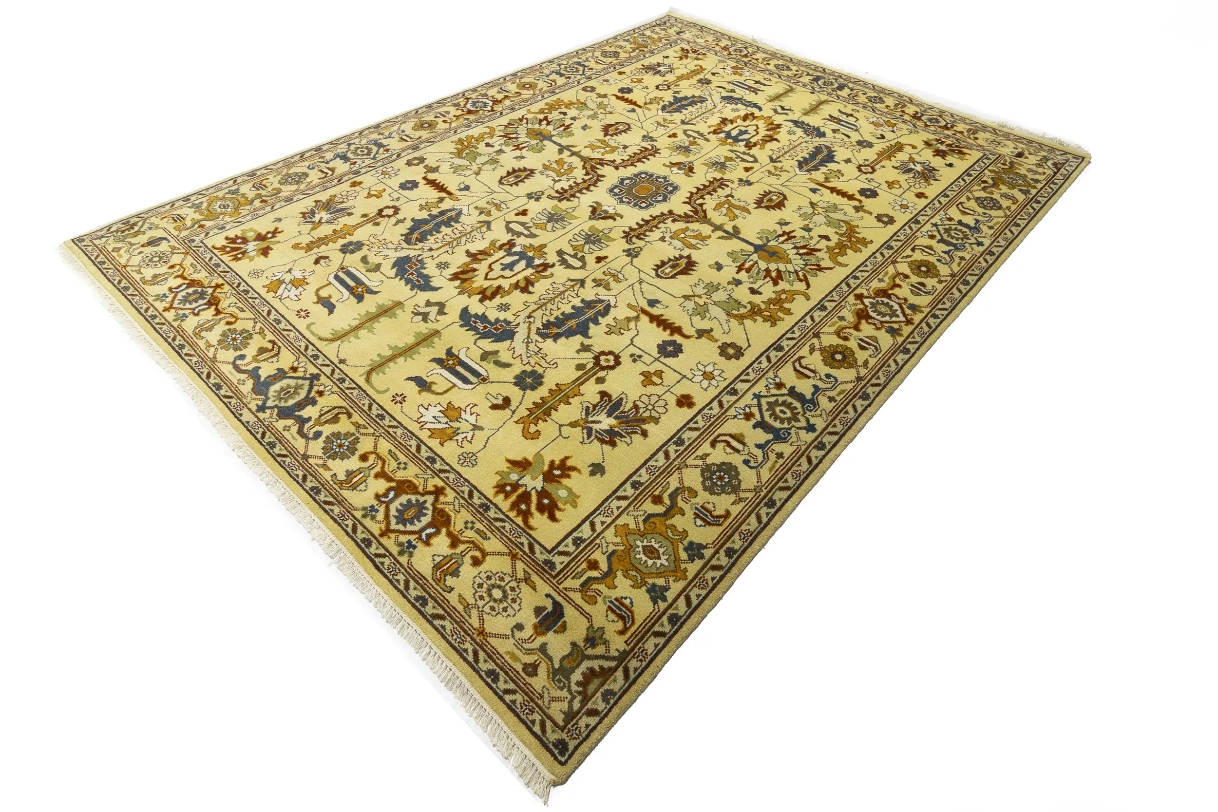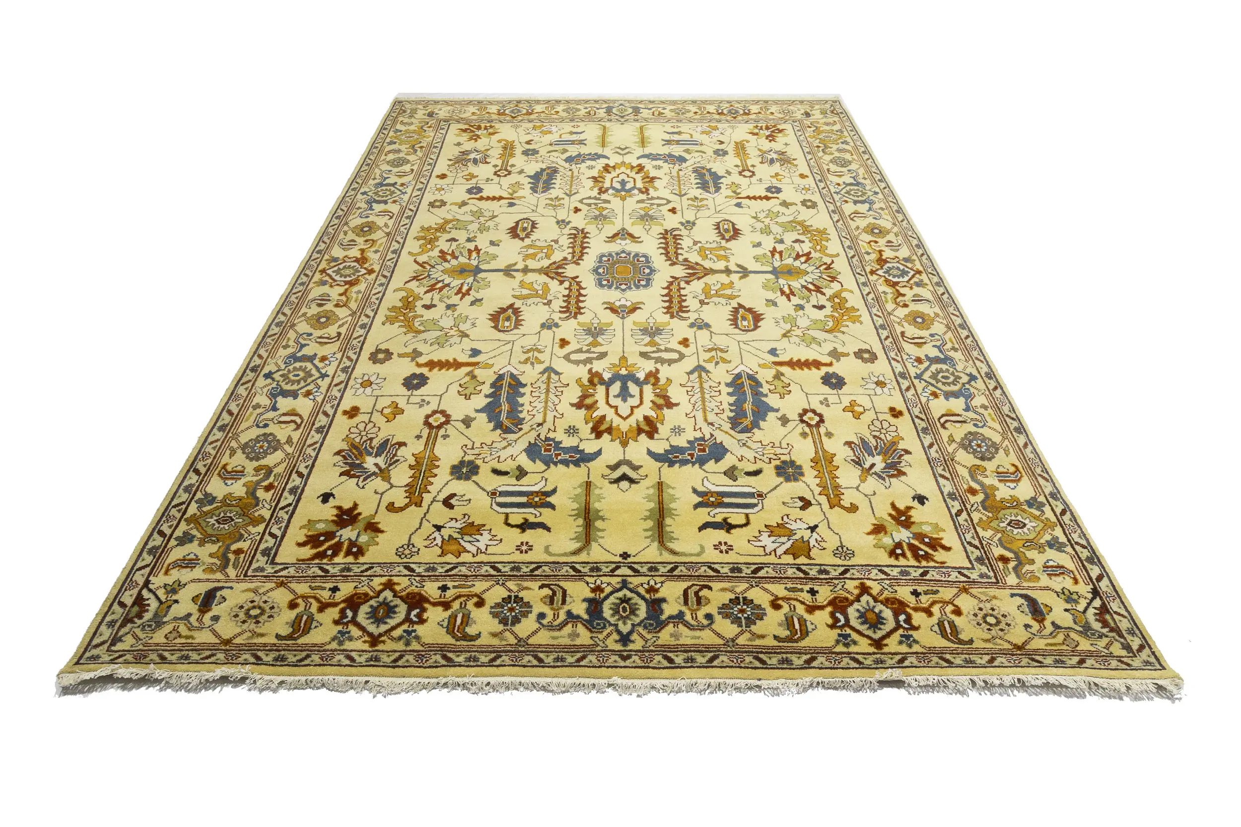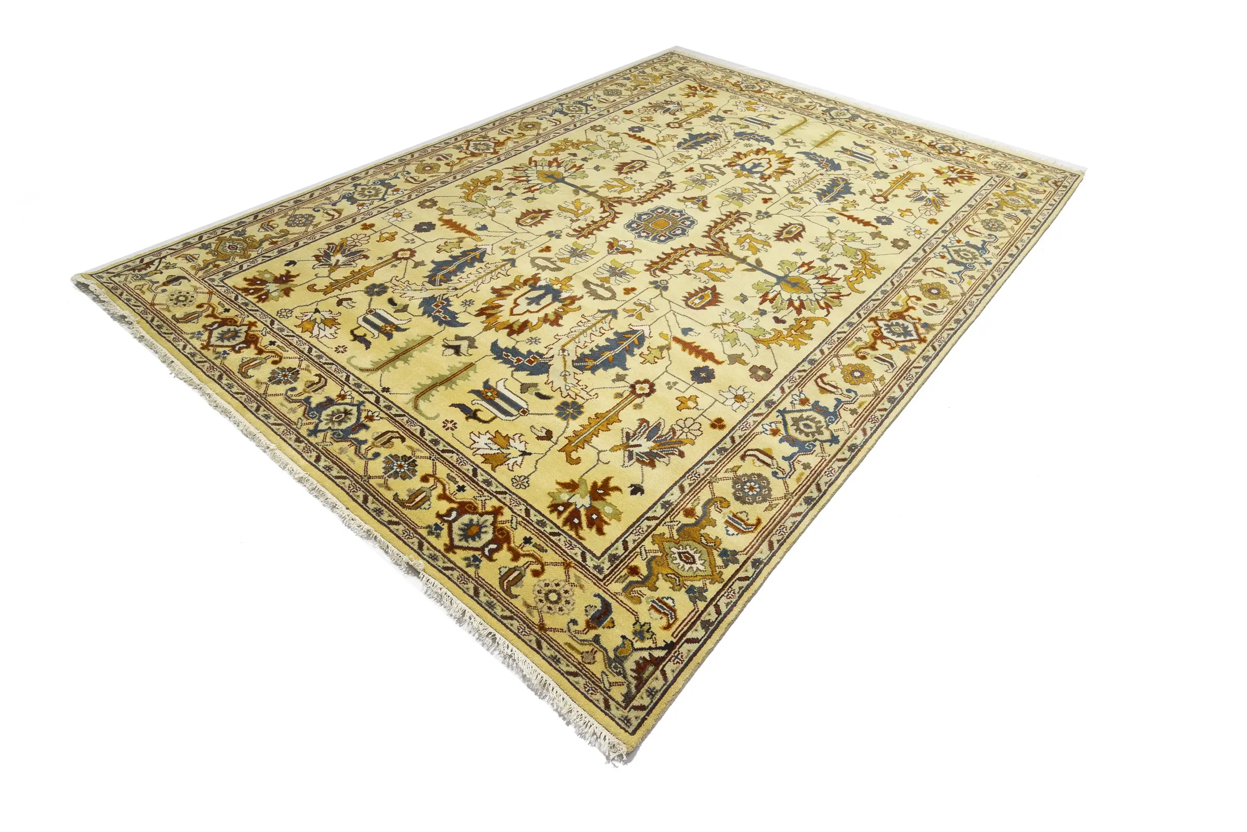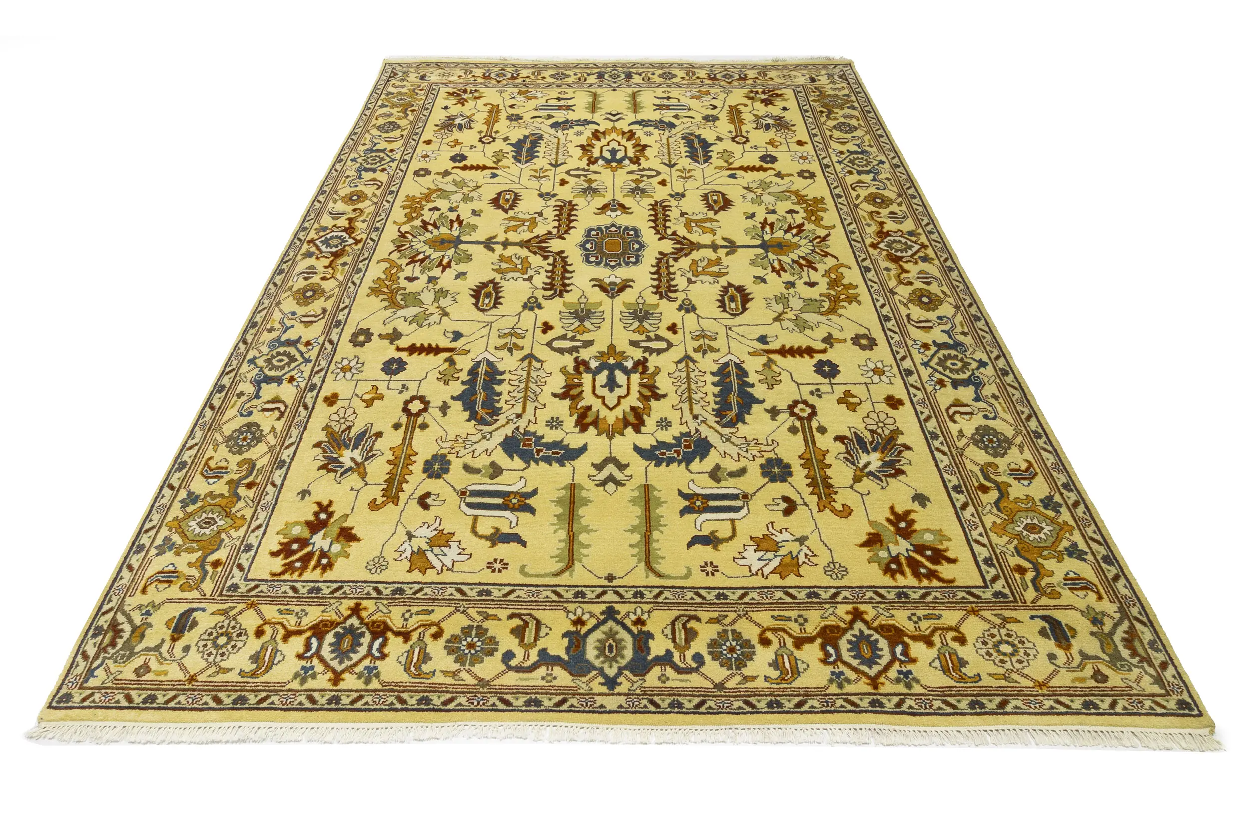 Handmade 10X14 Yellowish Cream oriental rug made with vegetable dyes (fine wool pile and cotton foundation), superior knot count, and appealing ancient designs. This Oriental rug never will go out of style and would be among your most valuable treasures.