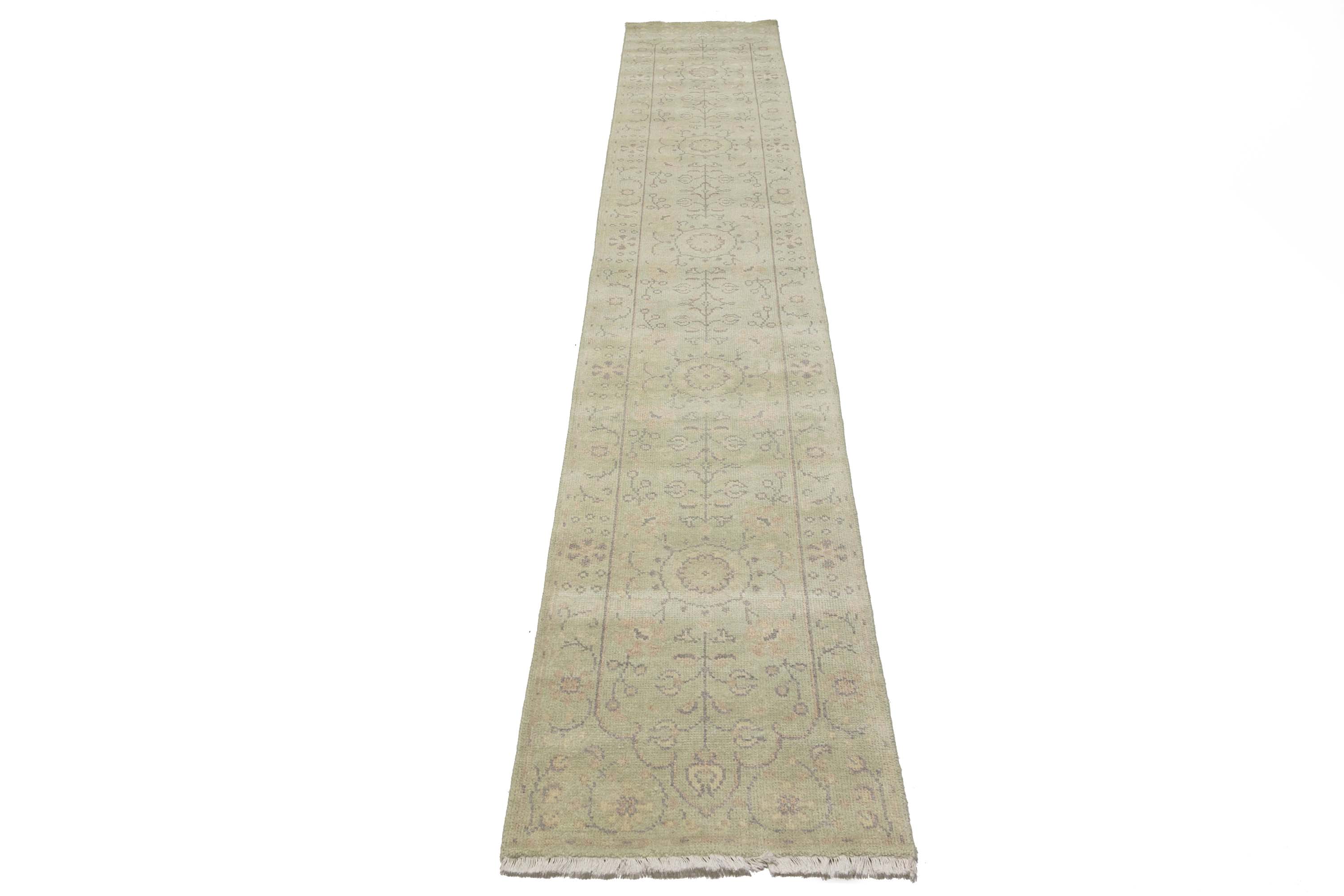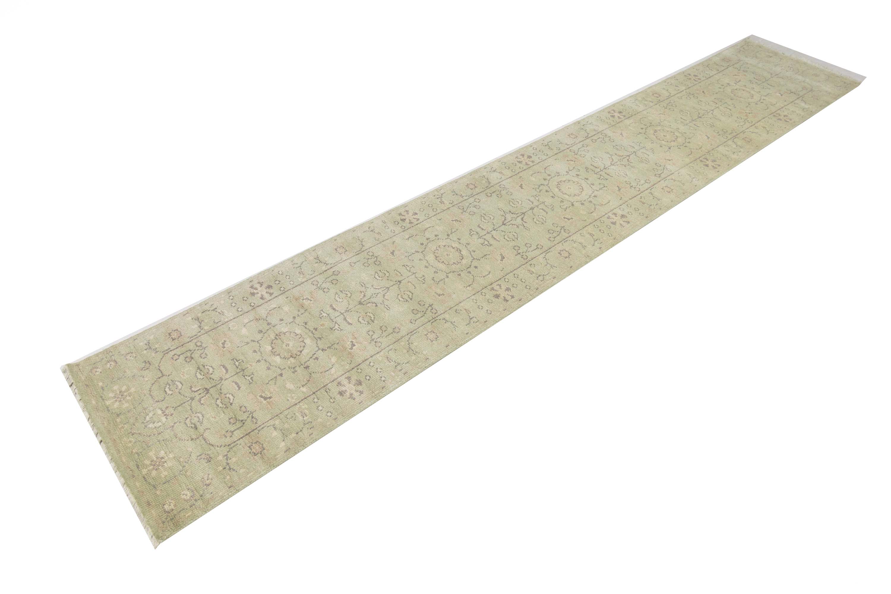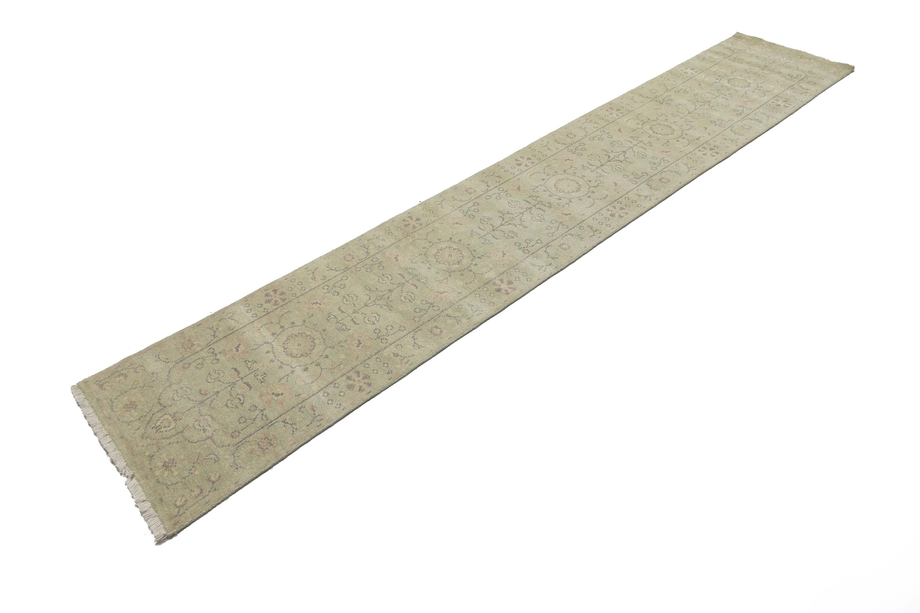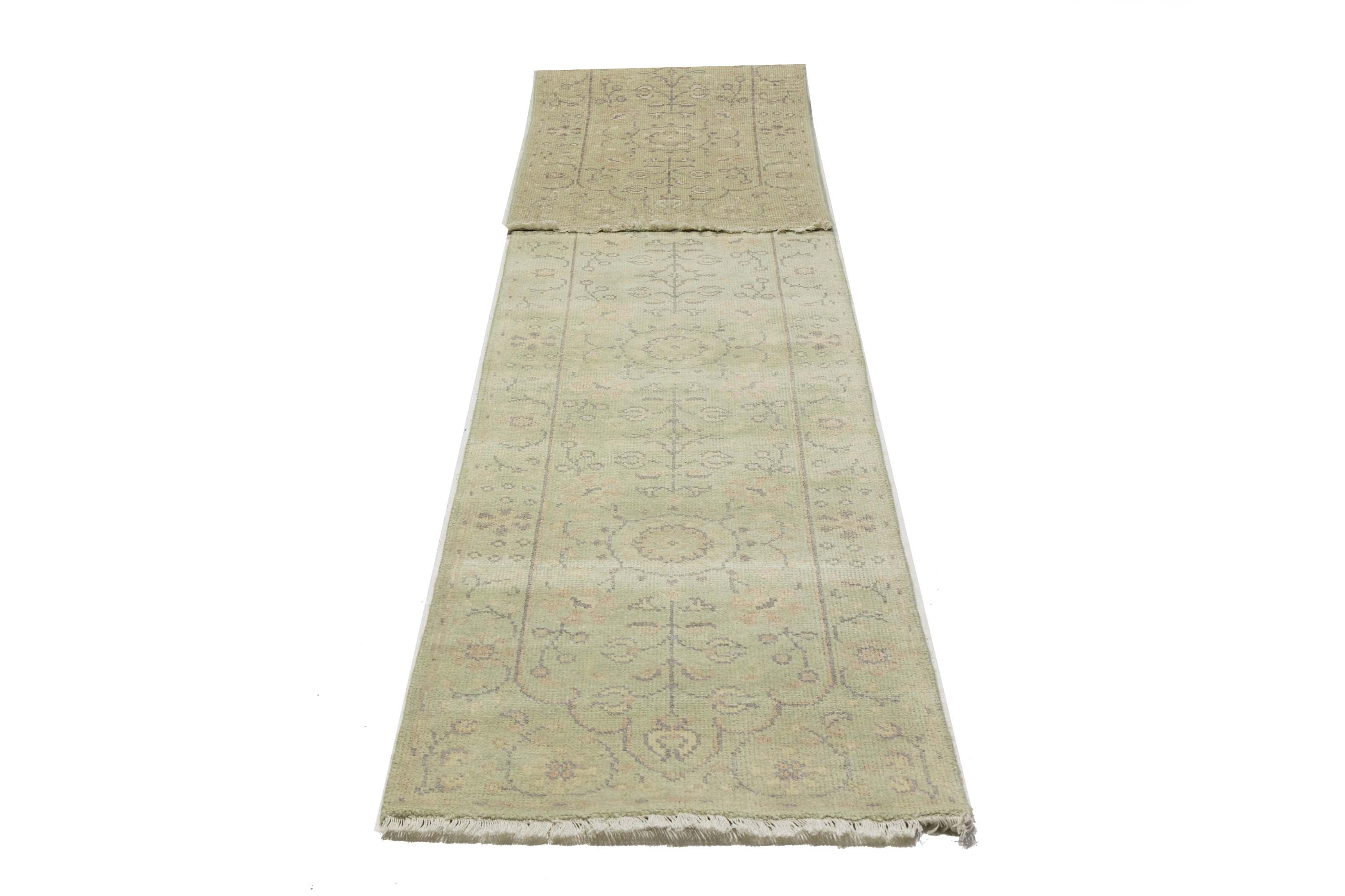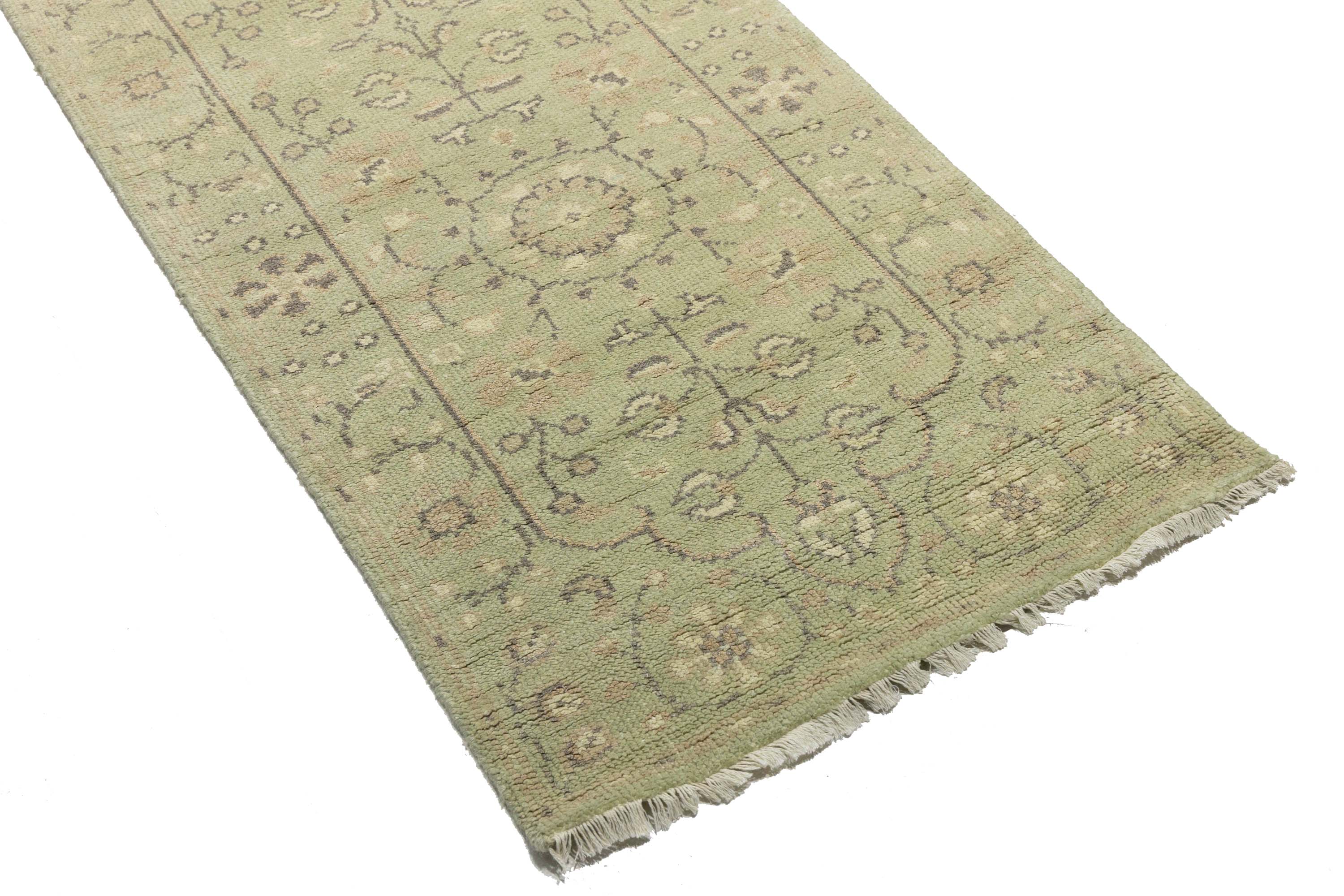 This original 3X14 light green new Oriental runner was made by the hands of talented weavers influenced by a variety of gorgeous symmetrical artistic designs, to recreate the aged look of the unique piece with a richness of color and very balanced background field. What set this vintage style Oriental area runner from the others are the material and dye used (wool pile and cotton foundation), knot count, antique designs, fantastic grades, and its regional historical connection: it has deep roots, from the story of the people who produced it to the meaning of the symbols and colors displayed across its canvas that have been praised for centuries. This Indian home décor carpet will be completely cozy and inviting that never will go out of style! Also, this Oriental rug would be among your most valuable treasures, it is a great investment that accrues value over time, and it will last a lifetime because was woven with high-quality, all-natural wool. Eco-friendly, opulent yet affordable; this runner will give you an extra pop of character to help define your home environment with sophistication and warmth that will capture the eyes and attention of your audience (homeowners, designers, decorators, family and friends). OT-11878