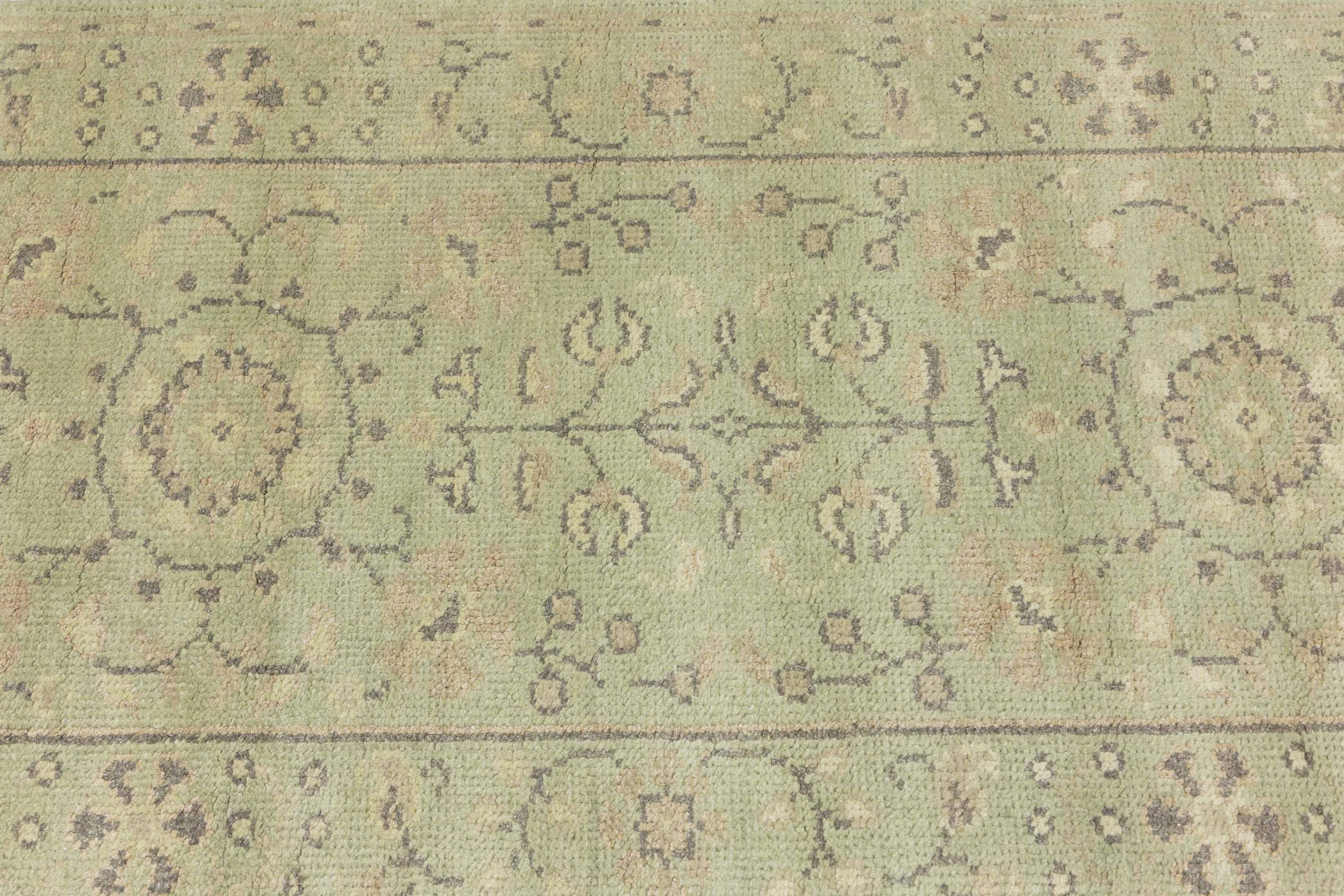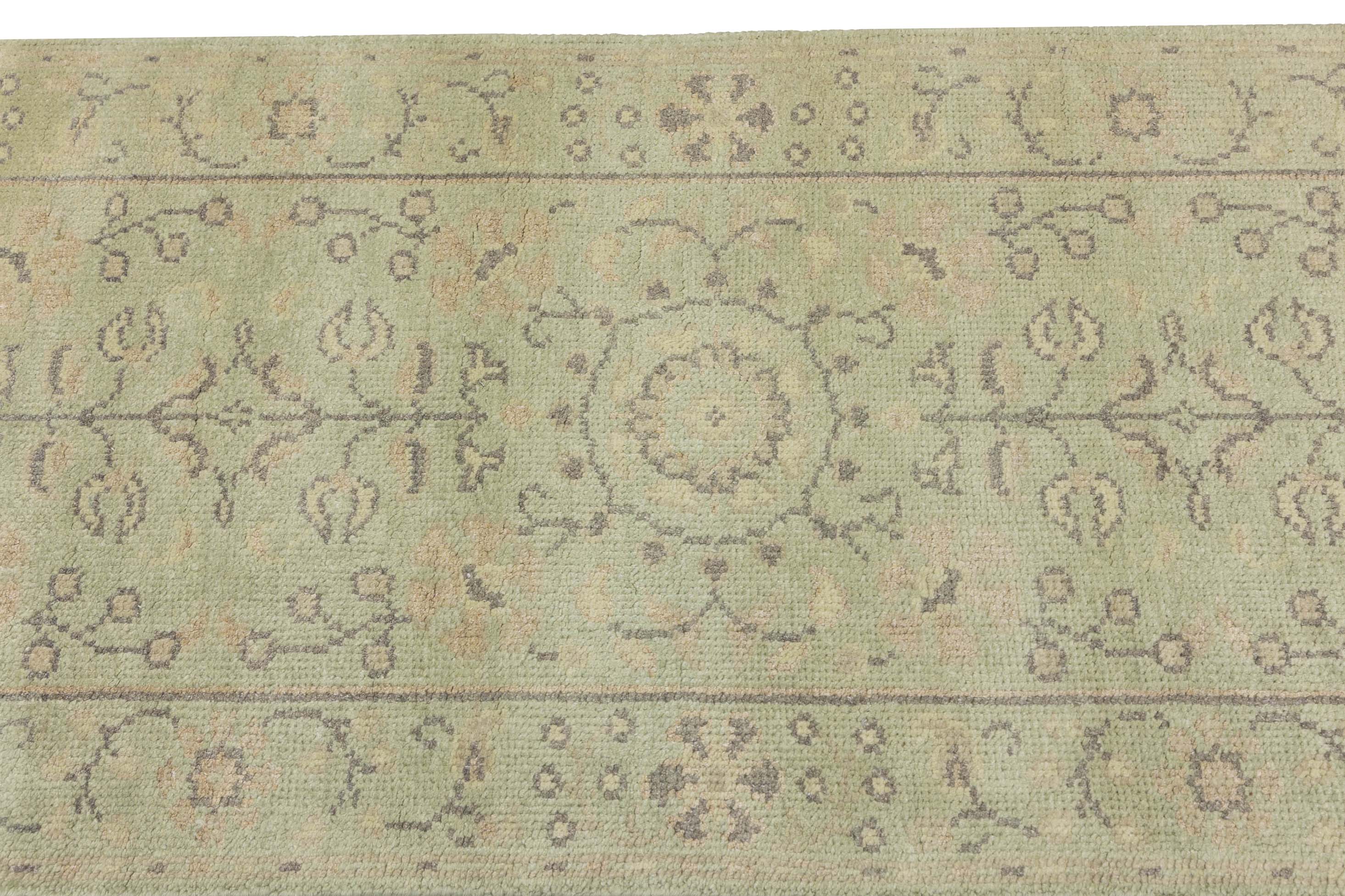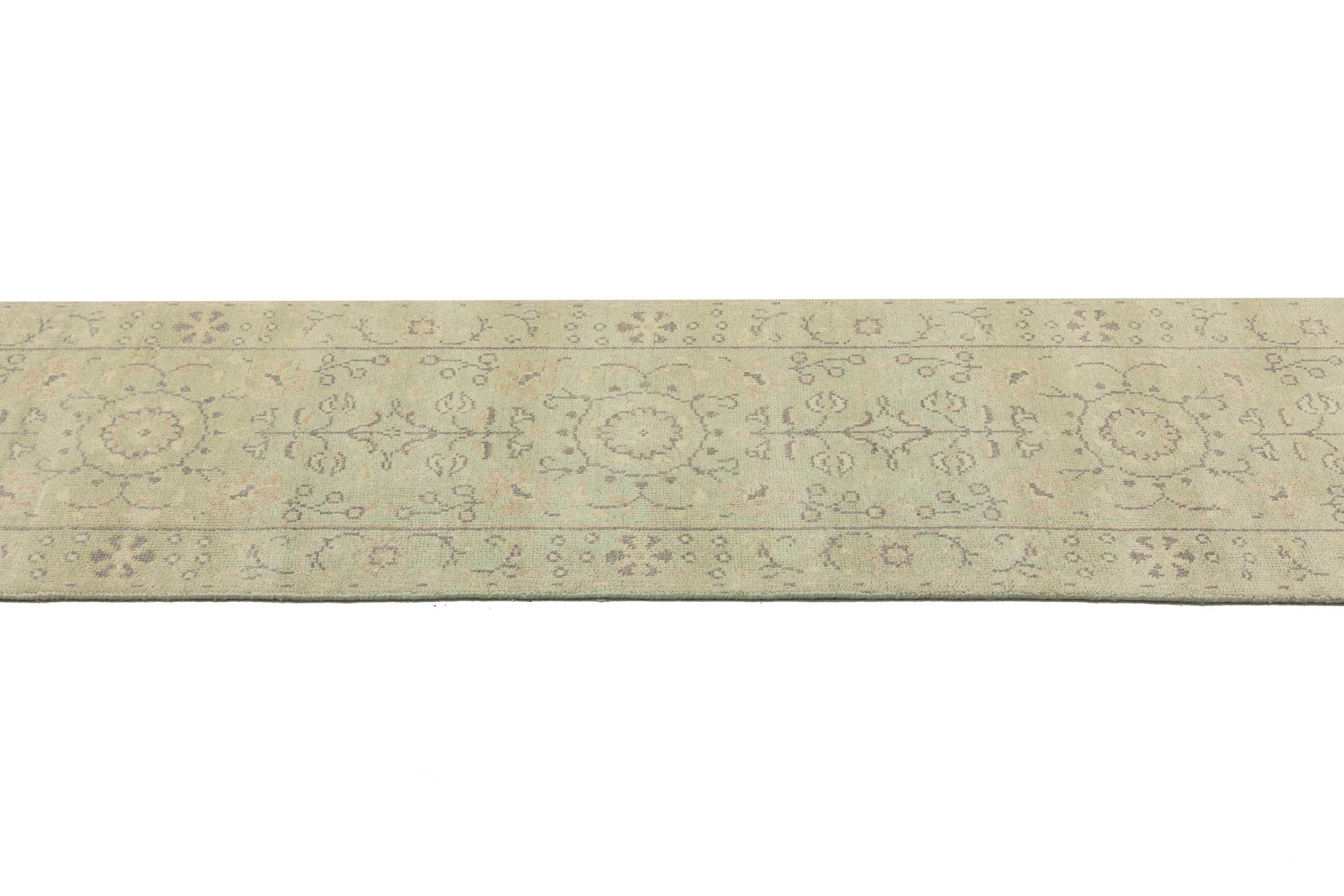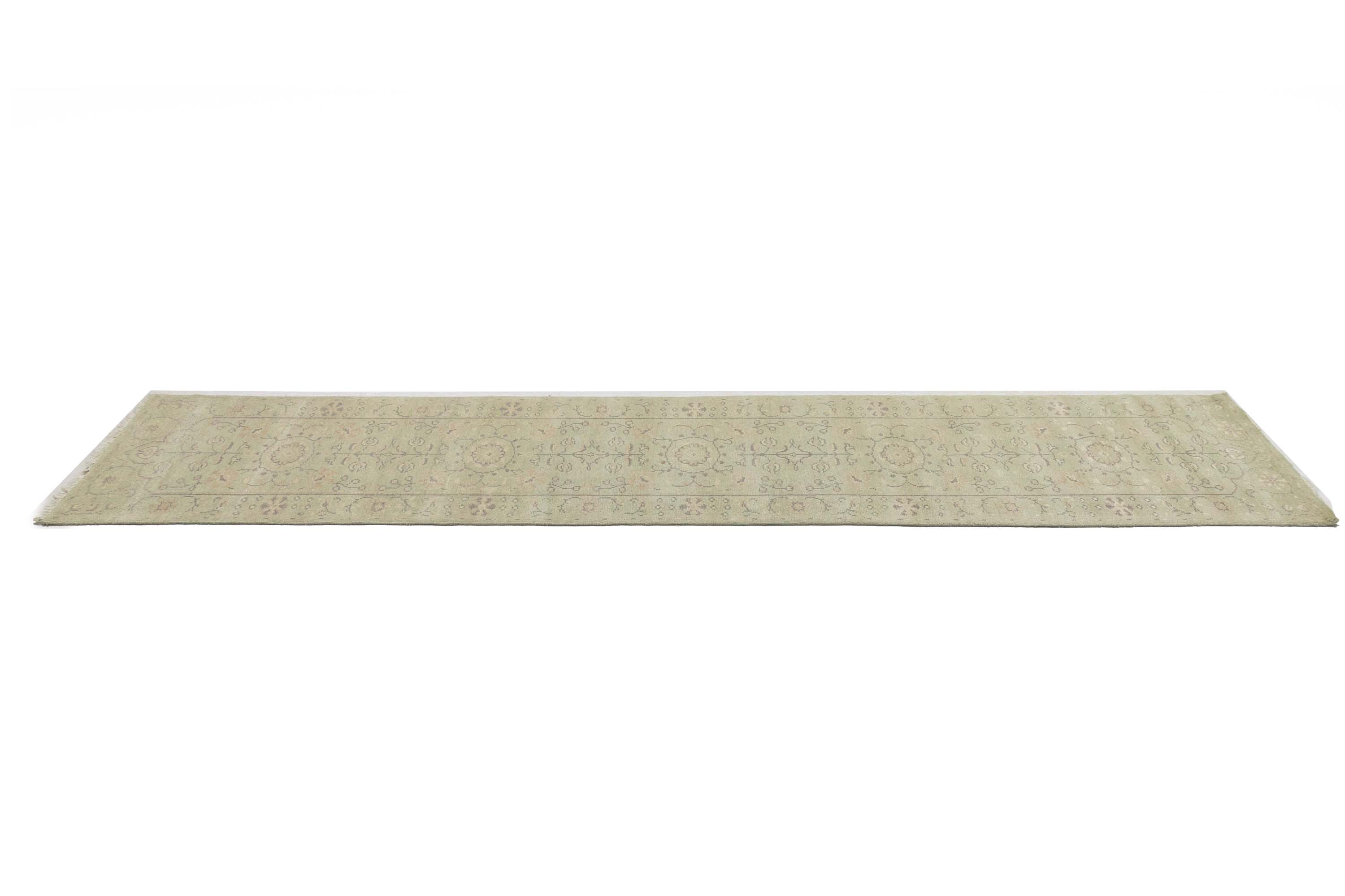 This original 3X14 light green new Oriental runner was made by the hands of talented weavers influenced by a variety of gorgeous symmetrical artistic designs, to recreate the aged look of the unique piece with a richness of color and very balanced background field. What set this vintage style Oriental area runner from the others are the material and dye used (wool pile and cotton foundation), knot count, antique designs, fantastic grades, and its regional historical connection: it has deep roots, from the story of the people who produced it to the meaning of the symbols and colors displayed across its canvas that have been praised for centuries. This Indian home décor carpet will be completely cozy and inviting that never will go out of style! Also, this Oriental rug would be among your most valuable treasures, it is a great investment that accrues value over time, and it will last a lifetime because was woven with high-quality, all-natural wool. Eco-friendly, opulent yet affordable; this runner will give you an extra pop of character to help define your home environment with sophistication and warmth that will capture the eyes and attention of your audience (homeowners, designers, decorators, family and friends). OT-11878