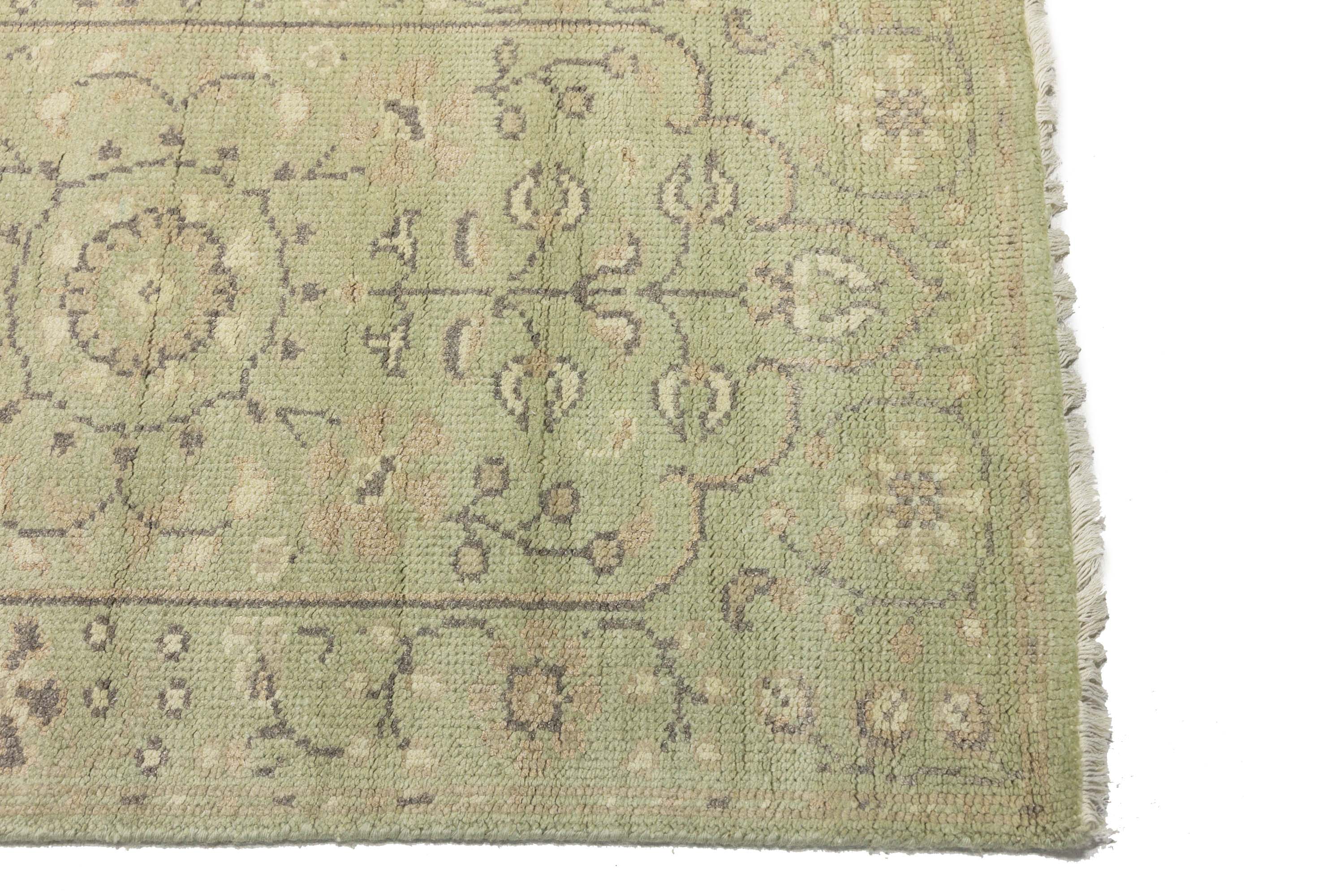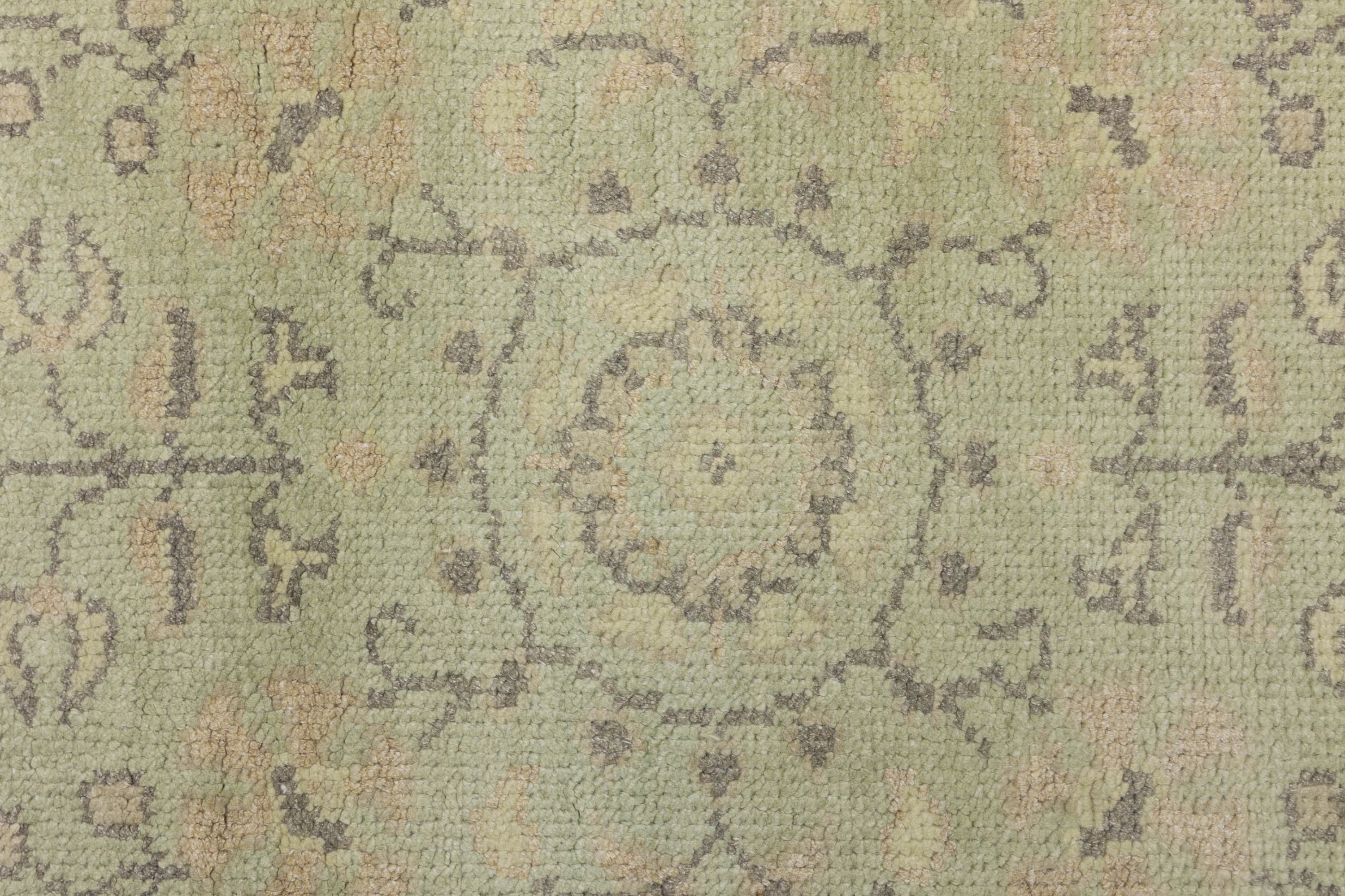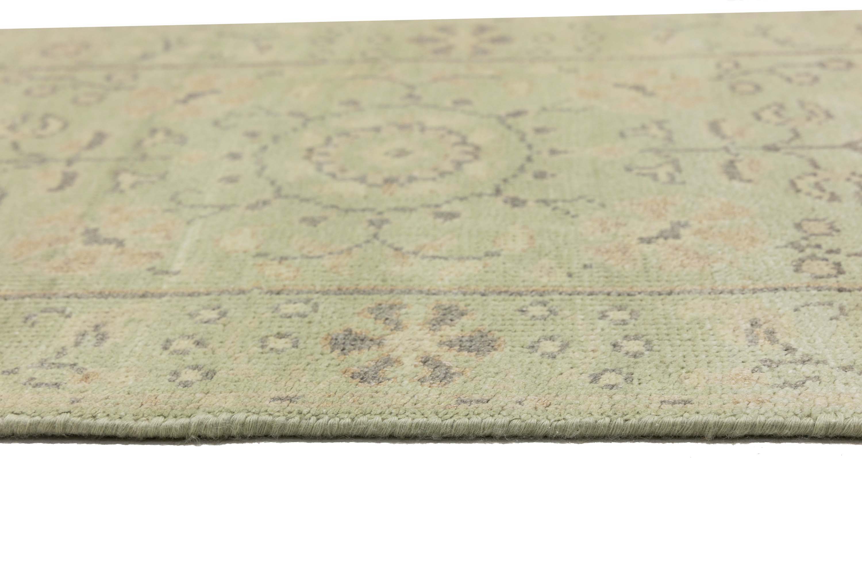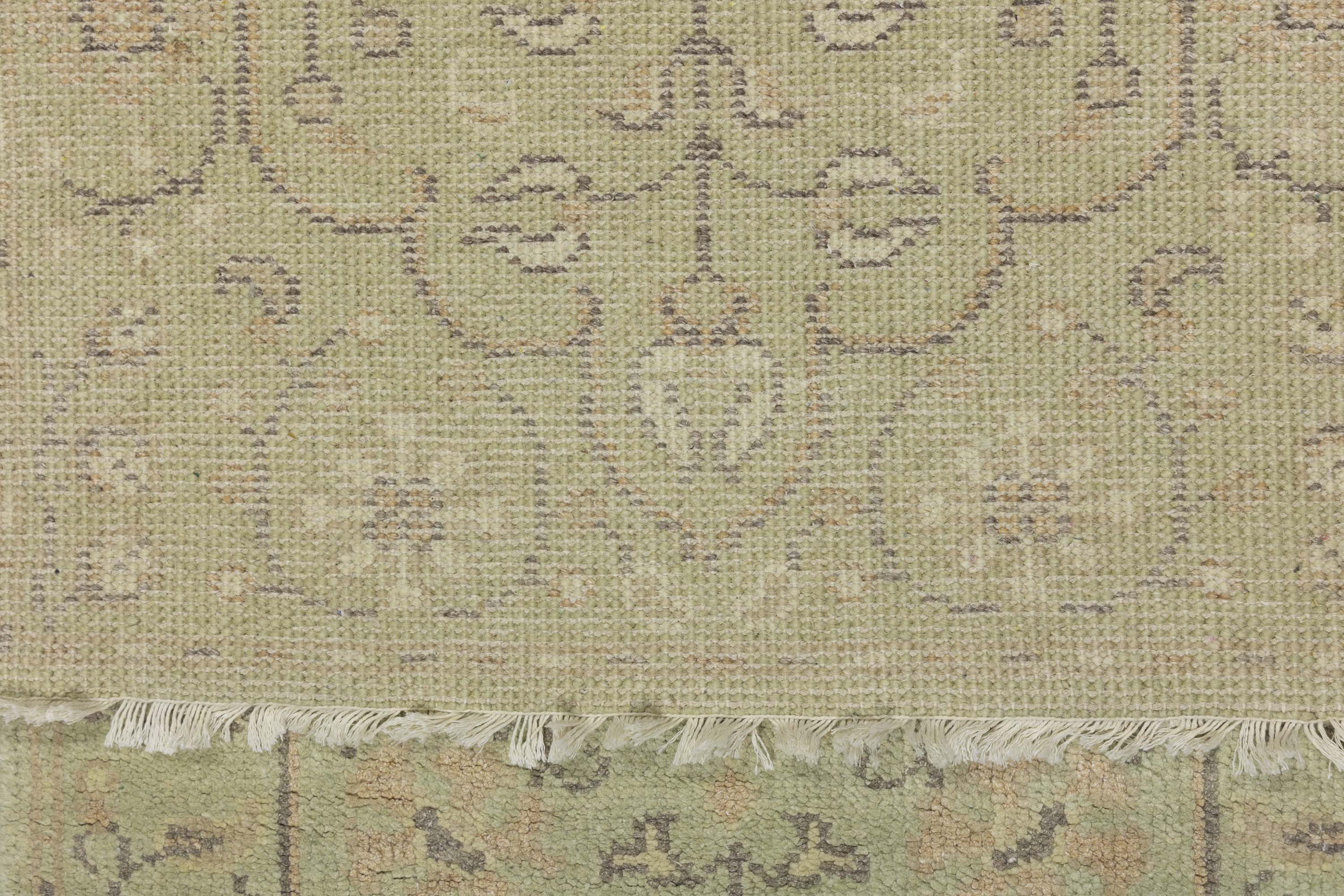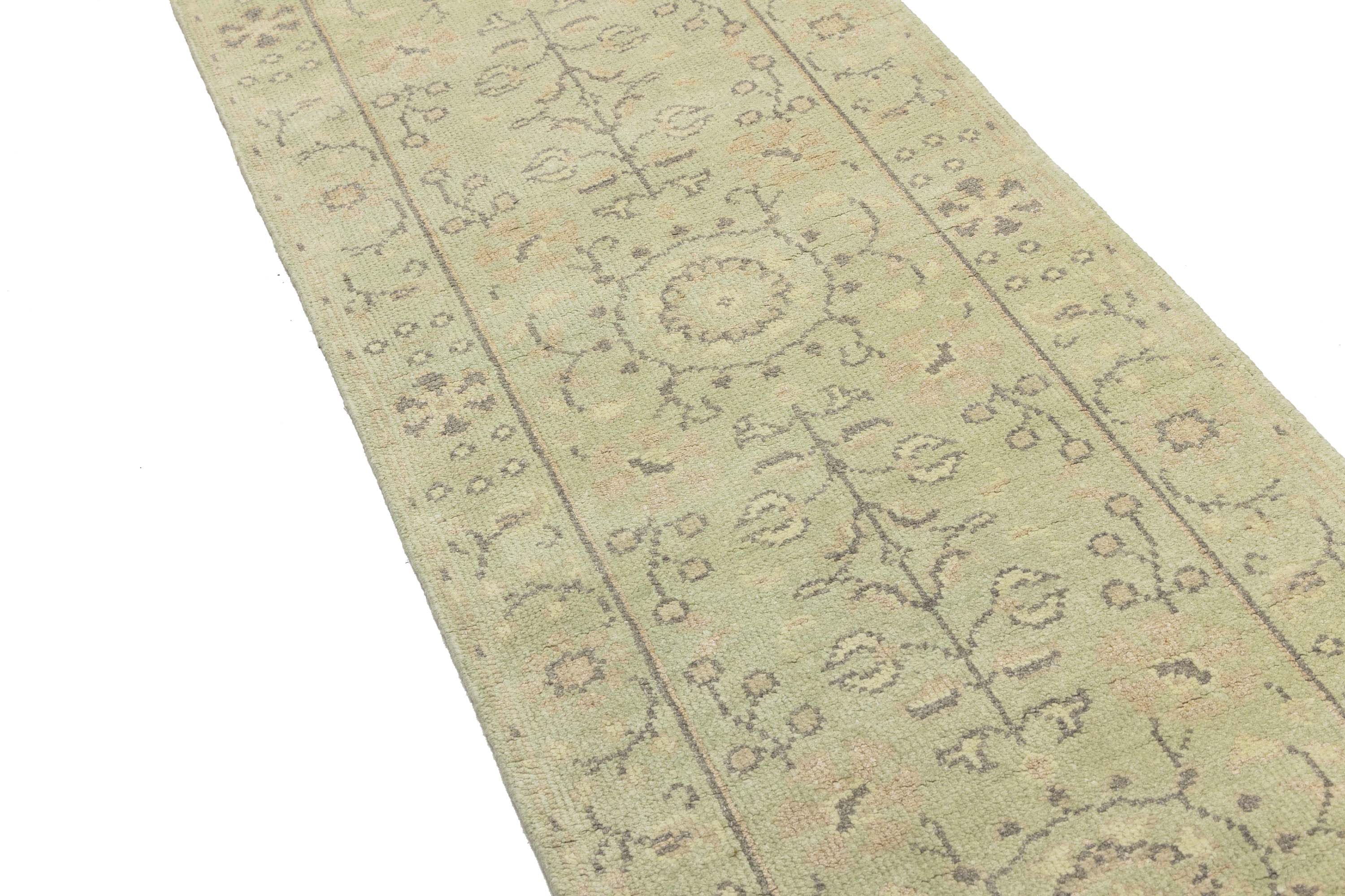 This original 3X14 light green new Oriental runner was made by the hands of talented weavers influenced by a variety of gorgeous symmetrical artistic designs, to recreate the aged look of the unique piece with a richness of color and very balanced background field. What set this vintage style Oriental area runner from the others are the material and dye used (wool pile and cotton foundation), knot count, antique designs, fantastic grades, and its regional historical connection: it has deep roots, from the story of the people who produced it to the meaning of the symbols and colors displayed across its canvas that have been praised for centuries. This Indian home décor carpet will be completely cozy and inviting that never will go out of style! Also, this Oriental rug would be among your most valuable treasures, it is a great investment that accrues value over time, and it will last a lifetime because was woven with high-quality, all-natural wool. Eco-friendly, opulent yet affordable; this runner will give you an extra pop of character to help define your home environment with sophistication and warmth that will capture the eyes and attention of your audience (homeowners, designers, decorators, family and friends). OT-11878