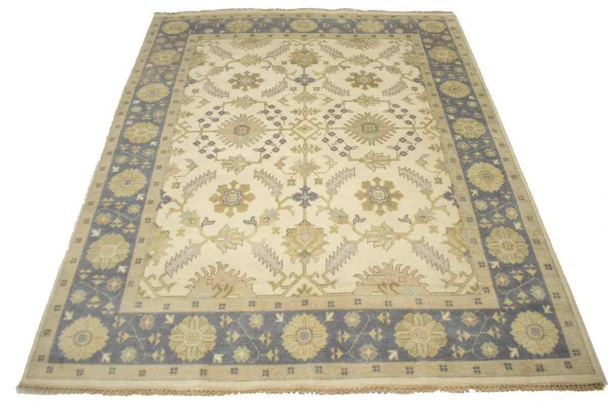 This authentic 8X10 cream new Oriental rug was masterly knotted by the hands of weavers inspired by a variety of wonderful artistic designs, to recreate the aged look of the original piece with a richness of color and intricate patterned background field. What set this vintage style Oriental area rug from the others are the material and dye used (wool pile and cotton foundation), knot count, antique designs, fantastic grades, and its regional historical connection: it has deep roots, from the story of the people who produced it to the meaning of the symbols and colors displayed across its canvas that have been praised for centuries. This Indian home décor carpet will be completely cozy and inviting that never will go out of style! Also, this Oriental rug would be among your most valuable treasures, it is a great investment that accrues value over time, and it will last for generations because was woven with high-quality, all-natural wool. Environmentally friendly, opulent yet affordable; this rug will give you a thorough amount of character to help define your living space with luxury and warmth that will capture the eyes and attention of your audience (homeowners, designers, decorators, family and friends). OT-4253
