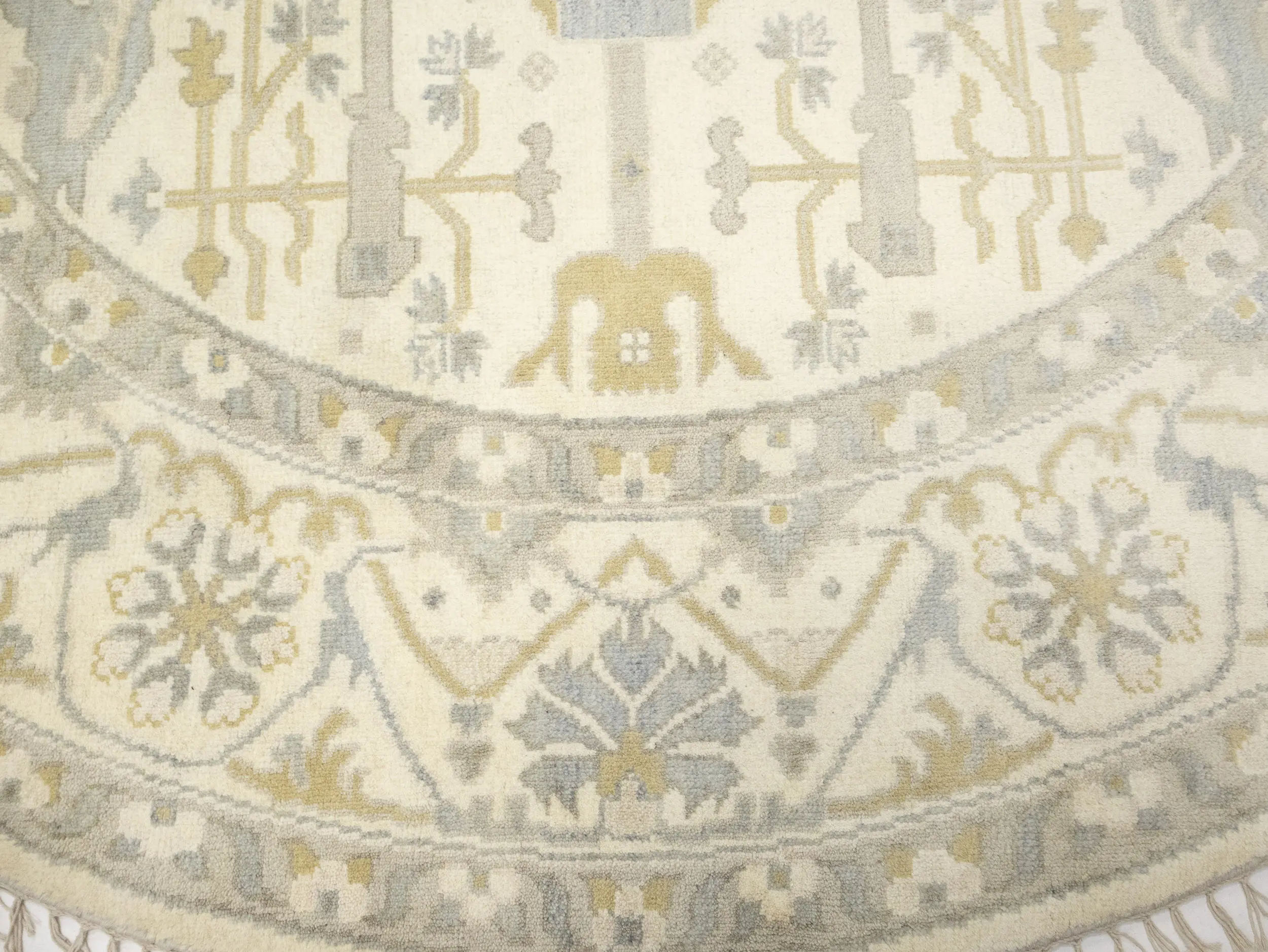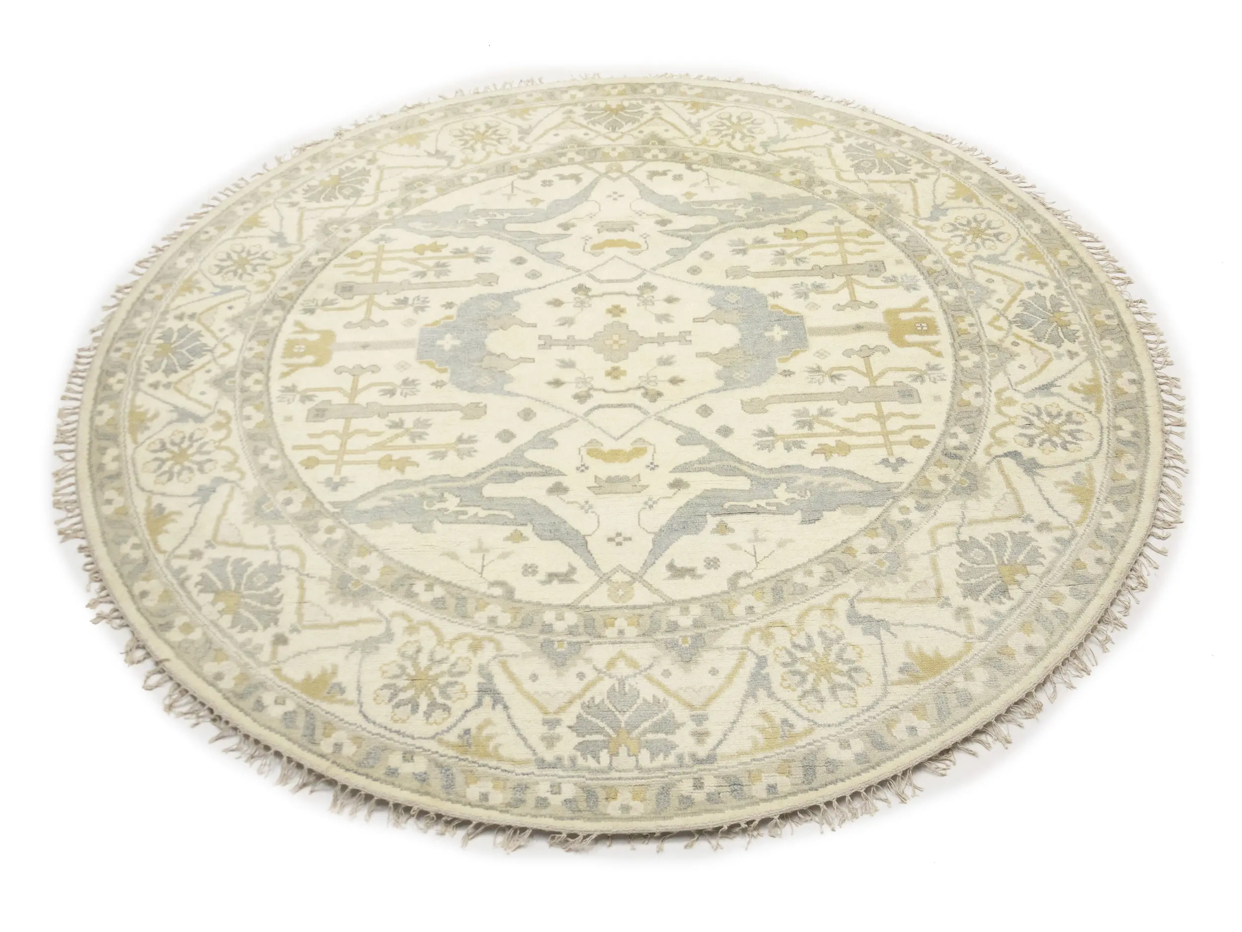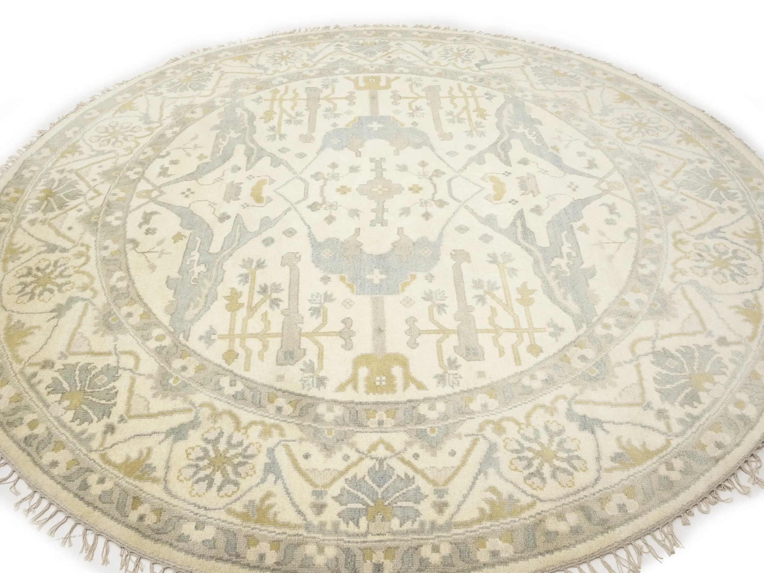 Hand Knotted 9X9 cream oriental Round rug made with vegetable dyes (fine wool pile and cotton foundation), superior knot count, and alluring ancient designs. This Oriental rug never will go out of style and would be among your most valuable treasures.