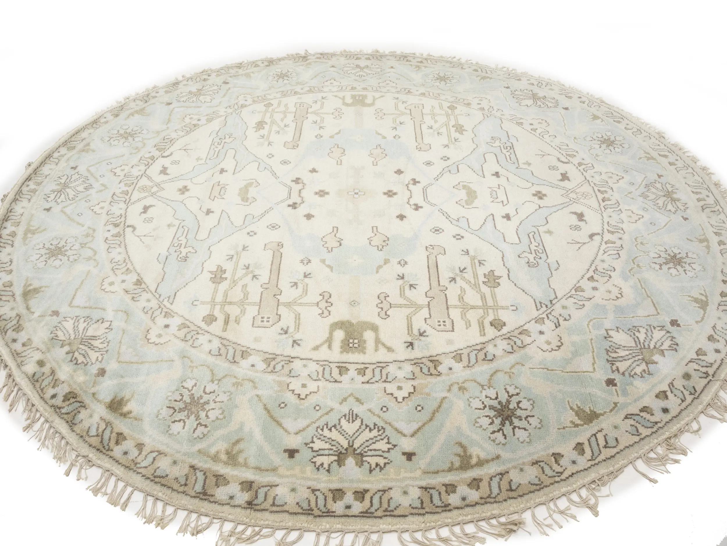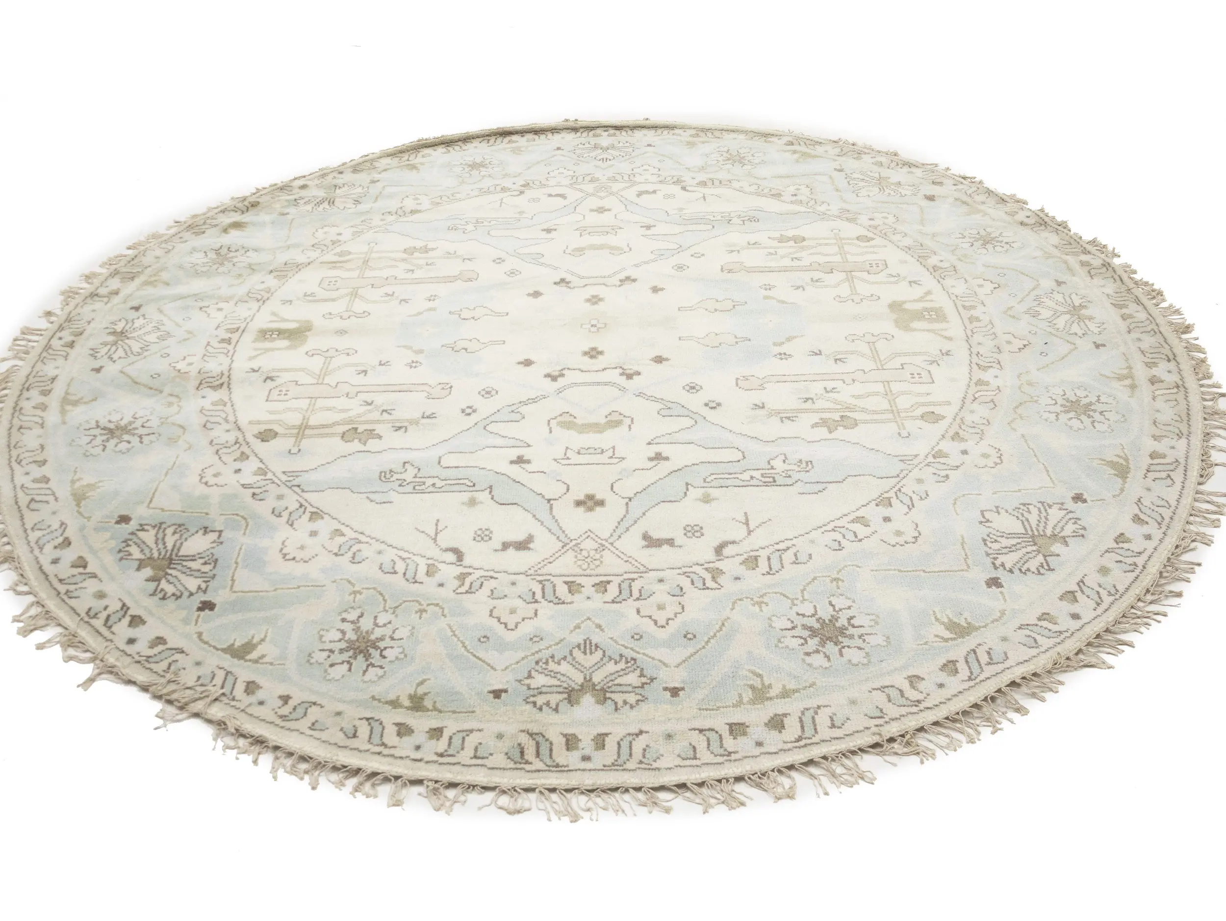 Hand Knotted 9X9 cream oriental Round rug made with vegetable dyes (fine wool pile and cotton foundation), superior knot count, and alluring ancient designs. This Oriental rug never will go out of style and would be among your most valuable treasures.