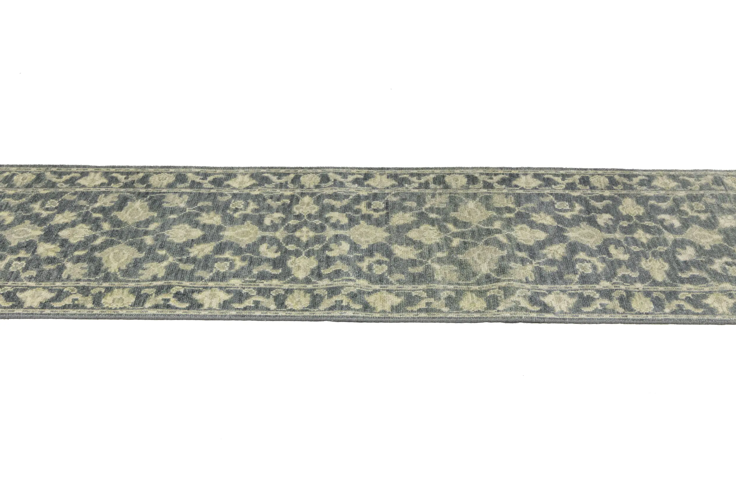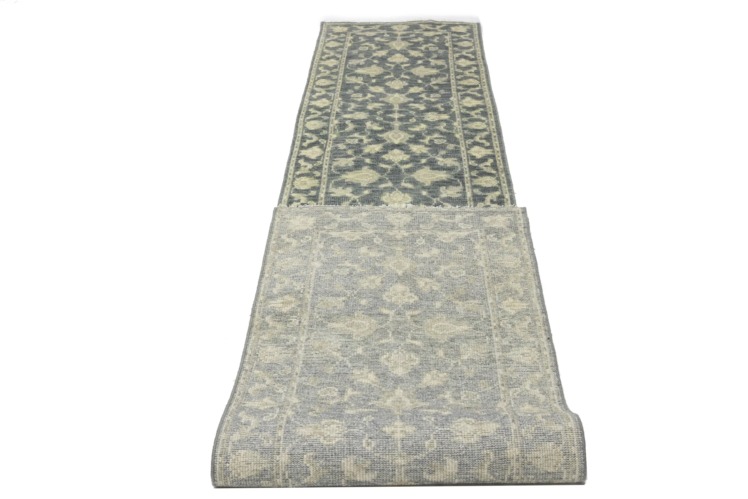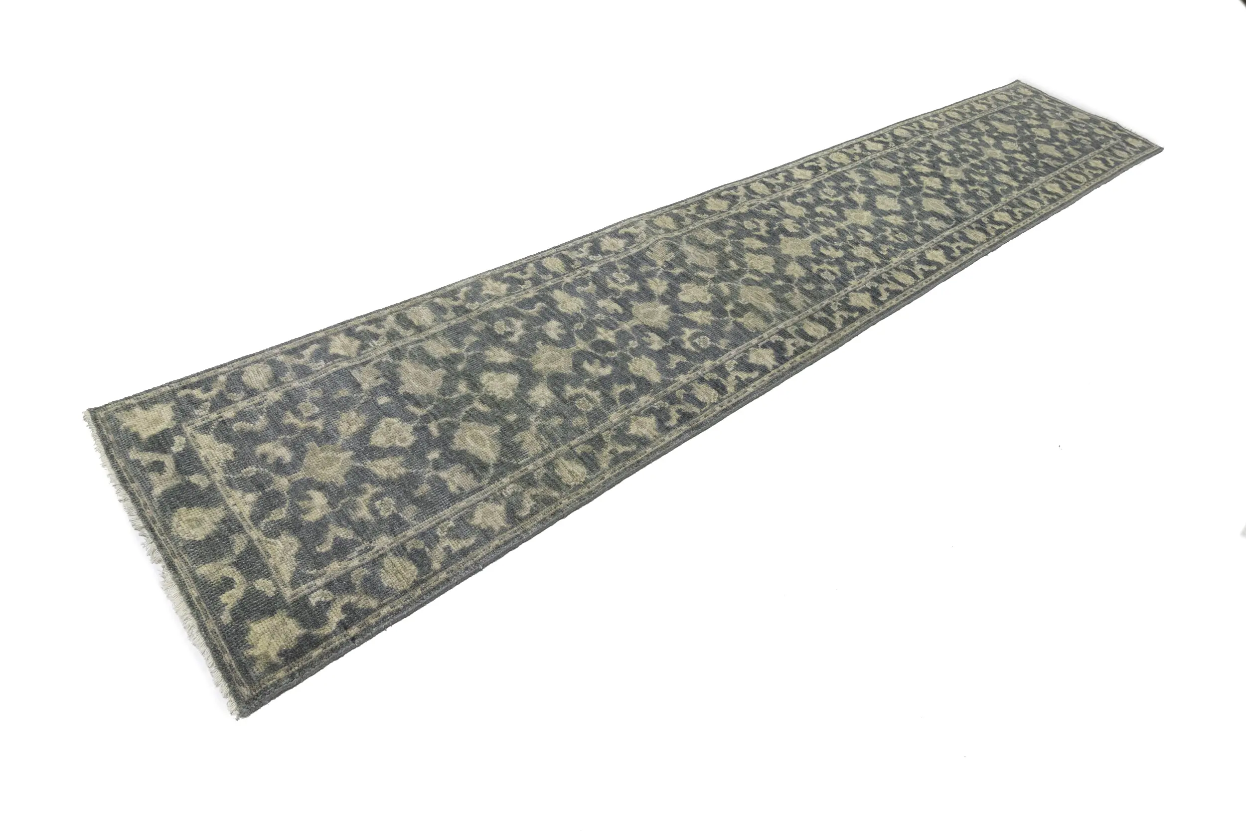 Handmade 2'7X14 gray oriental runner made with vegetable dyes (fine wool pile and cotton foundation), superior knot count, and appealing ancient designs. This Oriental runner never will go out of style and would be among your most valuable treasures.
