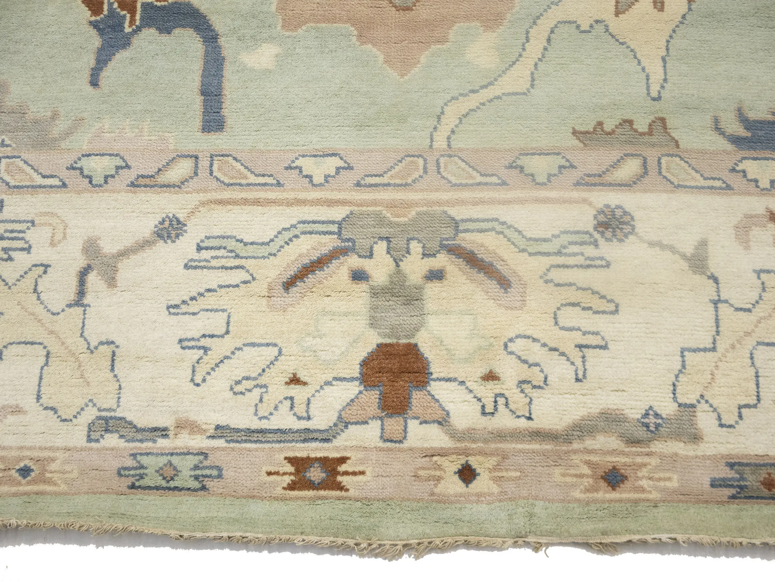 This authentic 9X12 light green new Oriental rug was crafted by the hands of skilled weavers enthused by a variety of lovely artistic designs, to recreate the aged look of the unique piece with a richness of color and beautifully elaborated background field. What set this vintage style Oriental area rug from the others are the material and dye used (wool pile and cotton foundation), knot count, ancient designs, fantastic grades, and its regional historical connection: it has deep roots, from the story of the people who produced it to the meaning of the symbols and colors displayed across its canvas that have been praised for centuries. This Indian home décor carpet will be completely cozy and inviting that never will go out of style! Also, this Oriental rug would be among your most valuable treasures, it is a great investment that increase in value over time, and it will last for generations because was woven with high-quality, all-natural wool. Environmentally friendly, opulent yet affordable; this rug will give you a thorough amount of character to help define your living space with sophistication and warmth that will capture the eyes and attention of your audience (homeowners, designers, decorators, family and friends). OT-7996