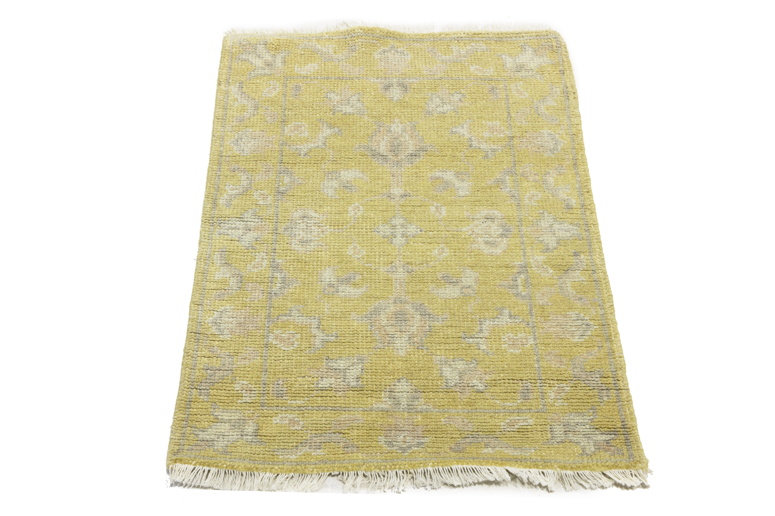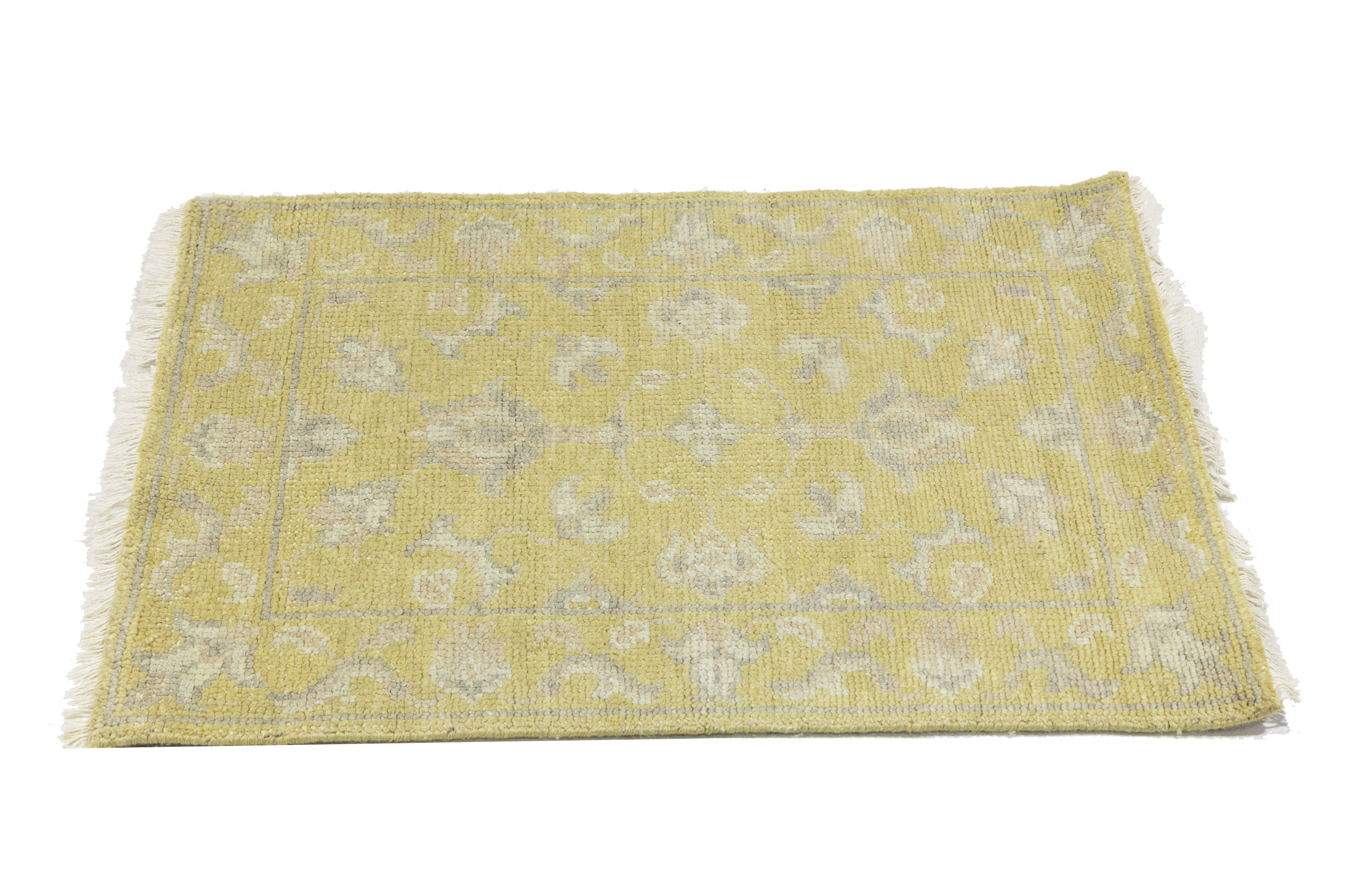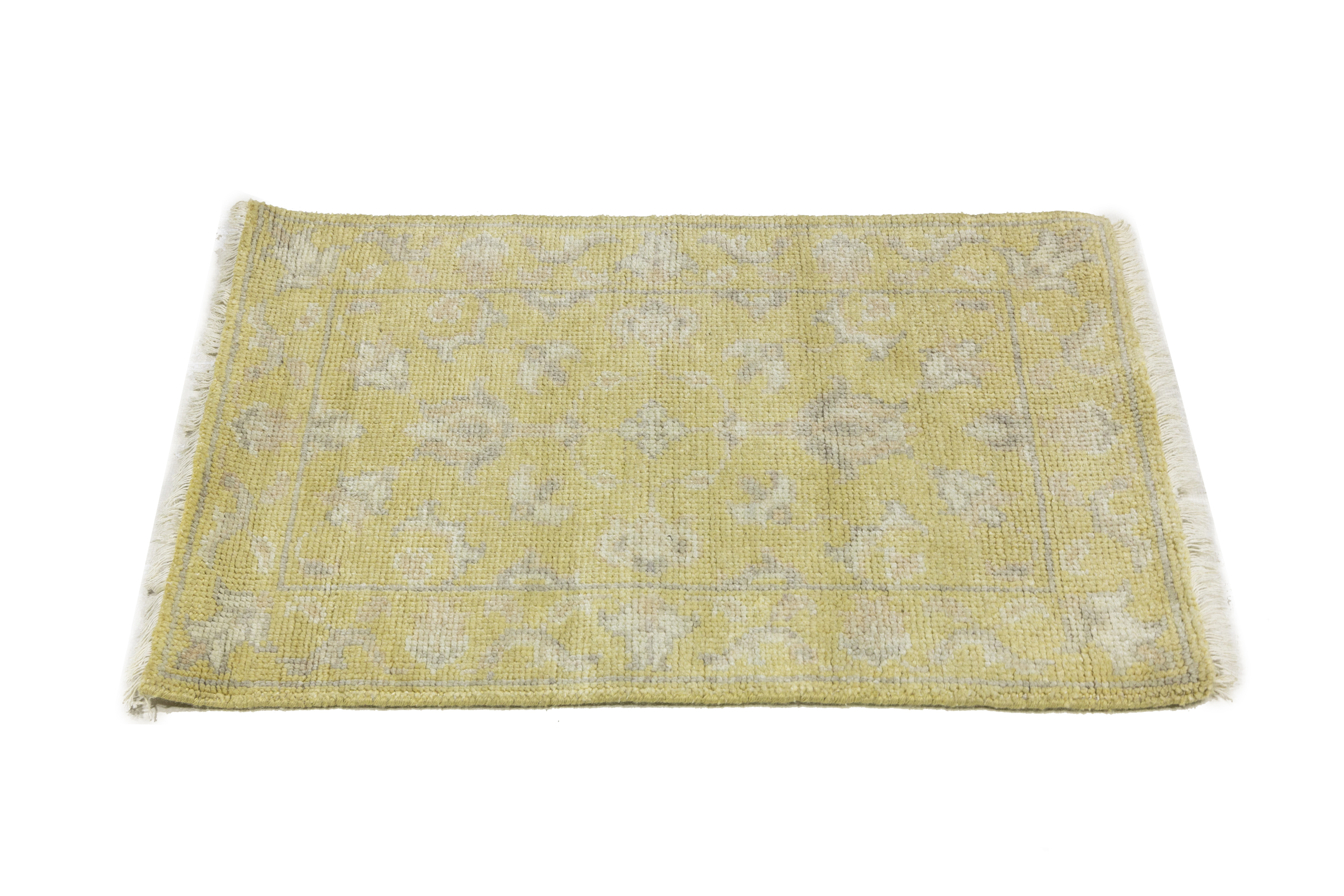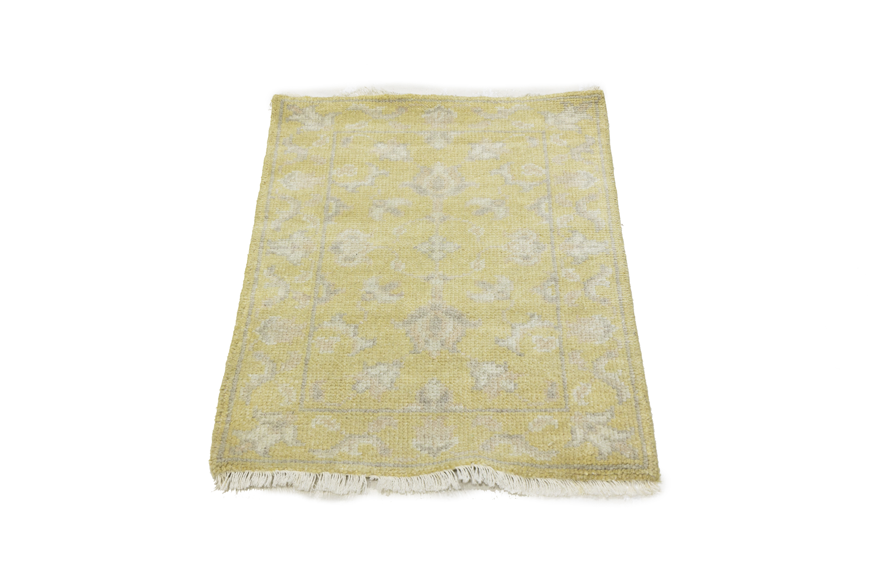 This genuine 2X3 golden yellow new Oriental rug was made by the hands of gifted weavers inspired by a variety of spectacular artistic designs, to recreate the aged look of the original piece with a richness of color and ornately patterned background field. What set this vintage style Oriental area rug from the others are the material and dye used (wool pile and cotton foundation), knot count, ancient designs, fantastic grades, and its regional historical connection: it has deep roots, from the story of the people who produced it to the meaning of the symbols and colors displayed across its canvas that have been praised for centuries. This Indian home décor carpet will be completely cozy and inviting that never will go out of style! Also, this Oriental rug would be among your most valuable treasures, it is a great investment that accrues value over time, and it will last for generations because was woven with high-quality, all-natural wool. Environmentally friendly, opulent yet affordable; this rug will give you a thorough amount of character to help define your living space with elegance and warmth that will capture the eyes and attention of your audience (homeowners, designers, decorators, family and friends). OT-12010