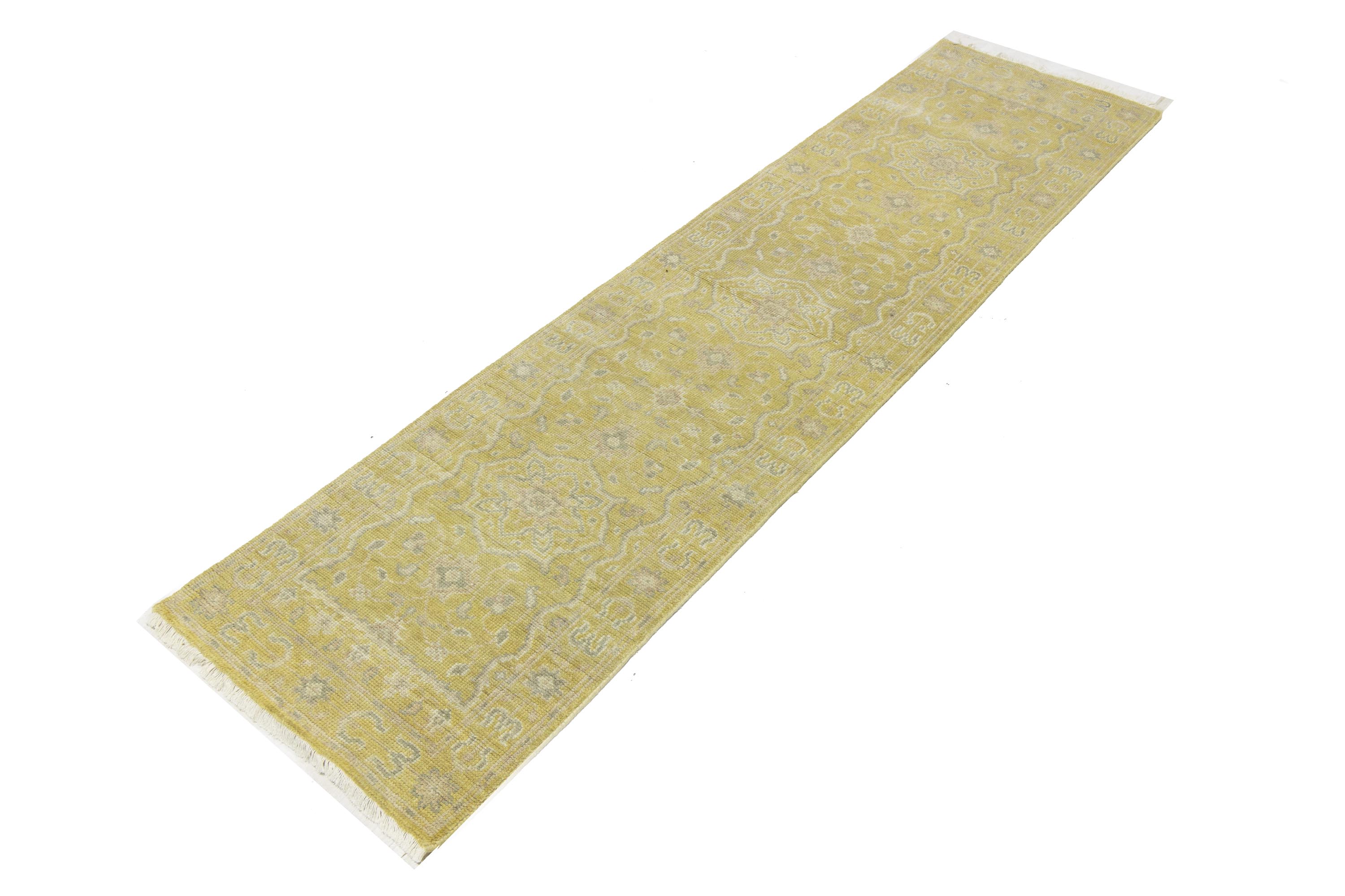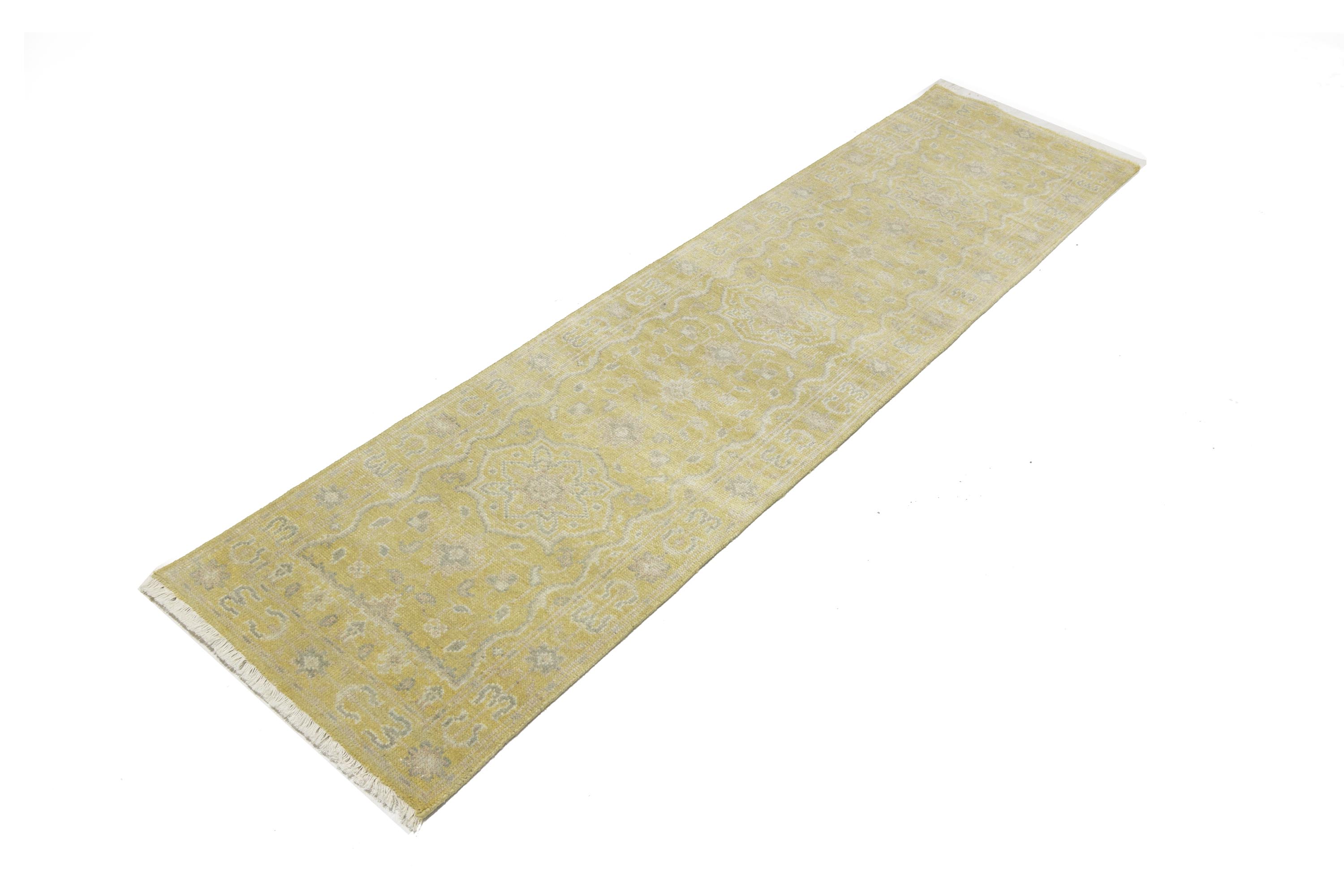 This genuine 3X14 yellow new Oriental runner was made by the hands of gifted weavers inspired by a variety of spectacular artistic designs, to recreate the aged look of the original piece with a richness of color and ornately patterned background field. What set this vintage style Oriental area runner from the others are the material and dye used (wool pile and cotton foundation), knot count, ancient designs, fantastic grades, and its regional historical connection: it has deep roots, from the story of the people who produced it to the meaning of the symbols and colors displayed across its canvas that have been praised for centuries. This Indian home décor carpet will be completely cozy and inviting that never will go out of style! Also, this Oriental runner would be among your most valuable treasures, it is a great investment that accrues value over time, and it will last for generations because was woven with high-quality, all-natural wool. Environmentally friendly, opulent yet affordable; this rug will give you a thorough amount of character to help define your living space with elegance and warmth that will capture the eyes and attention of your audience (homeowners, designers, decorators, family and friends). OT-11842
