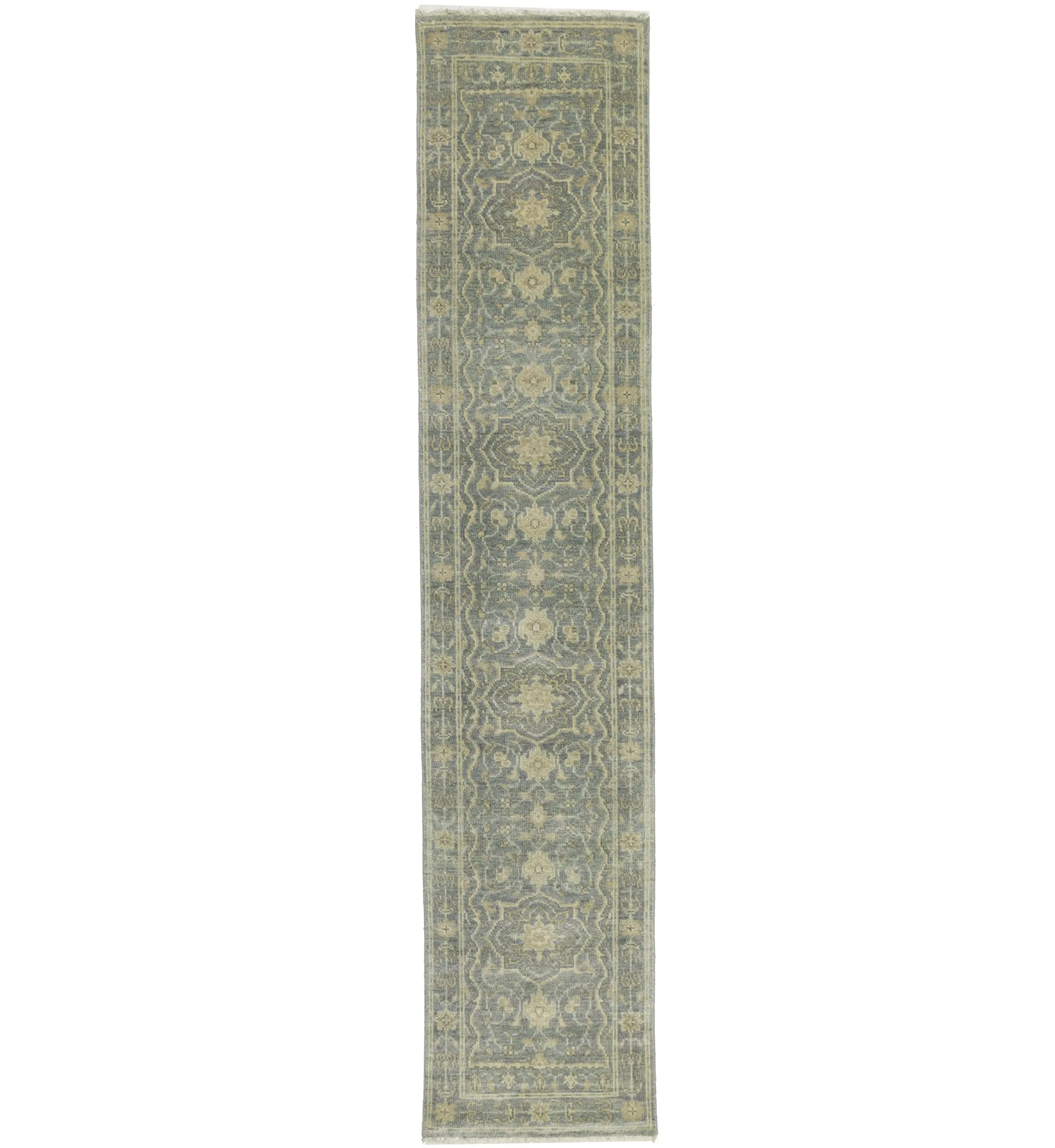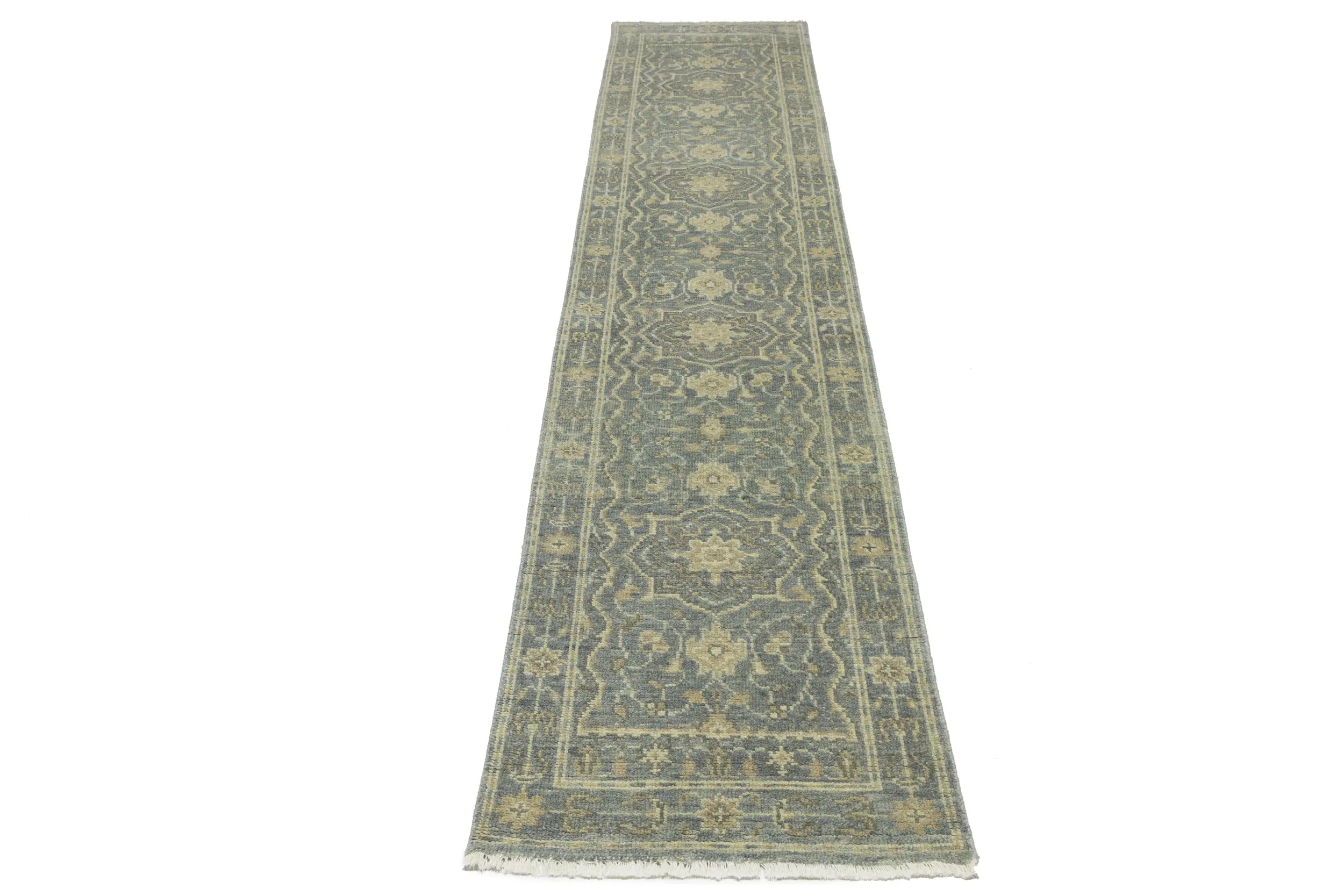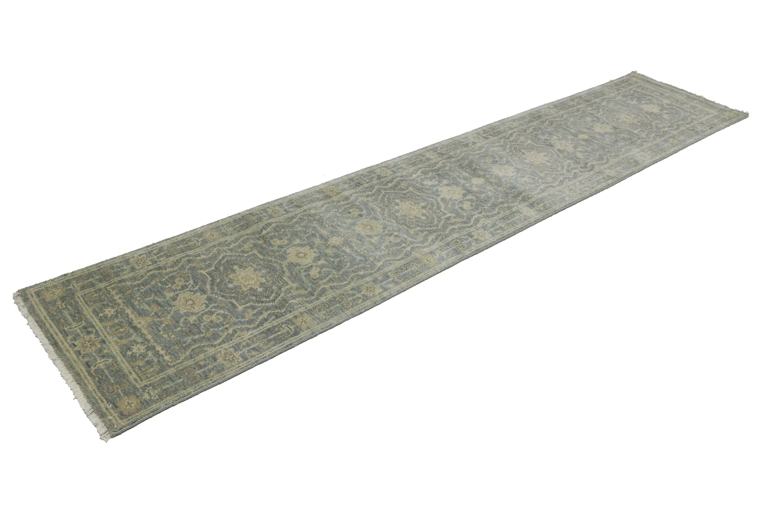 Handmade 2'5X11'9 gray oriental runner made with vegetable dyes (fine wool pile and cotton foundation), superior knot count, and appealing ancient designs. This Oriental runner never will go out of style and would be among your most valuable treasures.