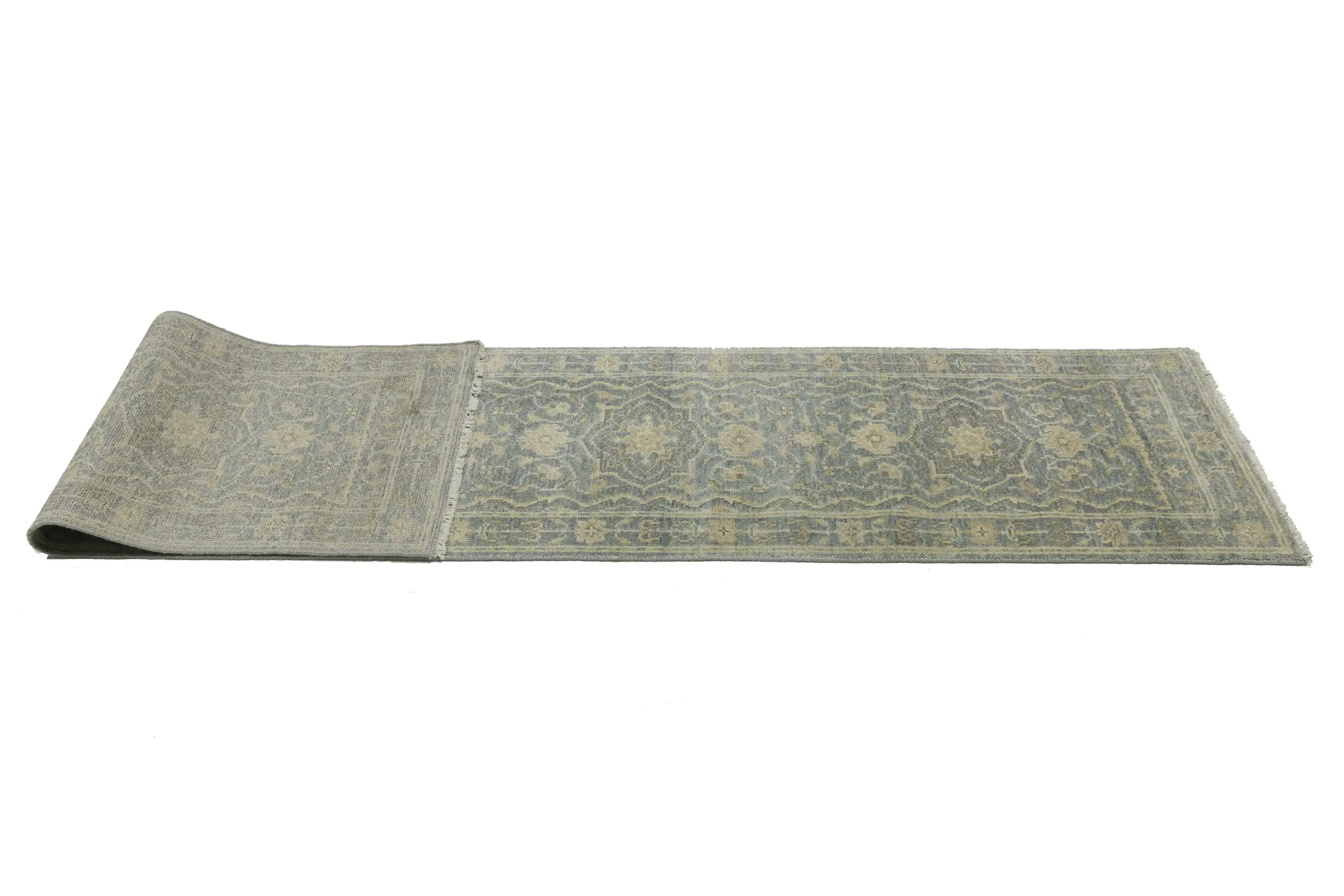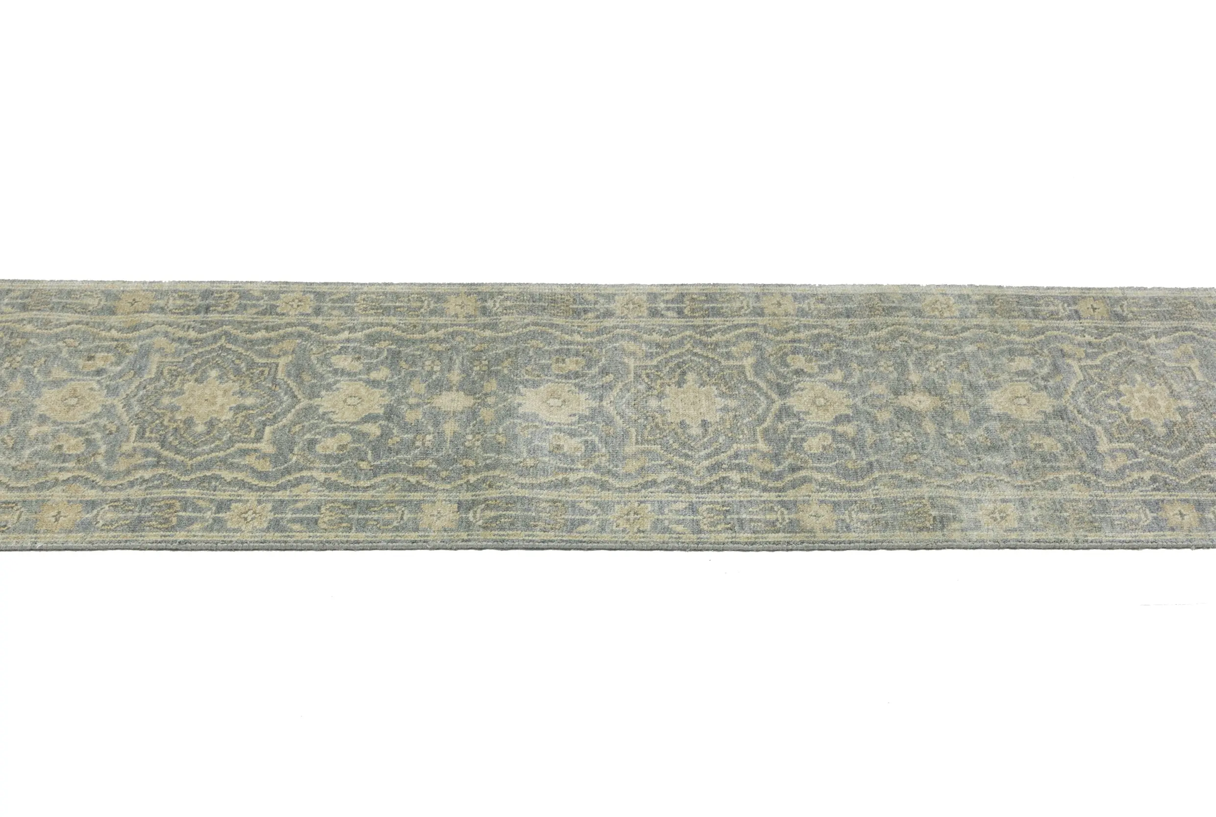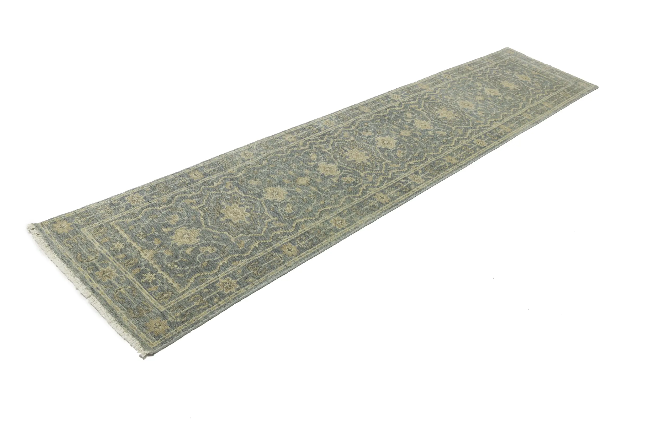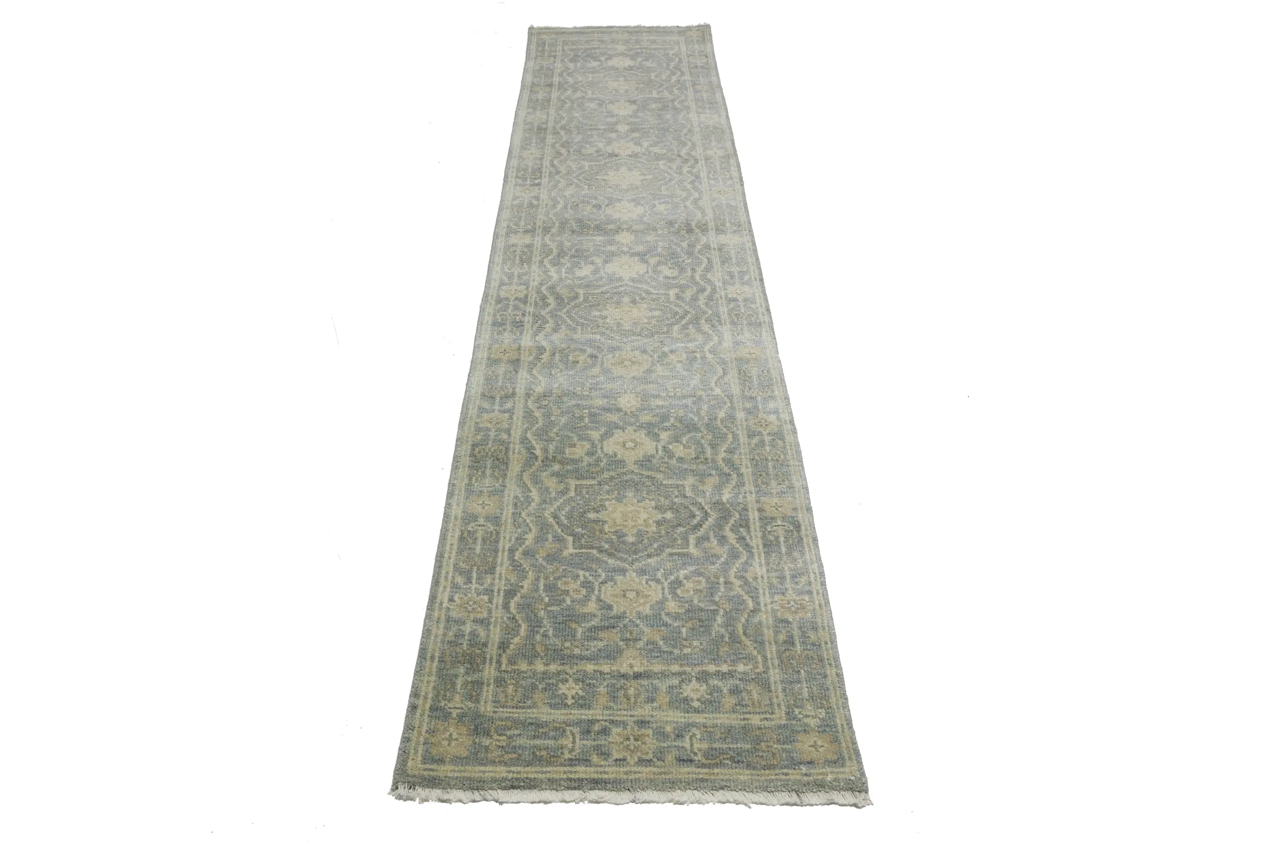 Handmade 2'5X11'9 gray oriental runner made with vegetable dyes (fine wool pile and cotton foundation), superior knot count, and appealing ancient designs. This Oriental runner never will go out of style and would be among your most valuable treasures.