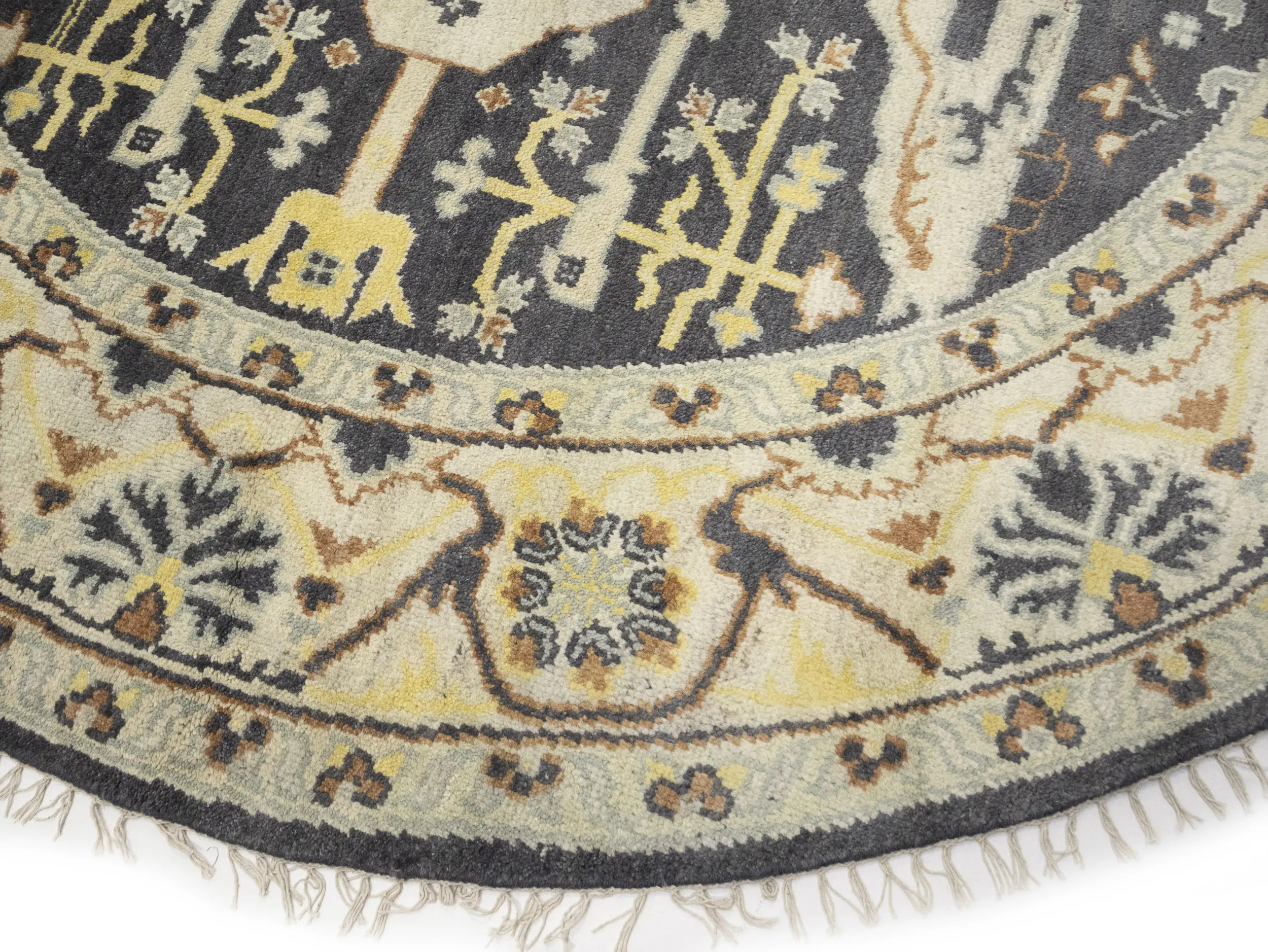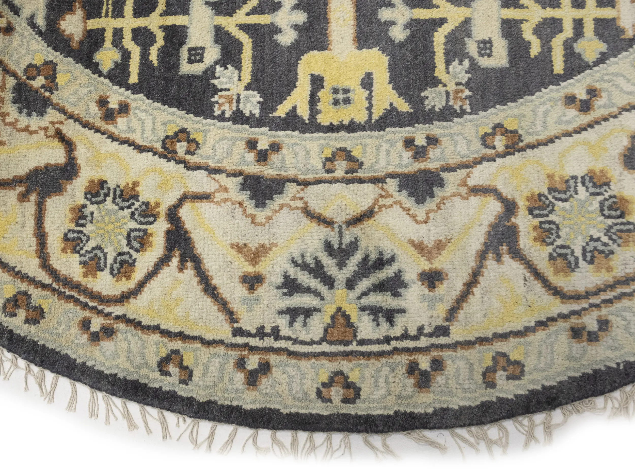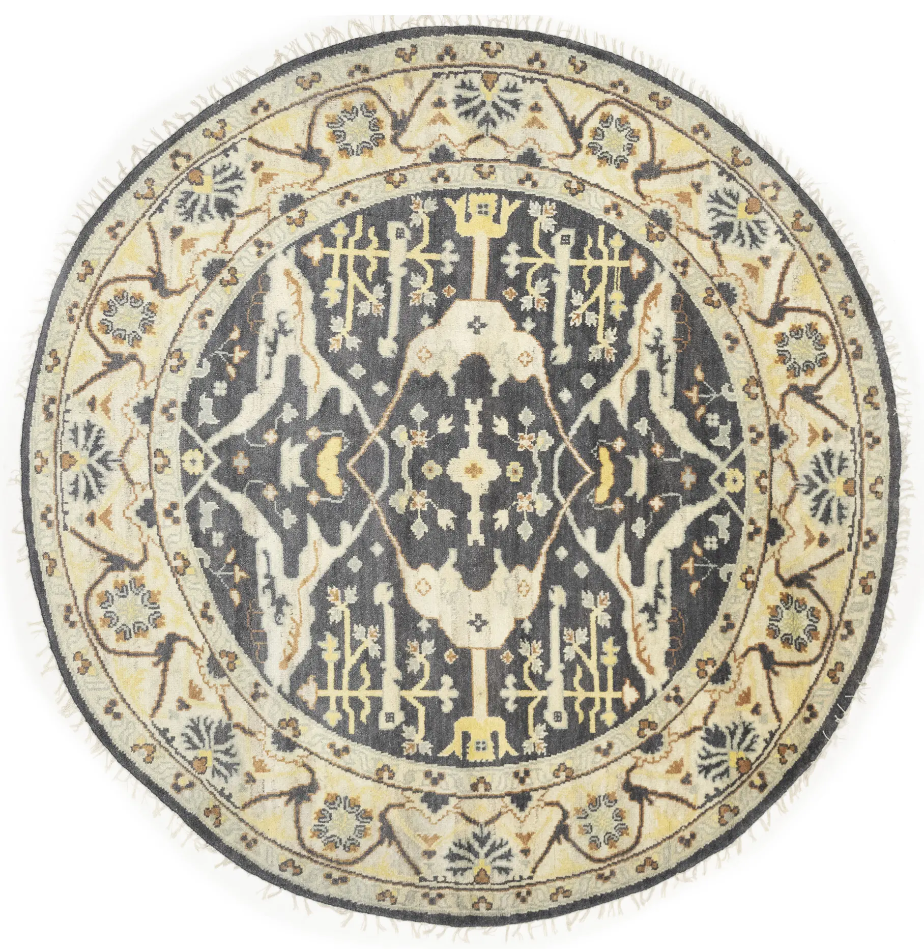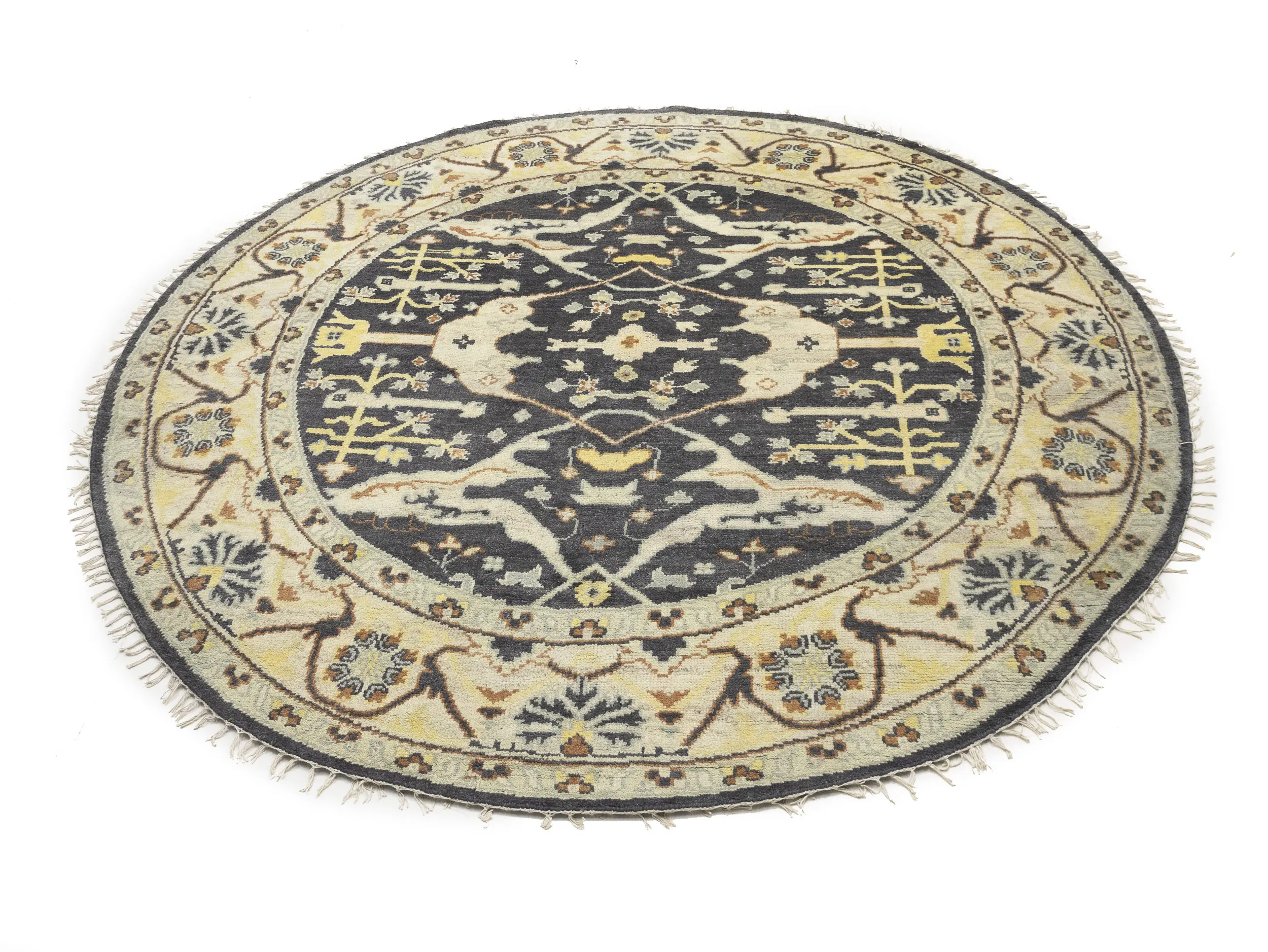 This genuine 8X8 Gray new Oriental Round rug was made by the hands of gifted weavers inspired by a variety of spectacular artistic designs, to recreate the aged look of the original piece with a richness of color and ornately patterned background field. What set this vintage style Oriental area rug from the others are the material and dye used (wool pile and cotton foundation), knot count, ancient designs, fantastic grades, and its regional historical connection: it has deep roots, from the story of the people who produced it to the meaning of the symbols and colors displayed across its canvas that have been praised for centuries. This Indian home décor carpet will be completely cozy and inviting that never will go out of style! Also, this Oriental rug would be among your most valuable treasures, it is a great investment that accrues value over time, and it will last for generations because was woven with high-quality, all-natural wool. Environmentally friendly, opulent yet affordable; this rug will give you a thorough amount of character to help define your living space with elegance and warmth that will capture the eyes and attention of your audience (homeowners, designers, decorators, family and friends).