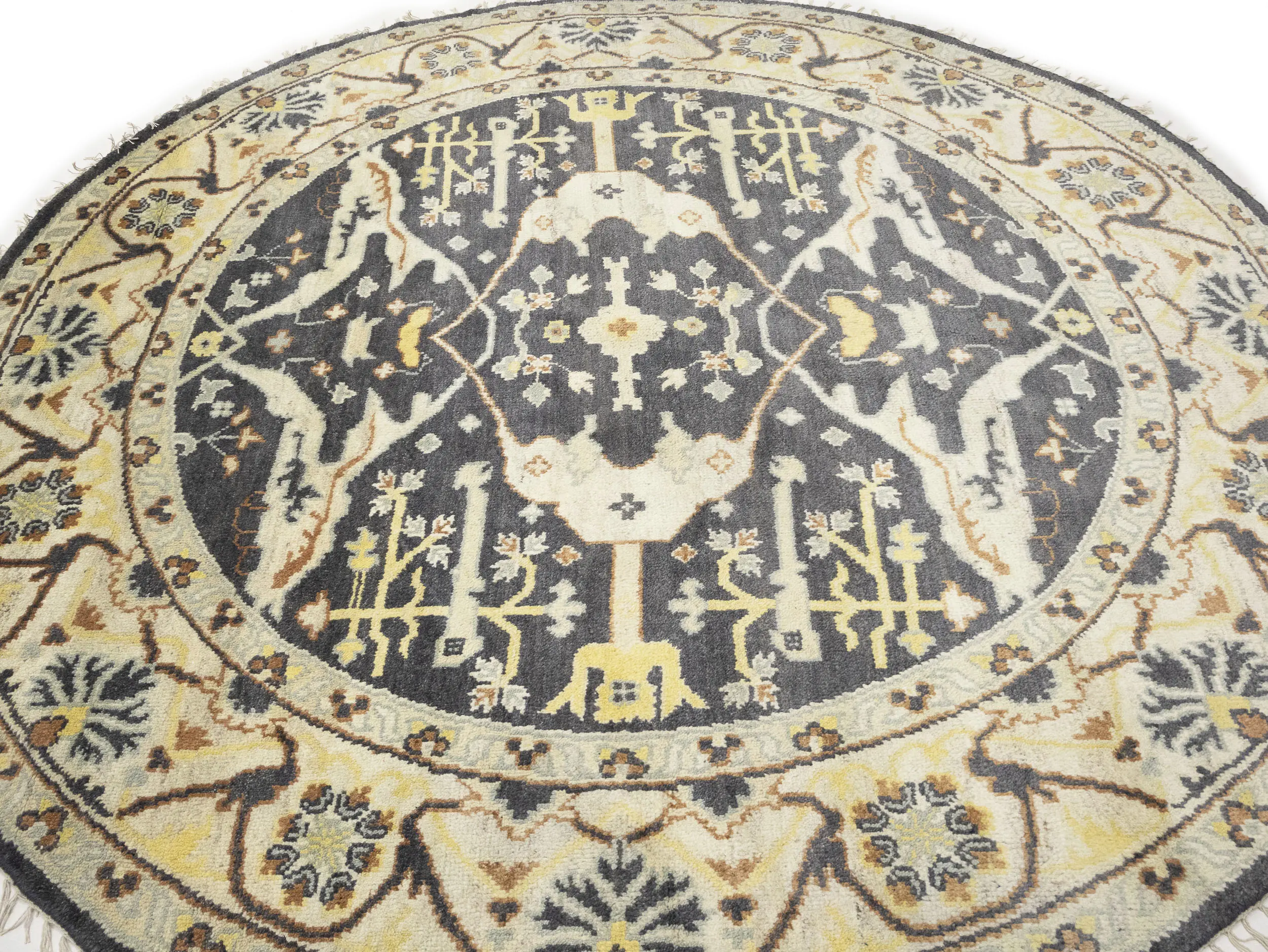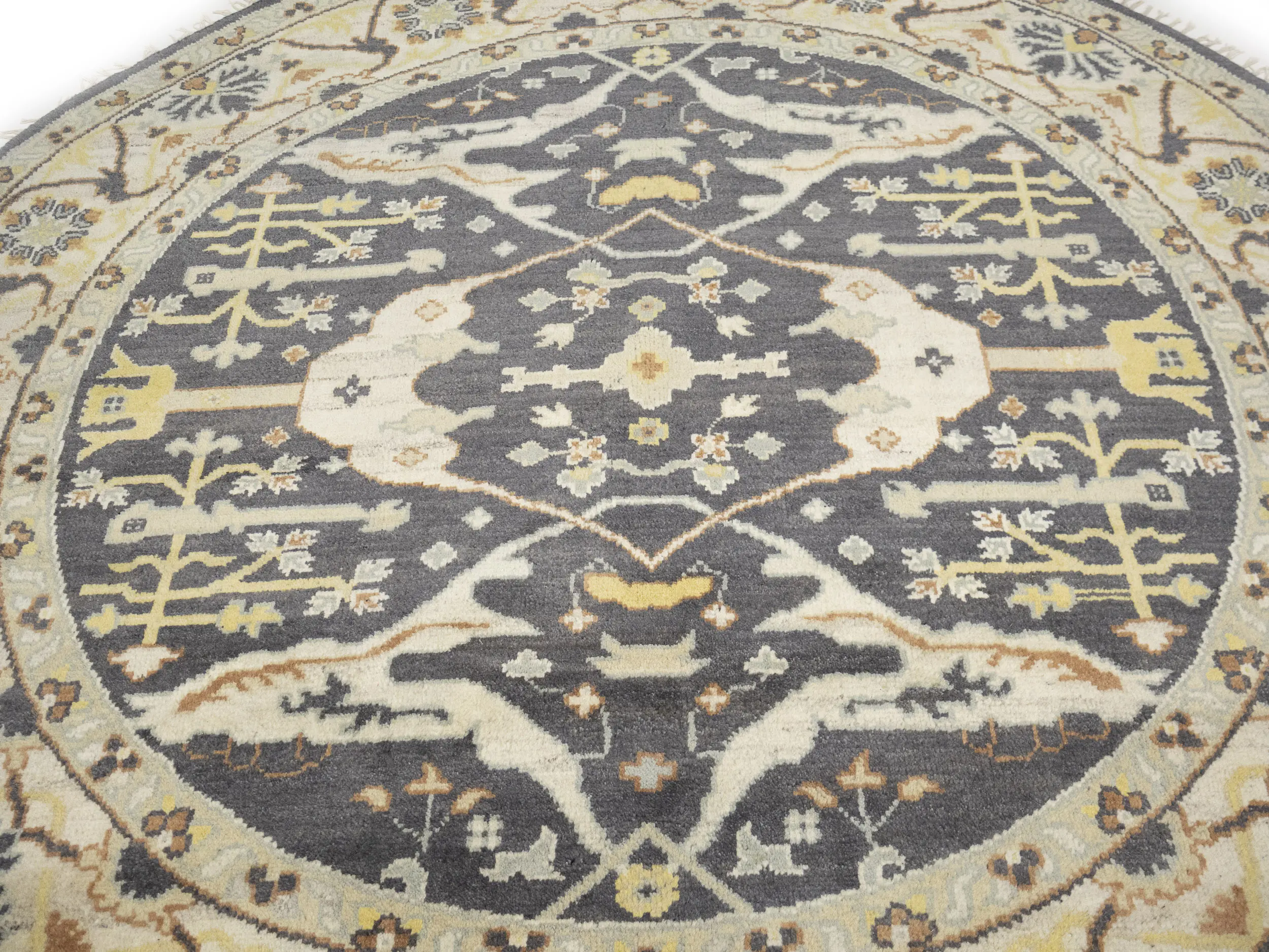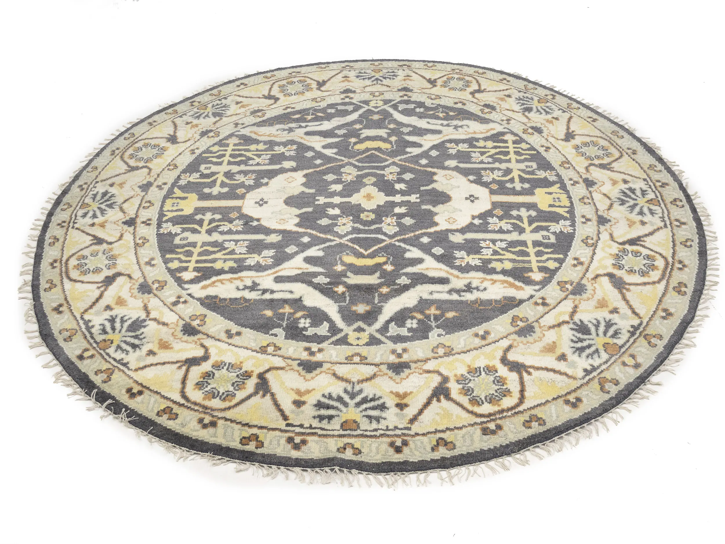 Hand Knotted 8X8 gray oriental Round rug made with vegetable dyes (fine wool pile and cotton foundation), superior knot count, and alluring ancient designs. This Oriental rug never will go out of style and would be among your most valuable treasures.