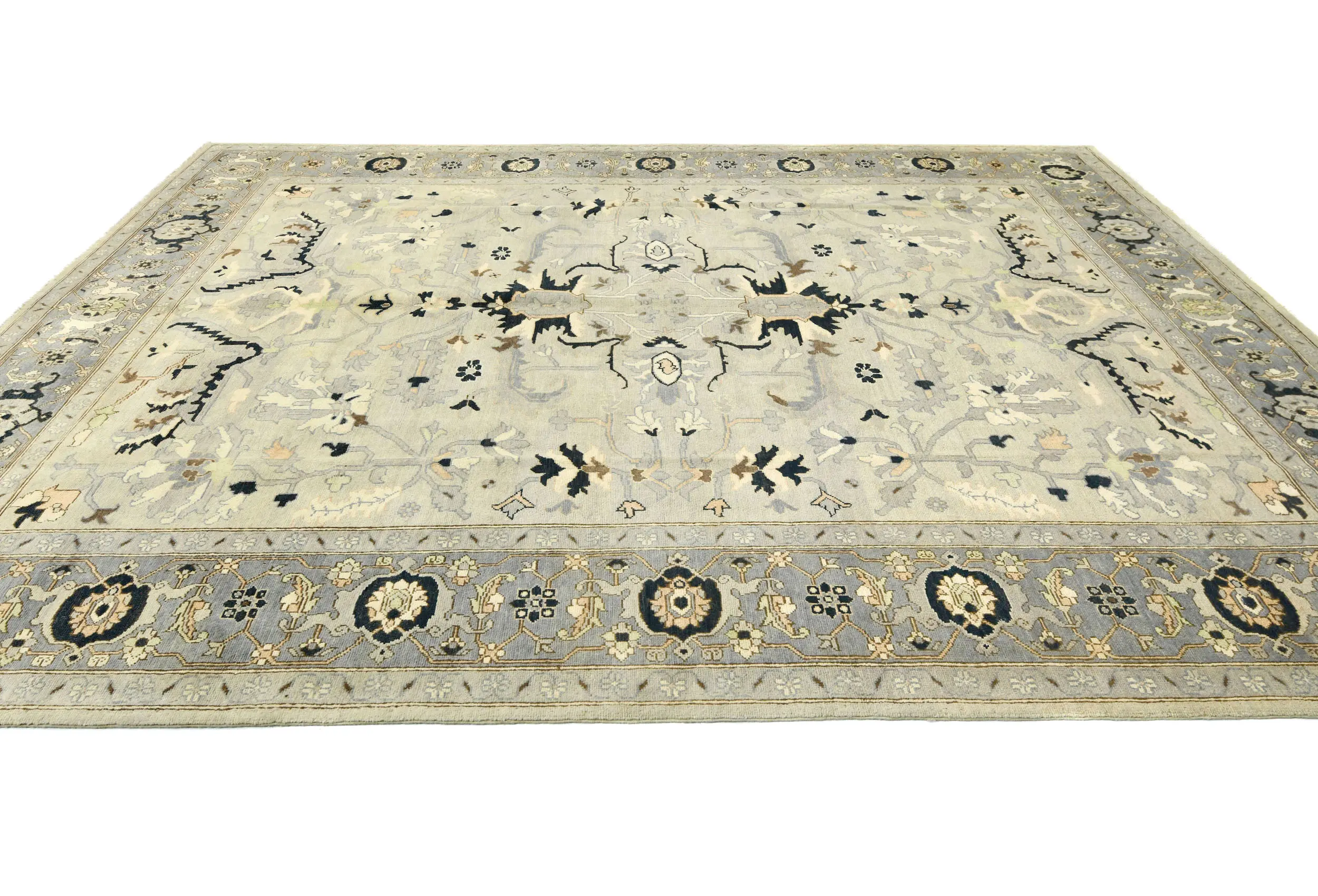 This original 9X12 gray new Oriental rug was finely knotted by the hands of weavers influenced by a variety of amazing artistic designs, to recreate the aged look of the exceptional piece with a richness of color and embellished background field. What set this vintage style Oriental area rug from the others are the material and dye used (wool pile and cotton foundation), knot count, antique designs, fantastic grades, and its regional historical connection: it has deep roots, from the story of the people who produced it to the meaning of the symbols and colors displayed across its canvas that have been praised for centuries. This Indian home décor carpet will be completely cozy and inviting that never will go out of style! Also, this Oriental rug would be among your most valuable treasures, it is a great investment that increase in value over time, and it will last a lifetime because was woven with high-quality, all-natural wool. Eco-friendly, opulent yet affordable; this rug will give you an extra pop of character to help define your home environment with luxury and warmth that will capture the eyes and attention of your audience (homeowners, designers, decorators, family and friends).